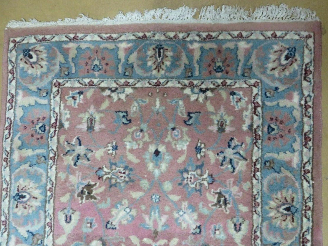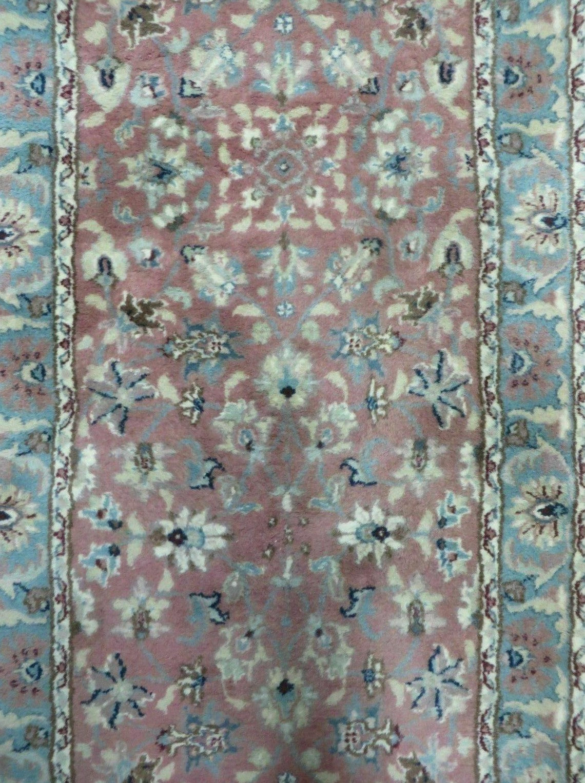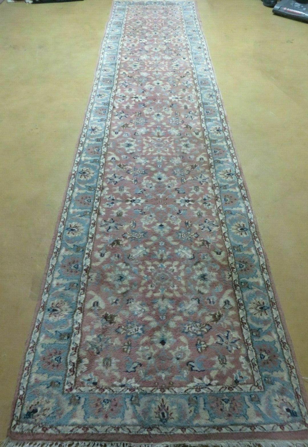 Indo Persian Runner Rug 2.8 x 12, Wool Hand Knotted, Pink and Light Blue