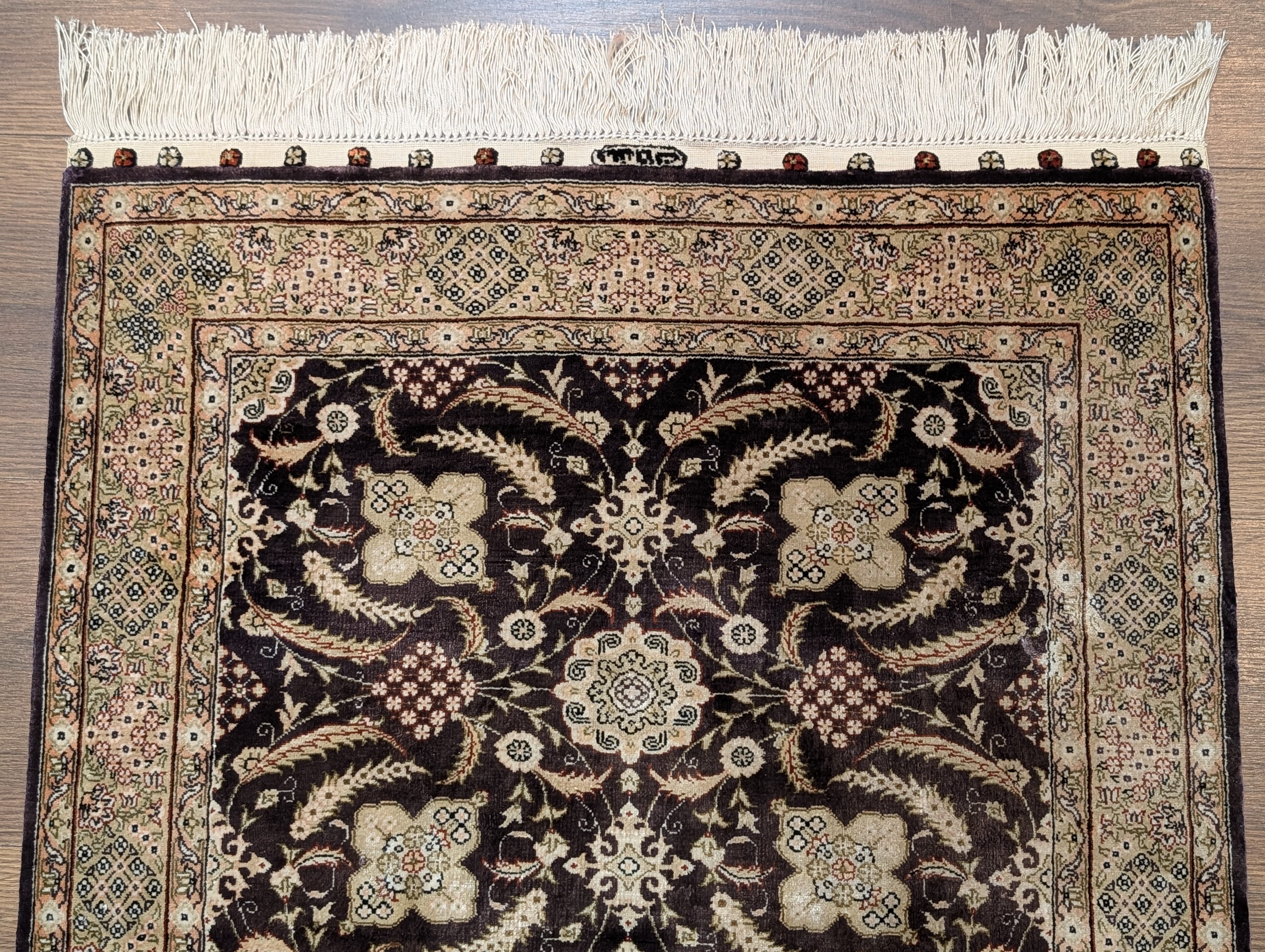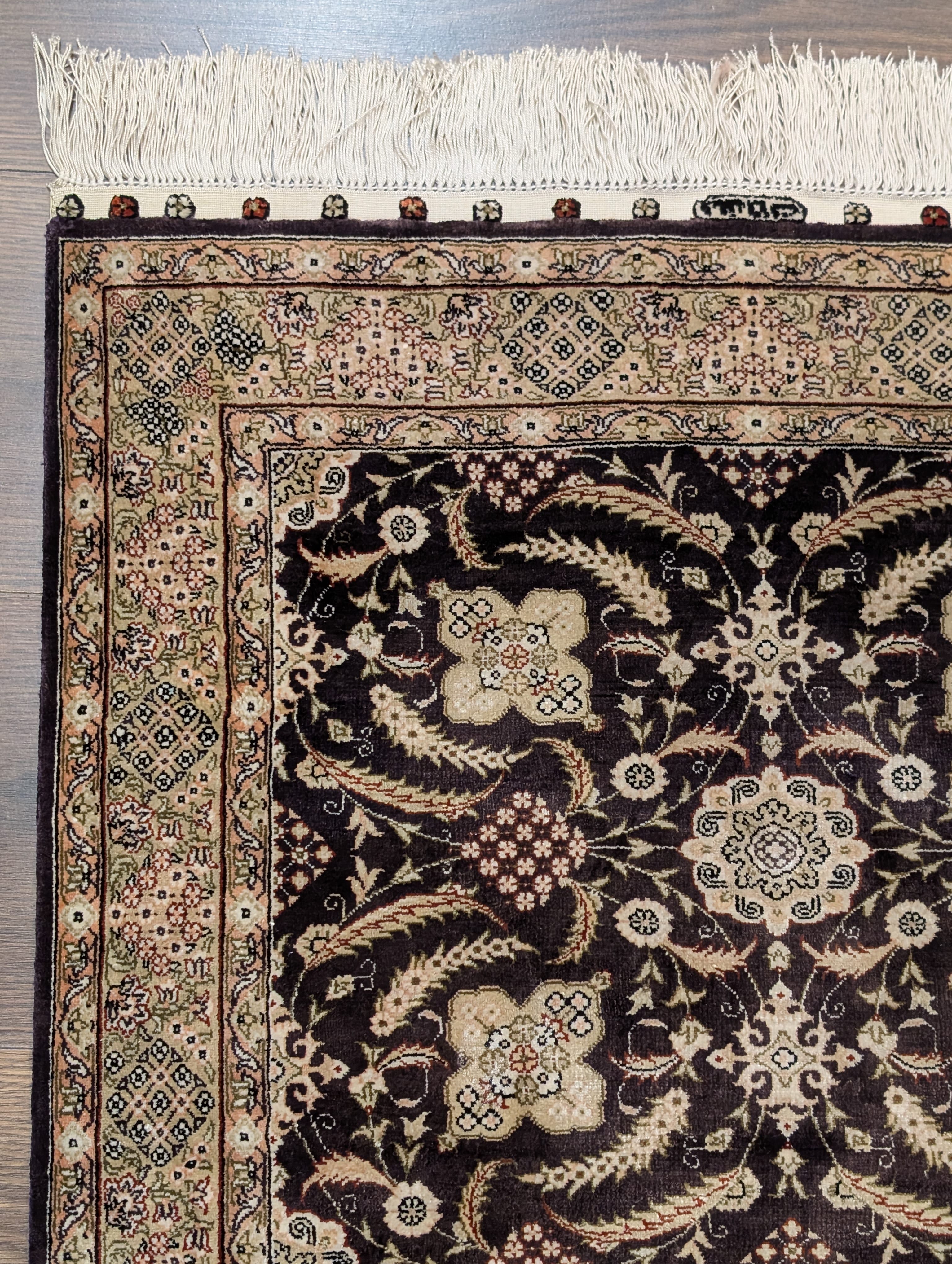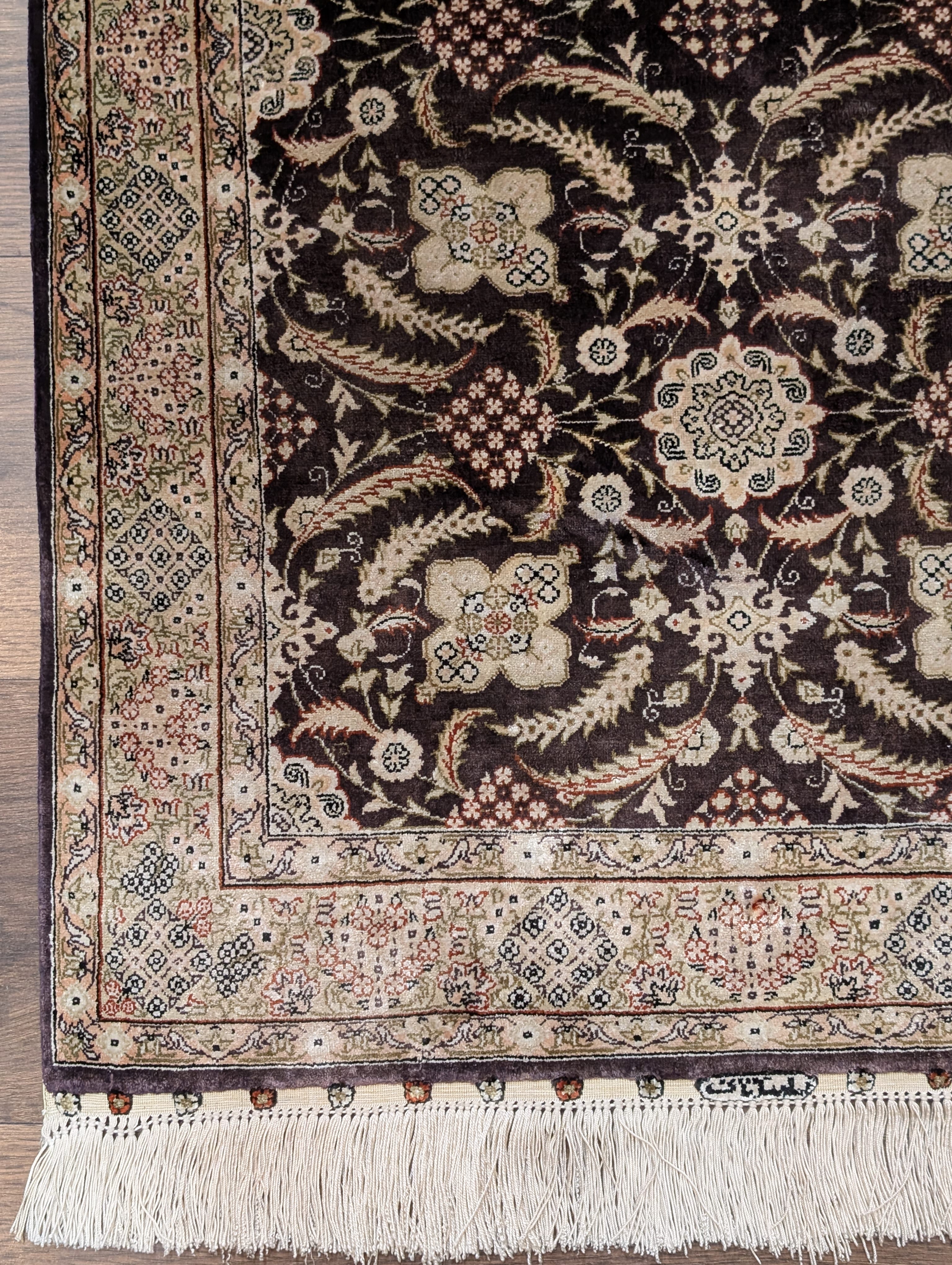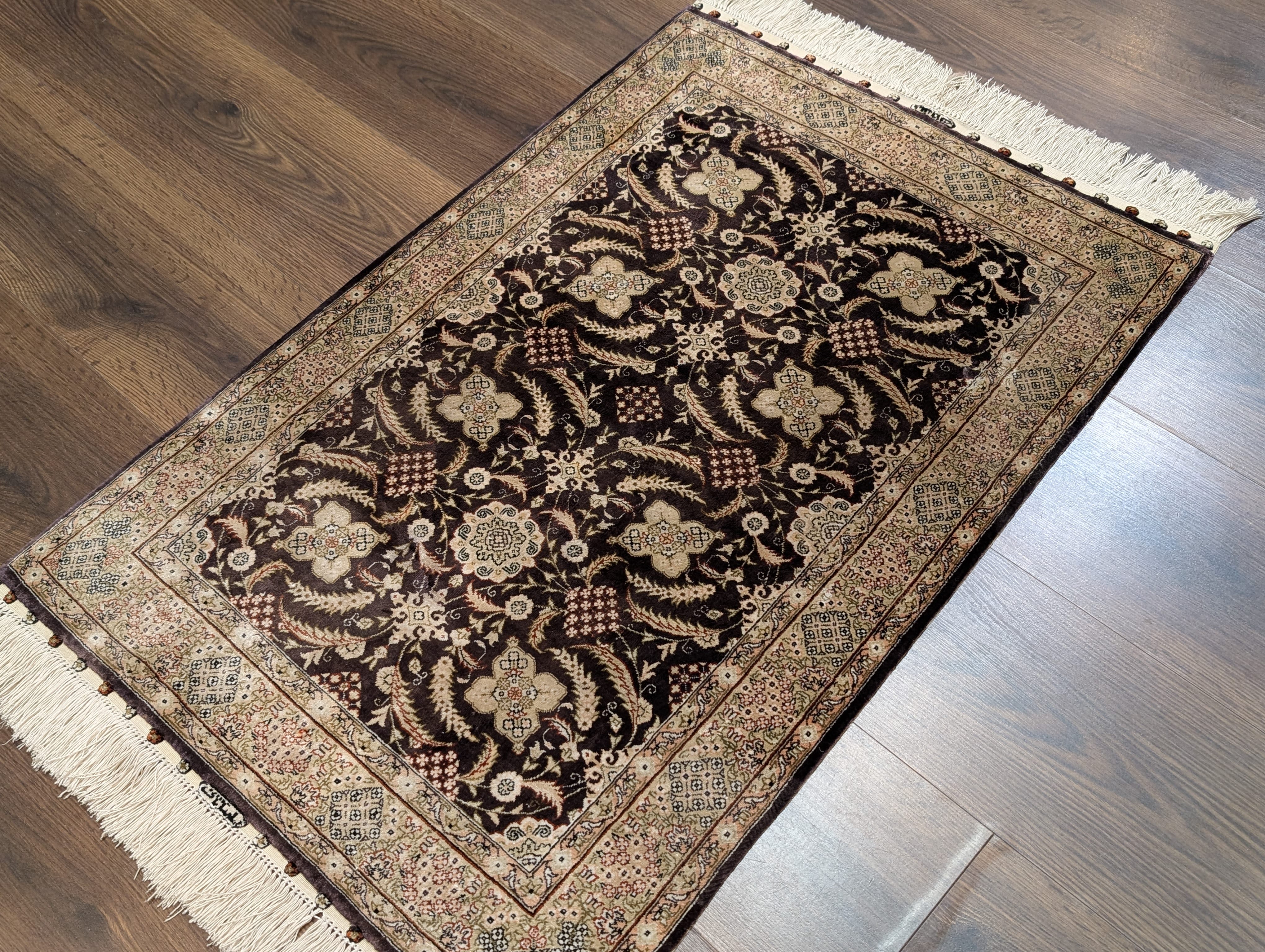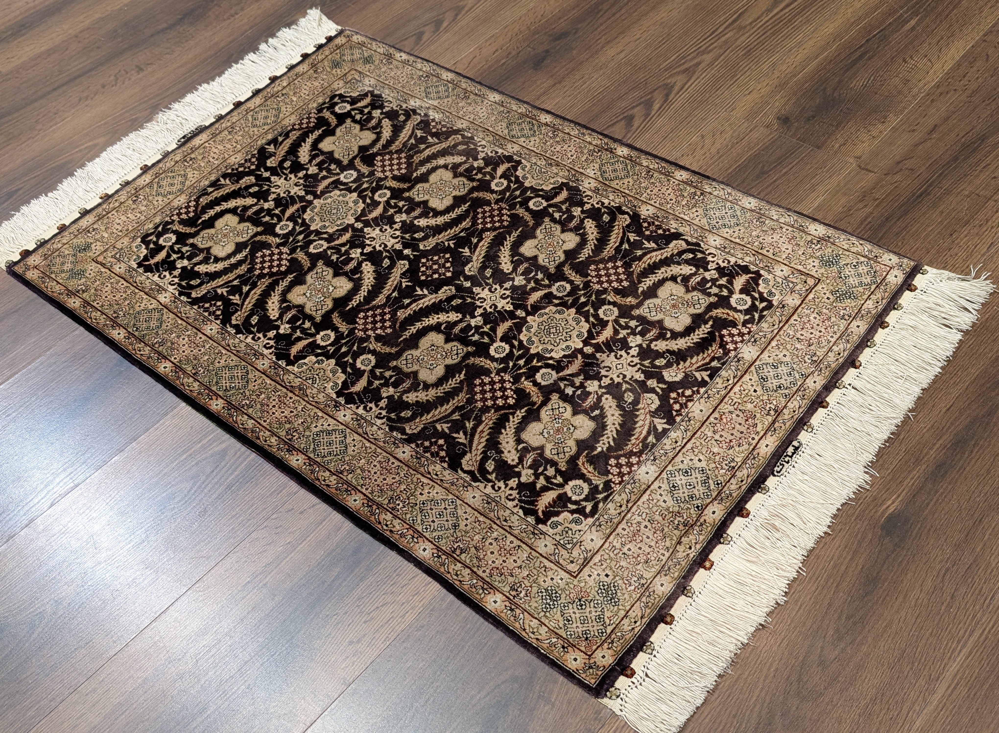 Silk Turkish Kayseri Rug 2x3, Very Finely Hand Knotted, Semi Open Field, Vintage, Silk Pile on Silk Foundation, 300 KPSI
