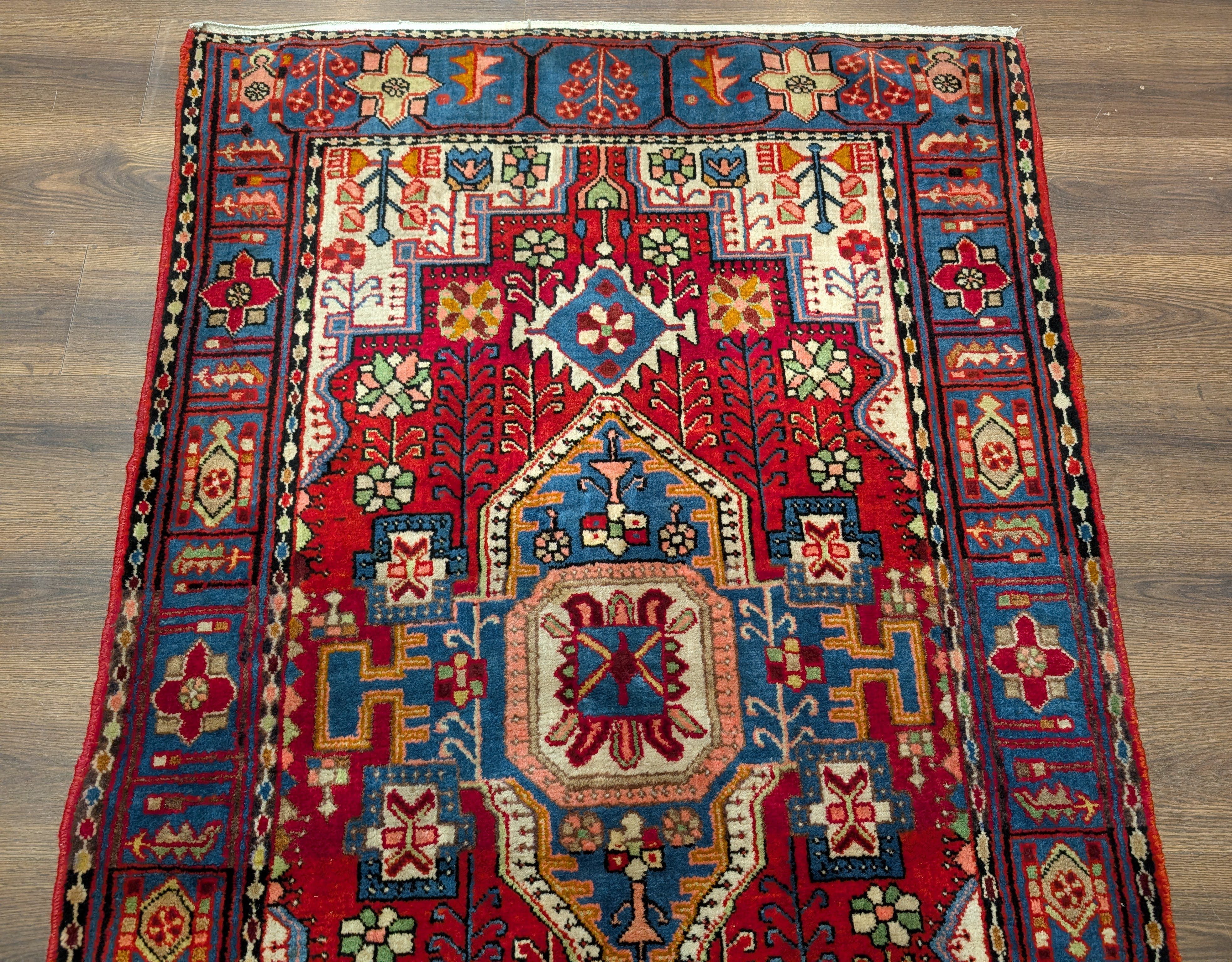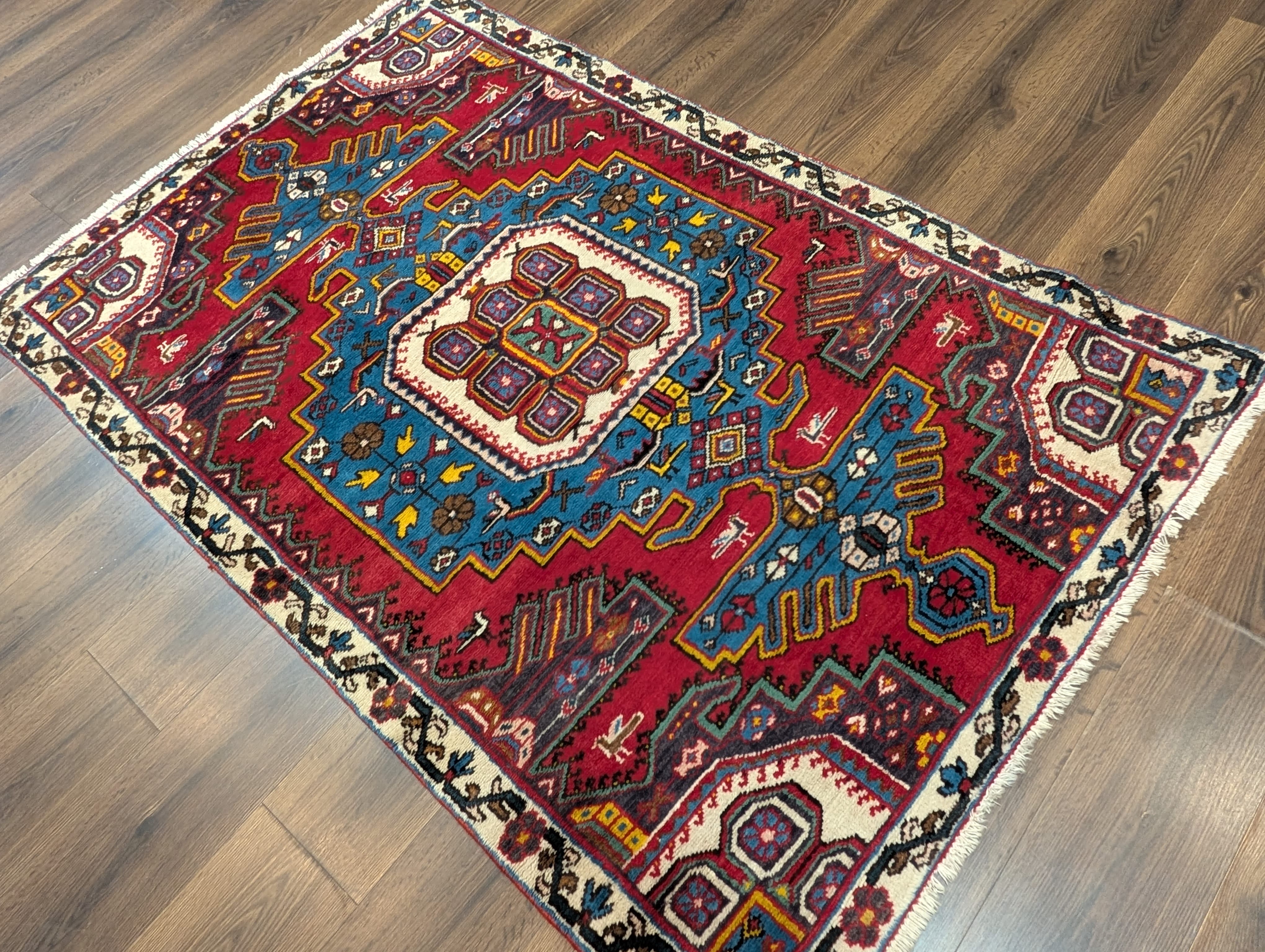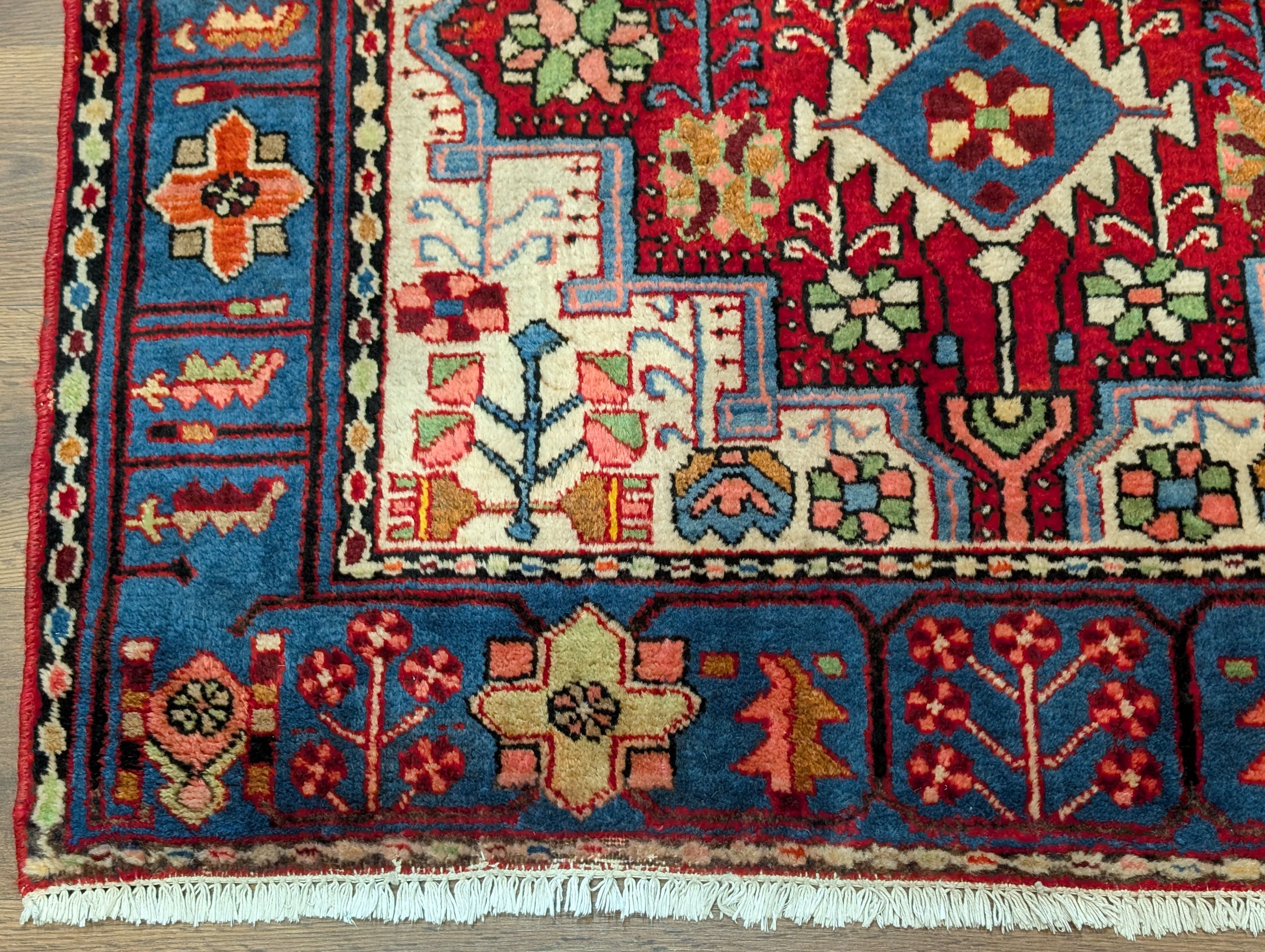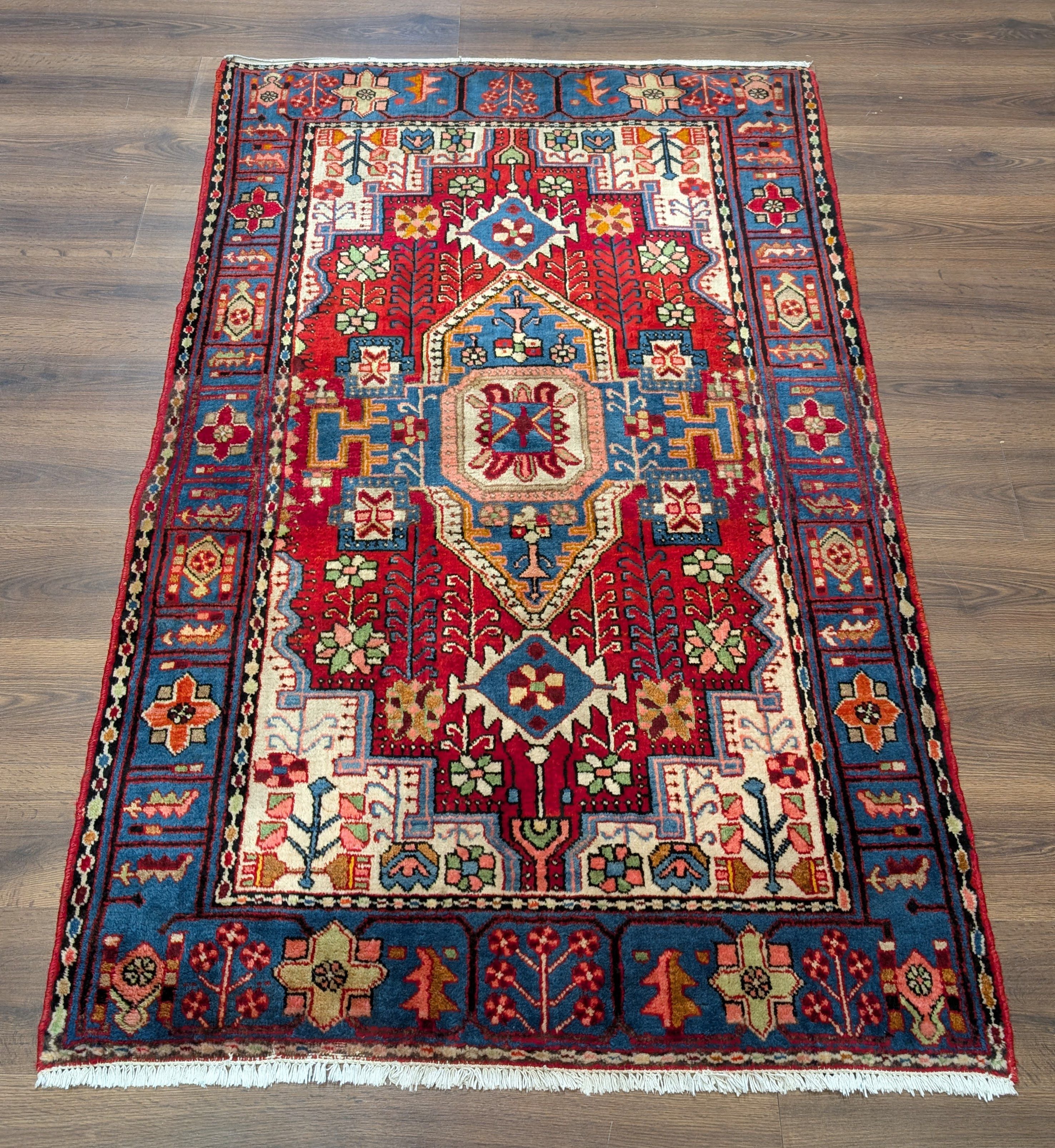 Persian Hamadan Rug 4x6, Geometric Medallion, Red Blue Ivory, Wool, Semi Antique, Nahavand Rug