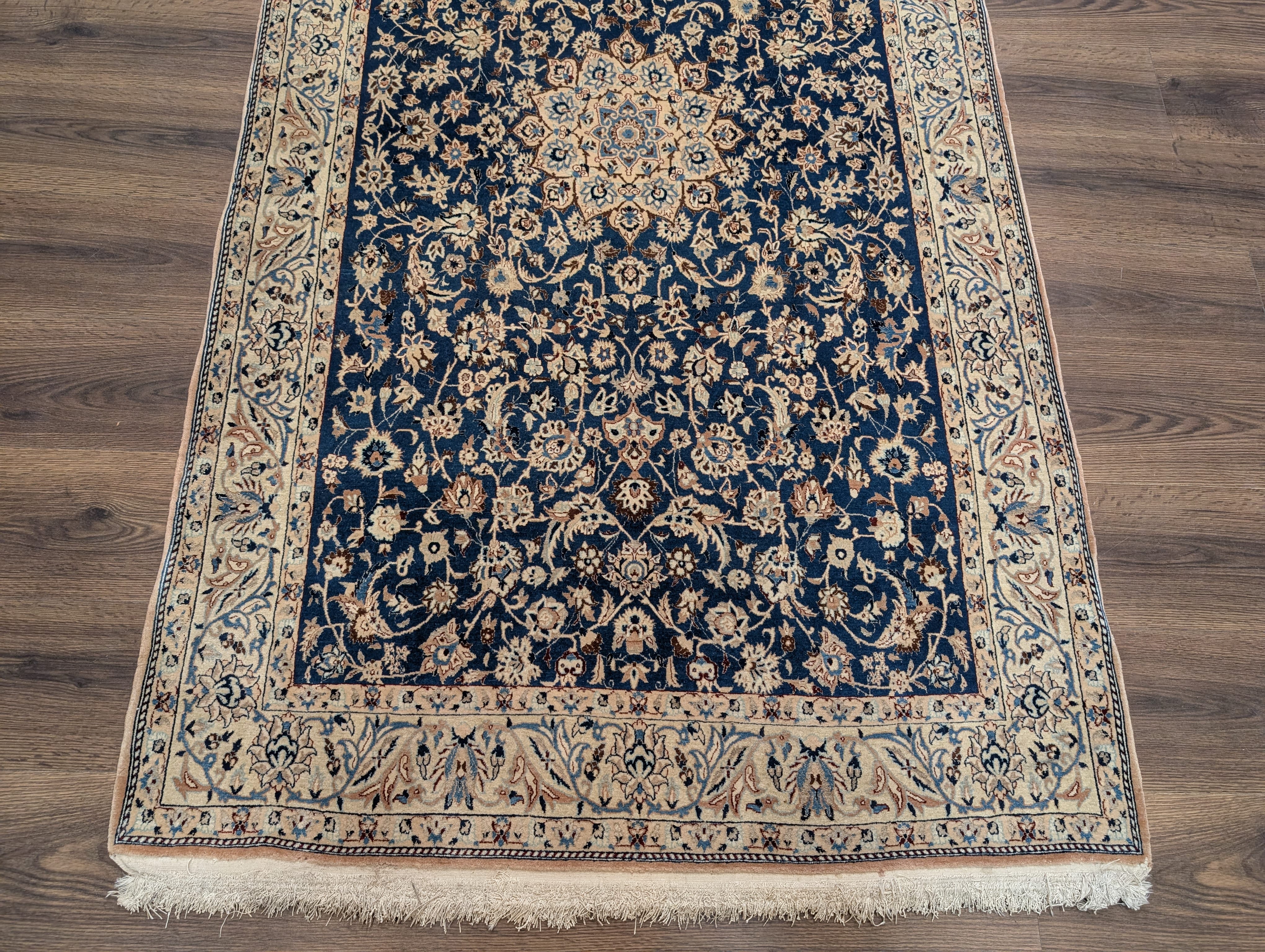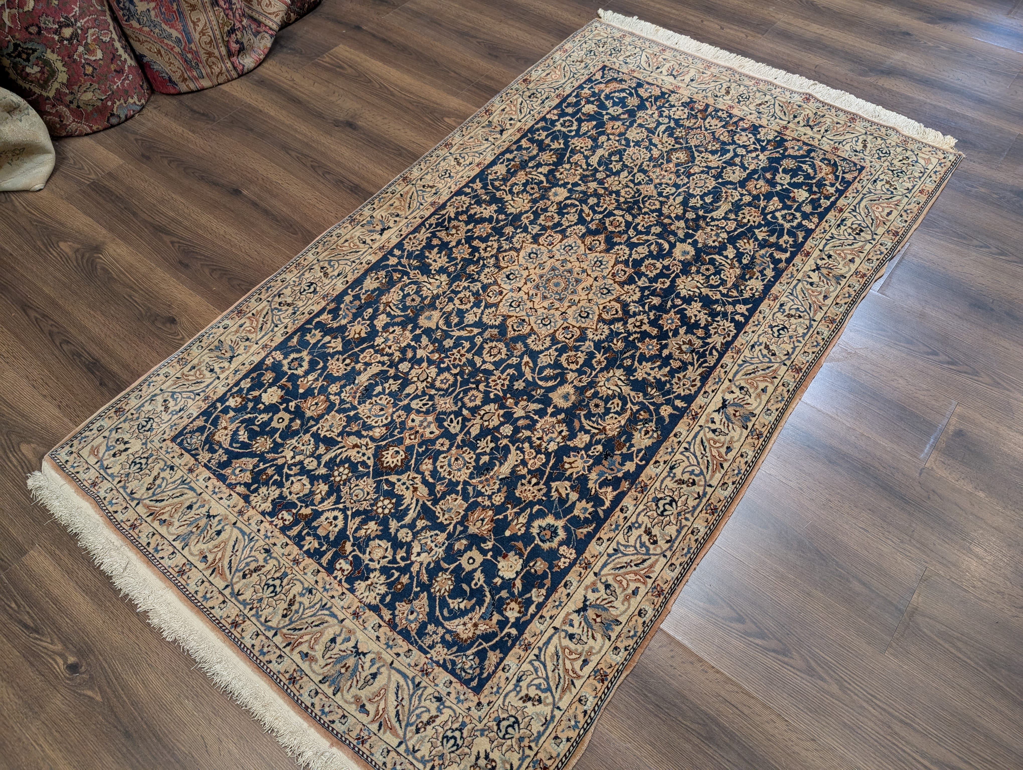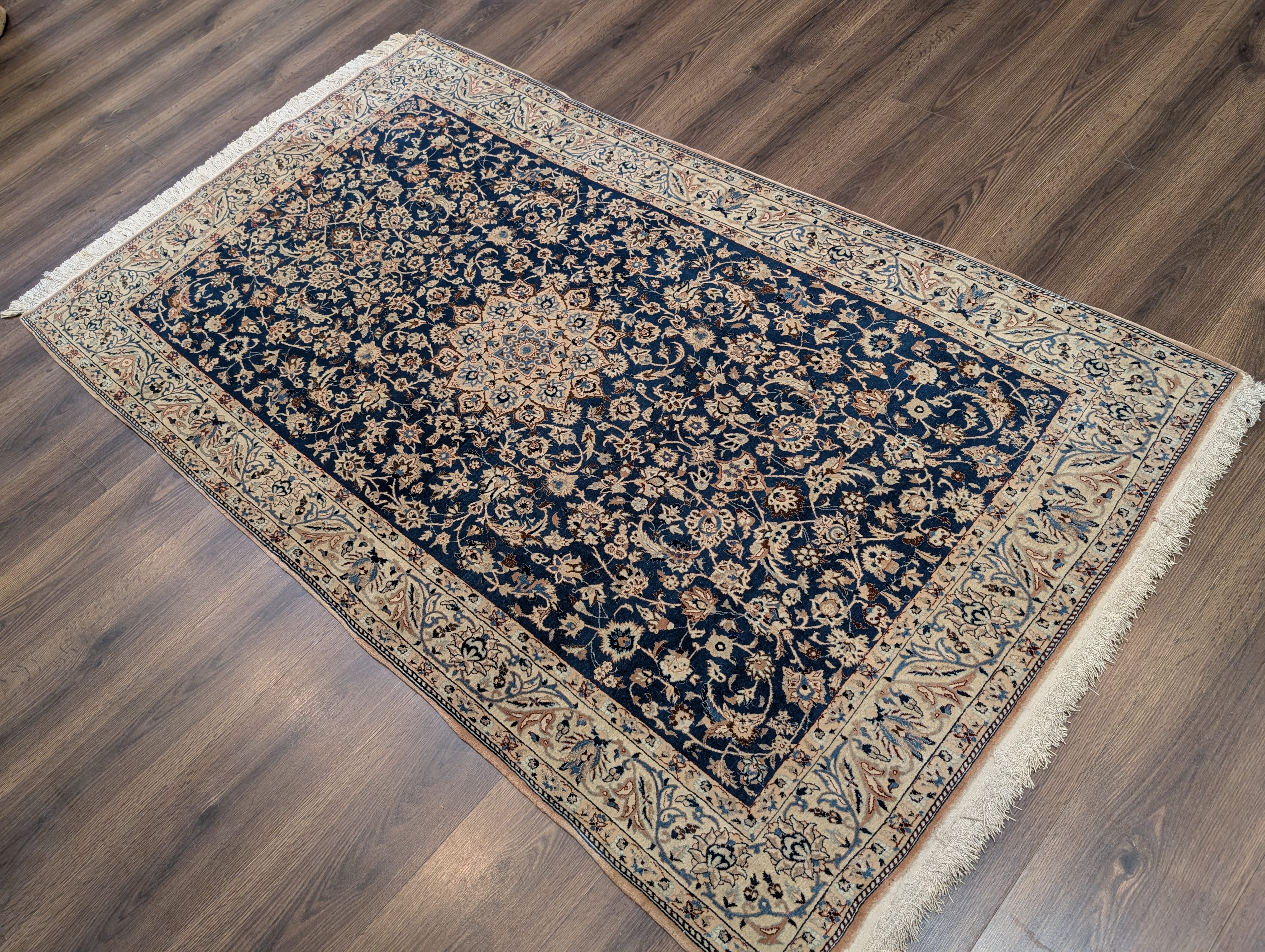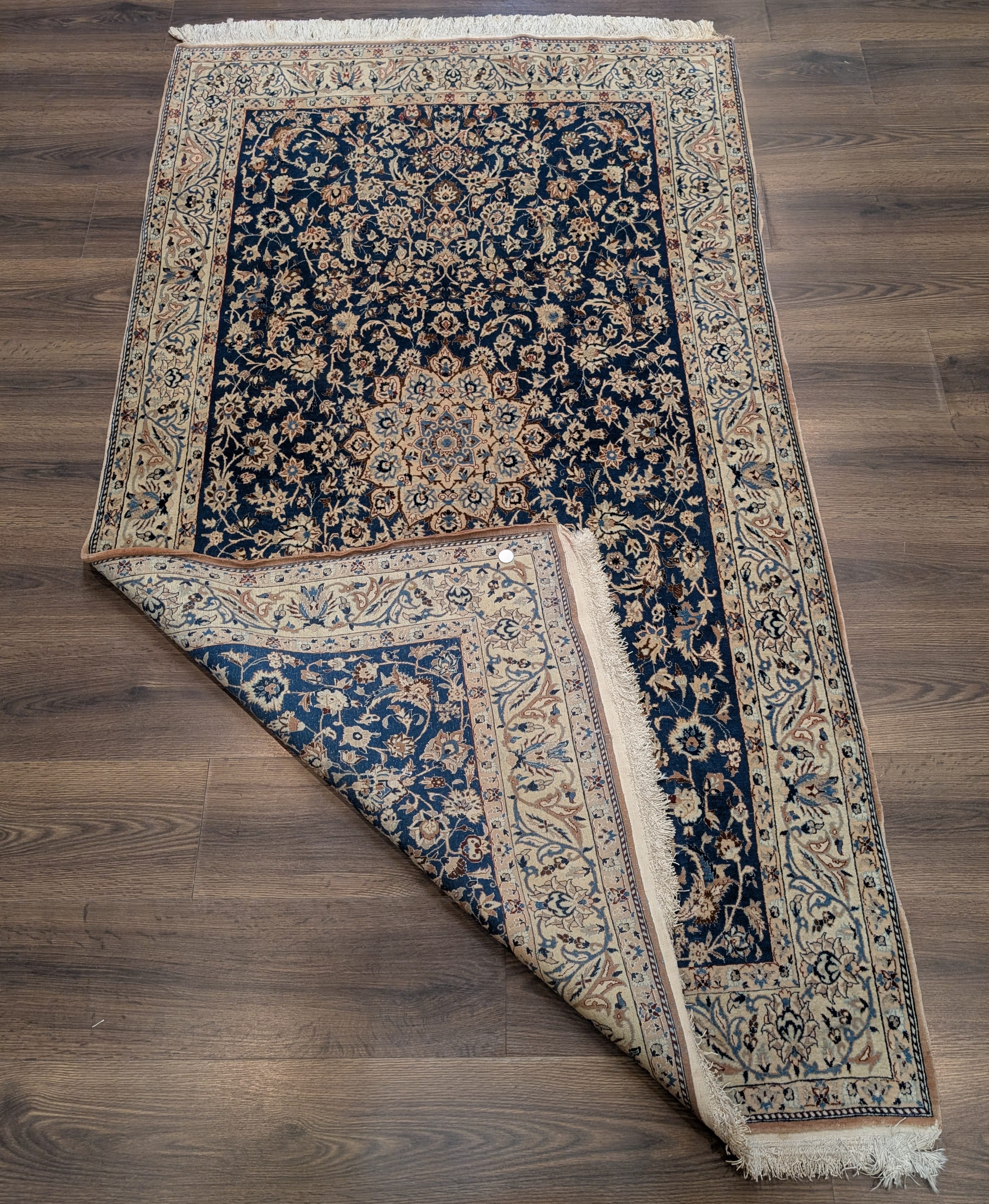 Persian Nain Rug 4x7, Navy Blue and Ivory, Super Fine 550 KPSI, Kork Wool & Silk Highlights, Wonderful