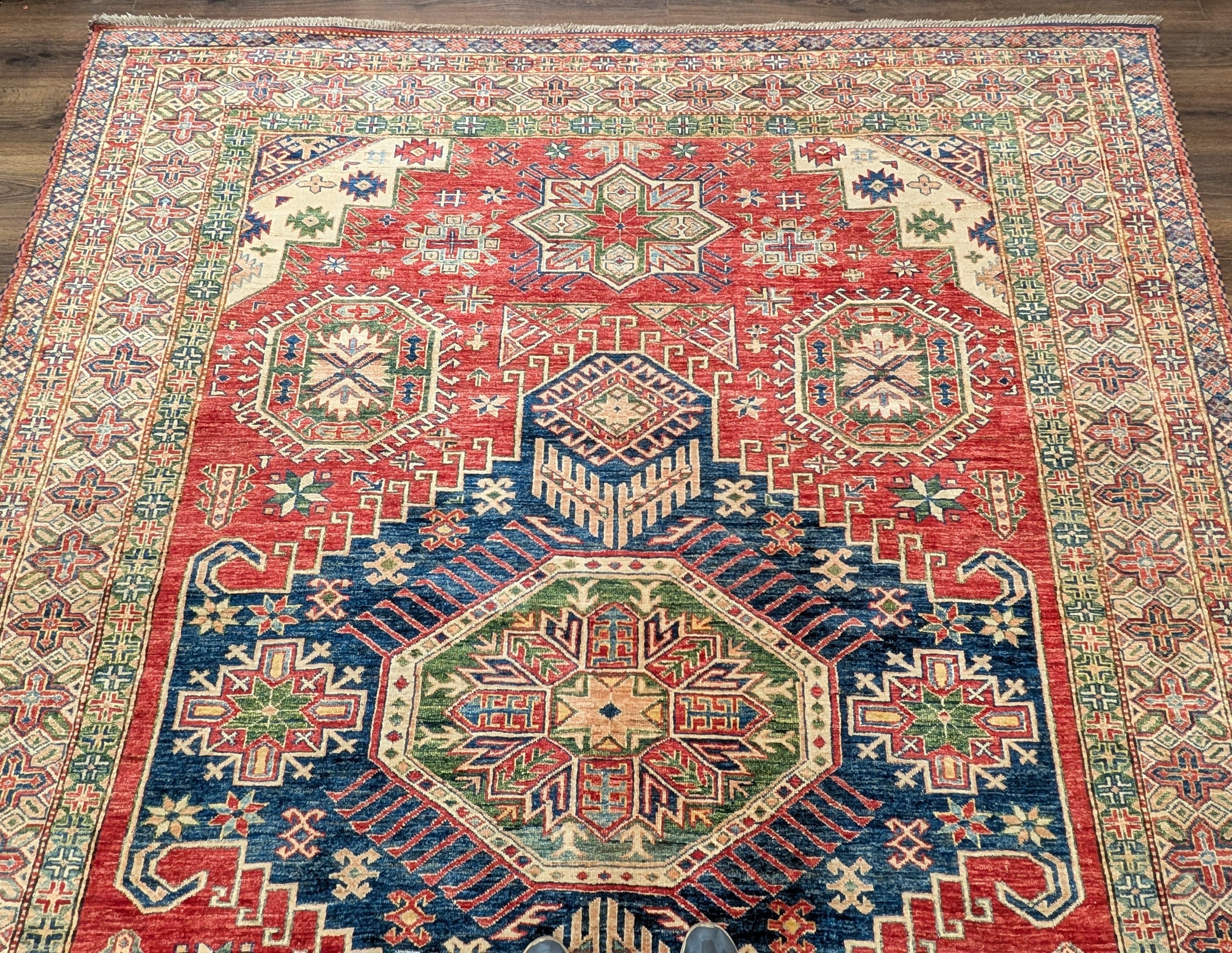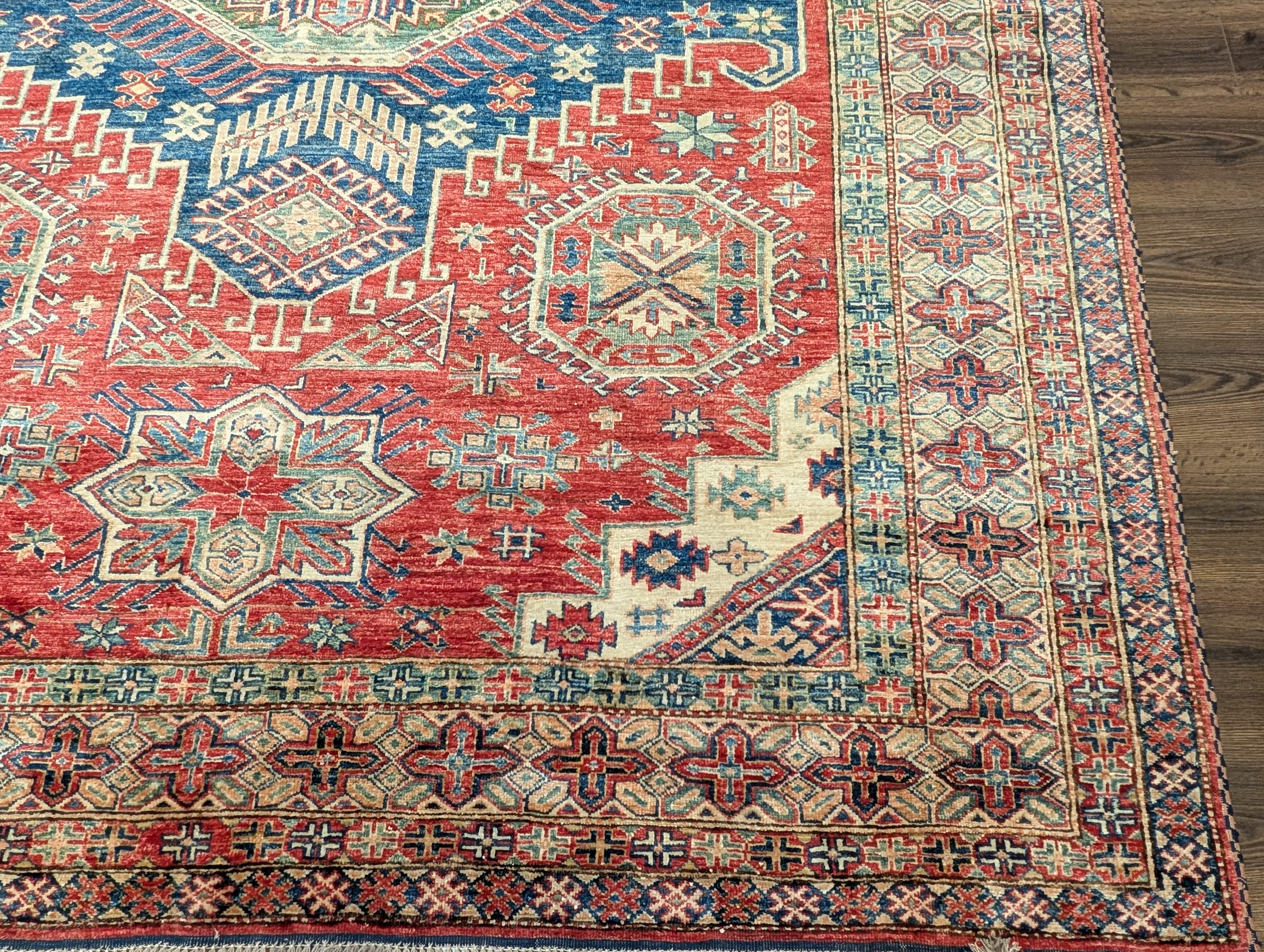 Indo Persian Heriz Rug 8x10, Geometric Wool Carpet, Handmade, Navy Red Tan