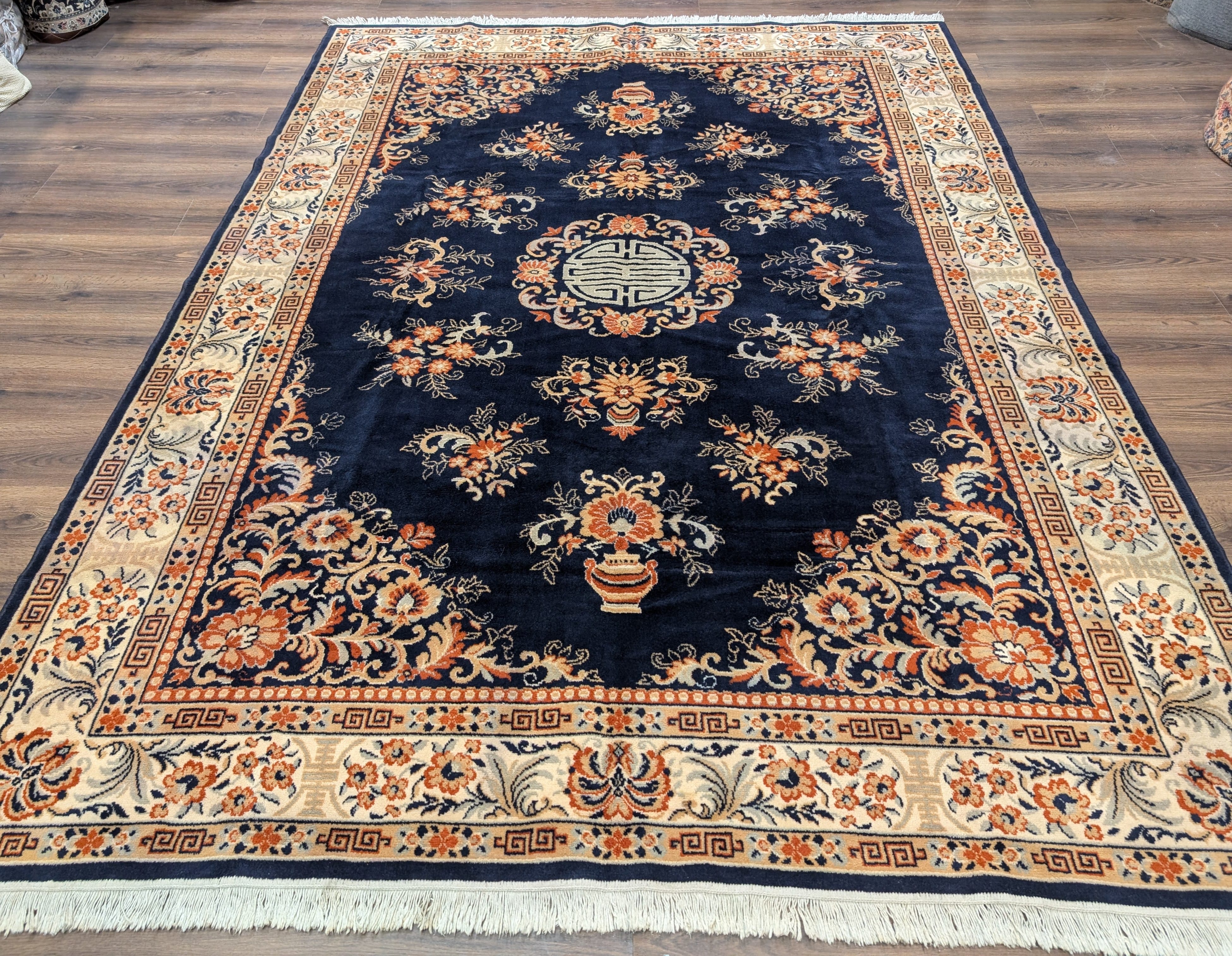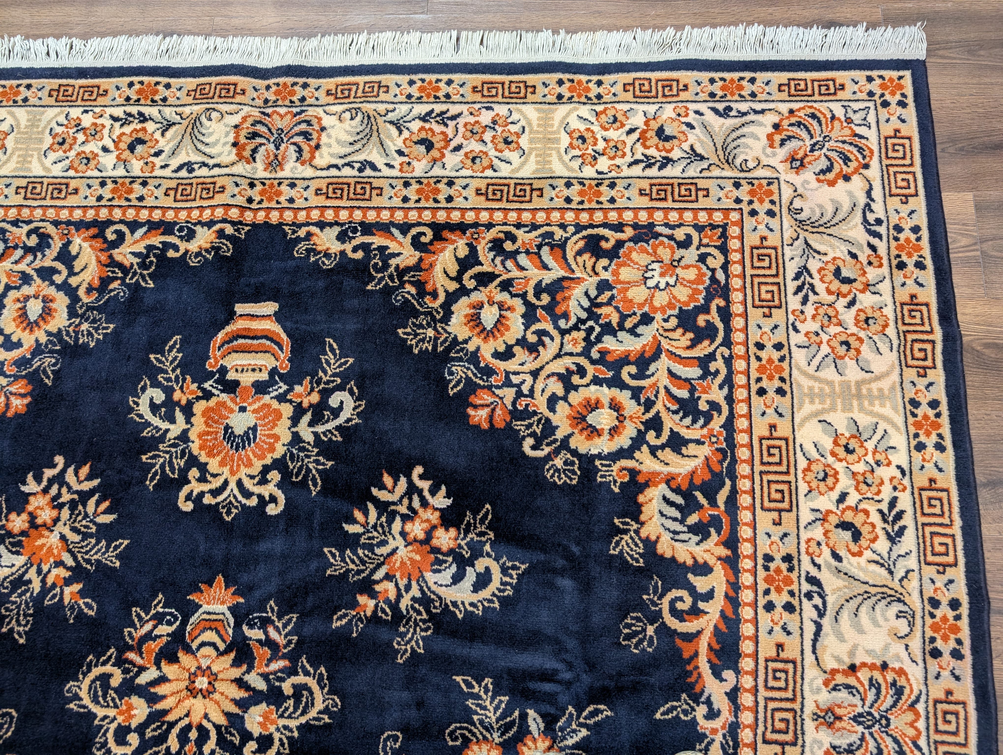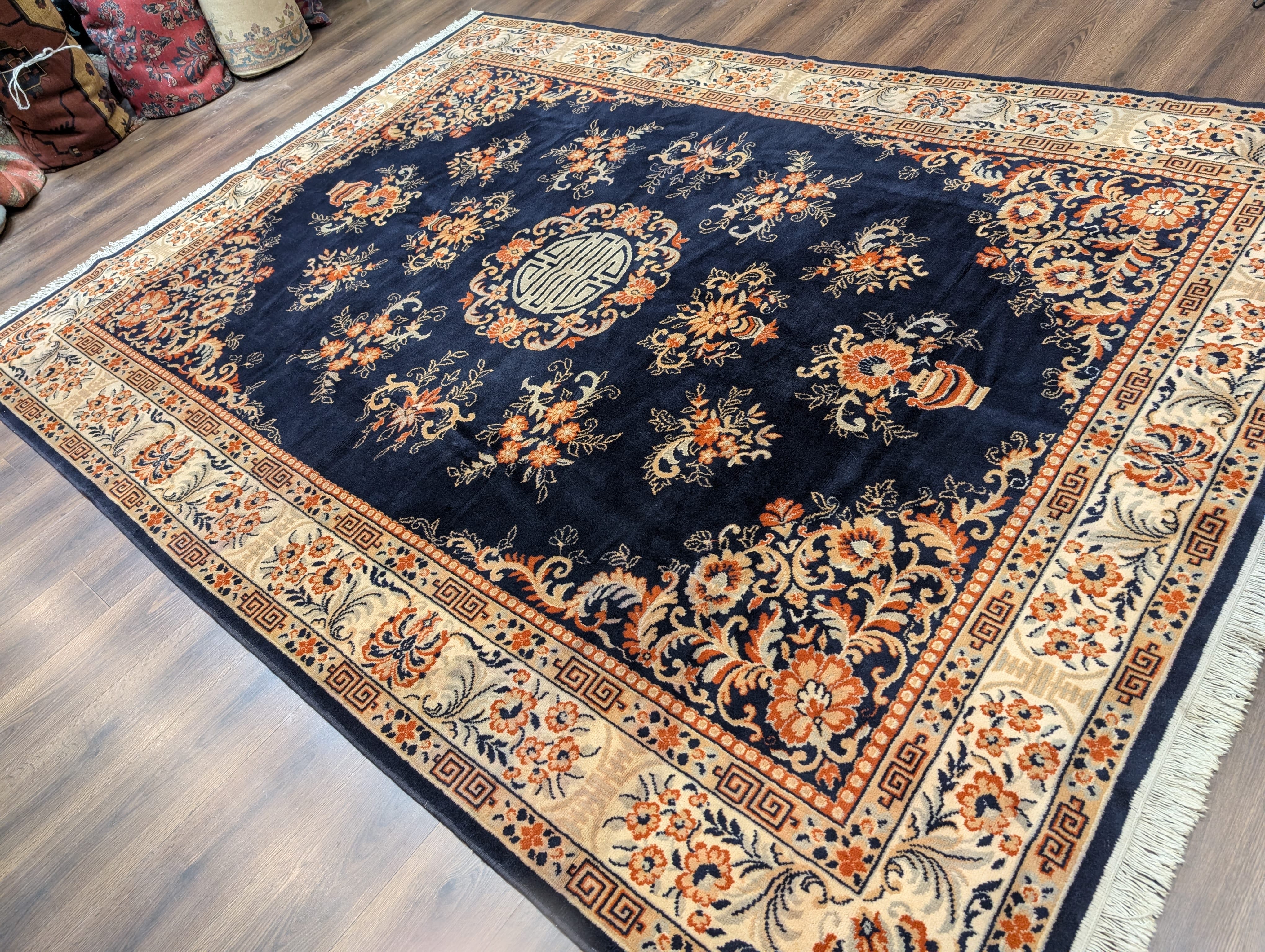 Chinese Wool Rug 8x11, Navy Blue and Cream, Belgium Power Loomed Carpet, Vintage
