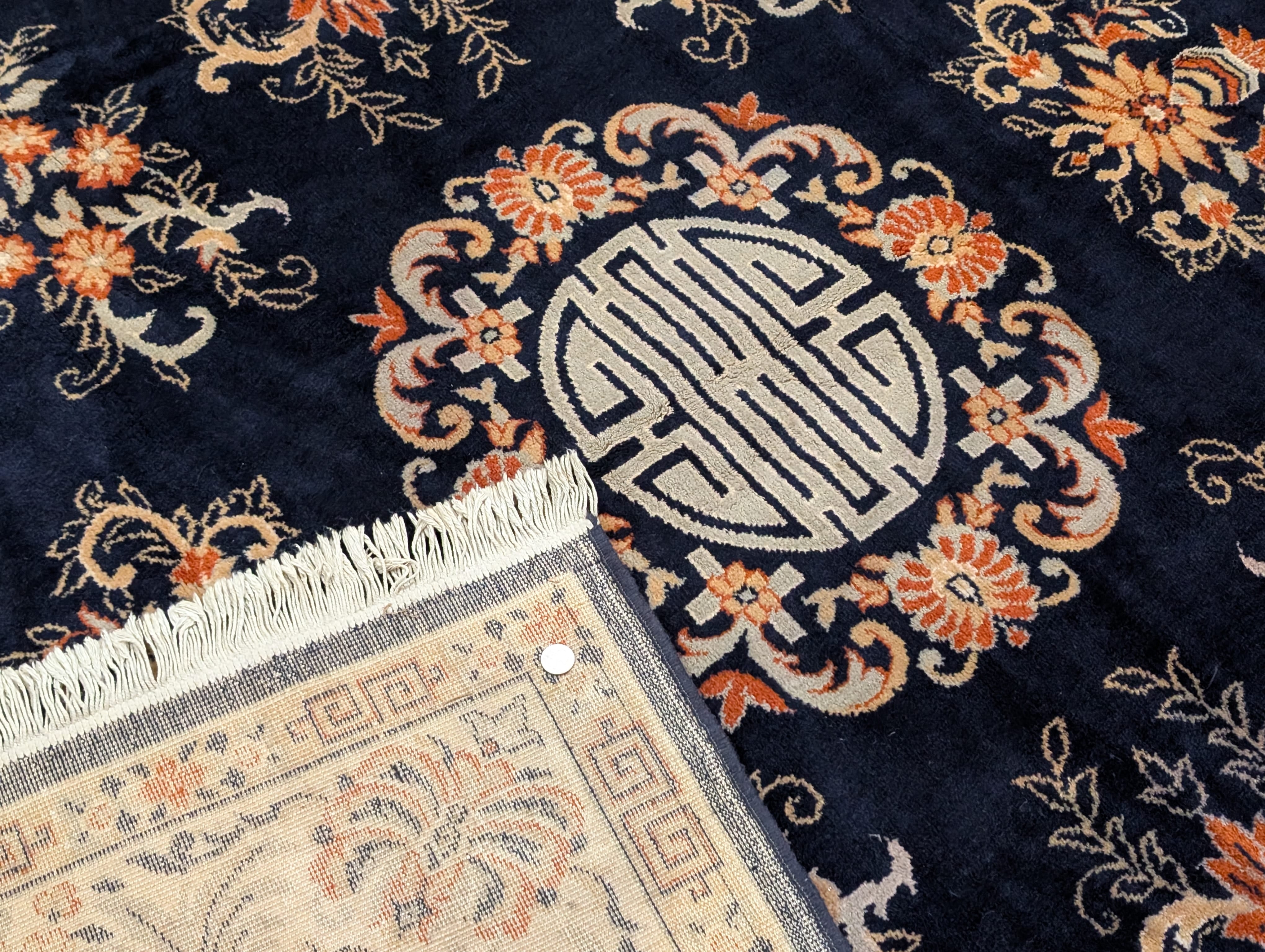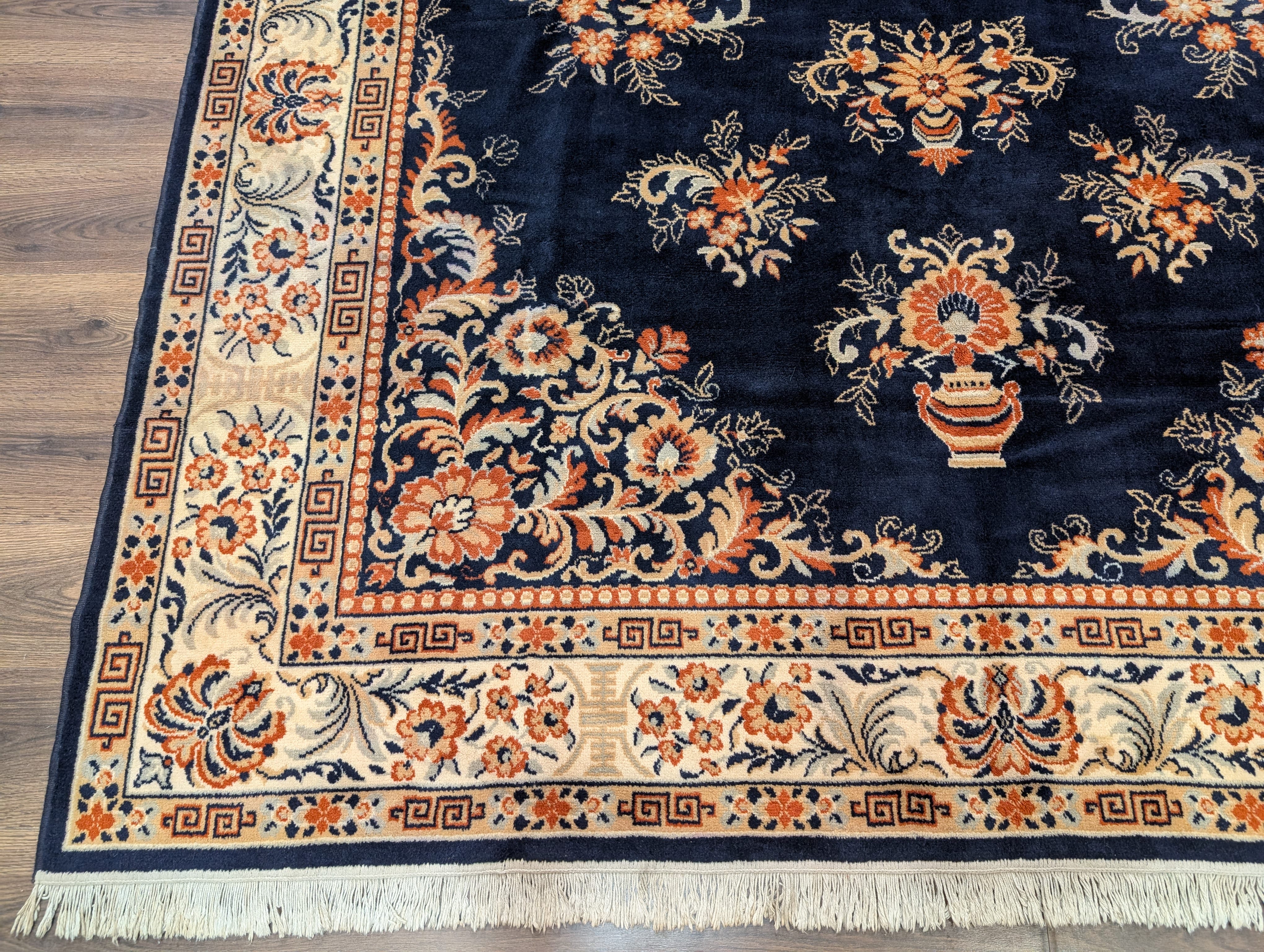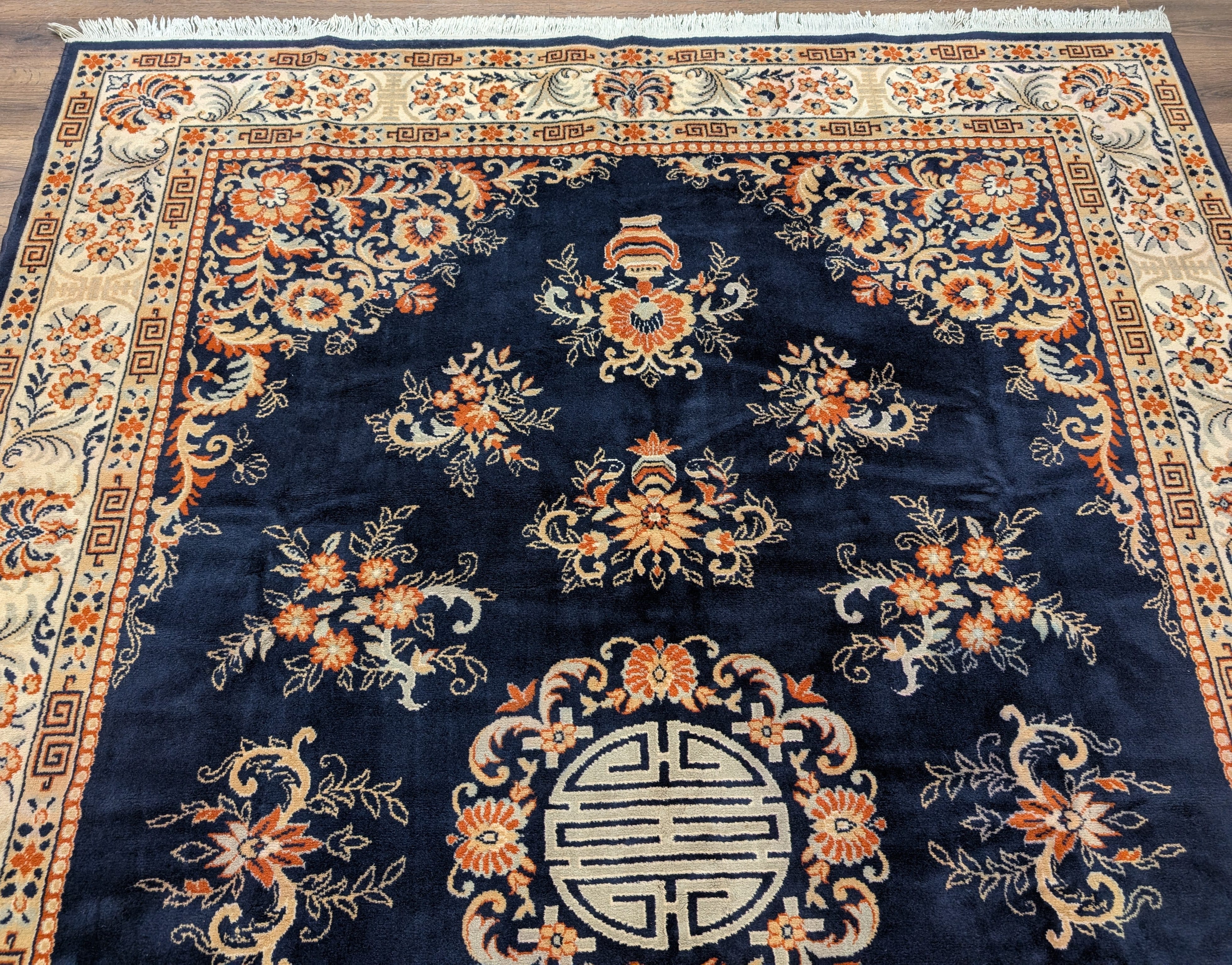 Chinese Wool Rug 8x11, Navy Blue and Cream, Belgium Power Loomed Carpet, Vintage
