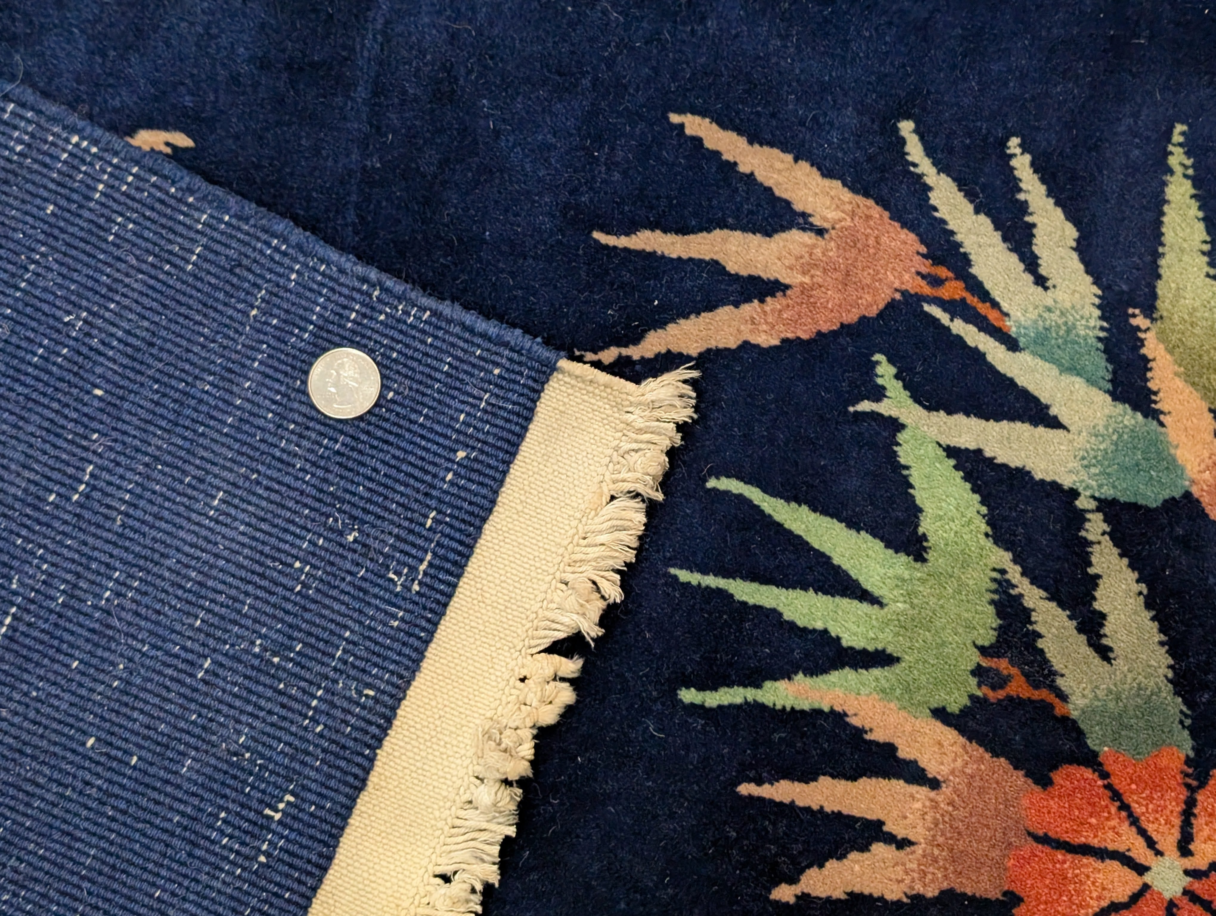 Authentic Chinese Art Deco rugs typically feature dense, heavy construction with machine-spun yarn and cotton foundations. Look for the characteristic carved pile effect, vibrant jewel-tone colors that haven't faded uniformly, and asymmetrical compositions with generous use of negative space. Tianjin-produced examples often show superior craftsmanship with precise design execution and the distinctive color combinations that defined the era.