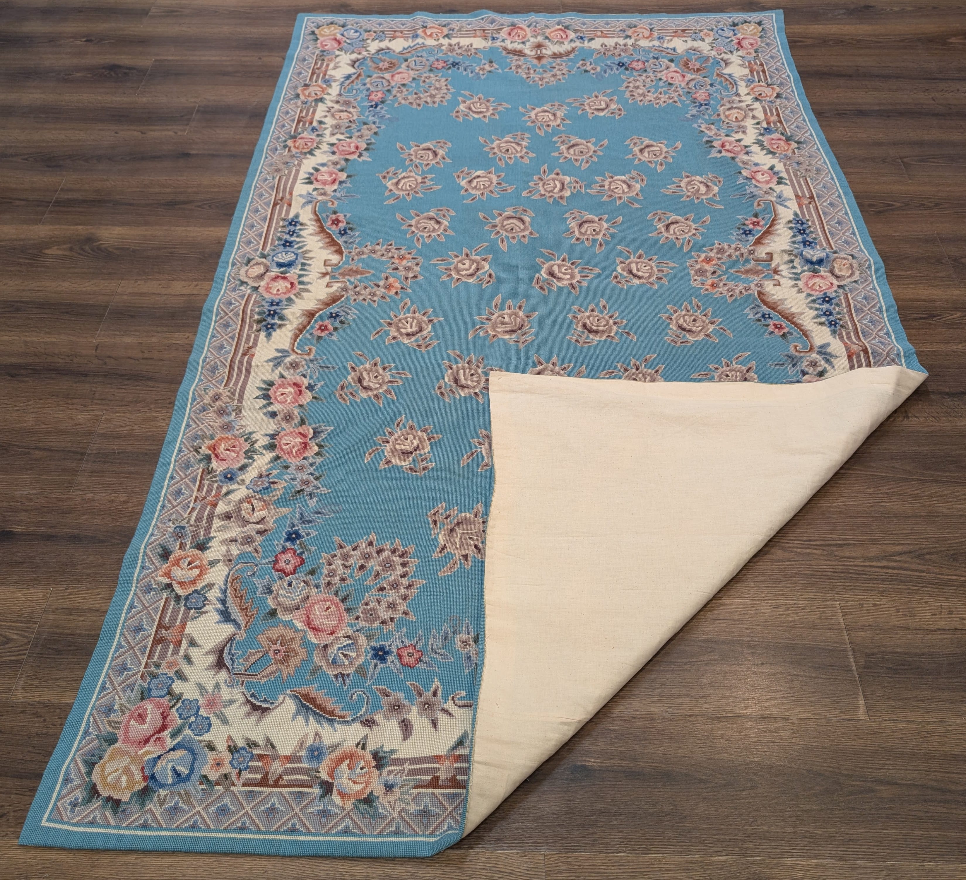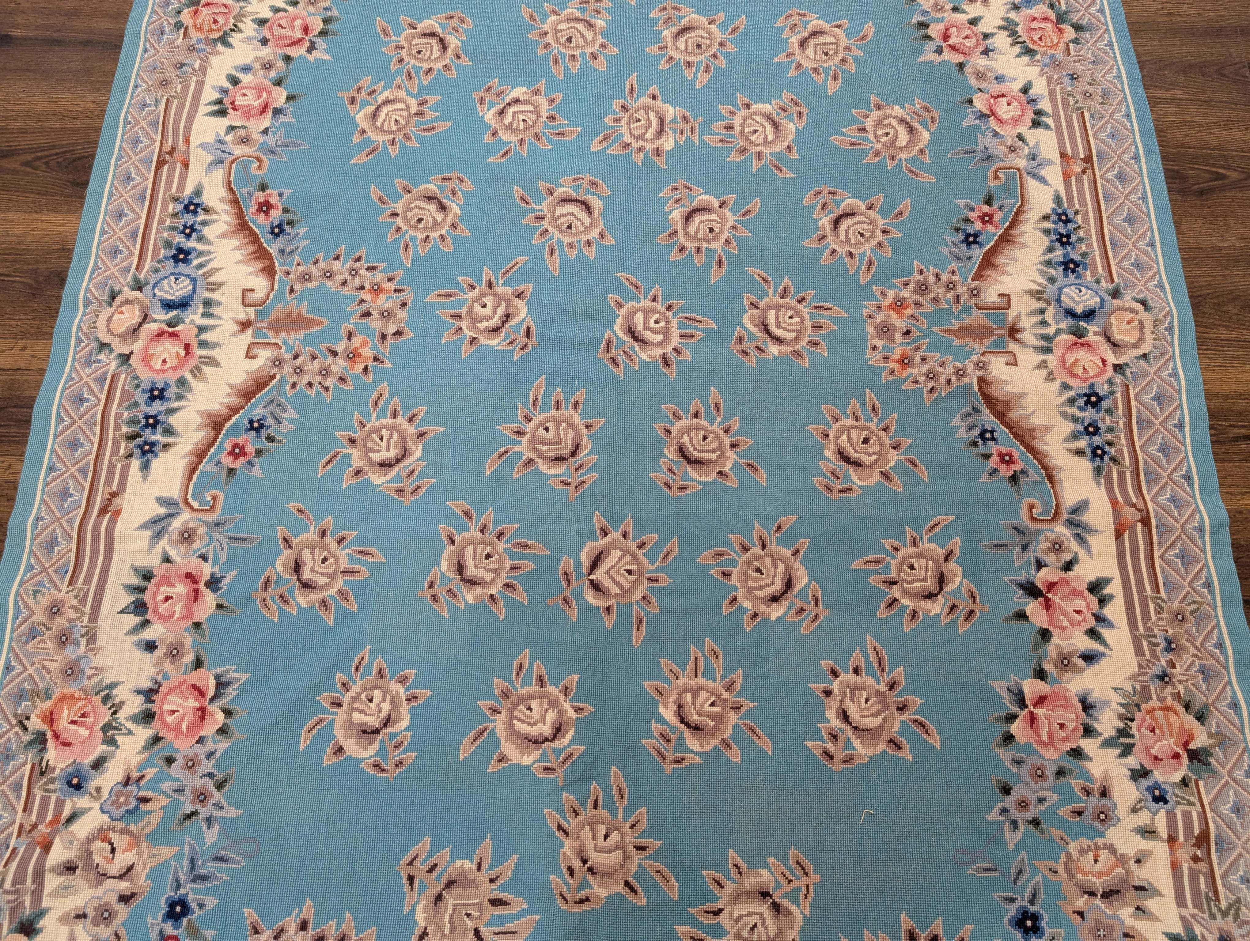 Light Blue Needlepoint Rug 5x8, Floral, New