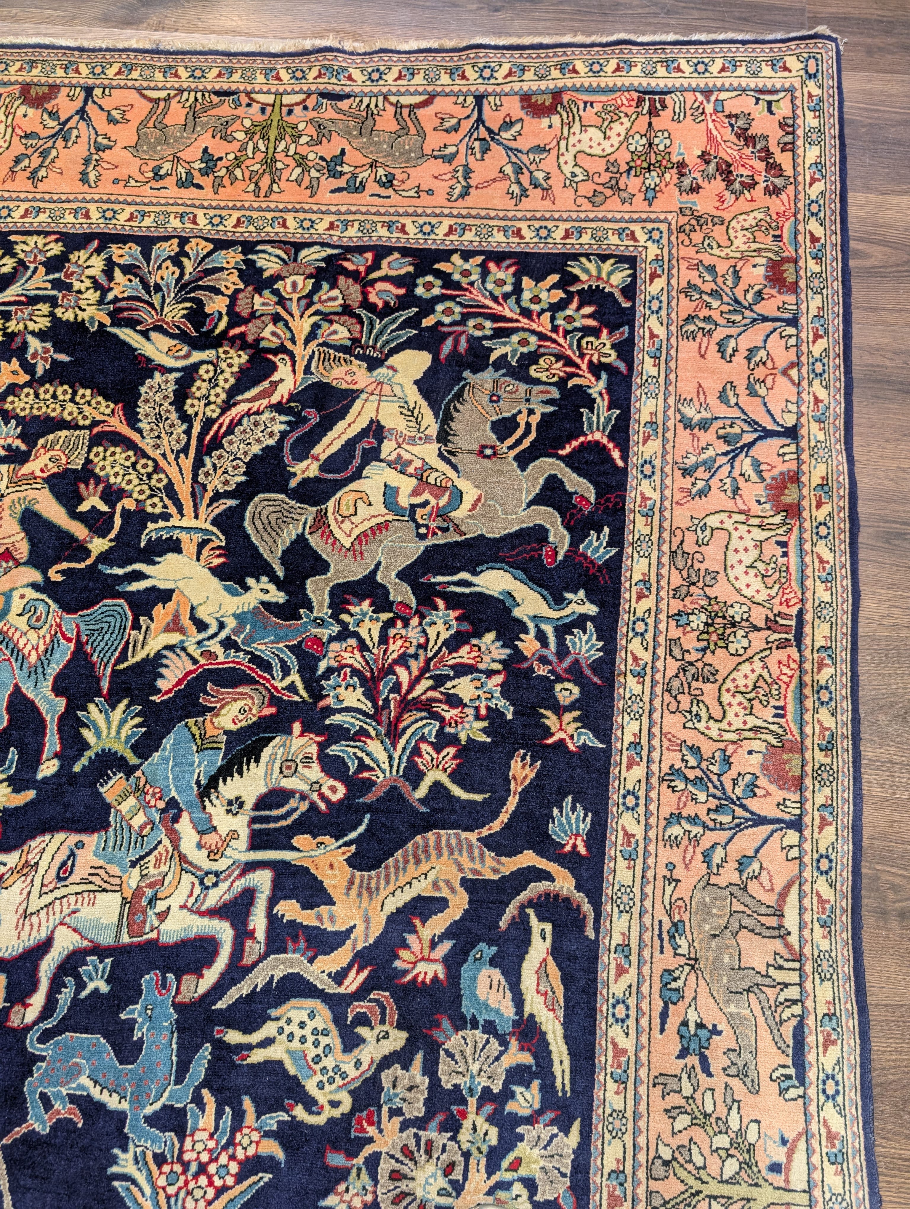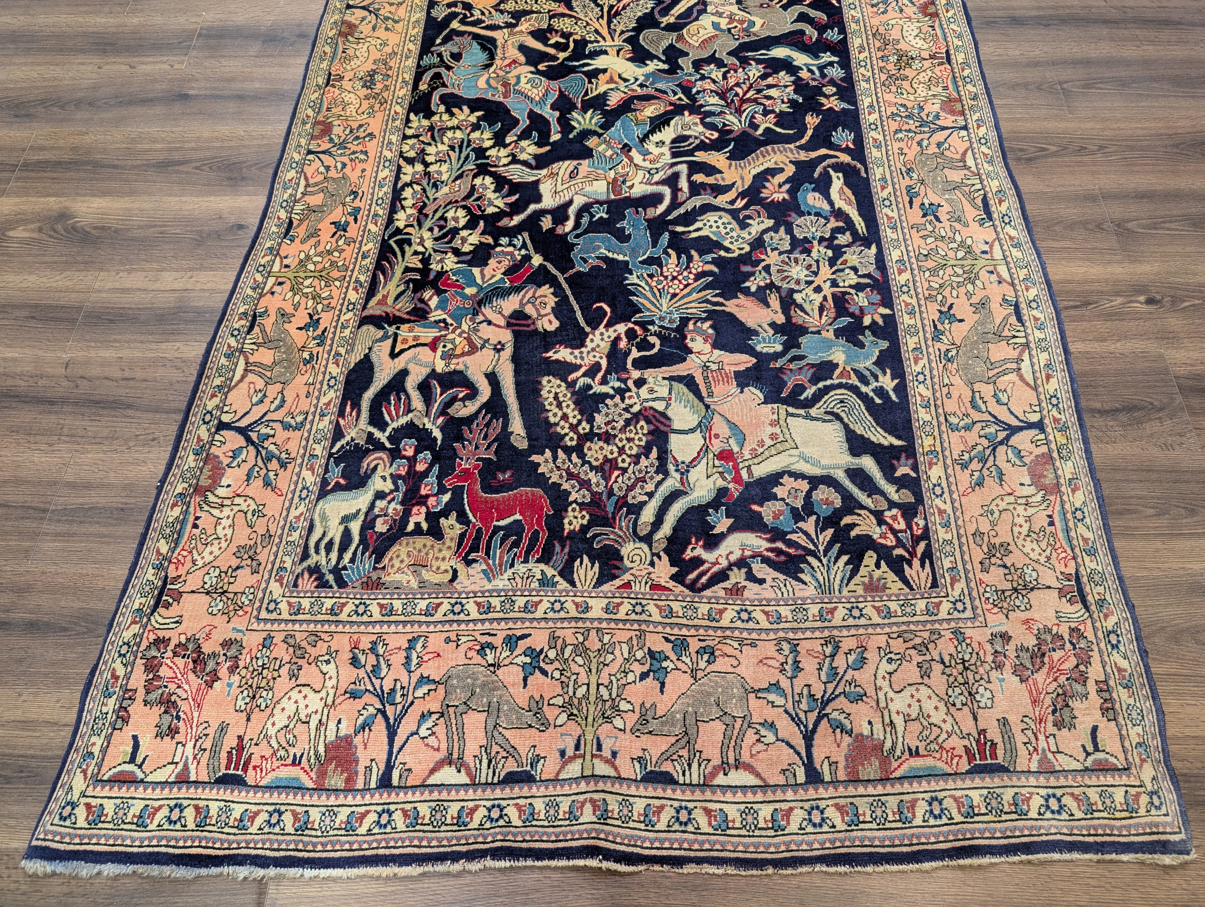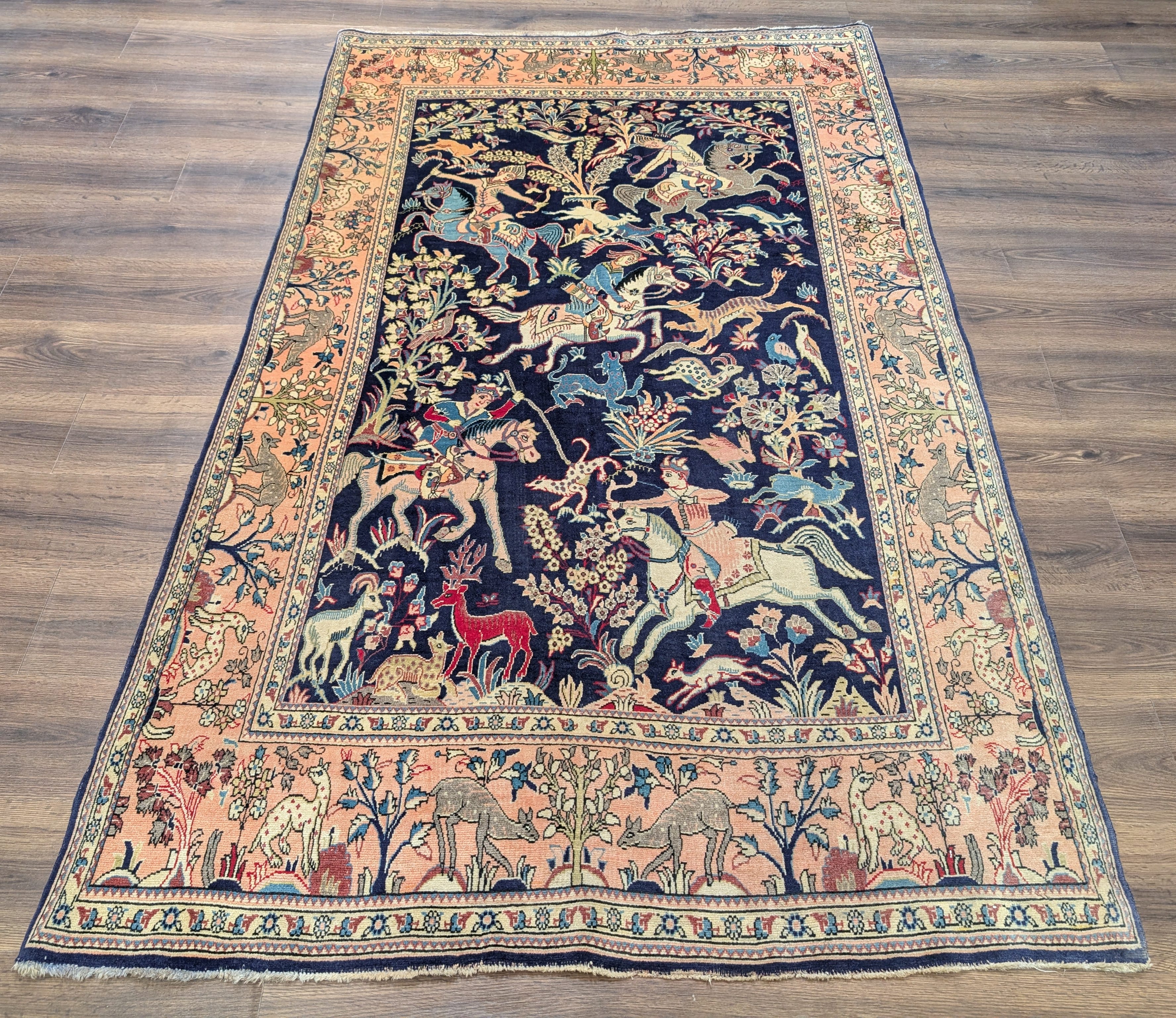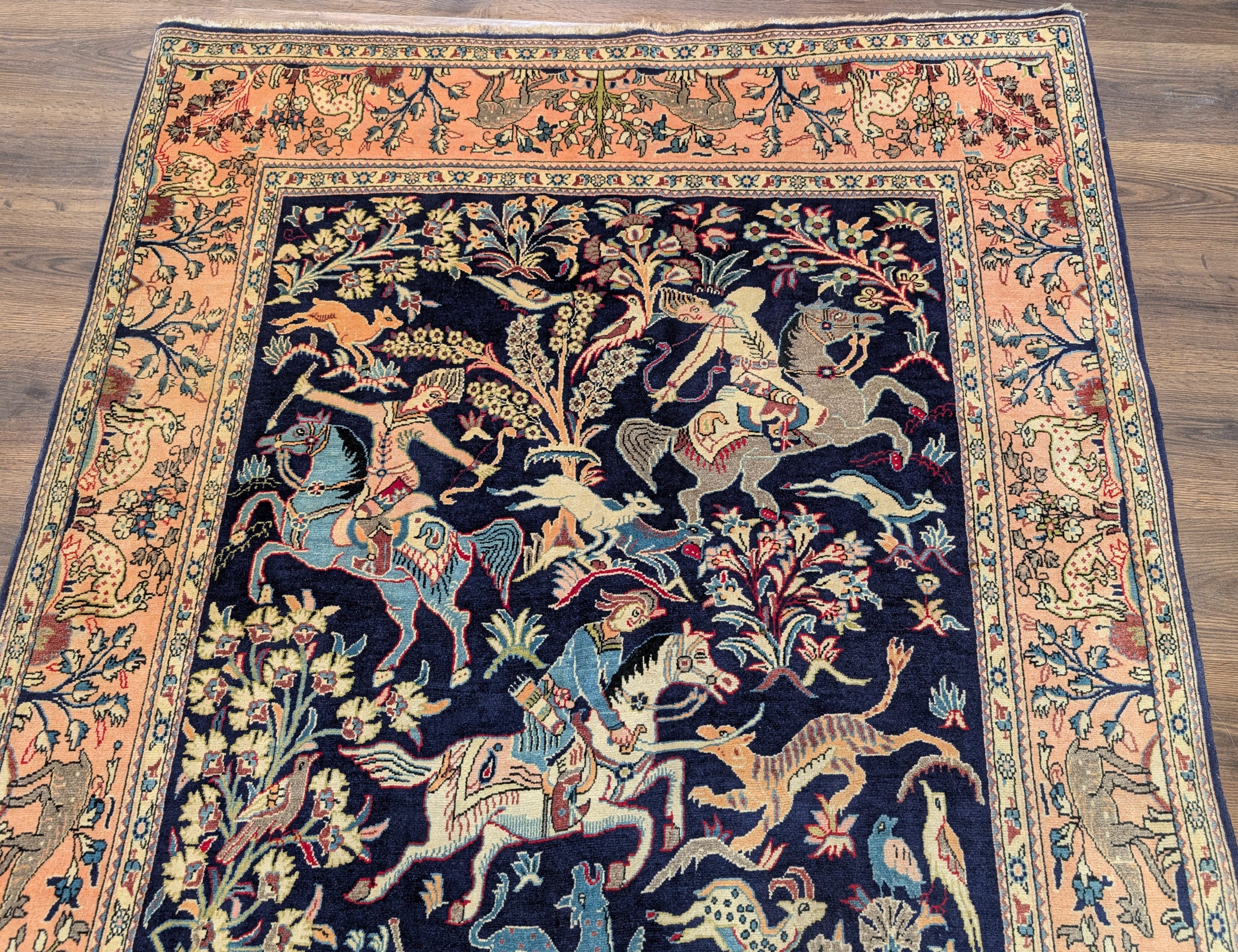 Navy Blue Persian Qum Rug 5x8, Hunting Pattern