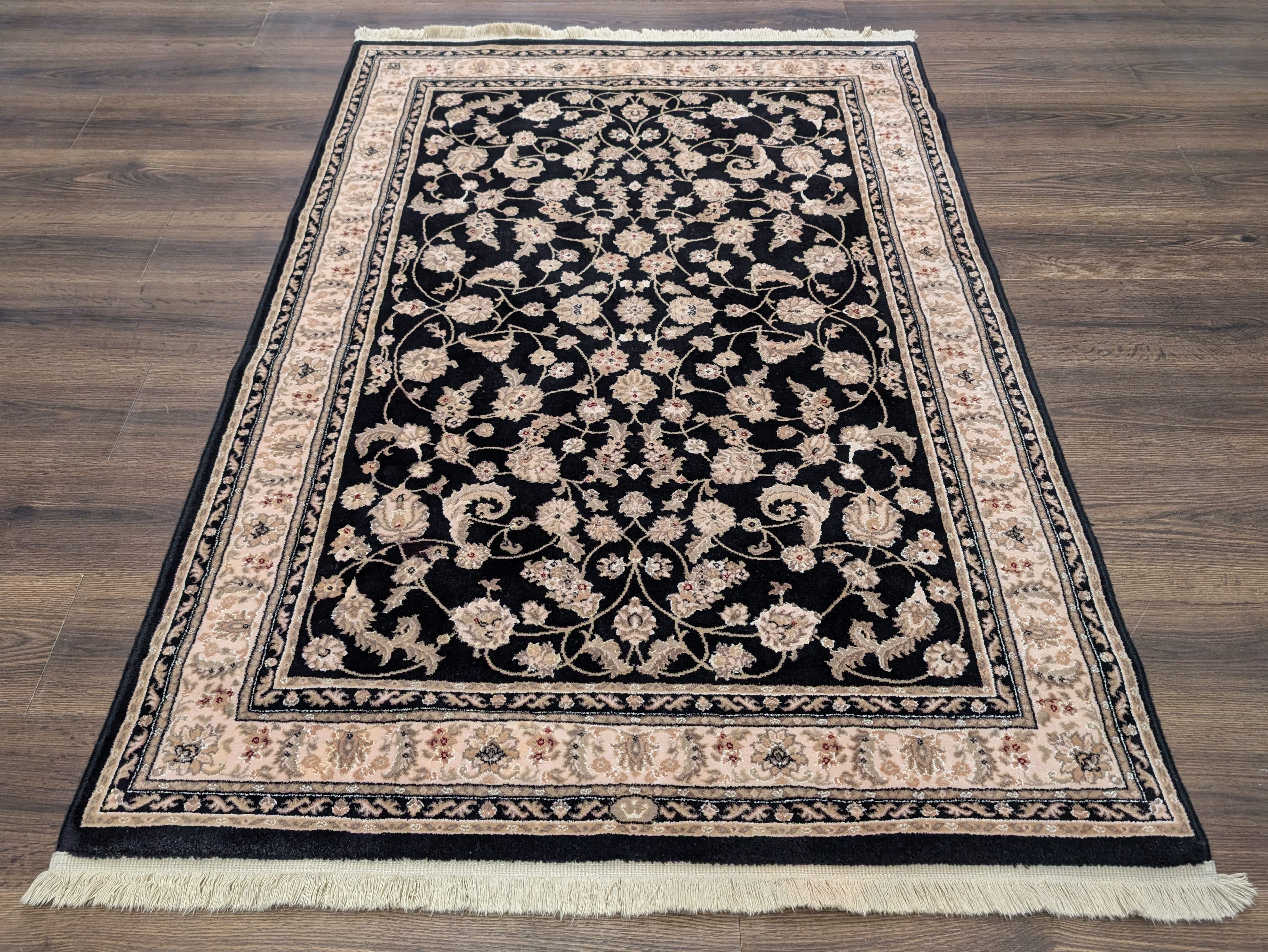 Black Sino Persian Rug 5x7, Allover Floral Pattern, Fine 225 KPSI, Wool & Silk