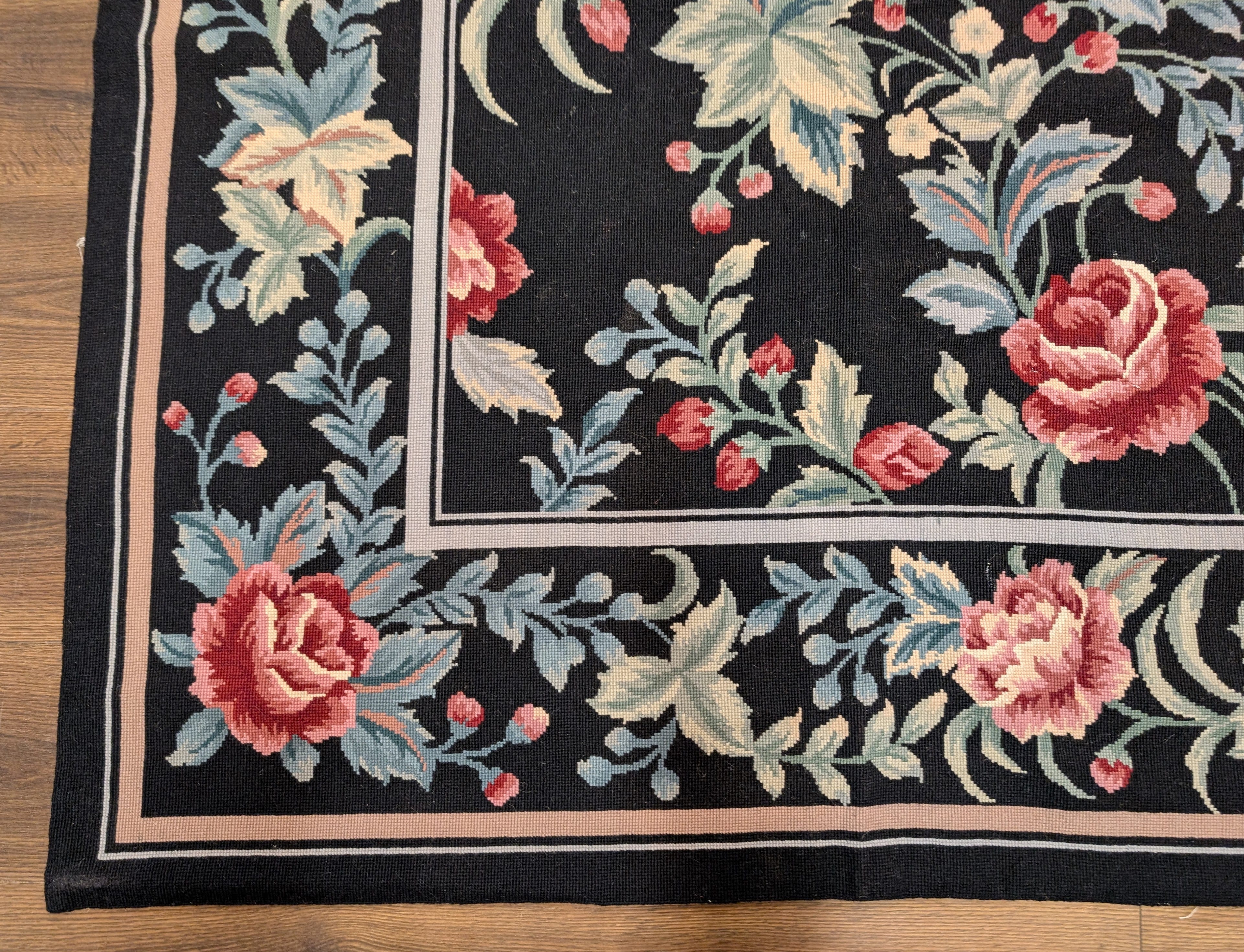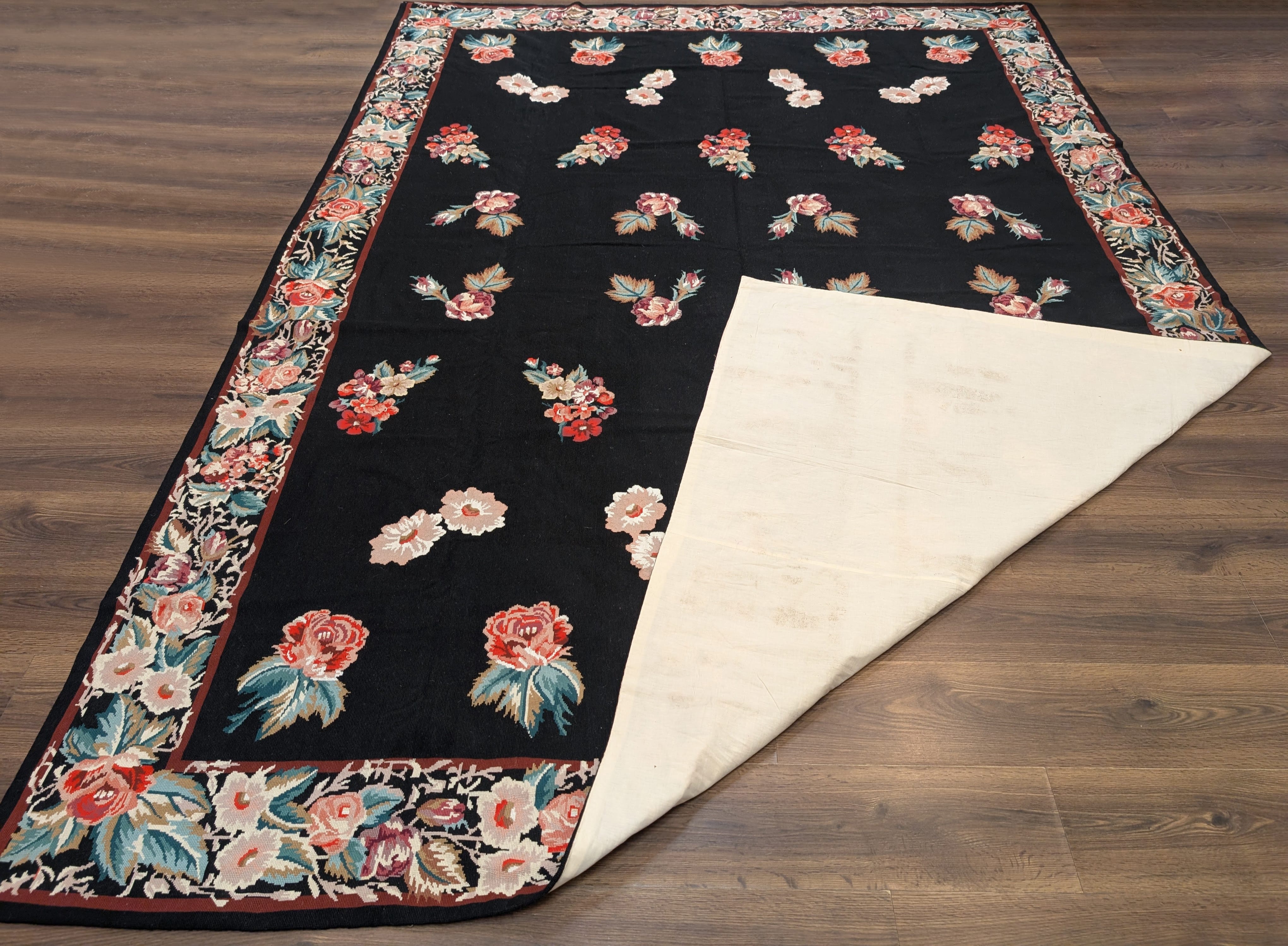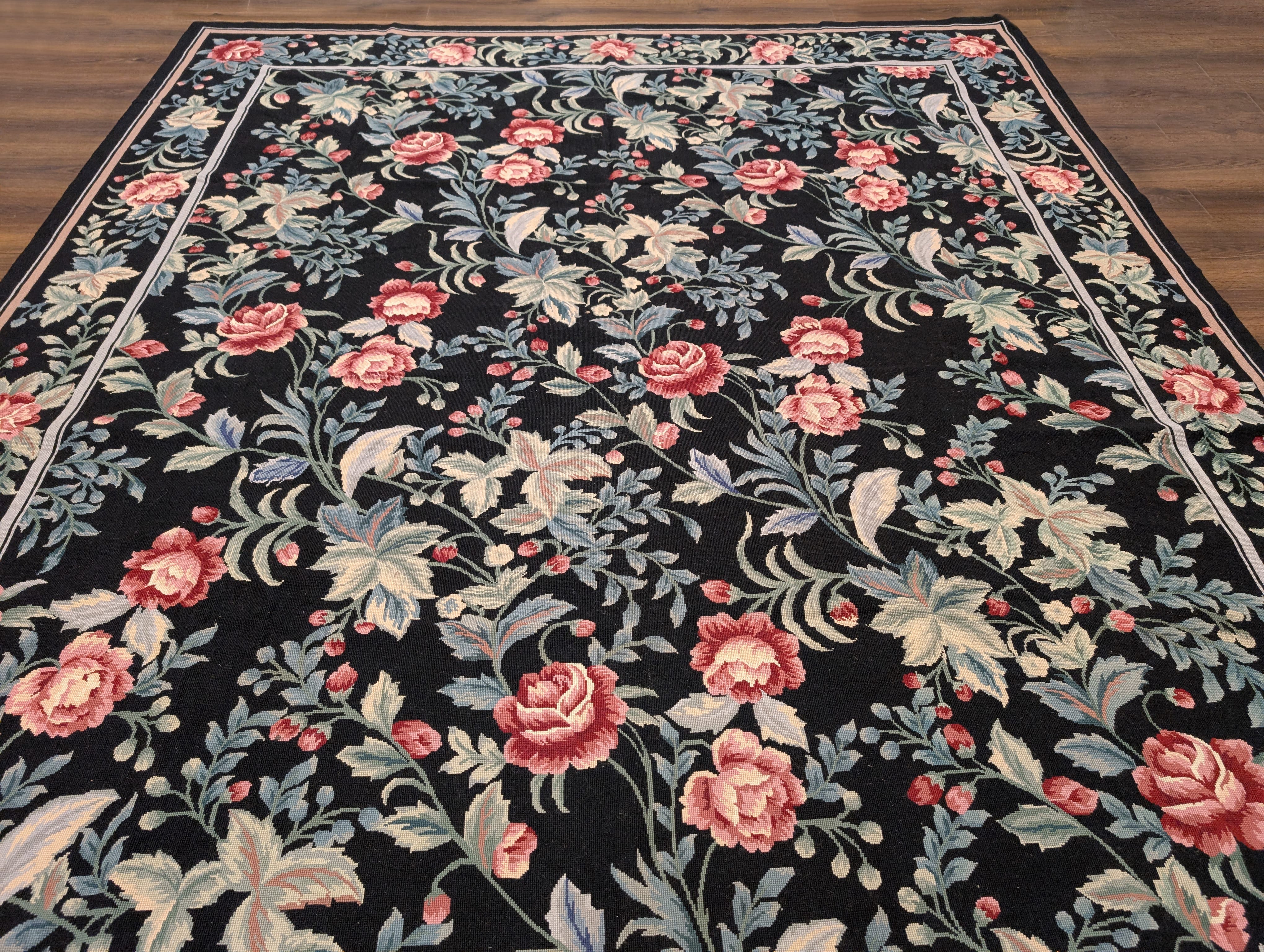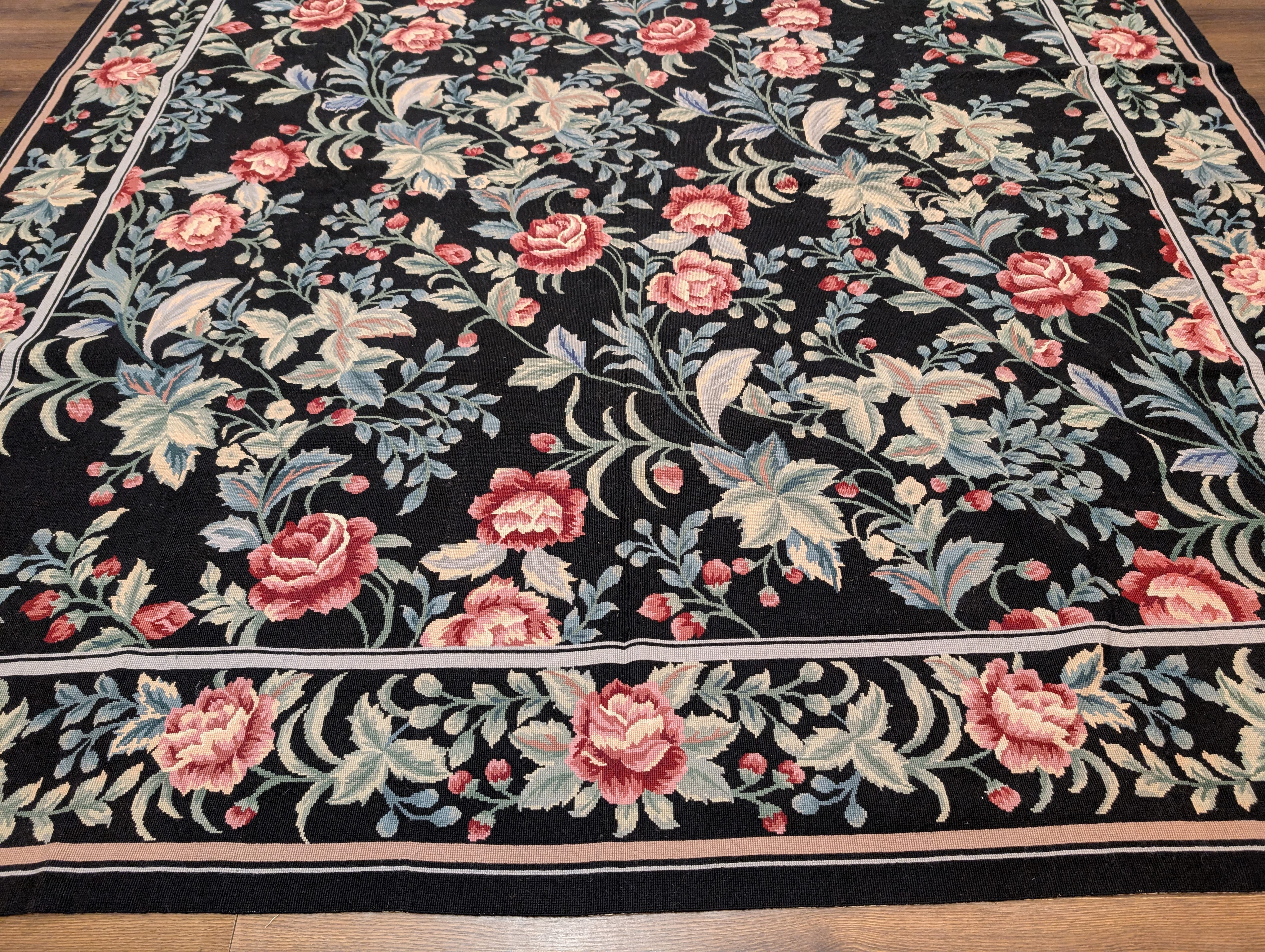 Black Needlepoint Rug 8x11, Botanical Rose Design, New