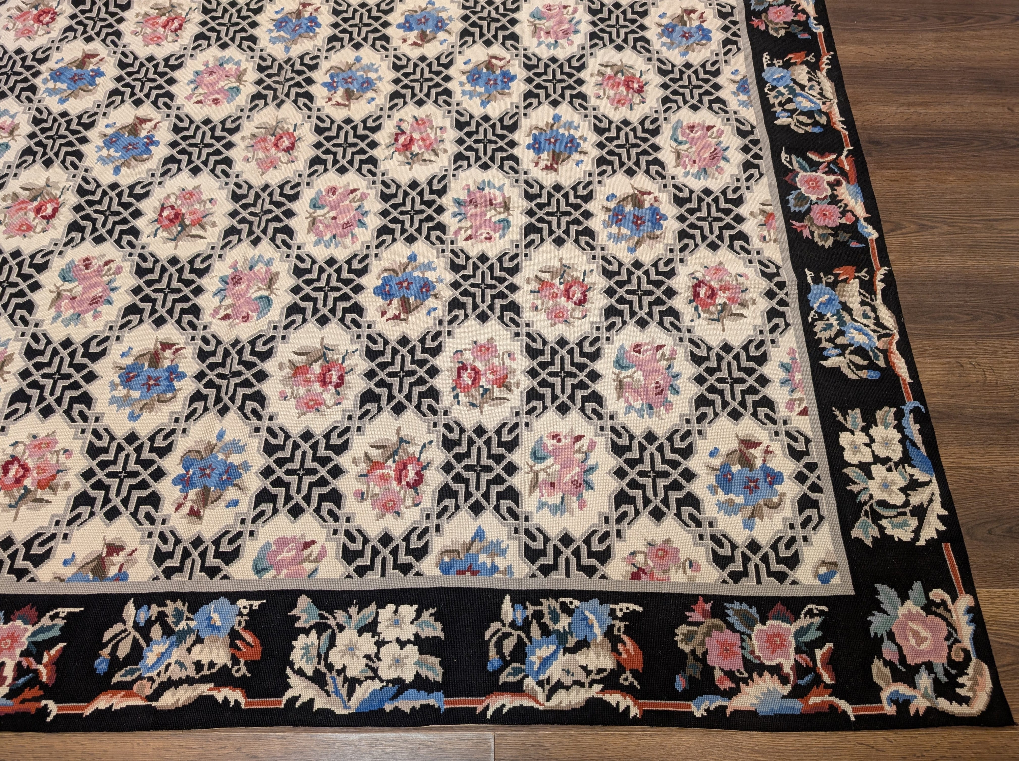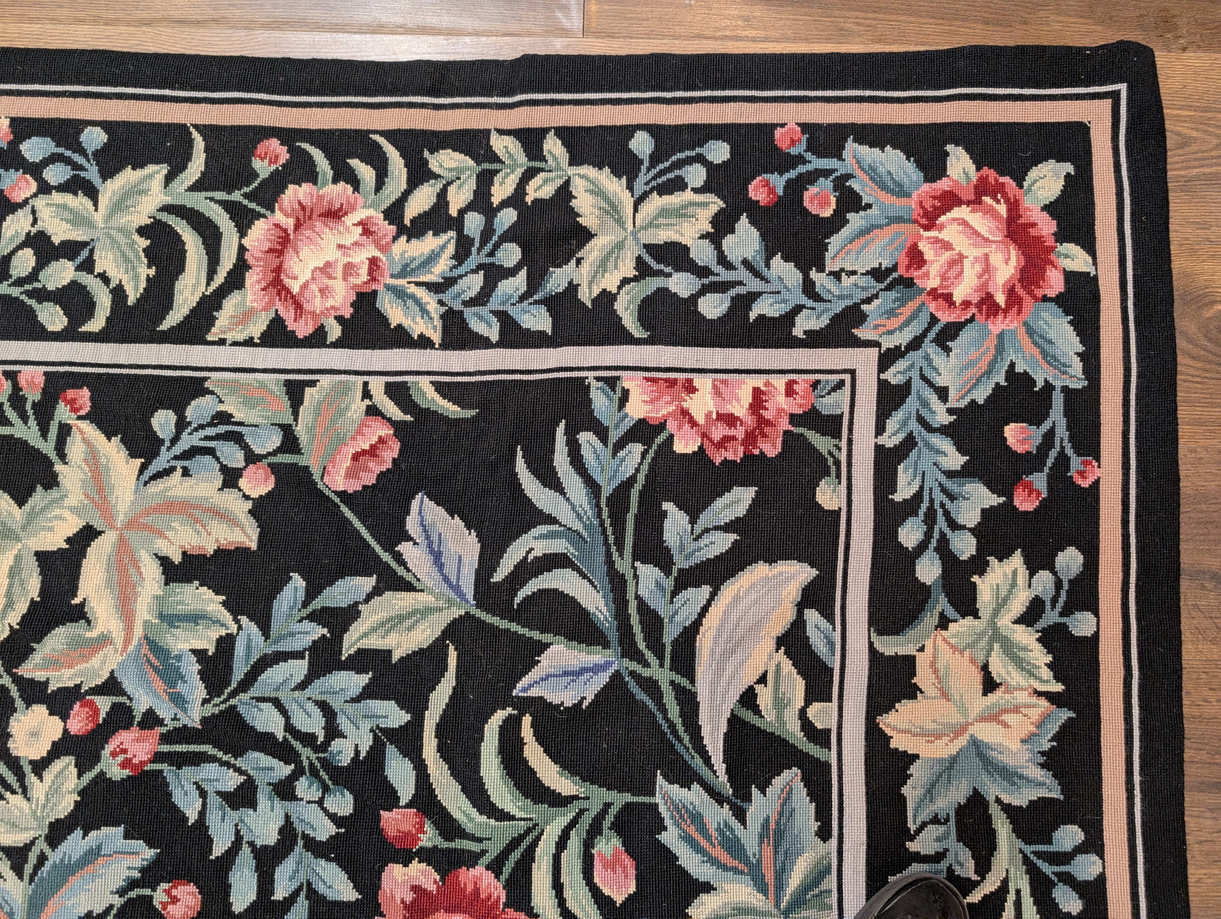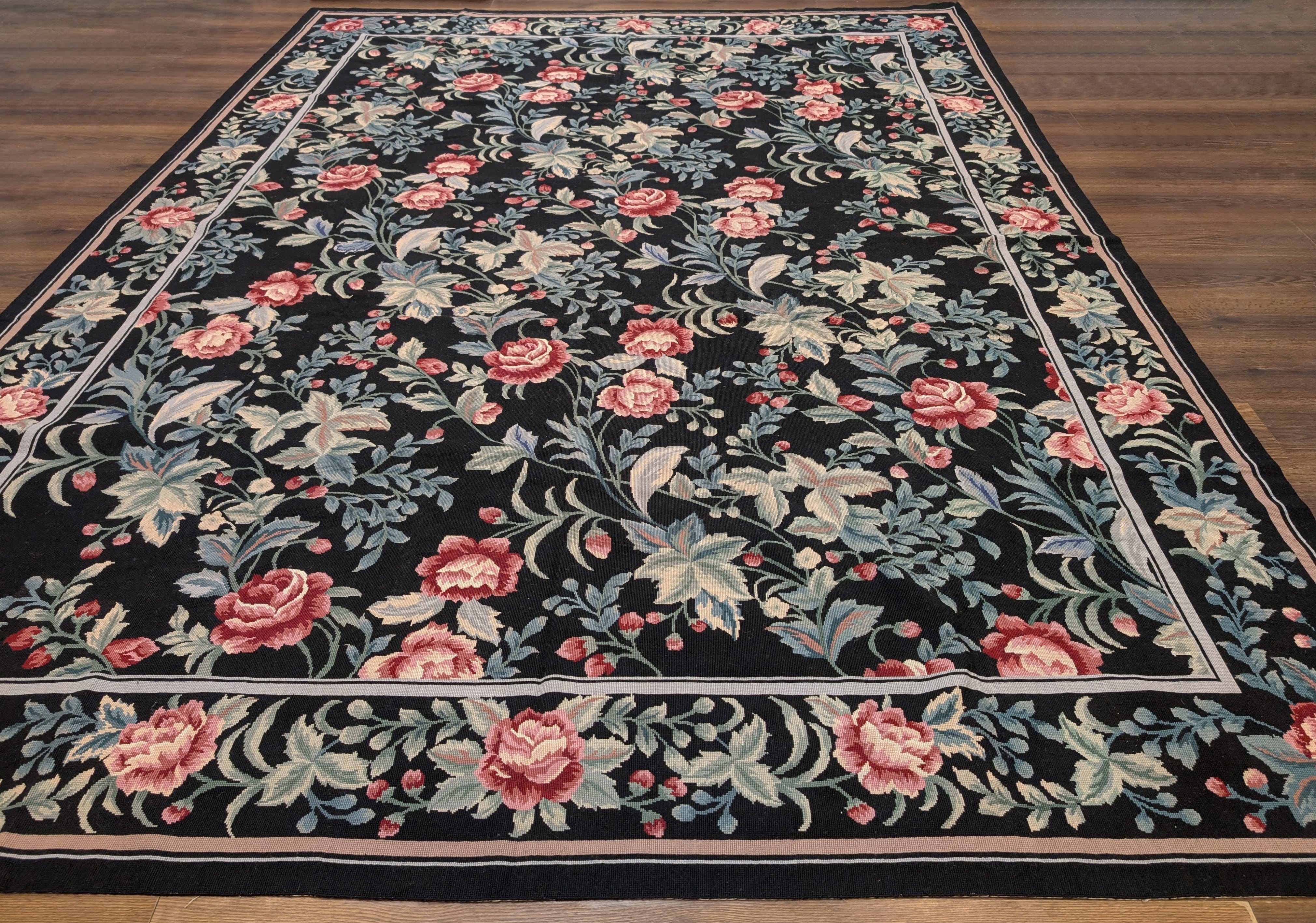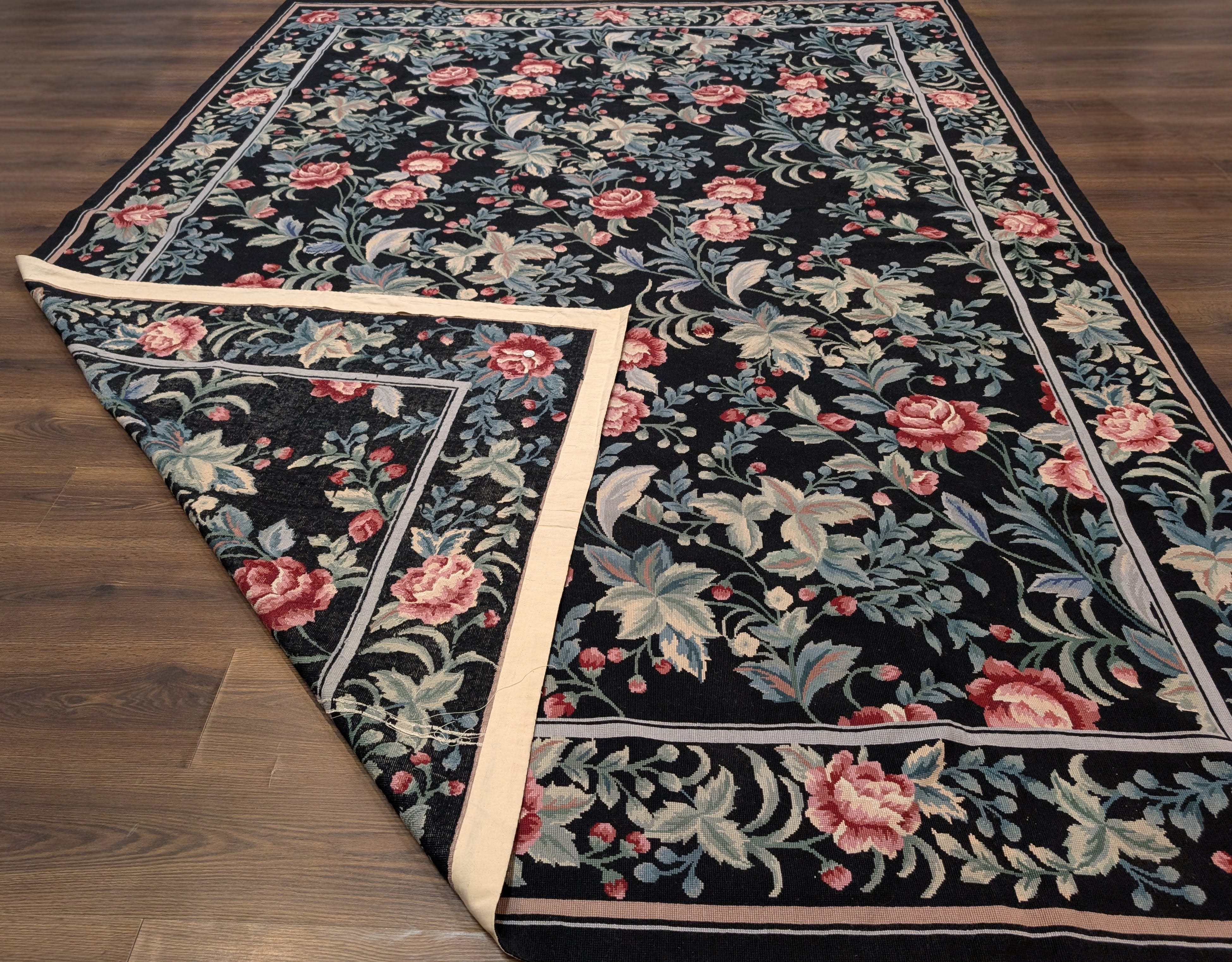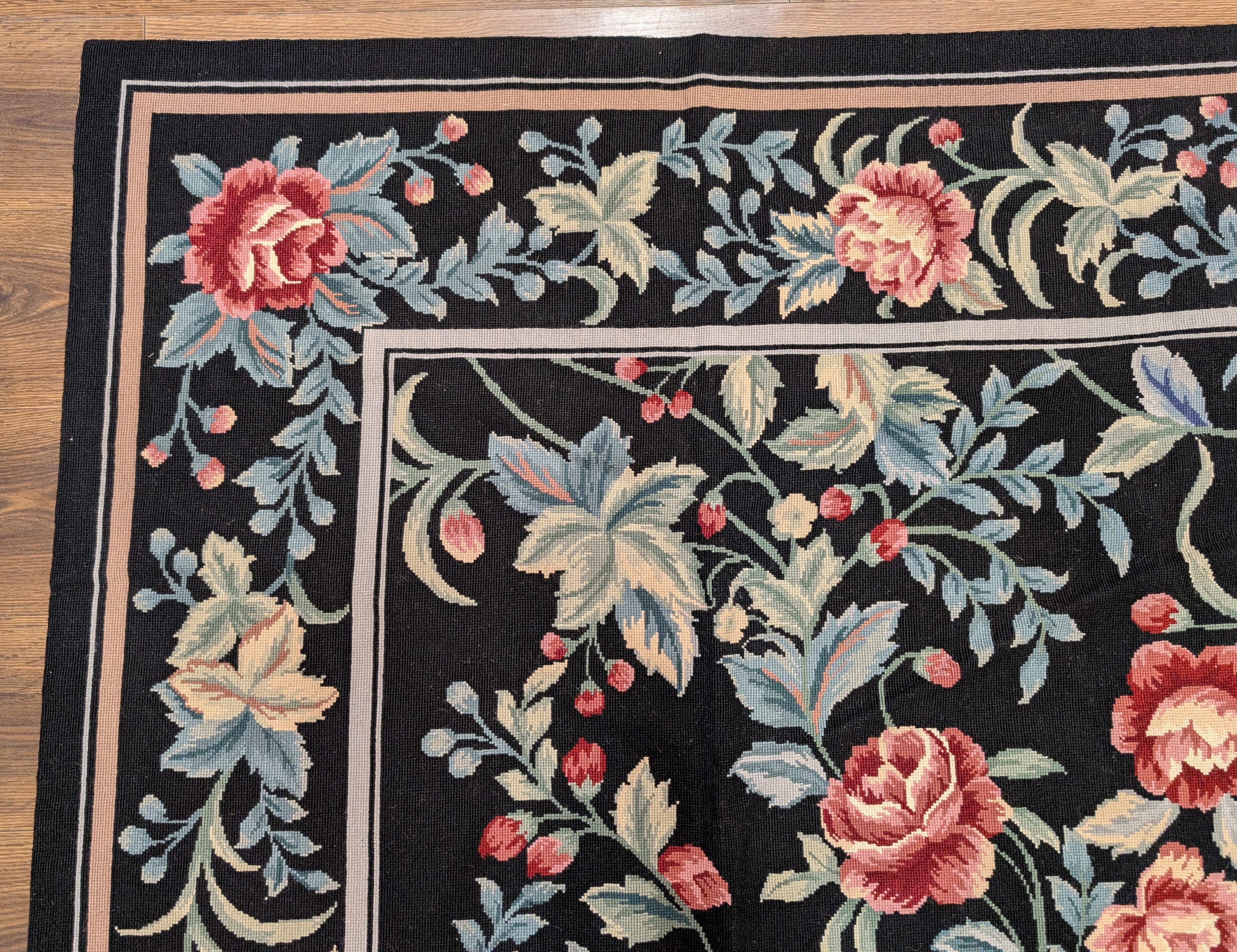 Black Needlepoint Rug 8x11, Botanical Rose Design, New