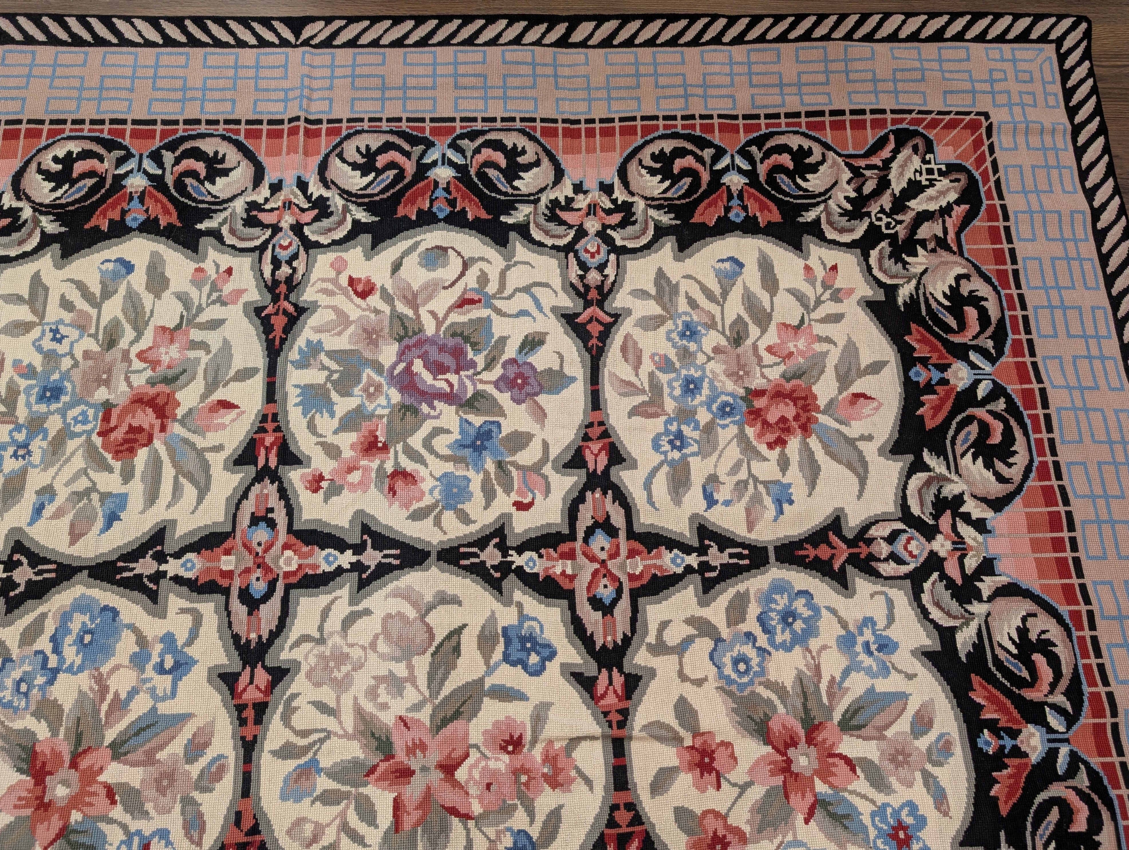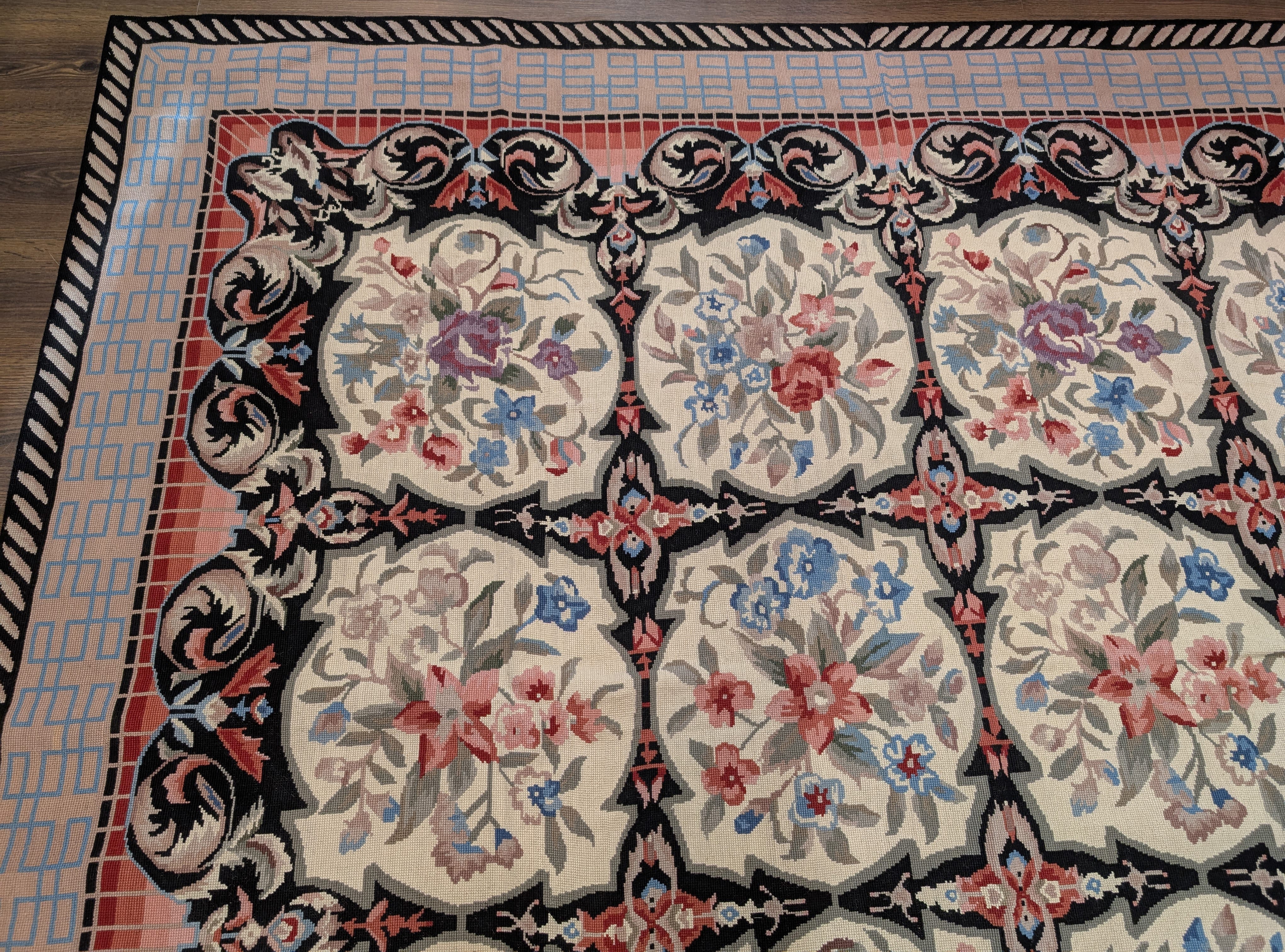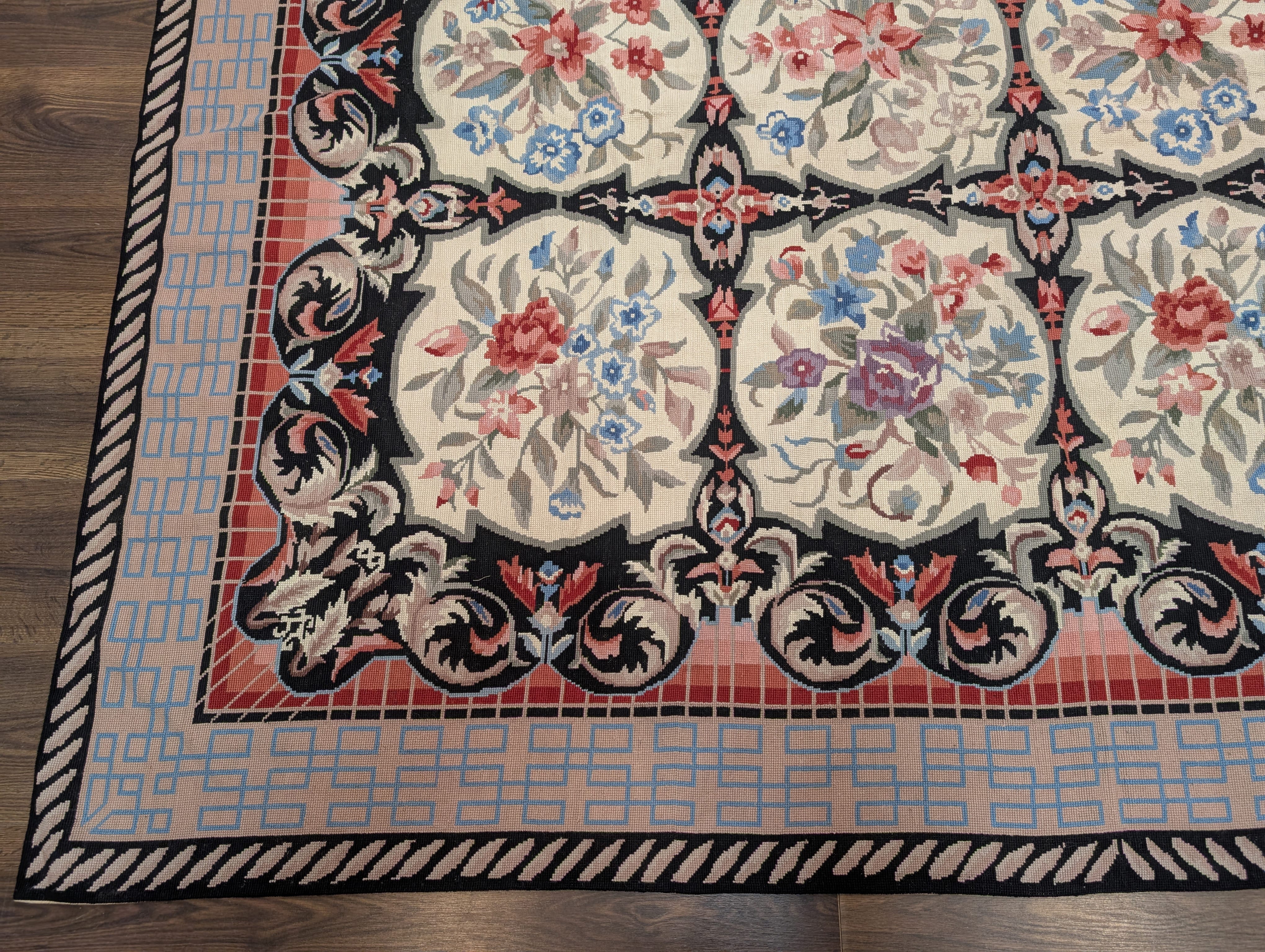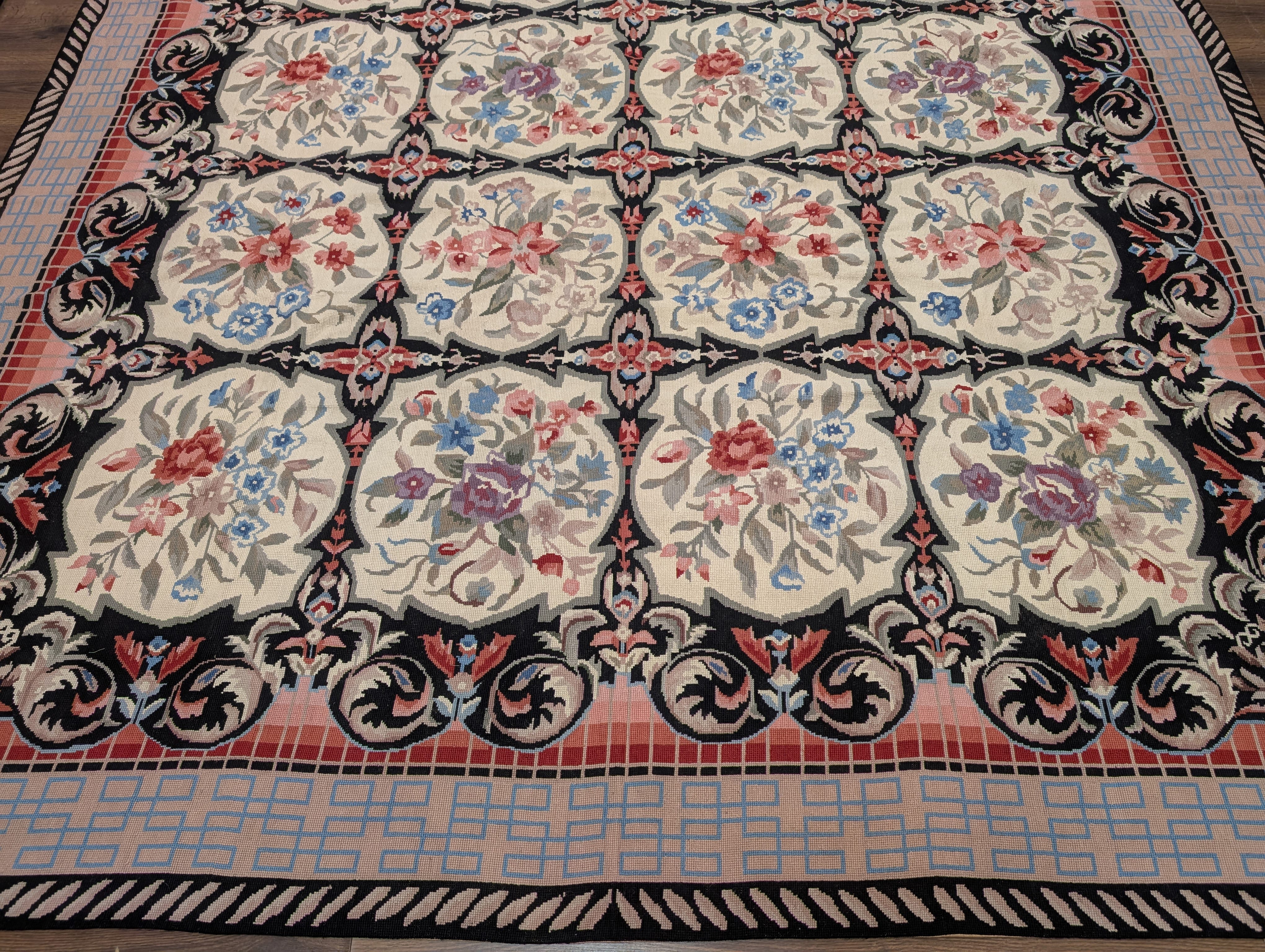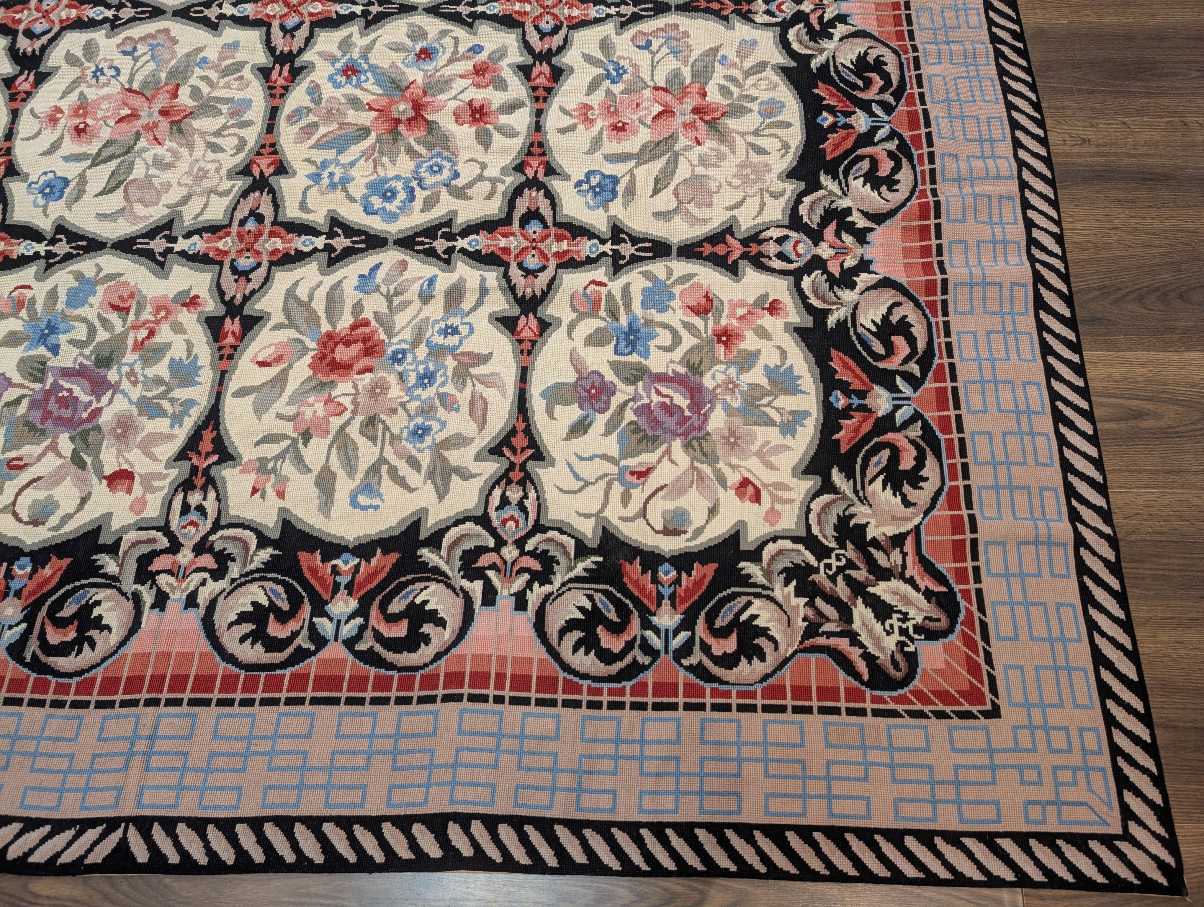 Needlepoint Rug 10x14, English European Floral Panel Design
