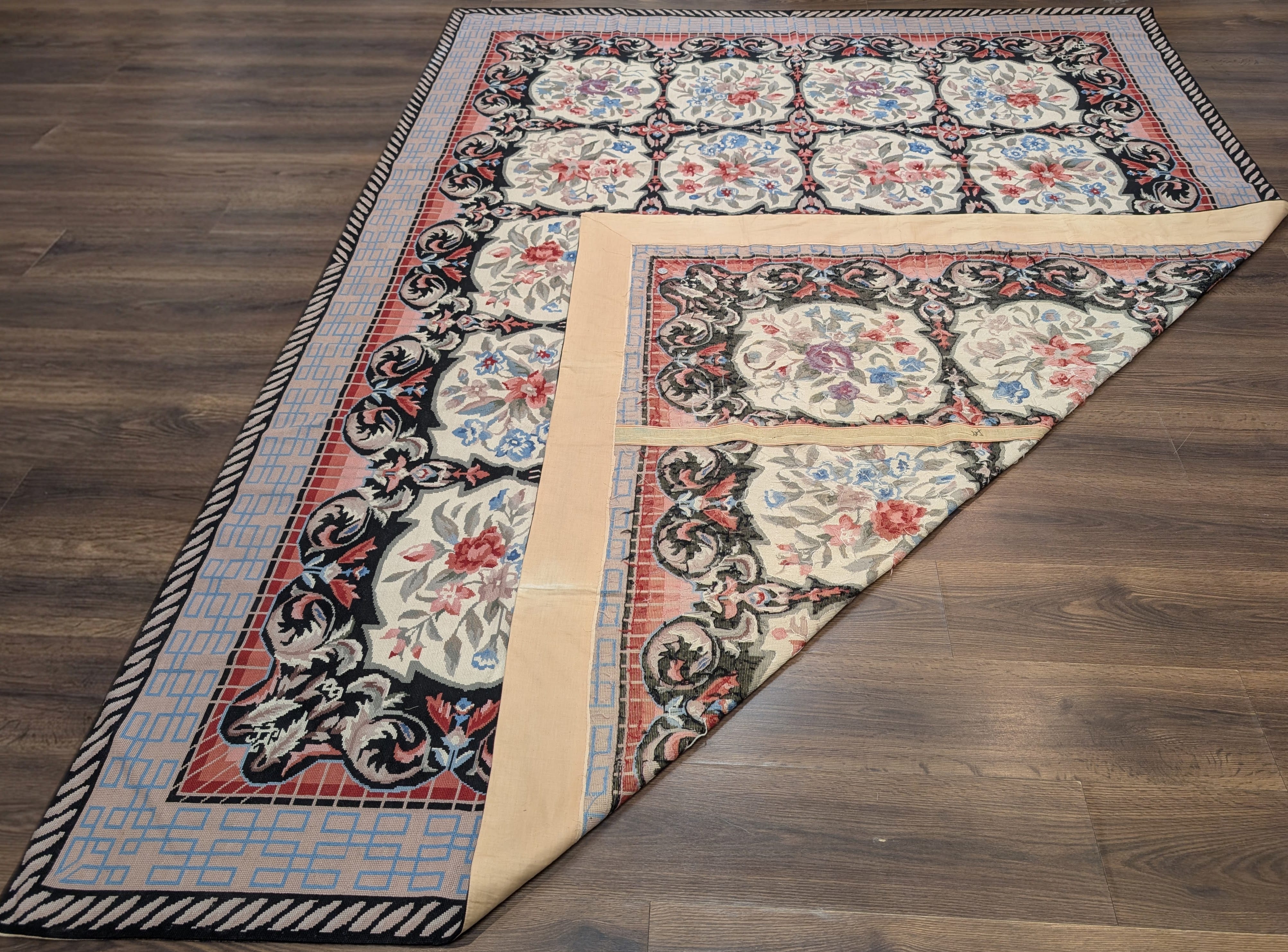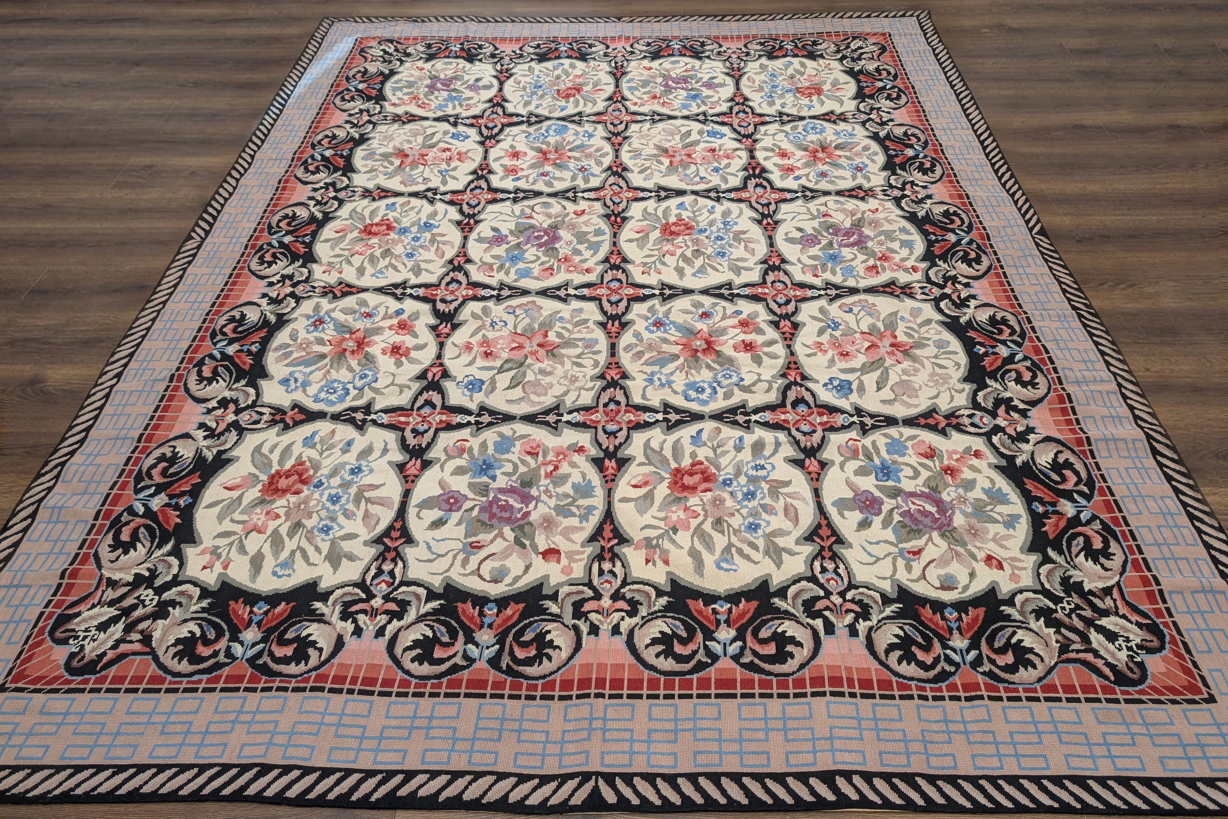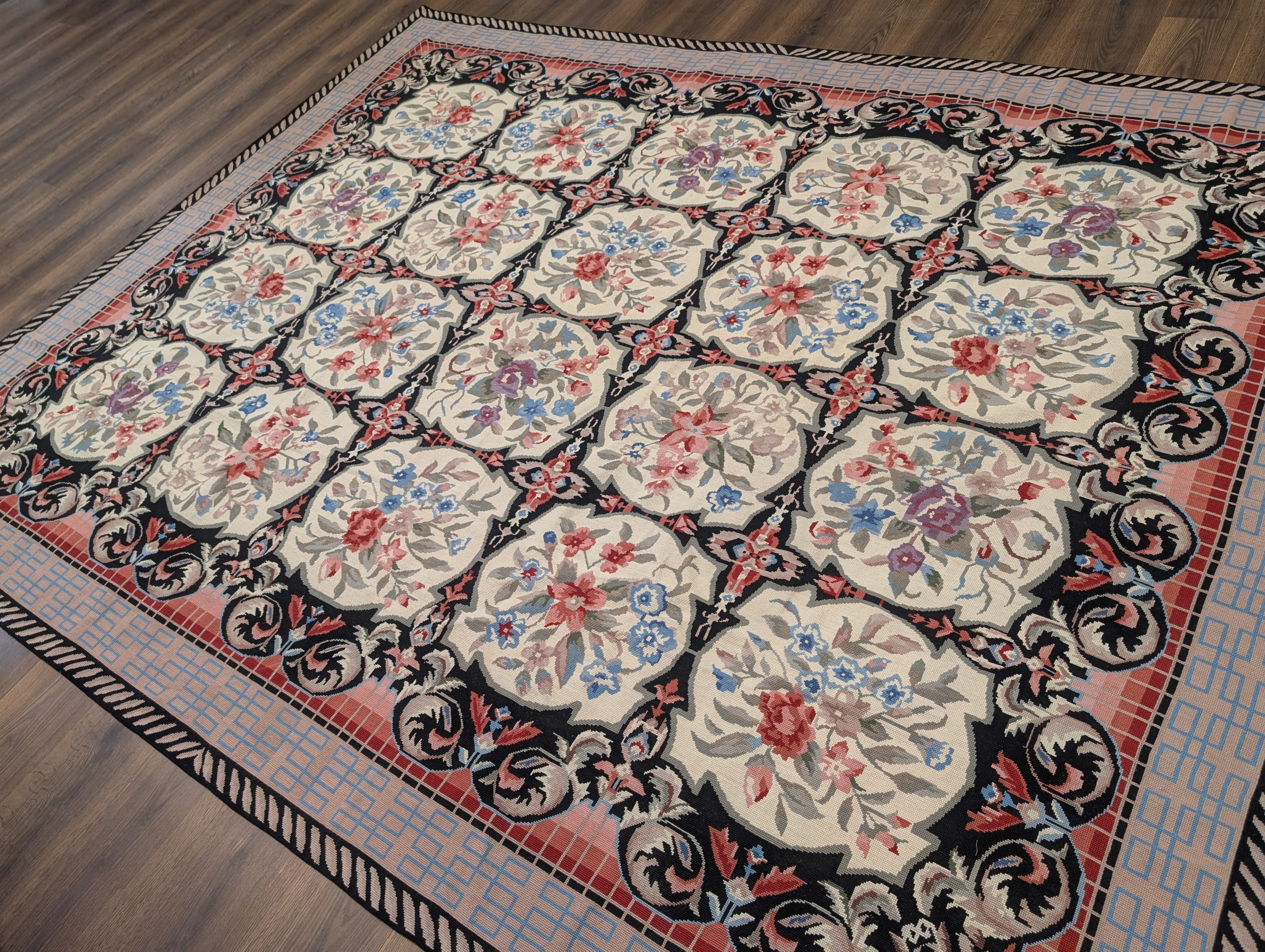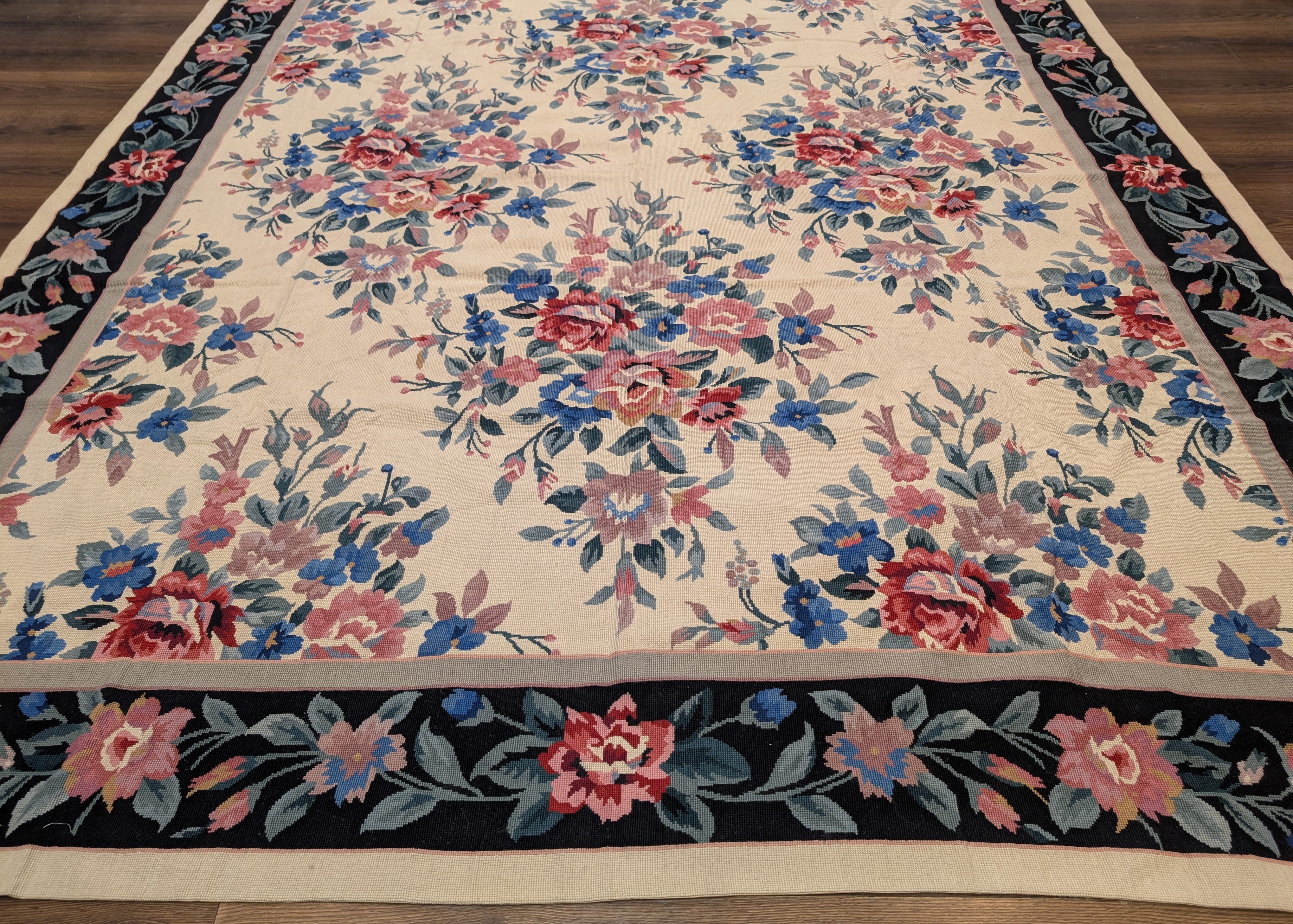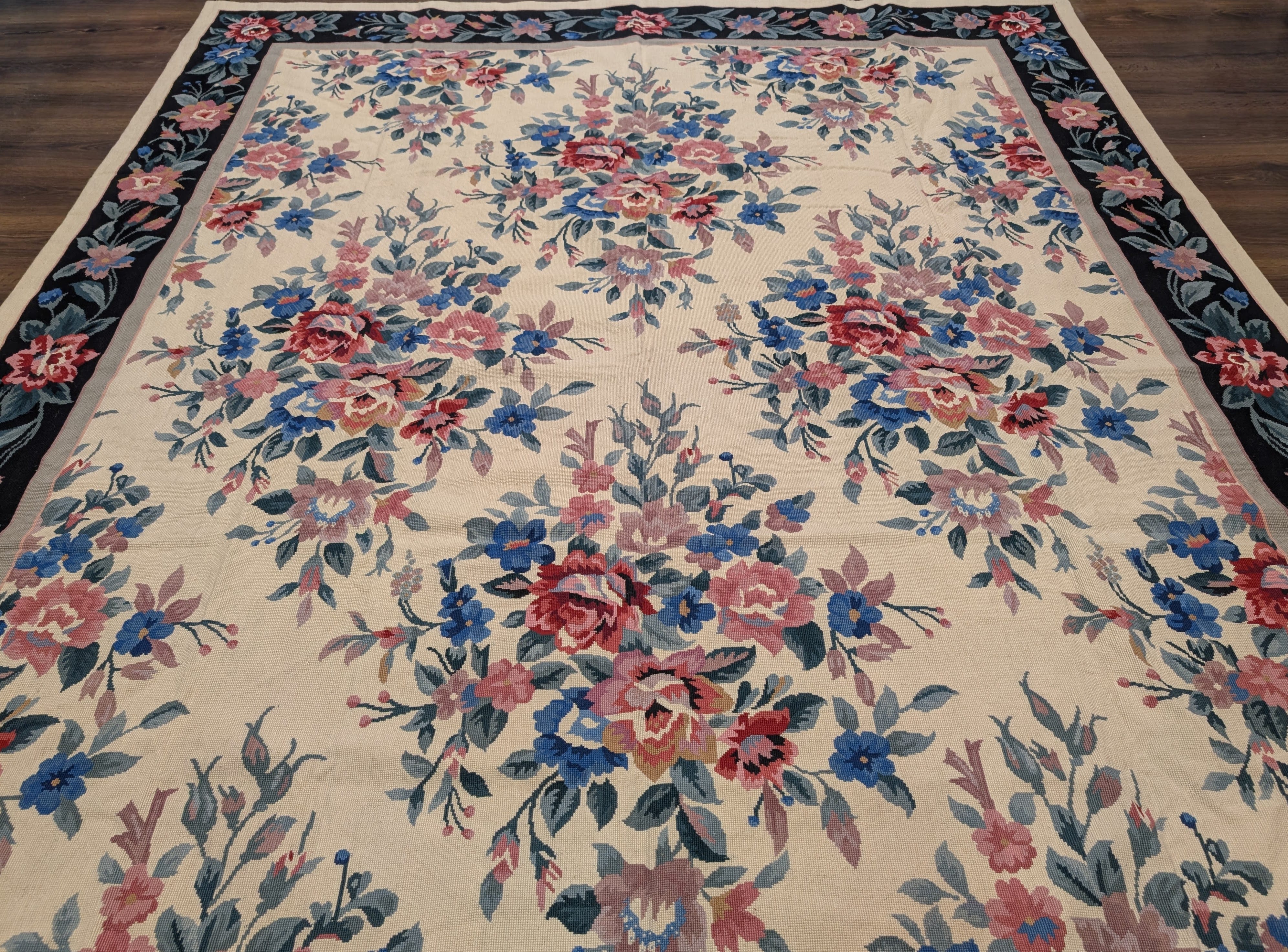 Needlepoint Rug 10x14, English European Floral Panel Design