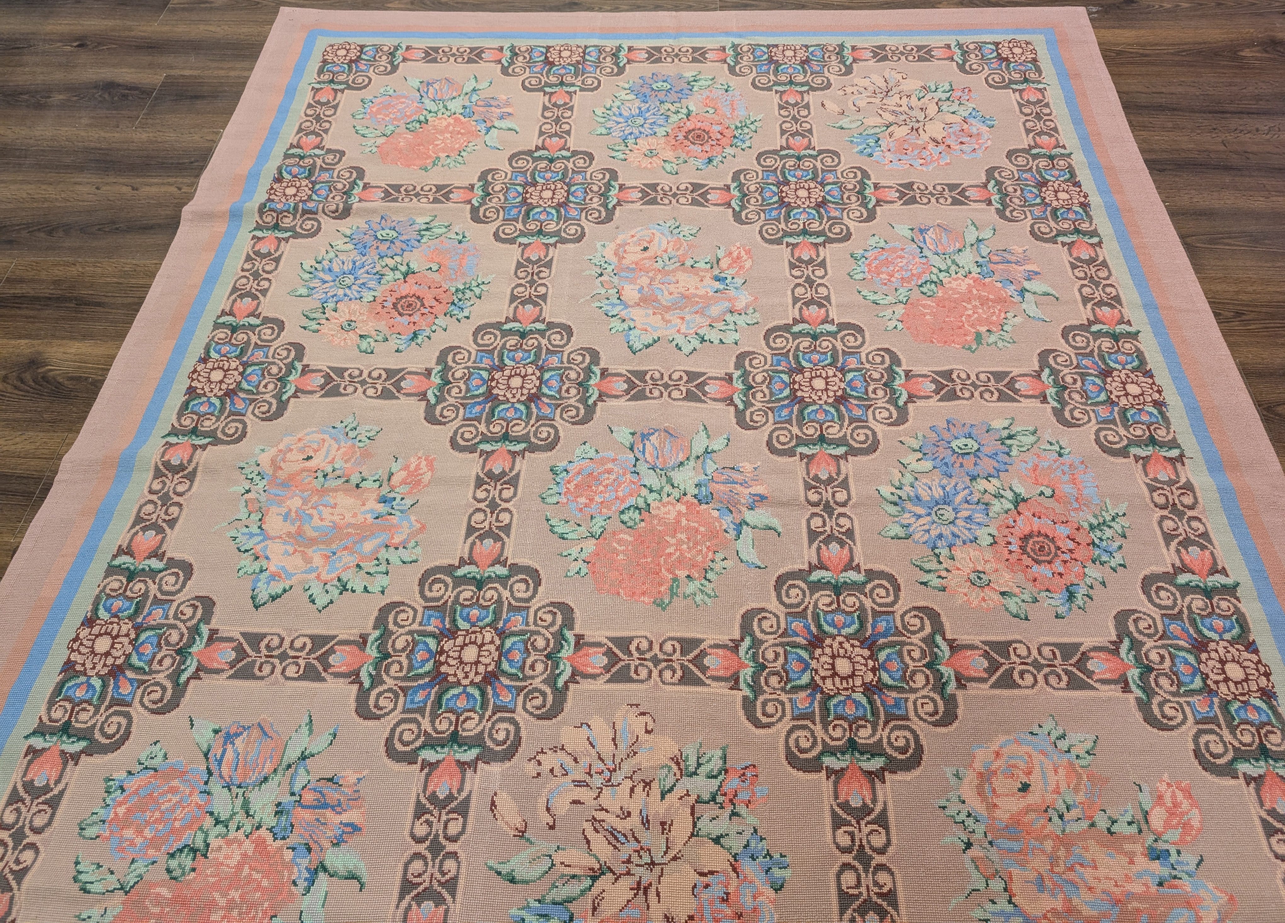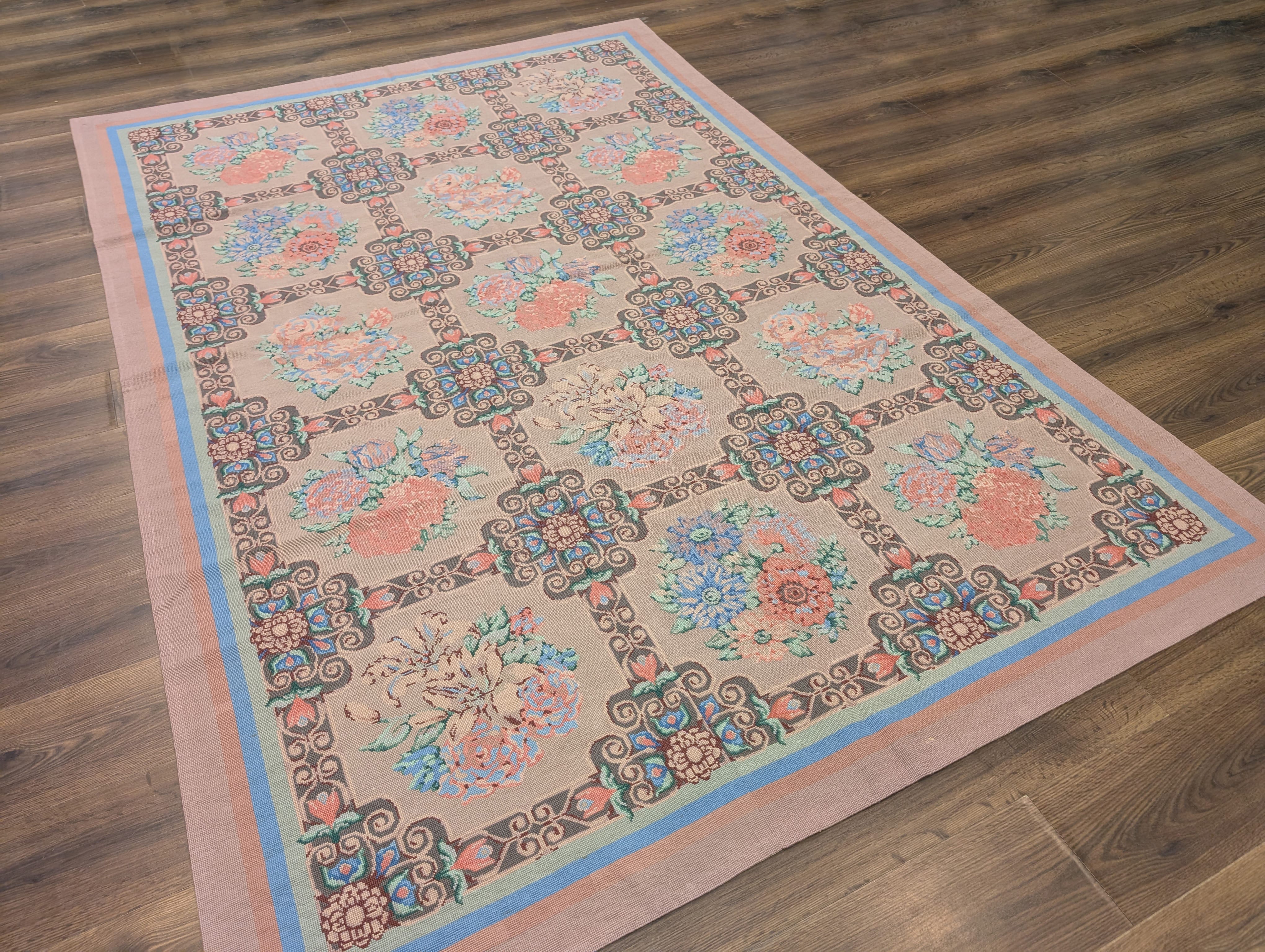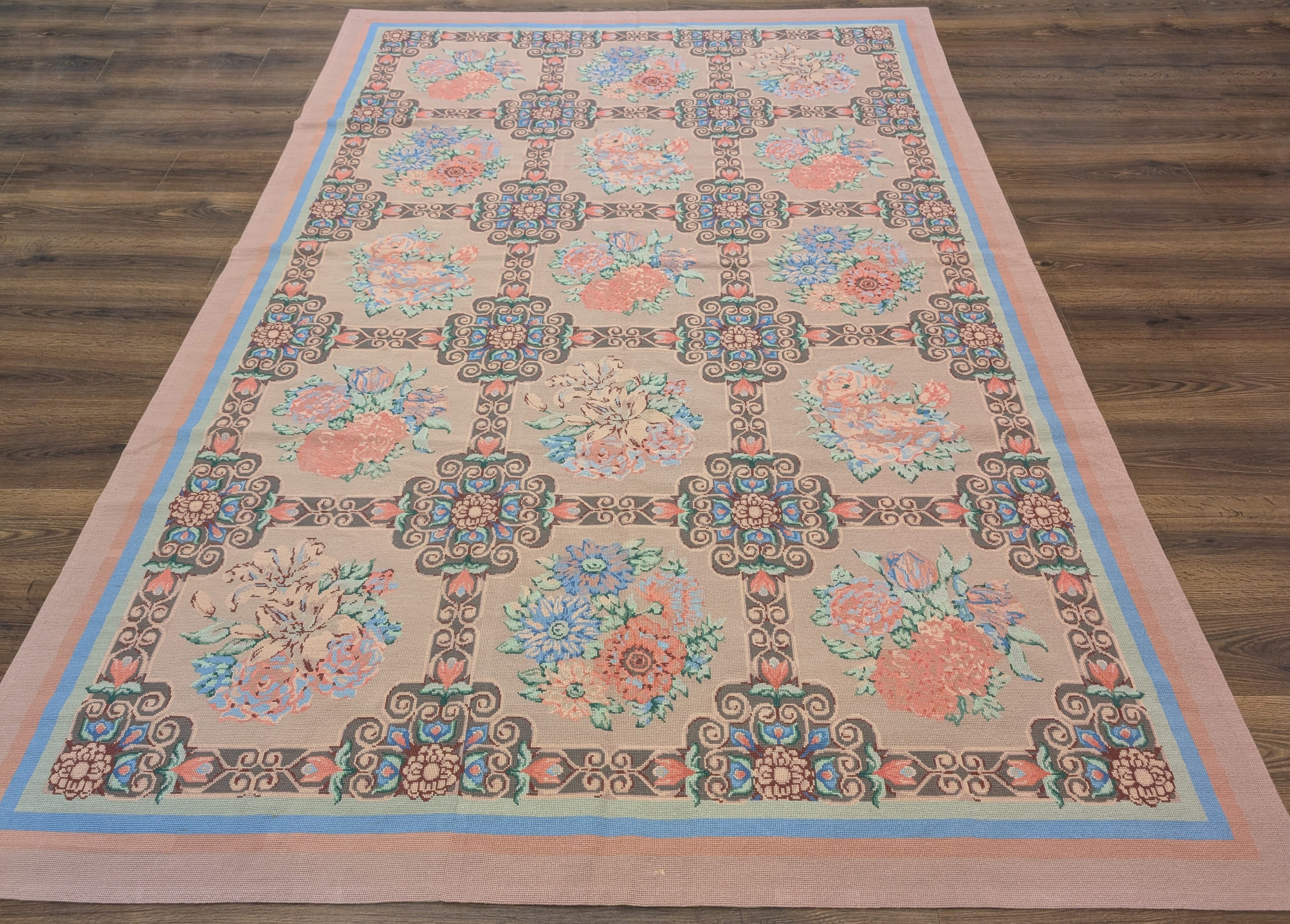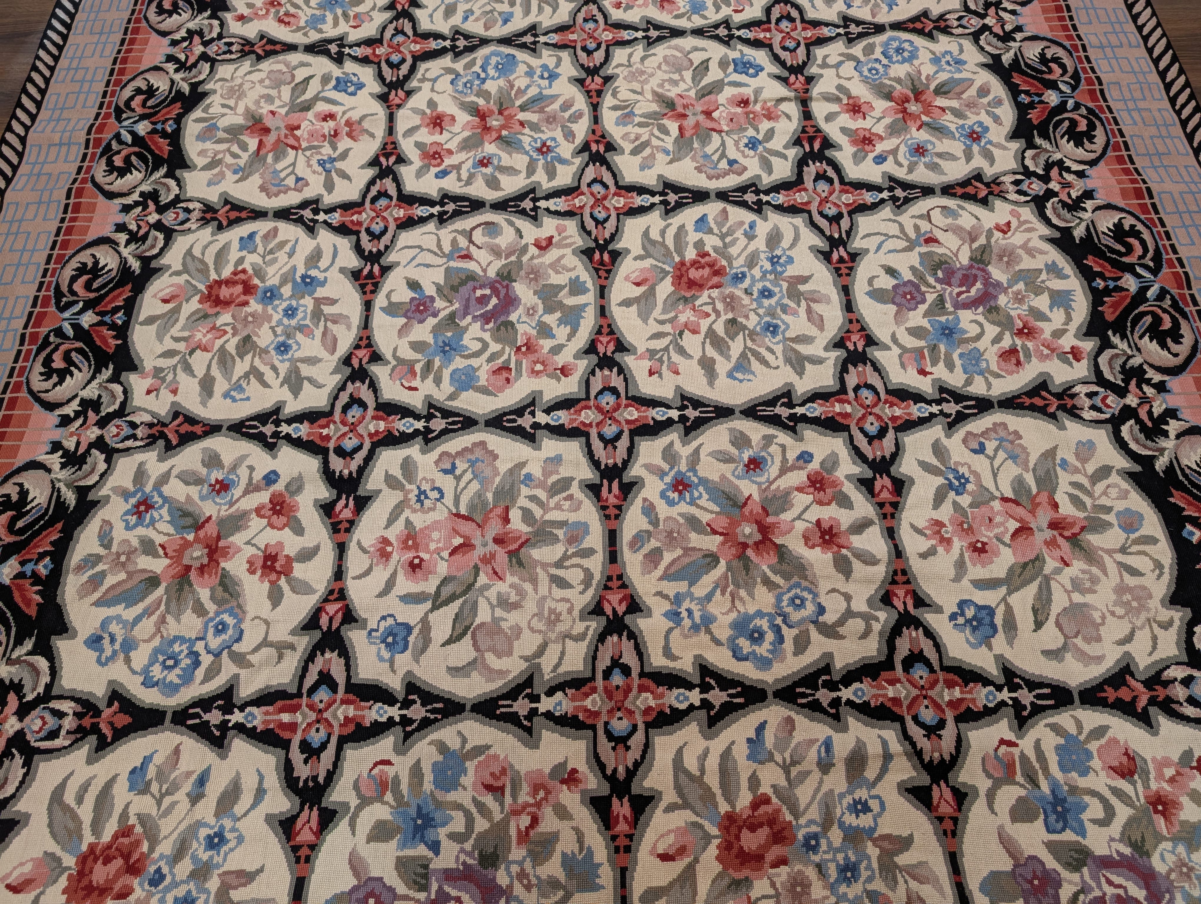 Needlepoint Rug 9x13, Flatweave, European Design, Repeated Floral Allover Design