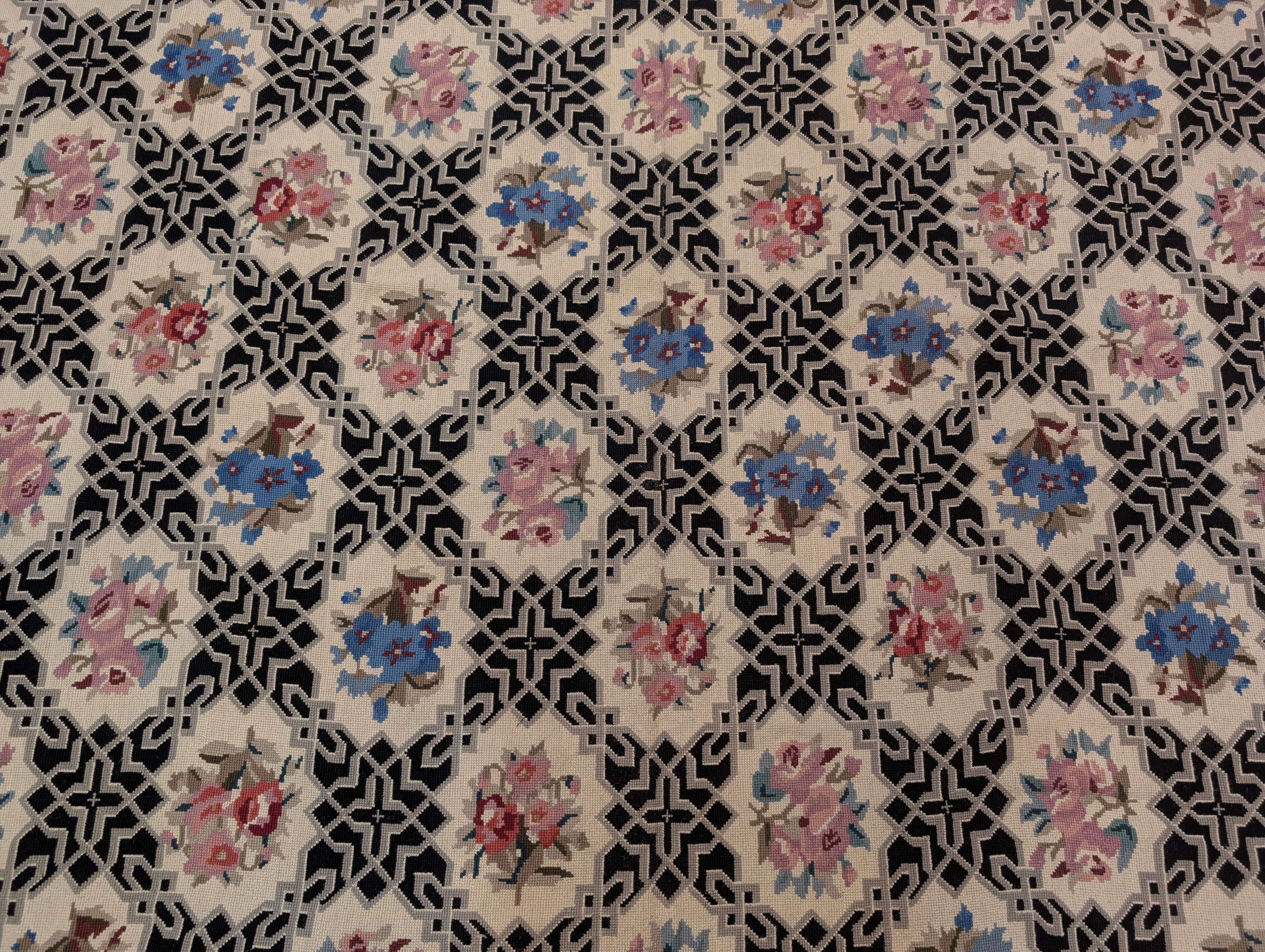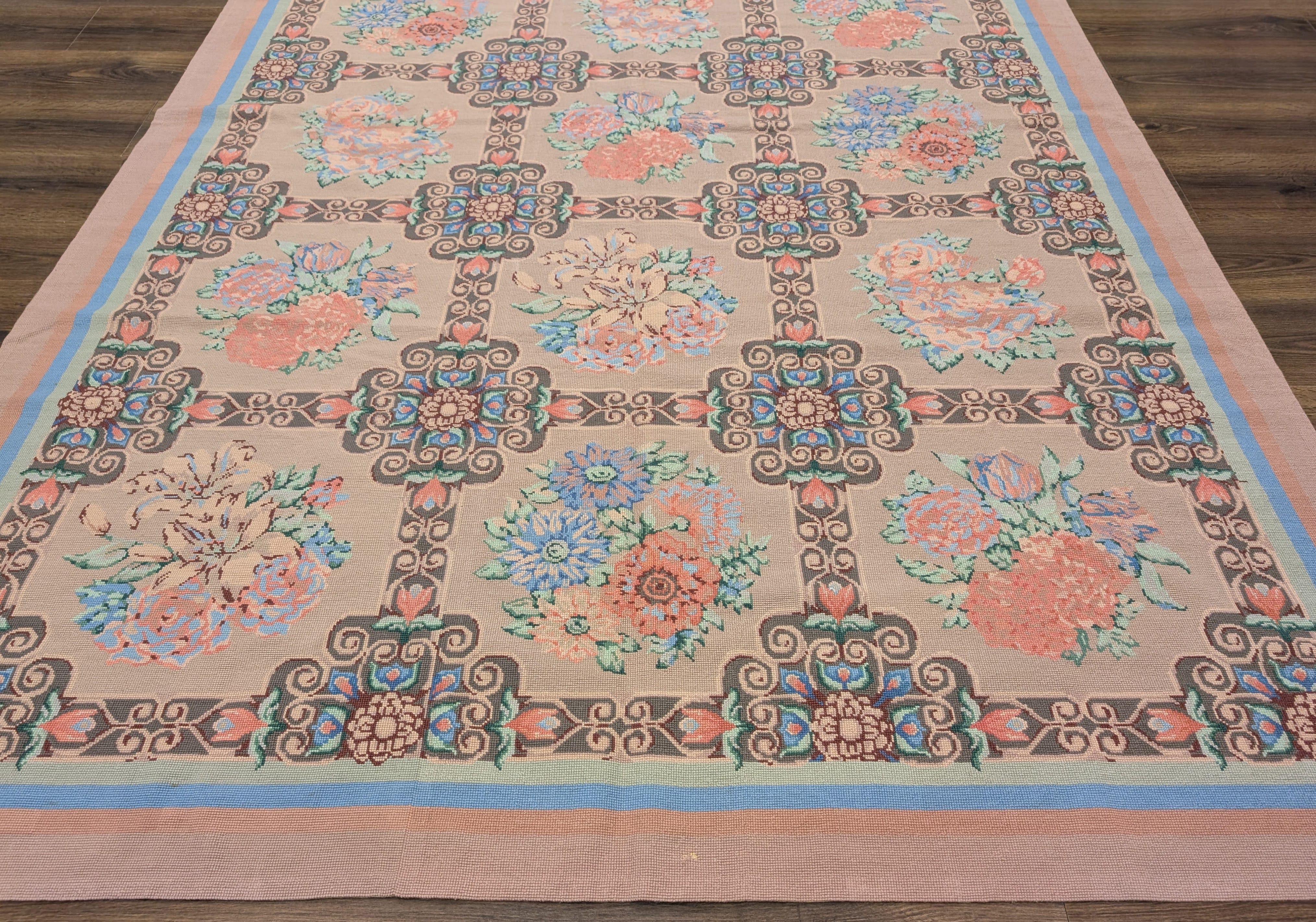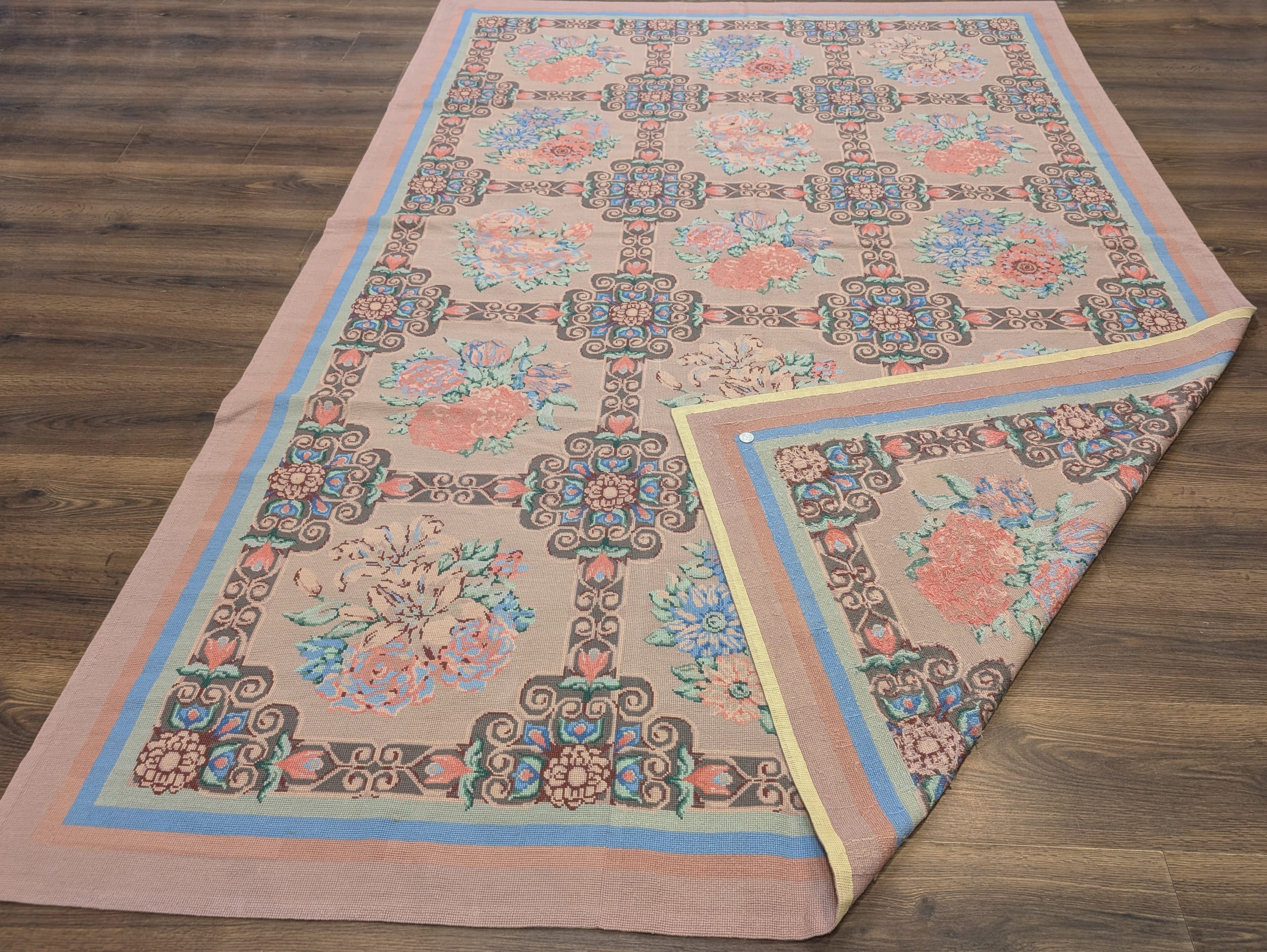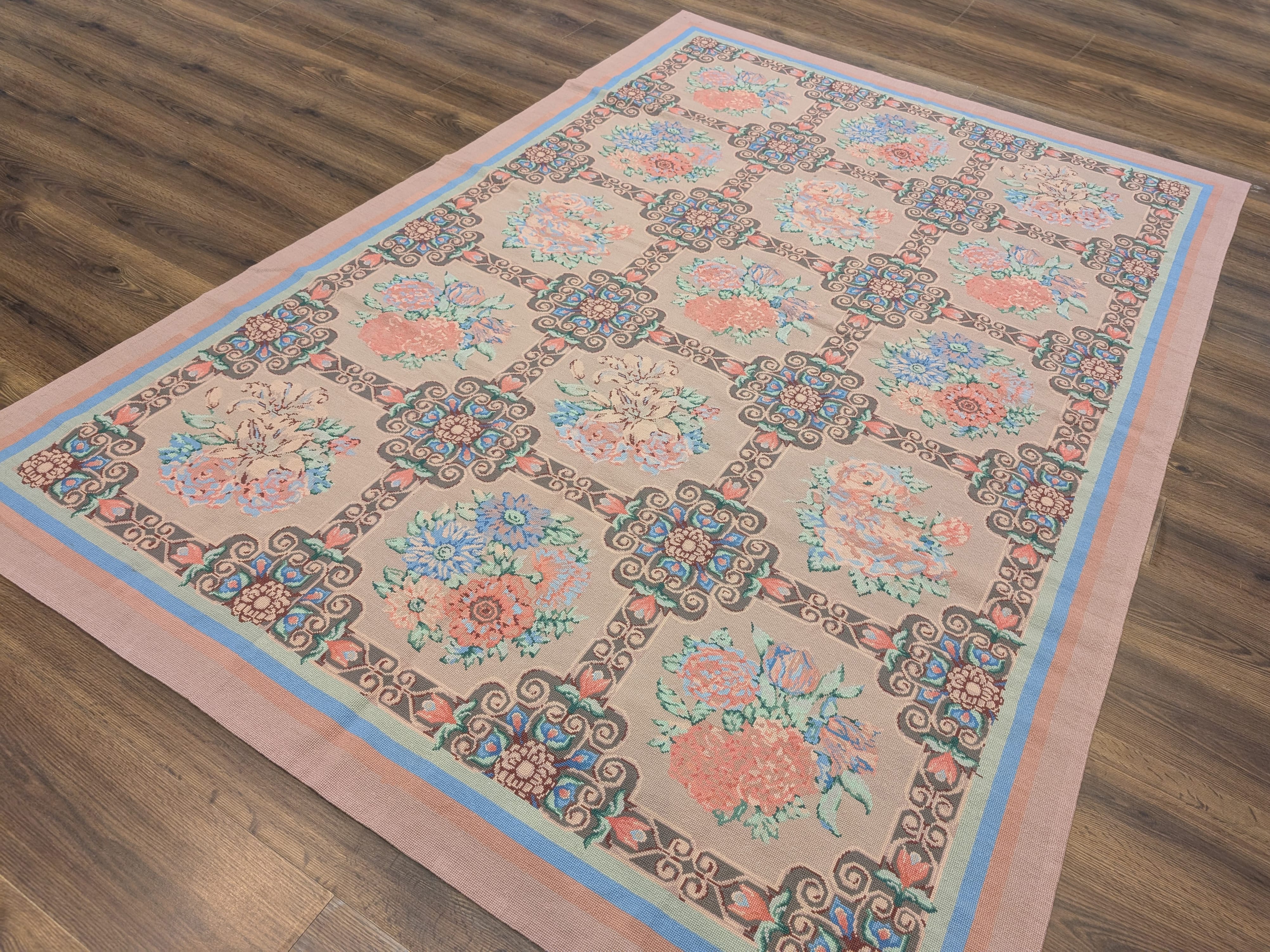 Needlepoint Rug 9x13, Flatweave, European Design, Repeated Floral Allover Design