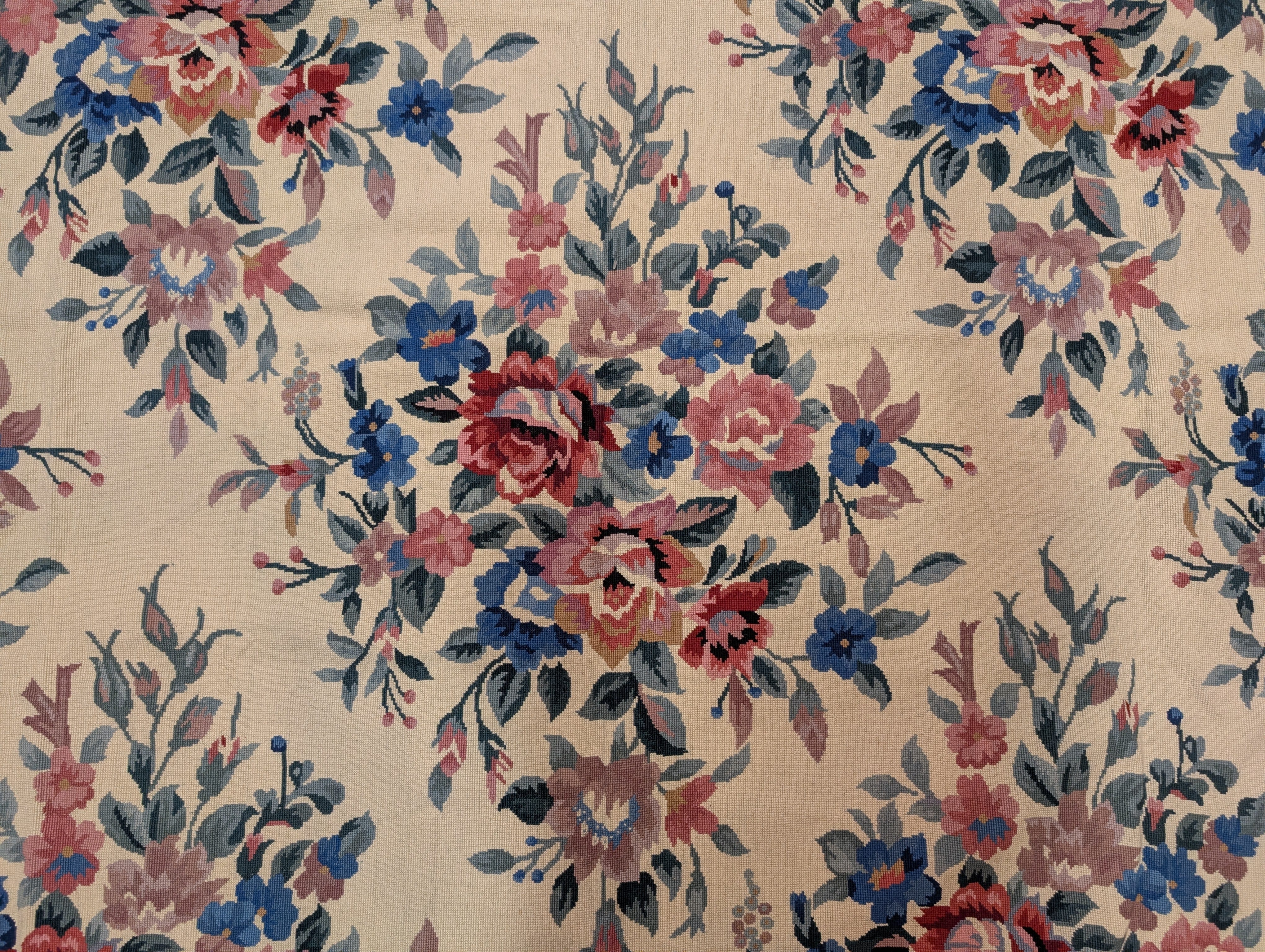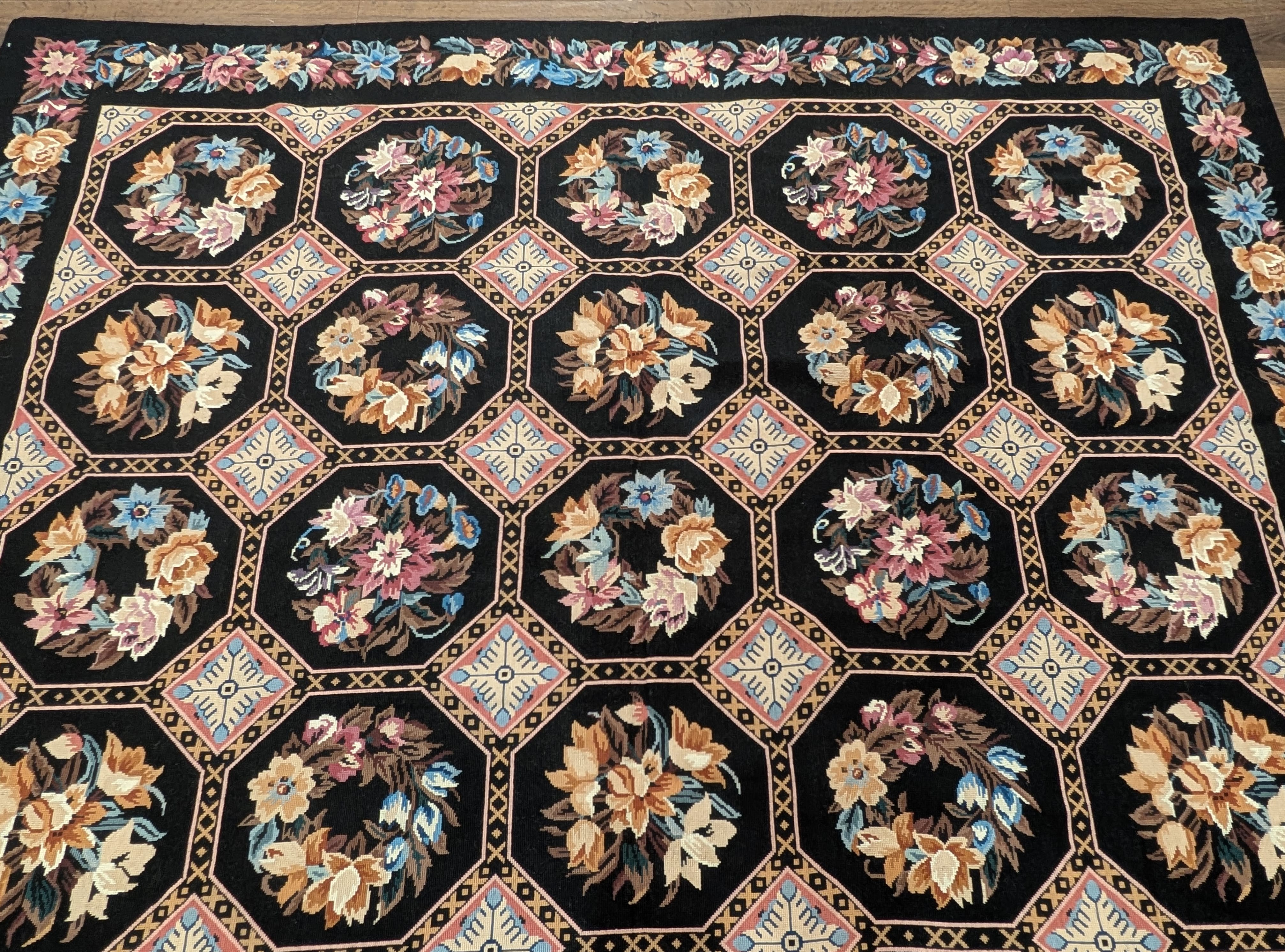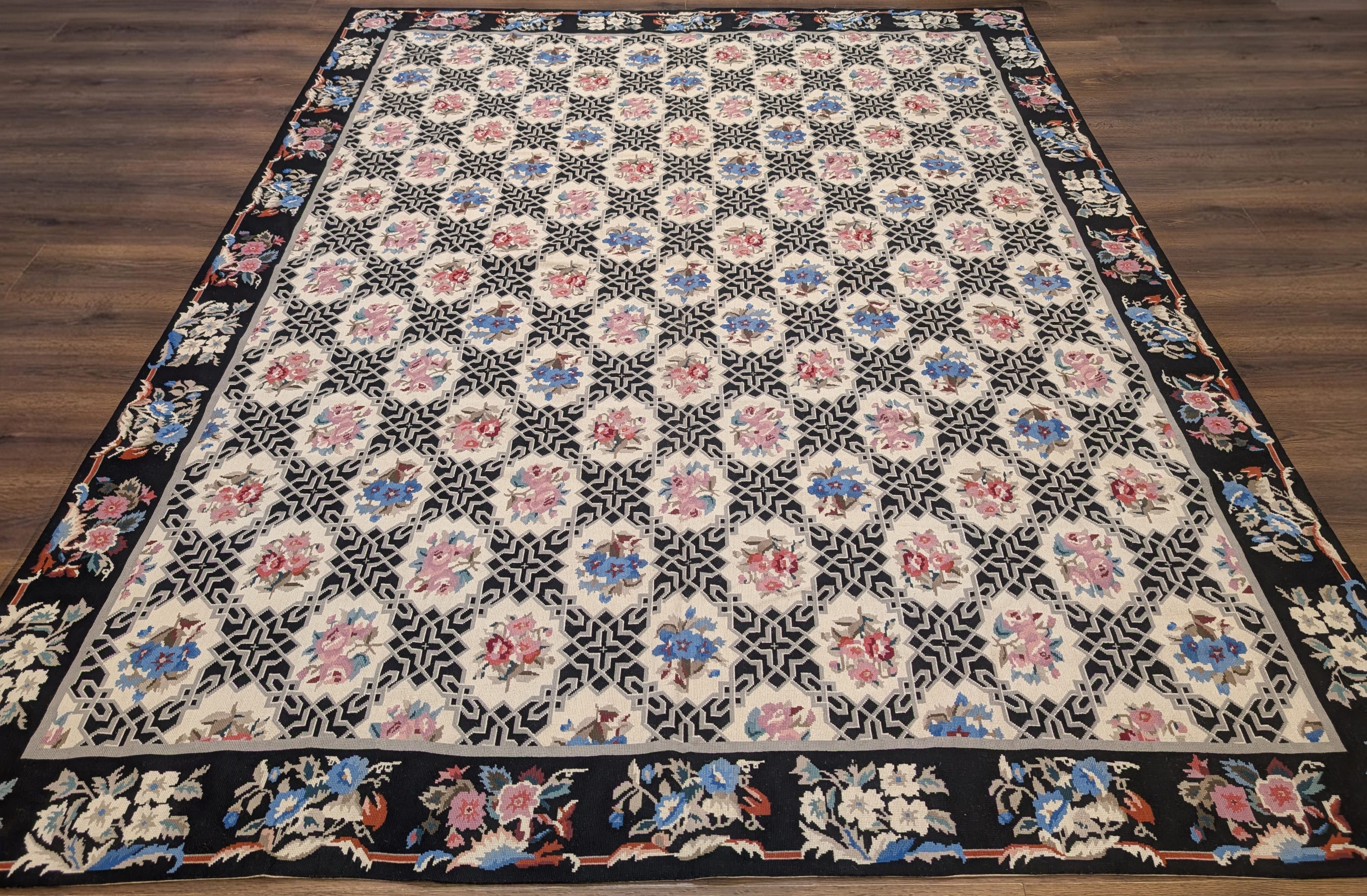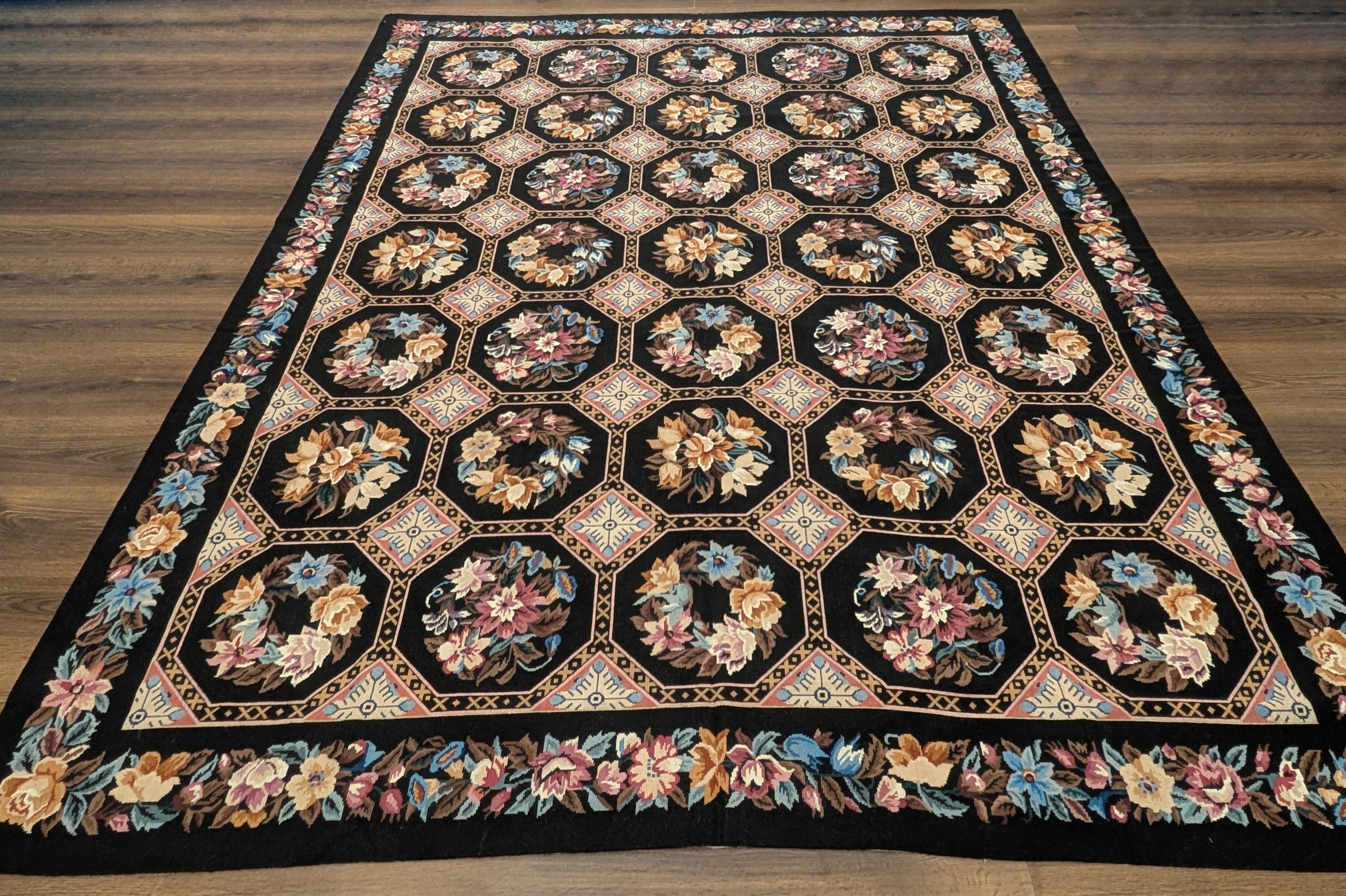 Needlepoint Rug 9x13, Flatweave, European Design, Repeated Floral Allover Design