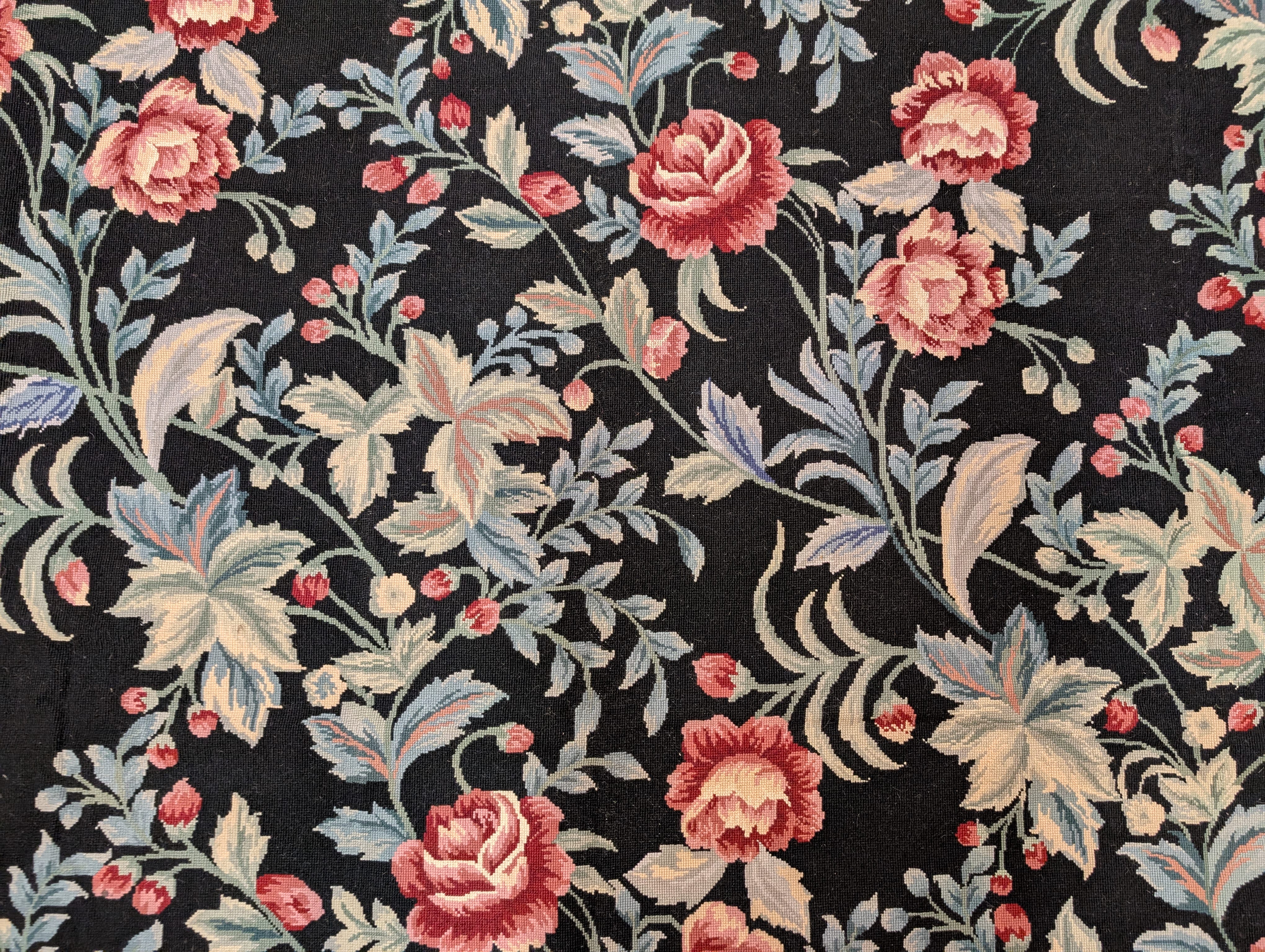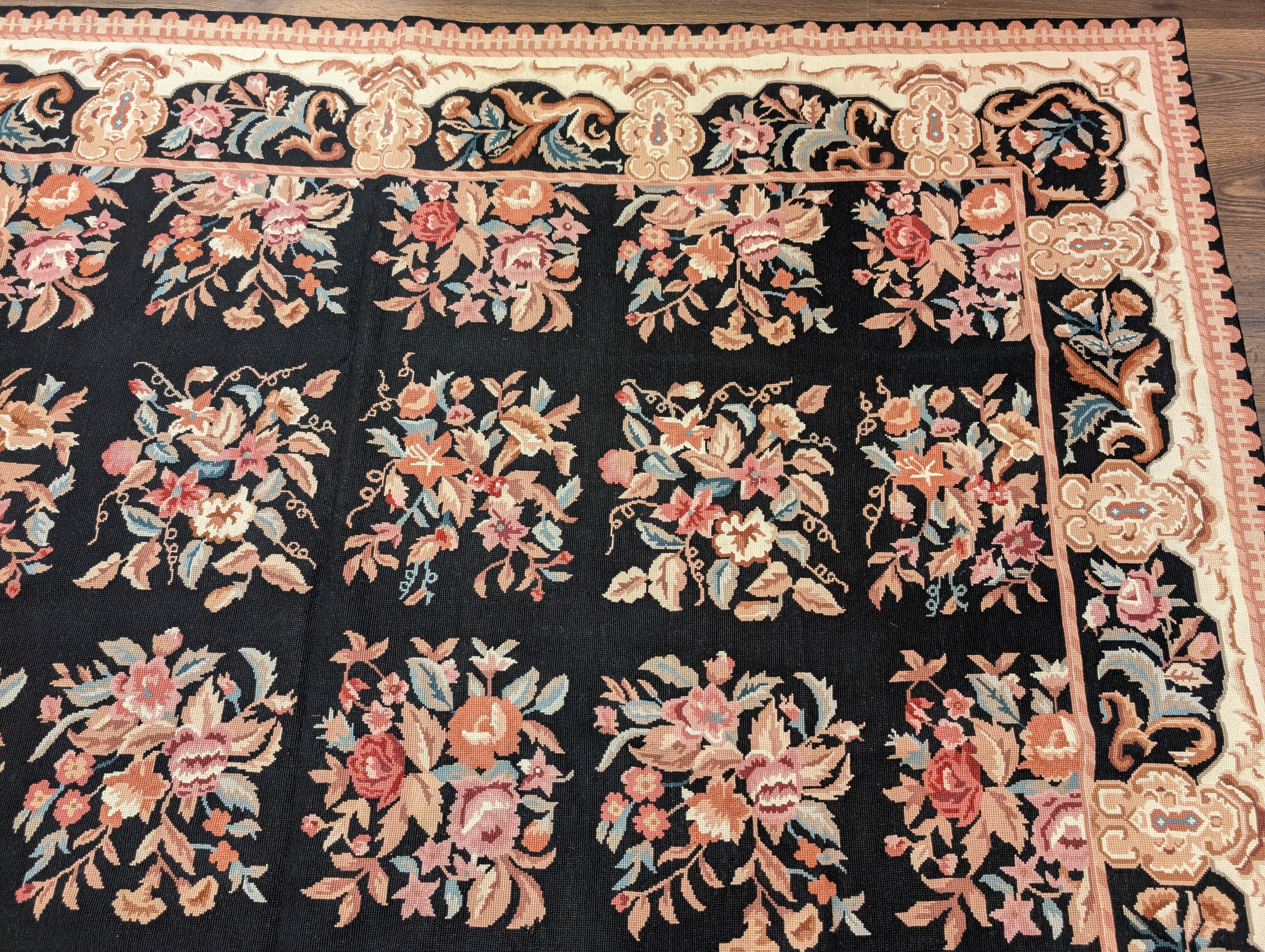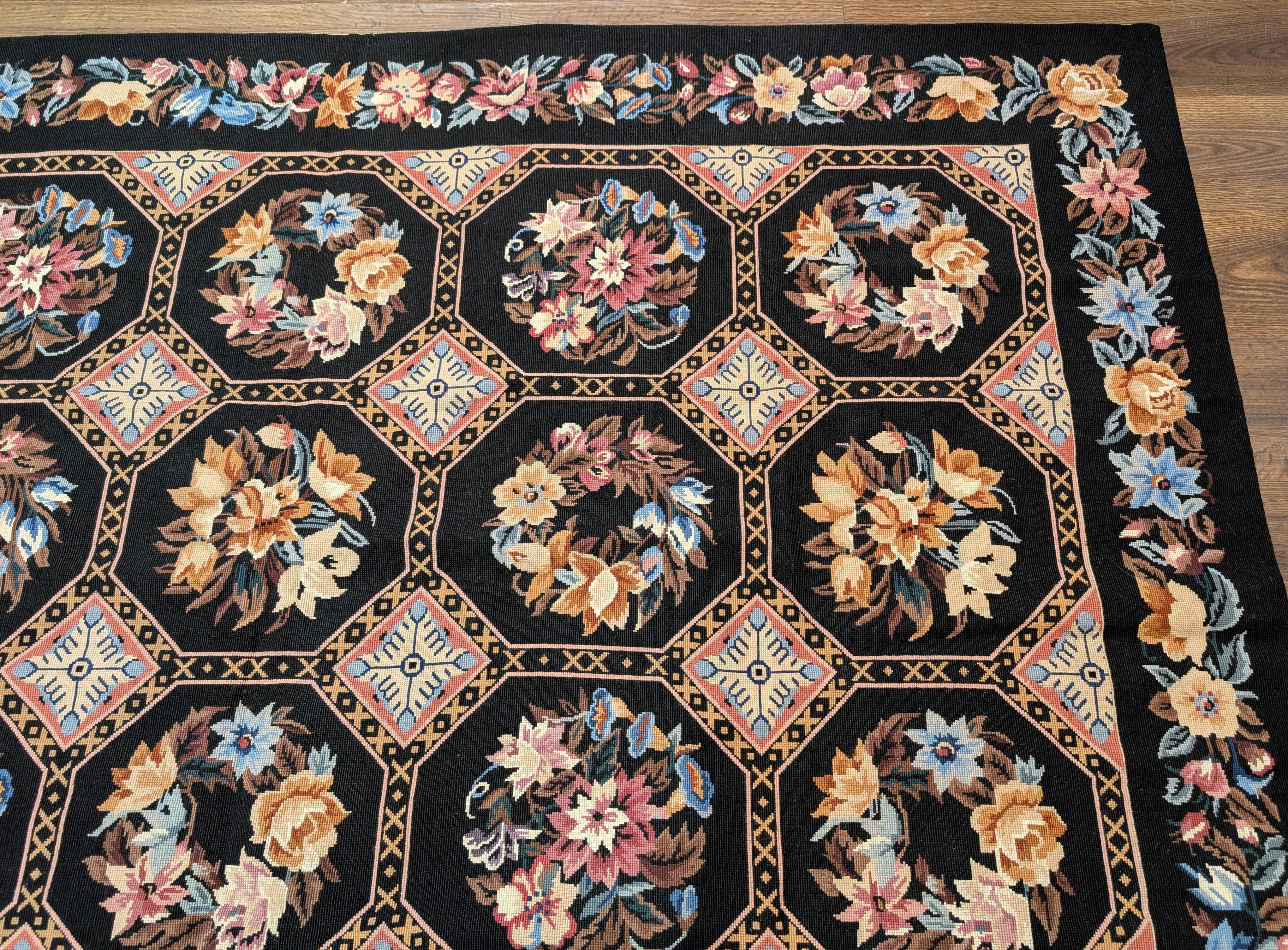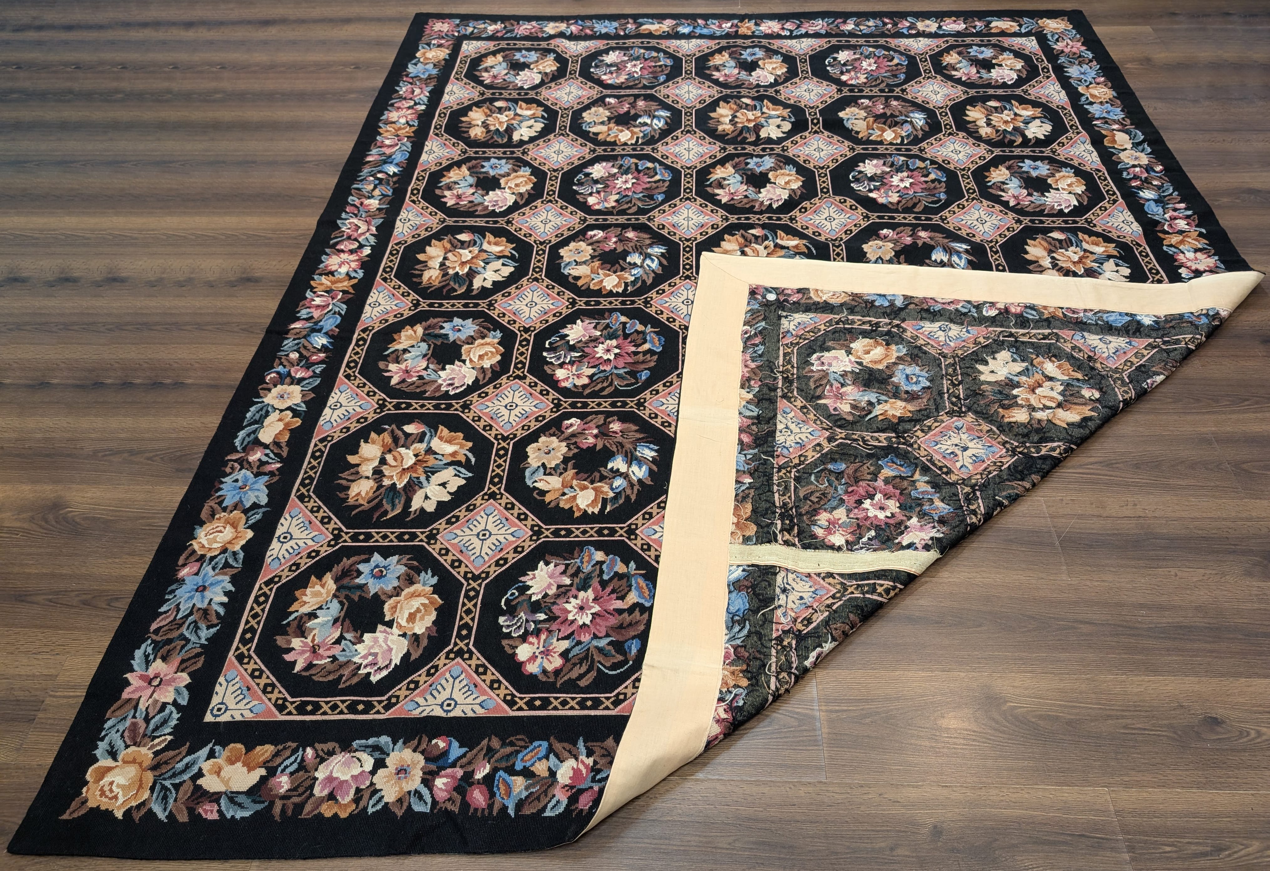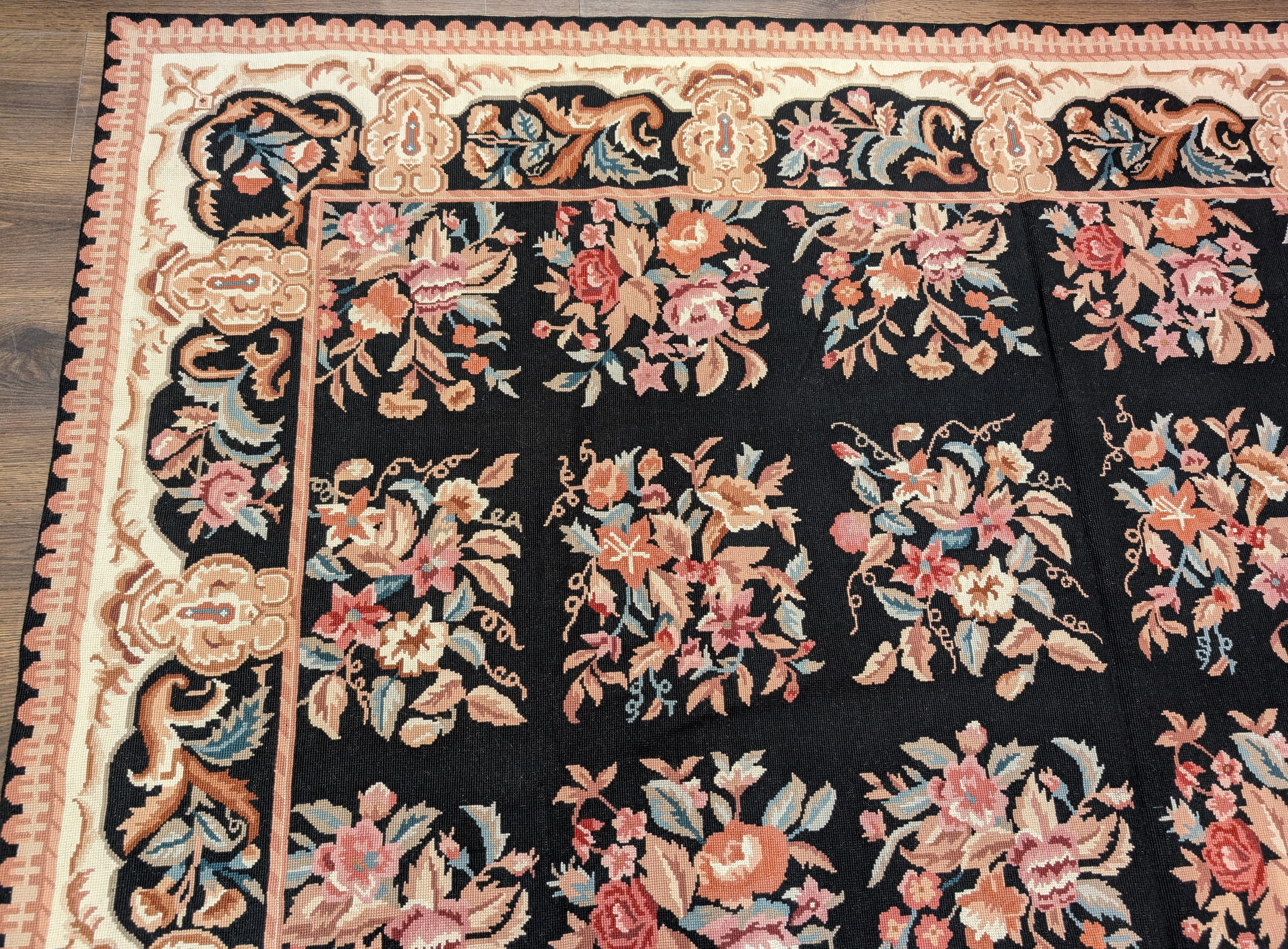 Black Needlepoint Rug 9x12, Floral, Handmade, Vintage