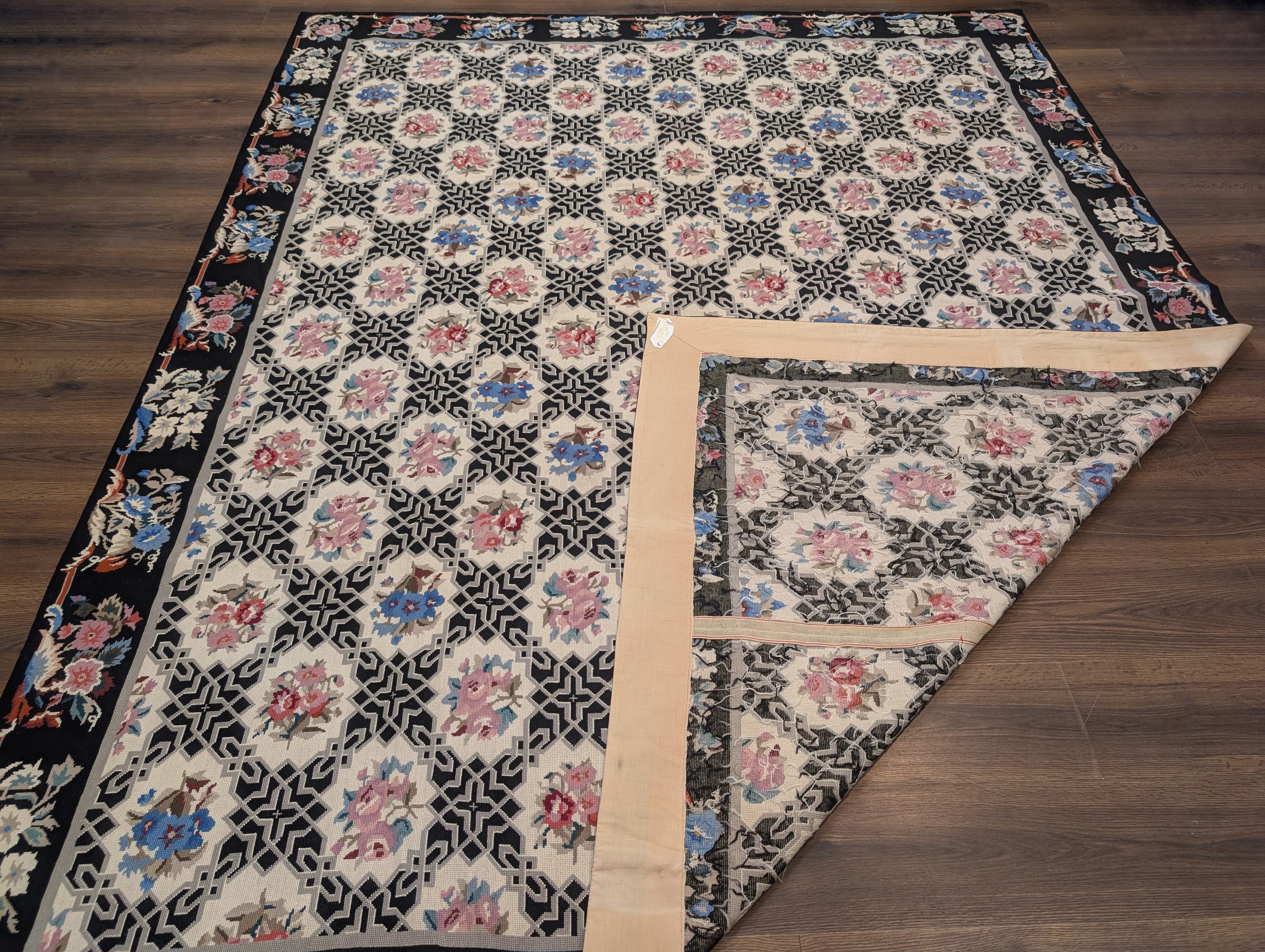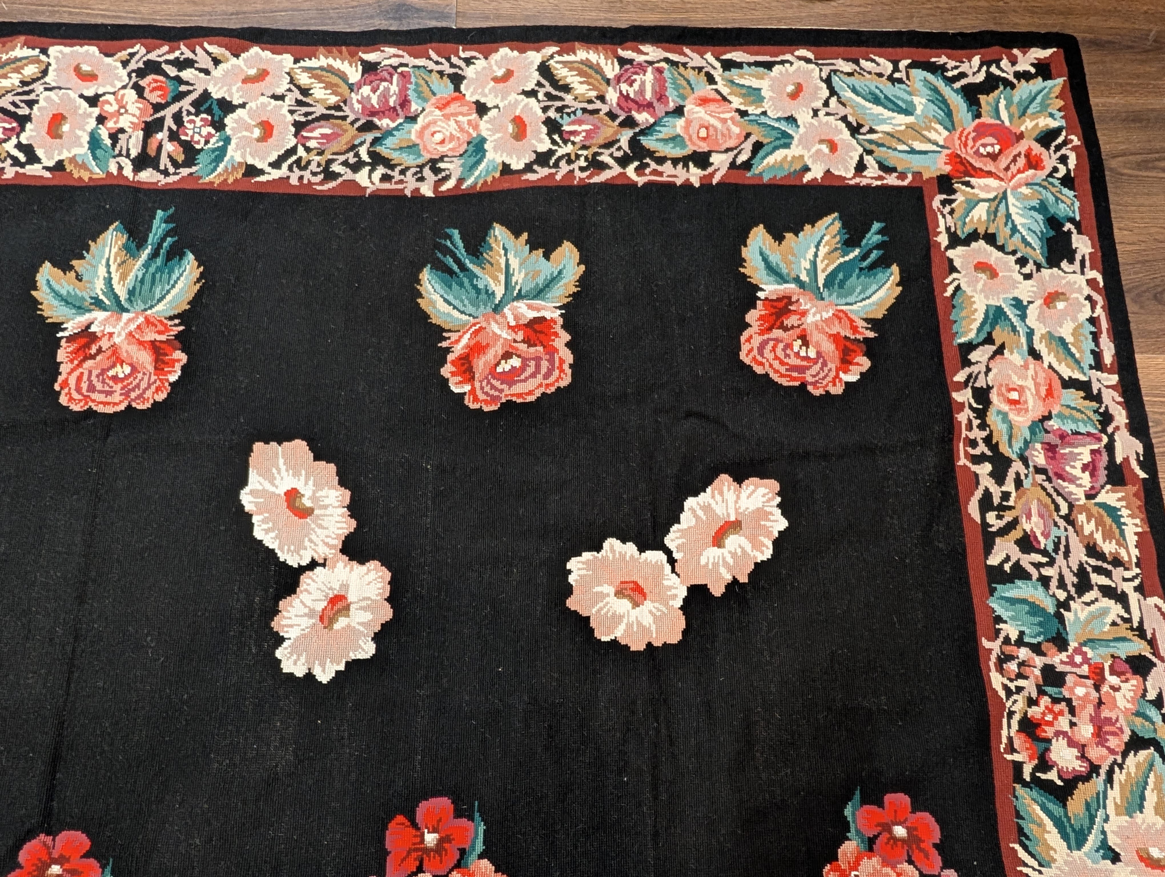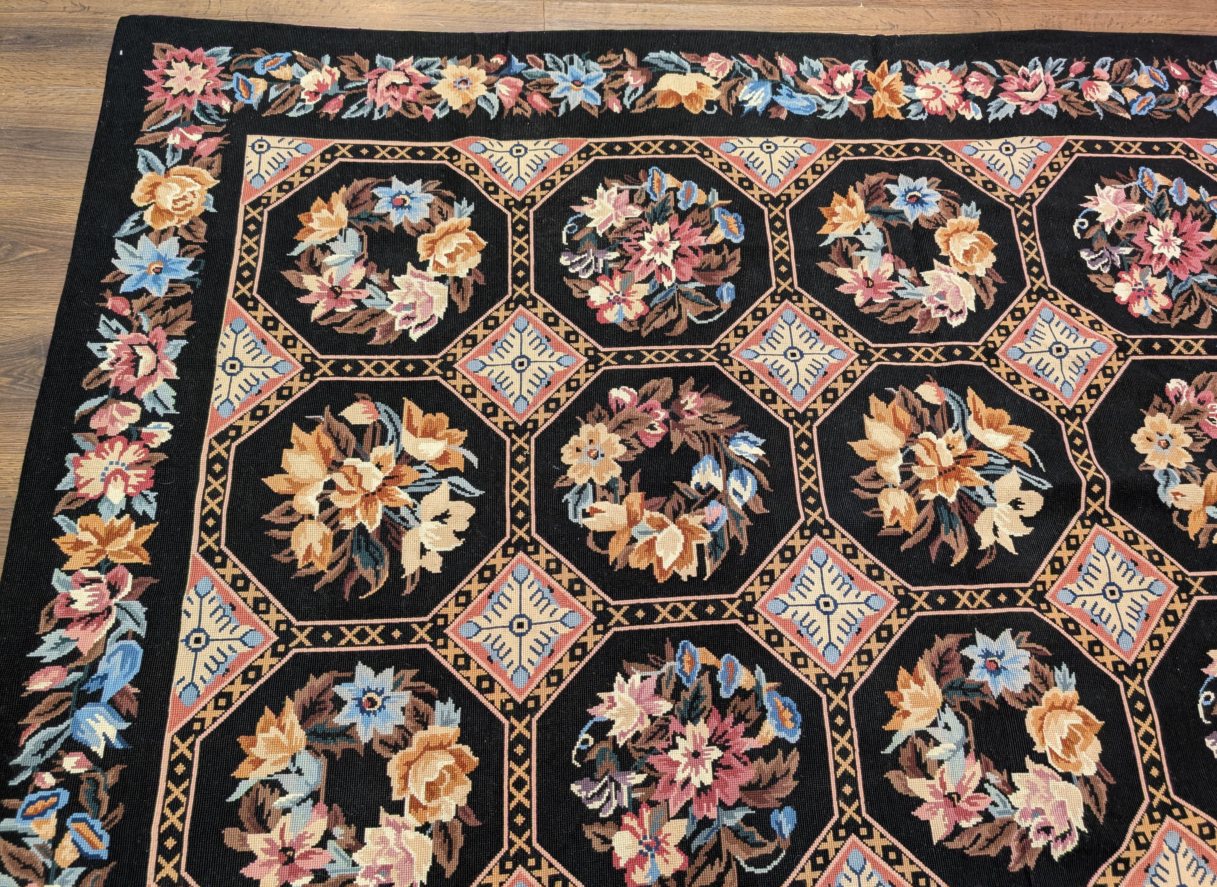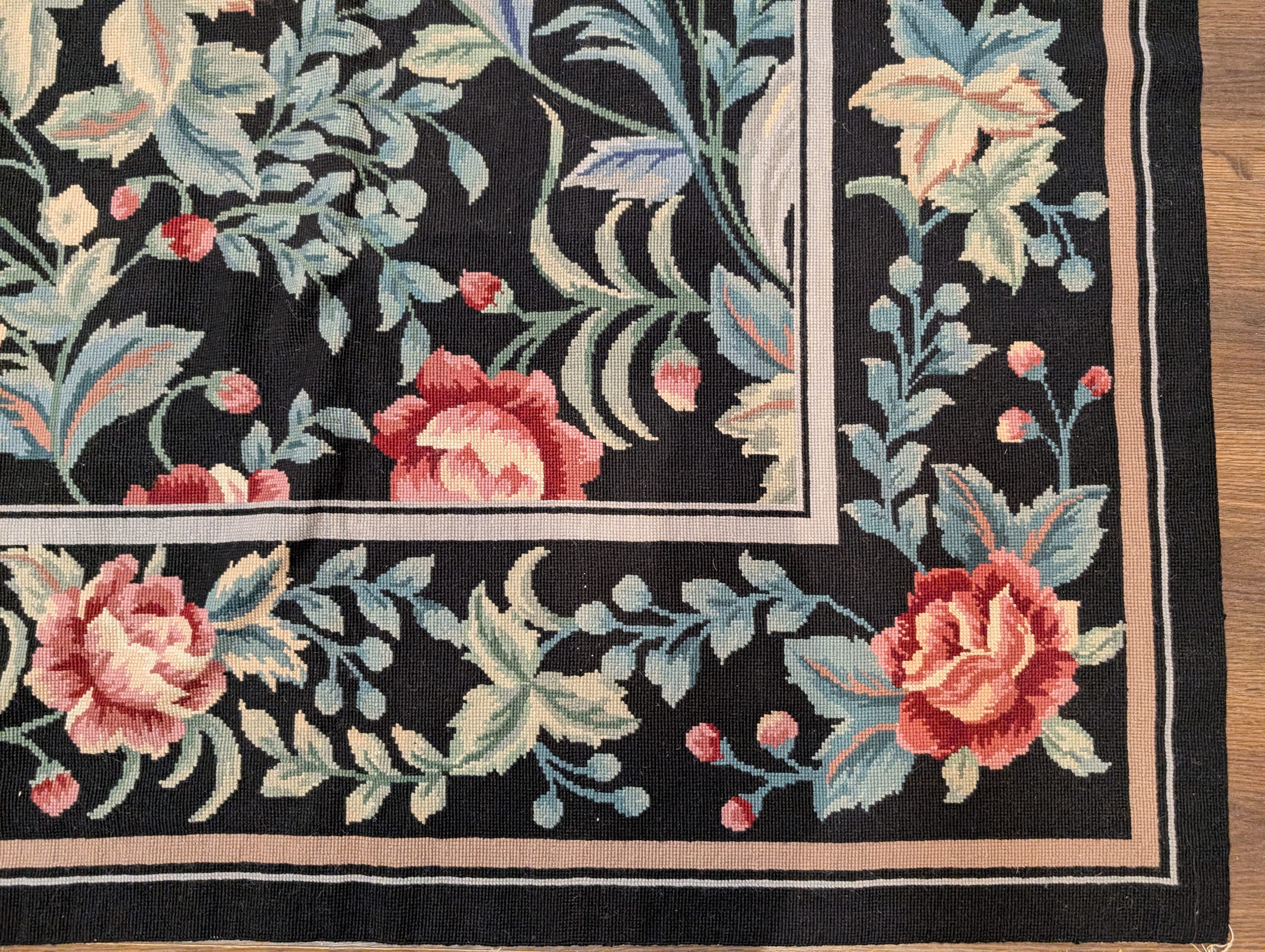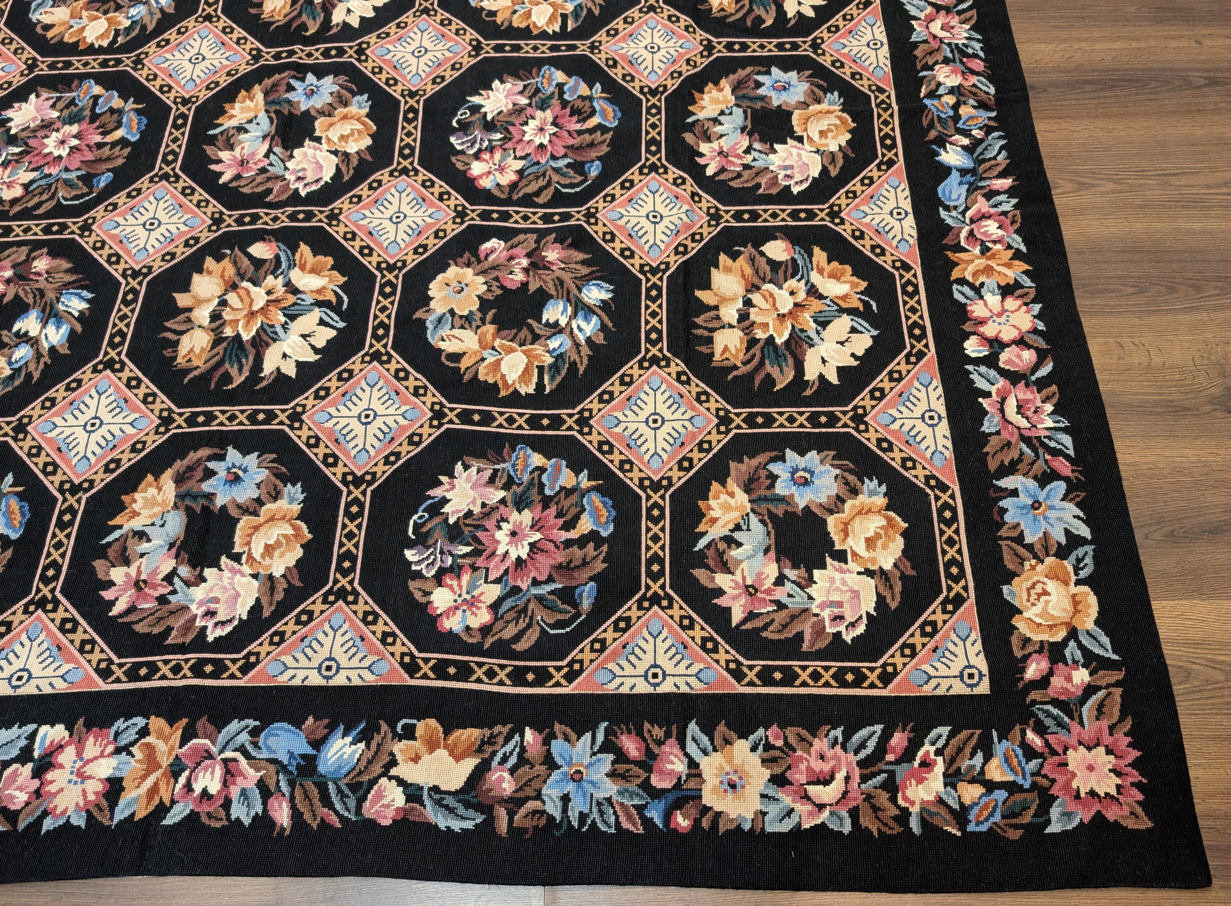 Black Needlepoint Rug 9x12, Floral, Handmade, Vintage