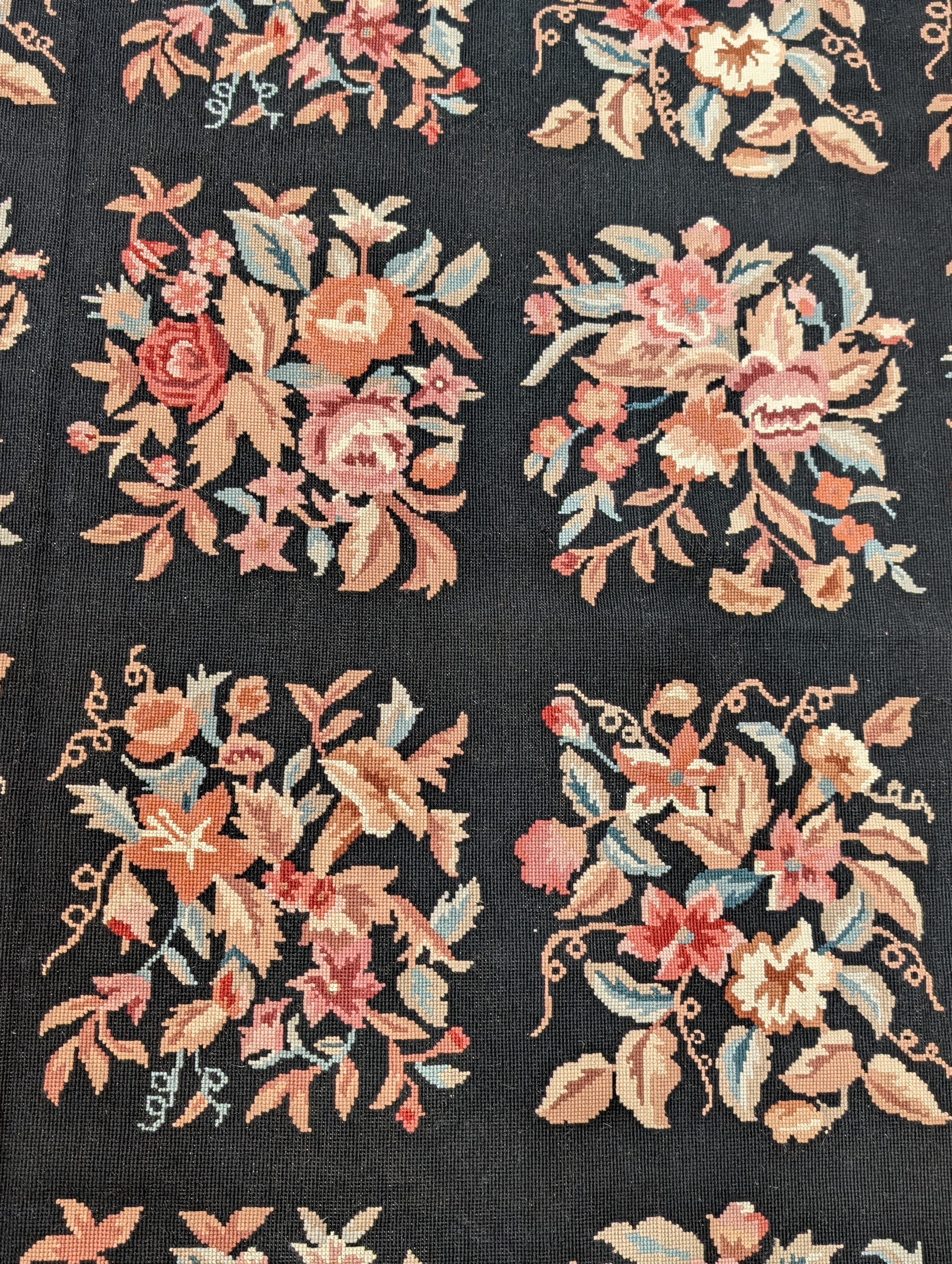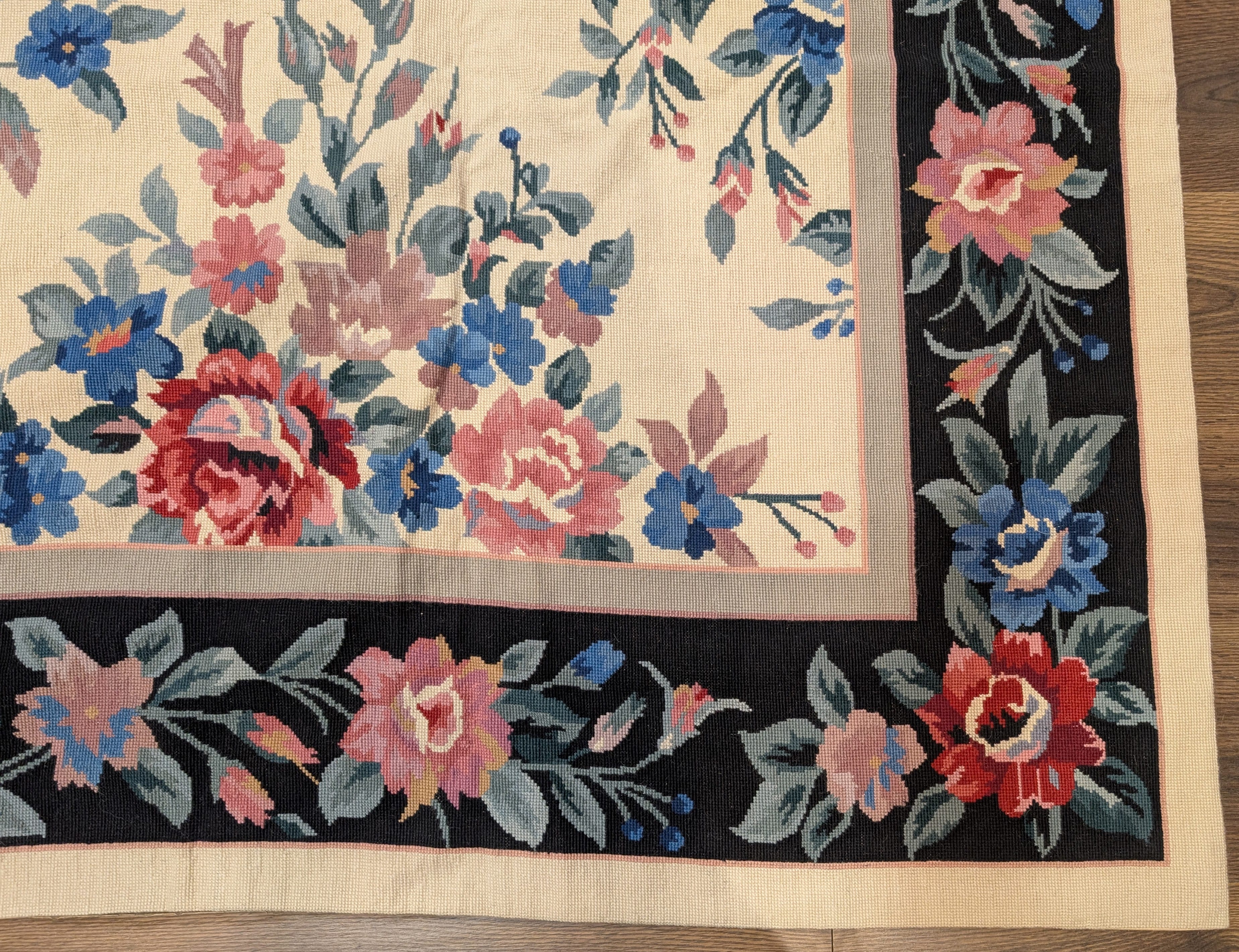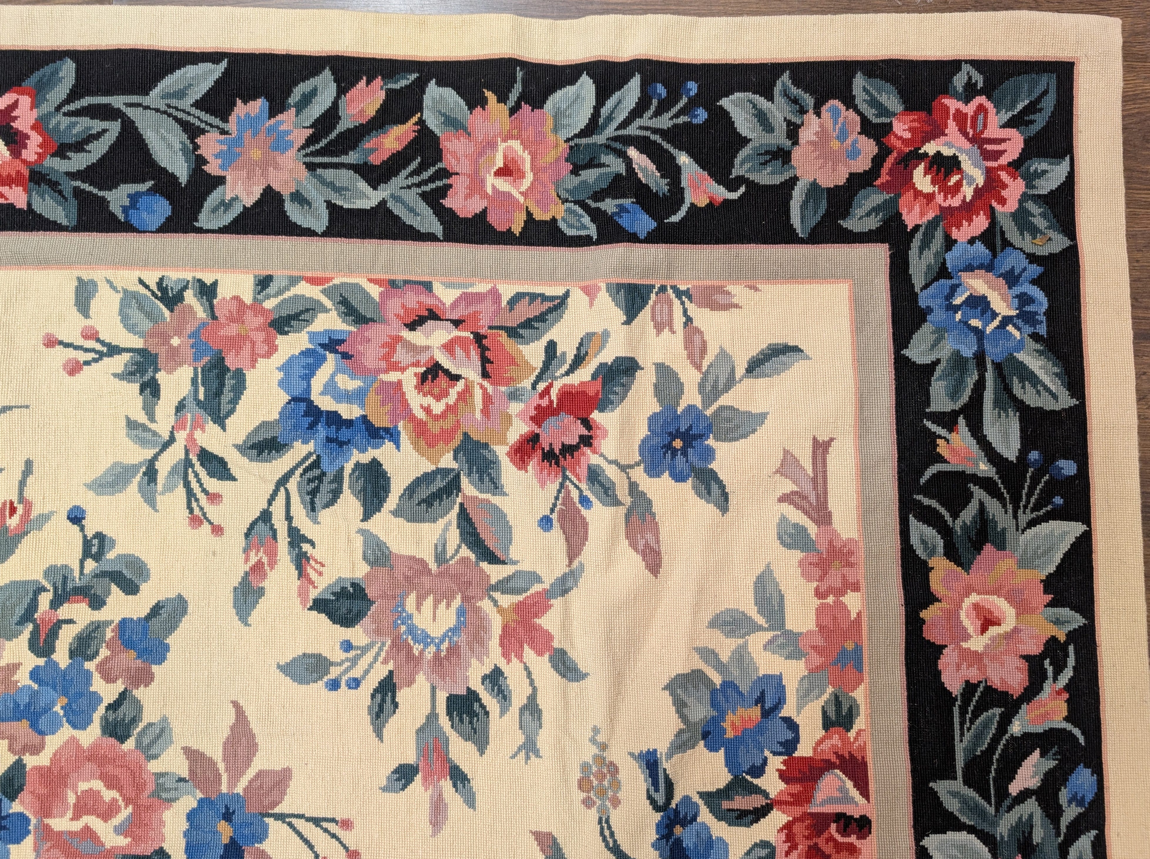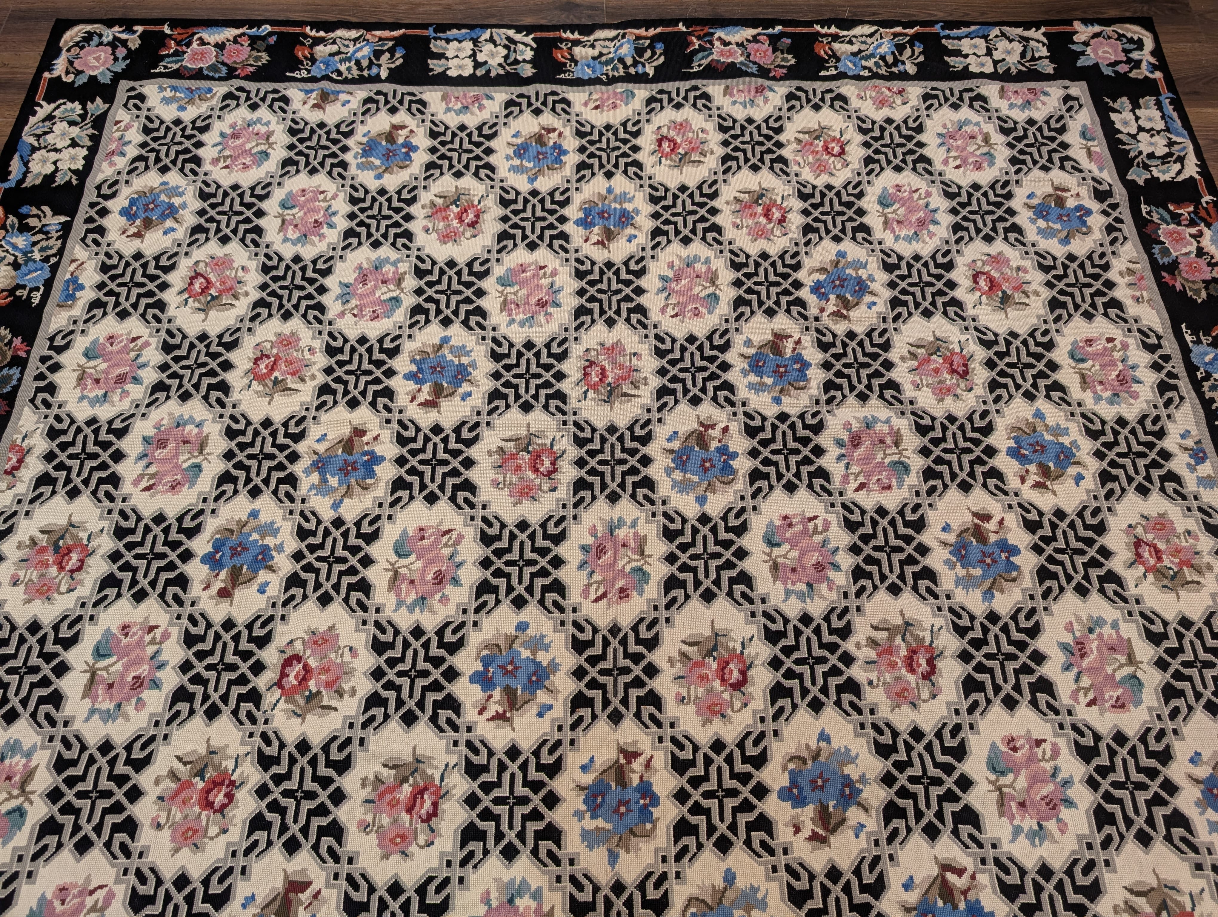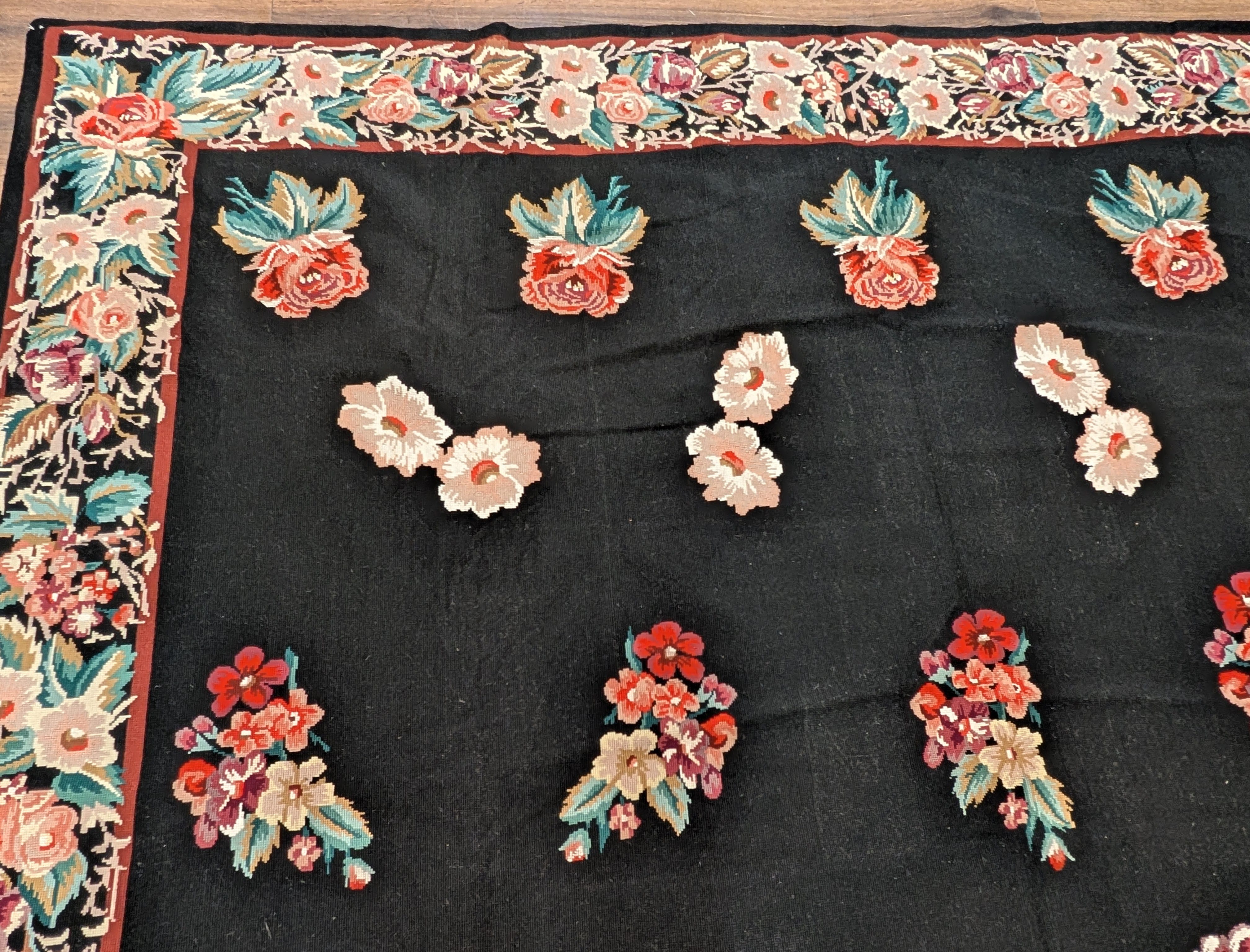 Black Needlepoint Rug 9x12, Floral, Handmade, Vintage