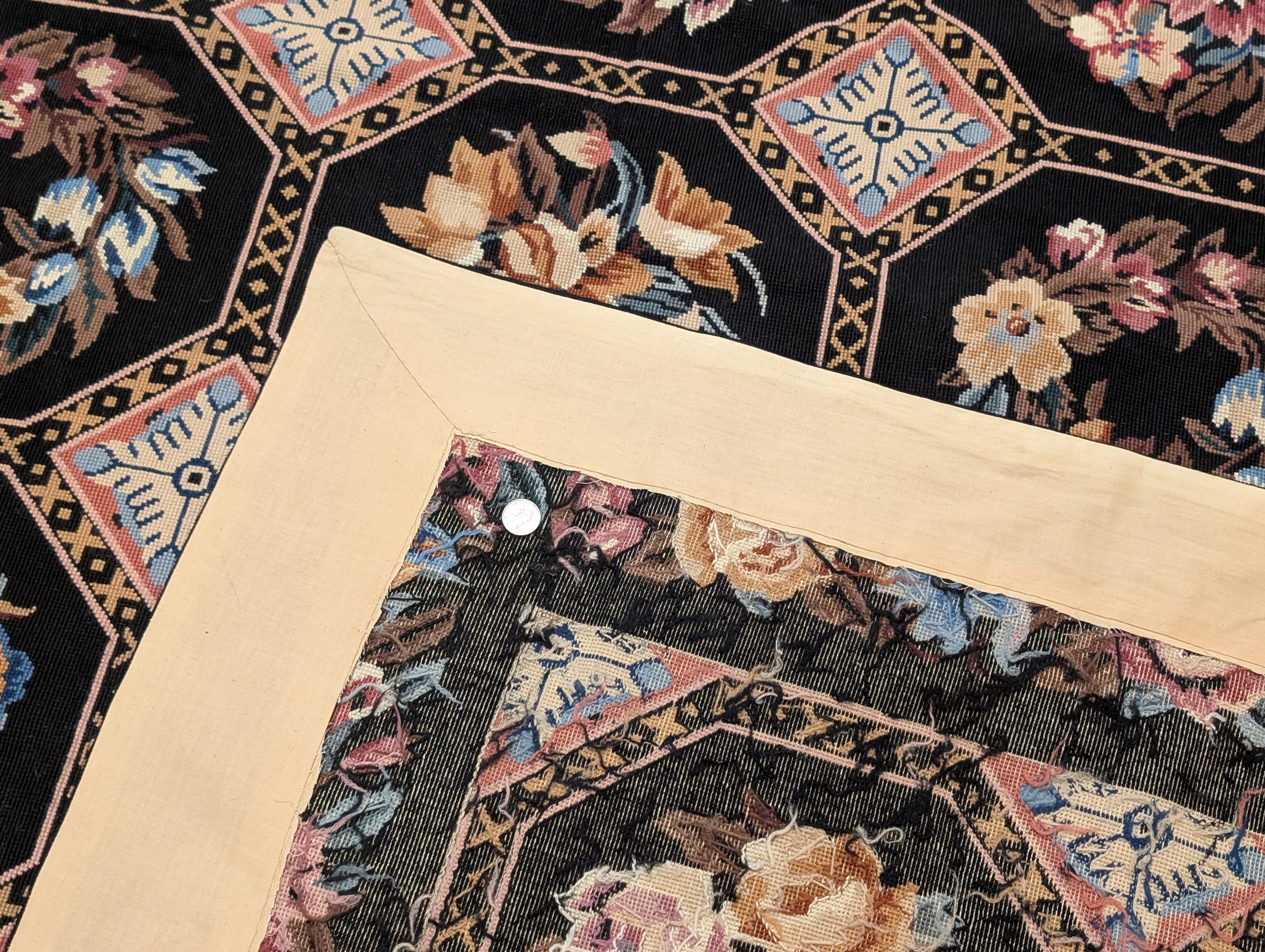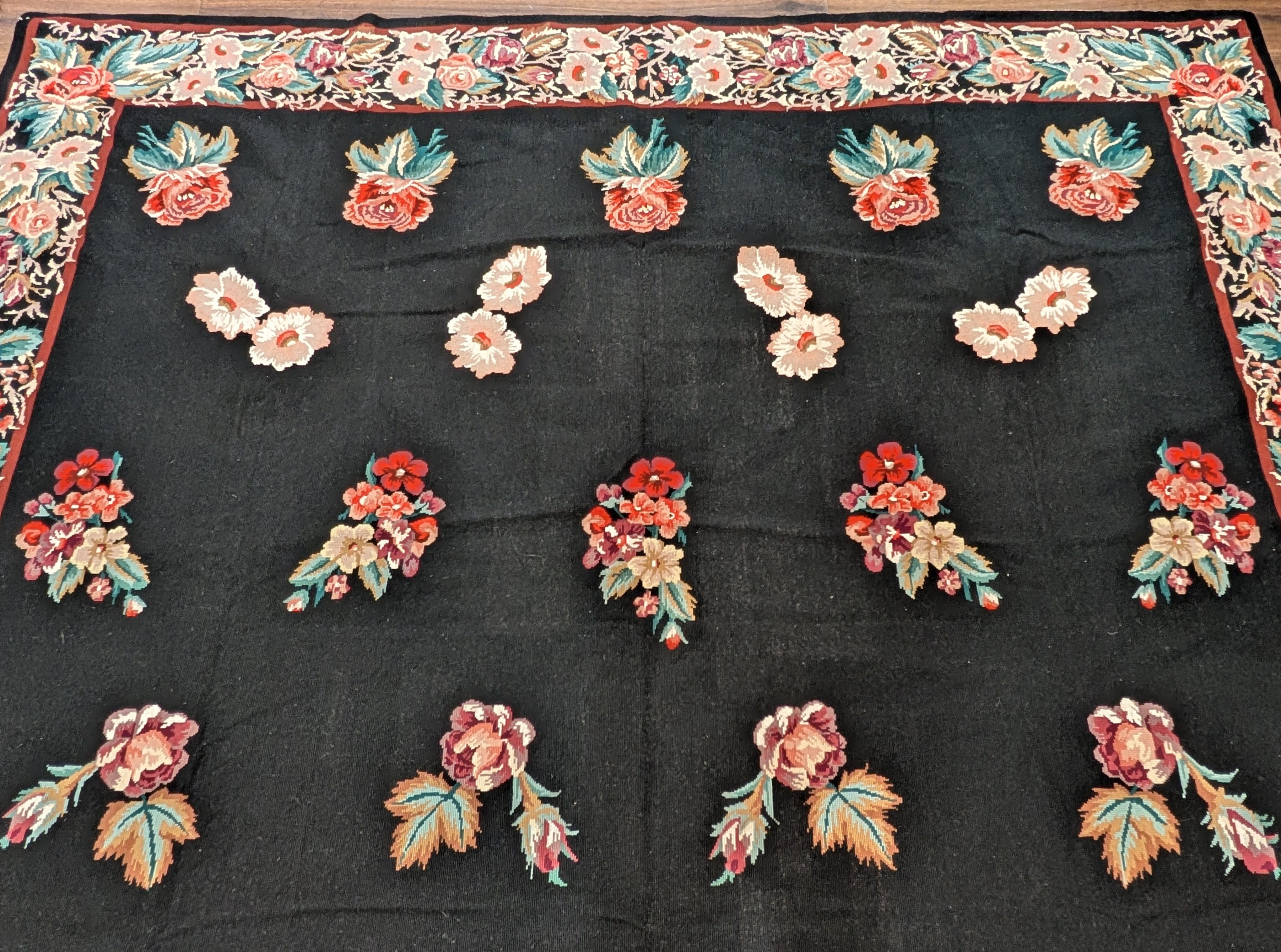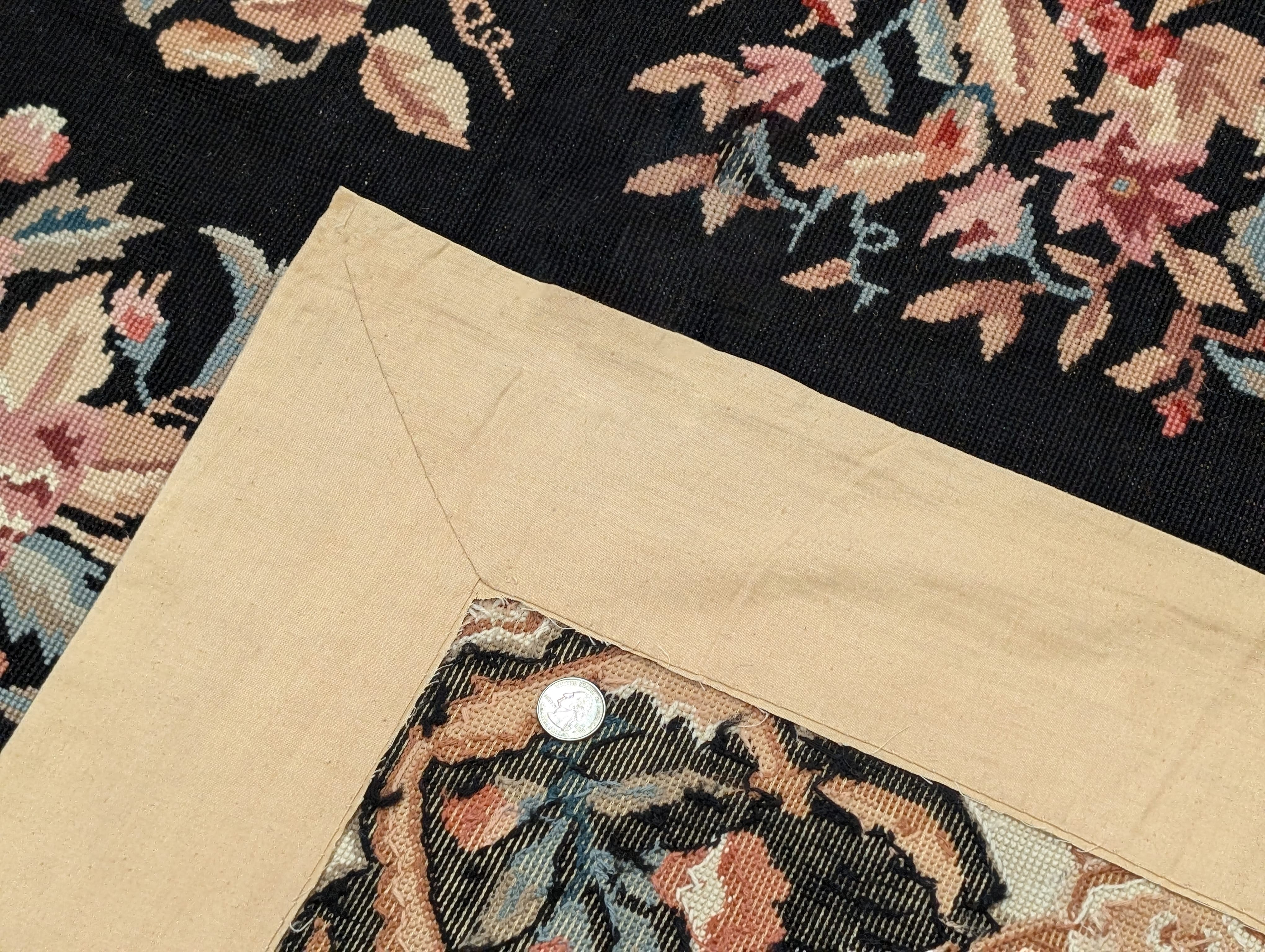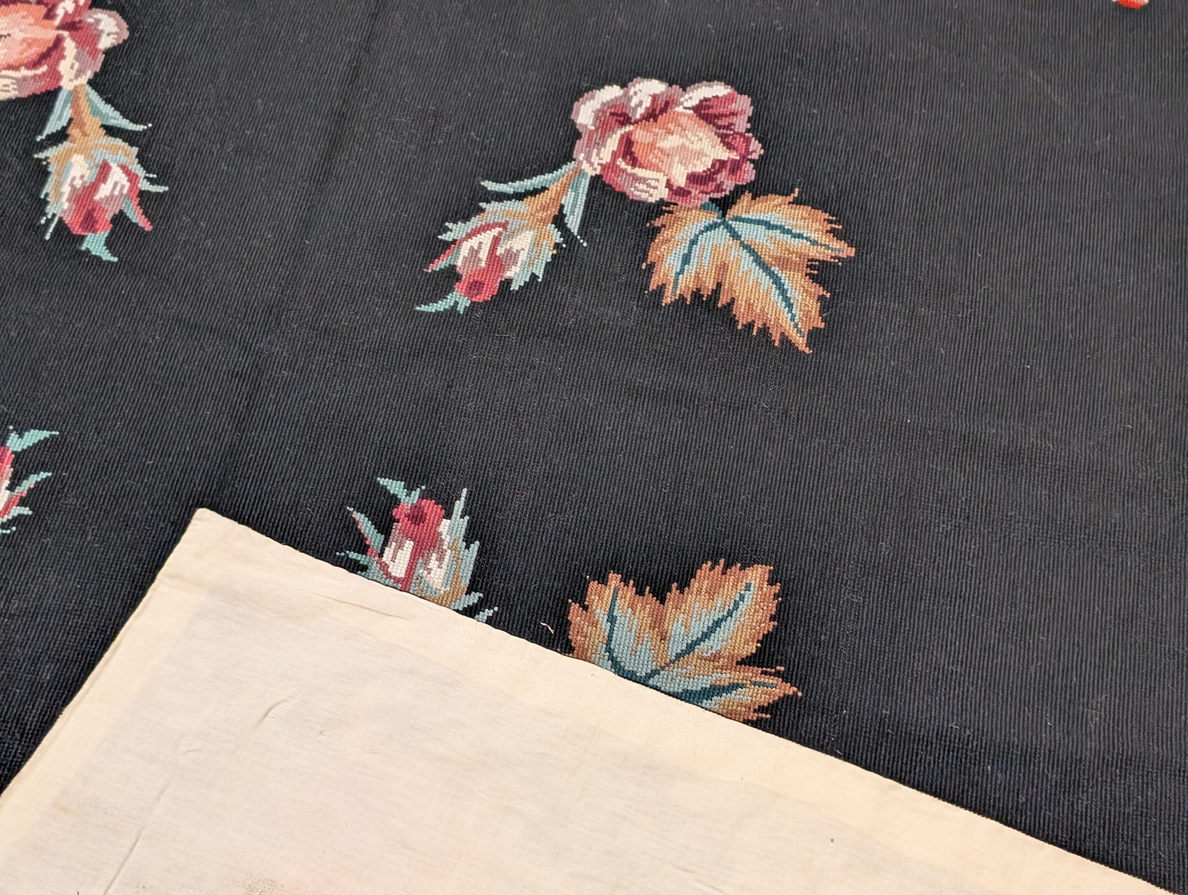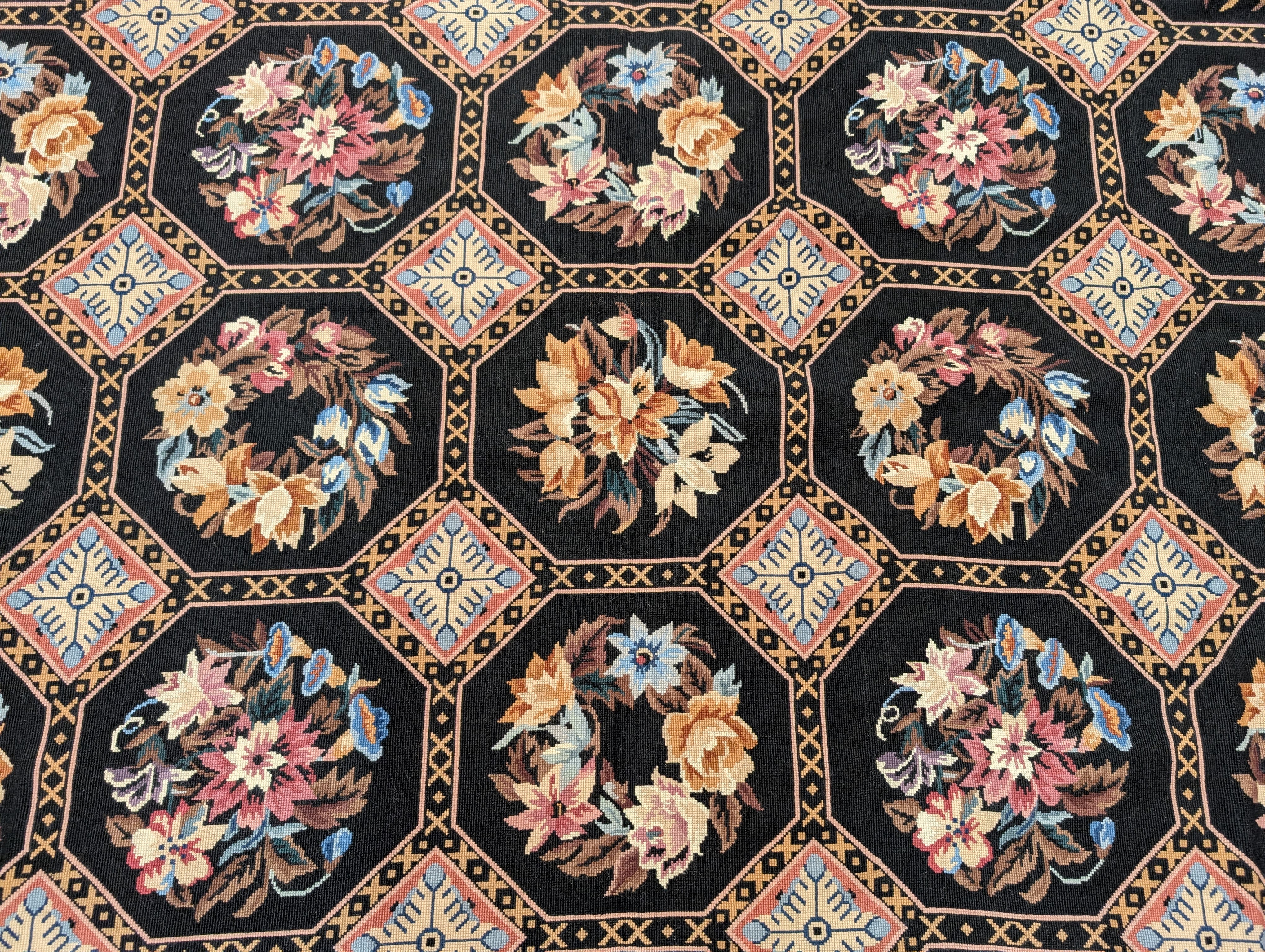 Black Needlepoint Rug 9x12, Floral, Handmade, Vintage
