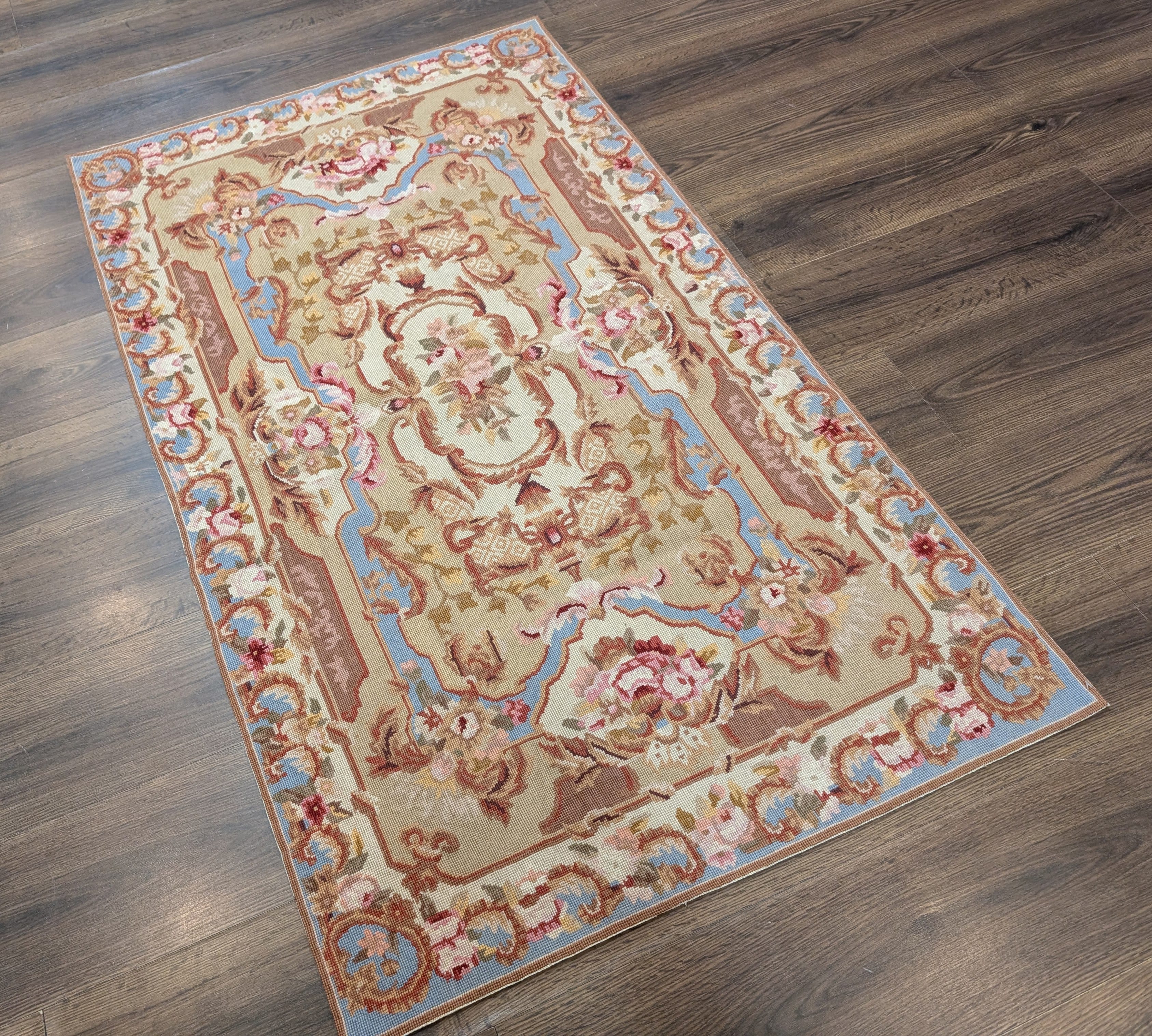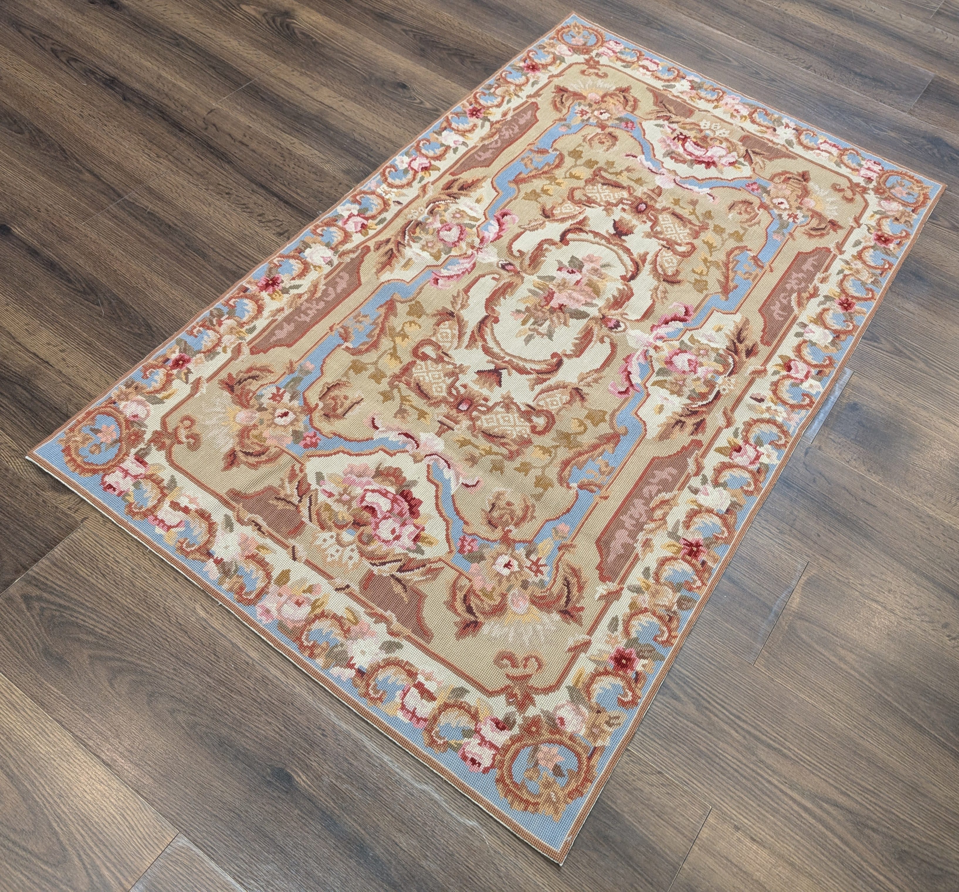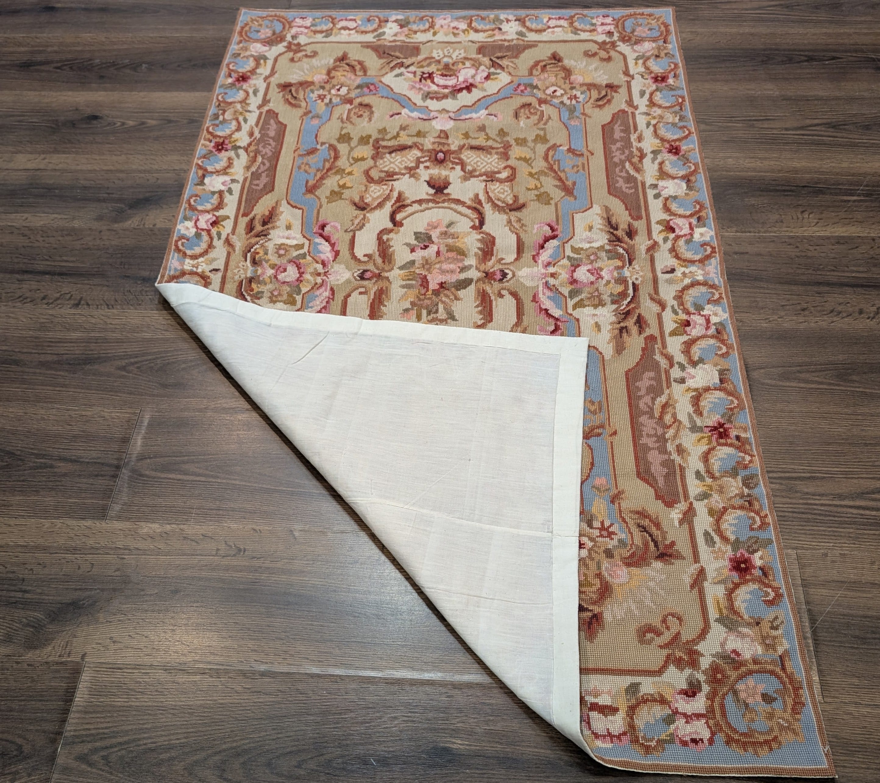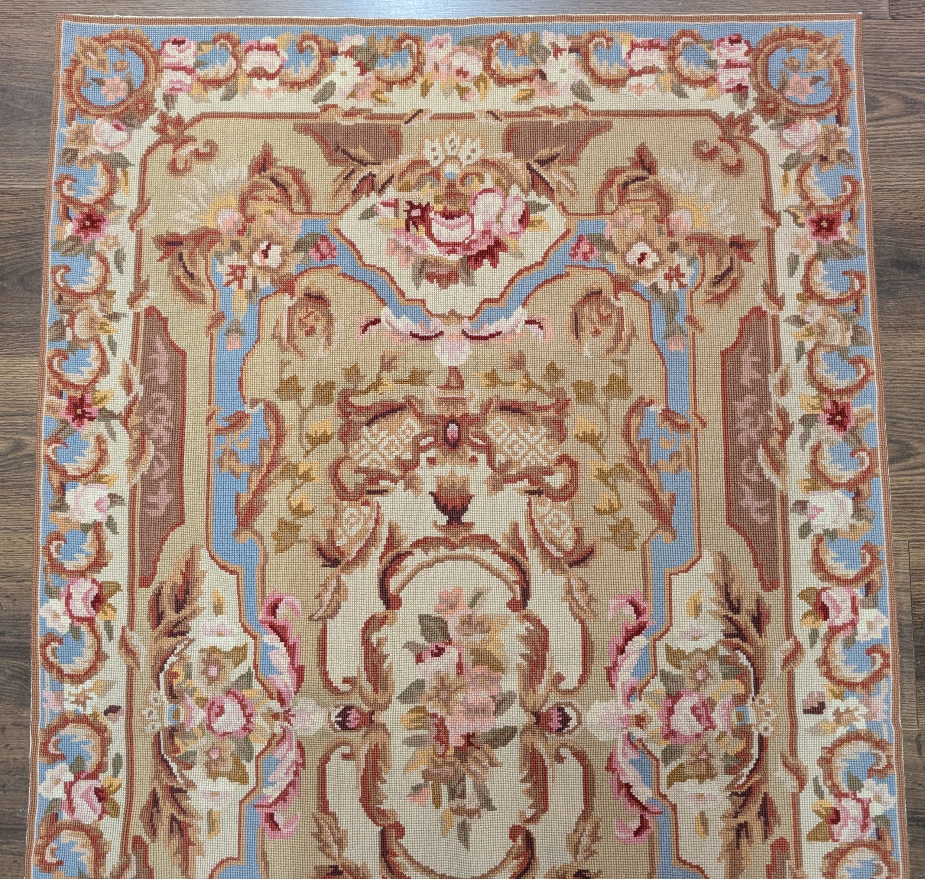 Light Blue Needlepoint Rug 5x8, Floral, New