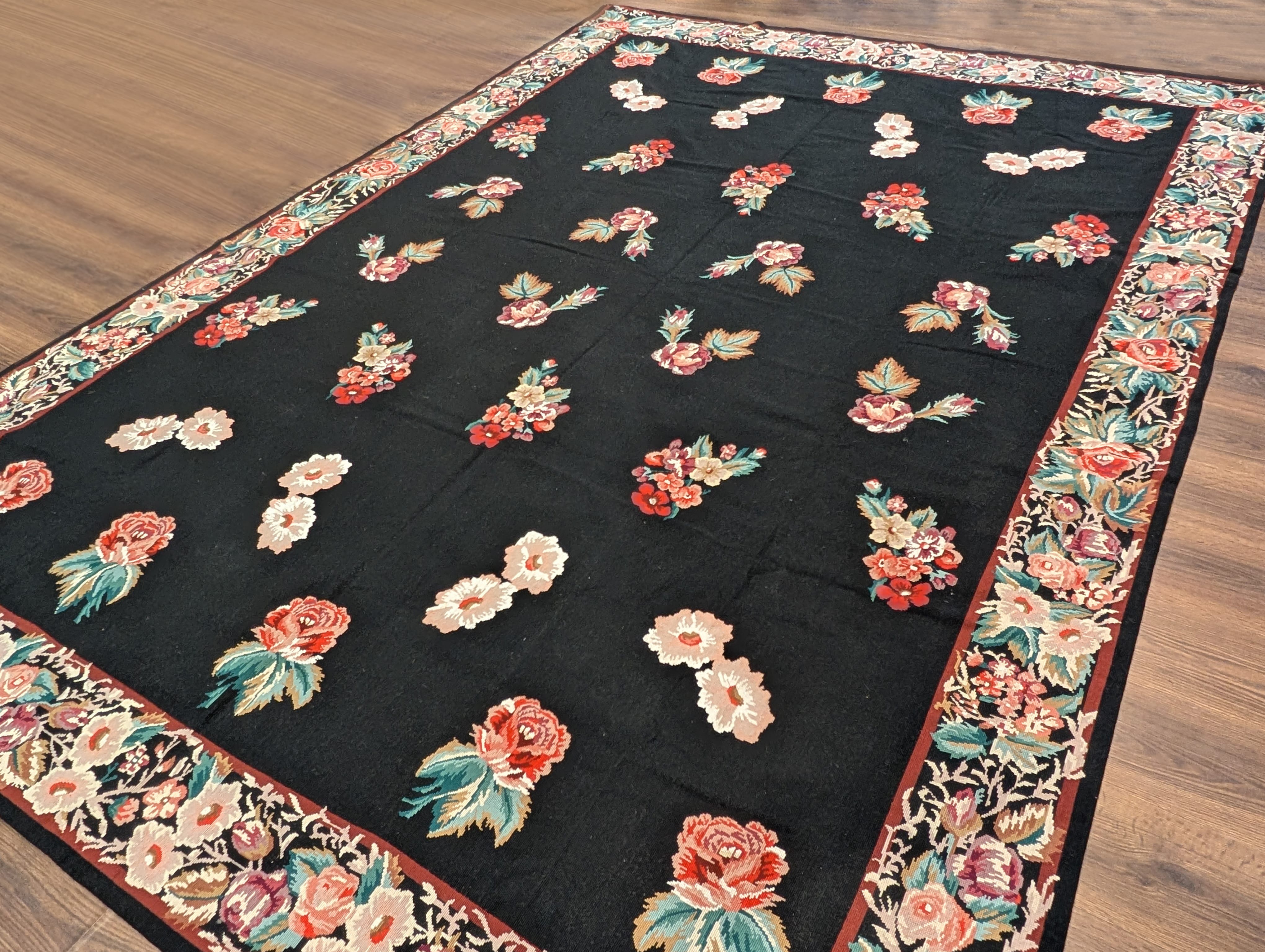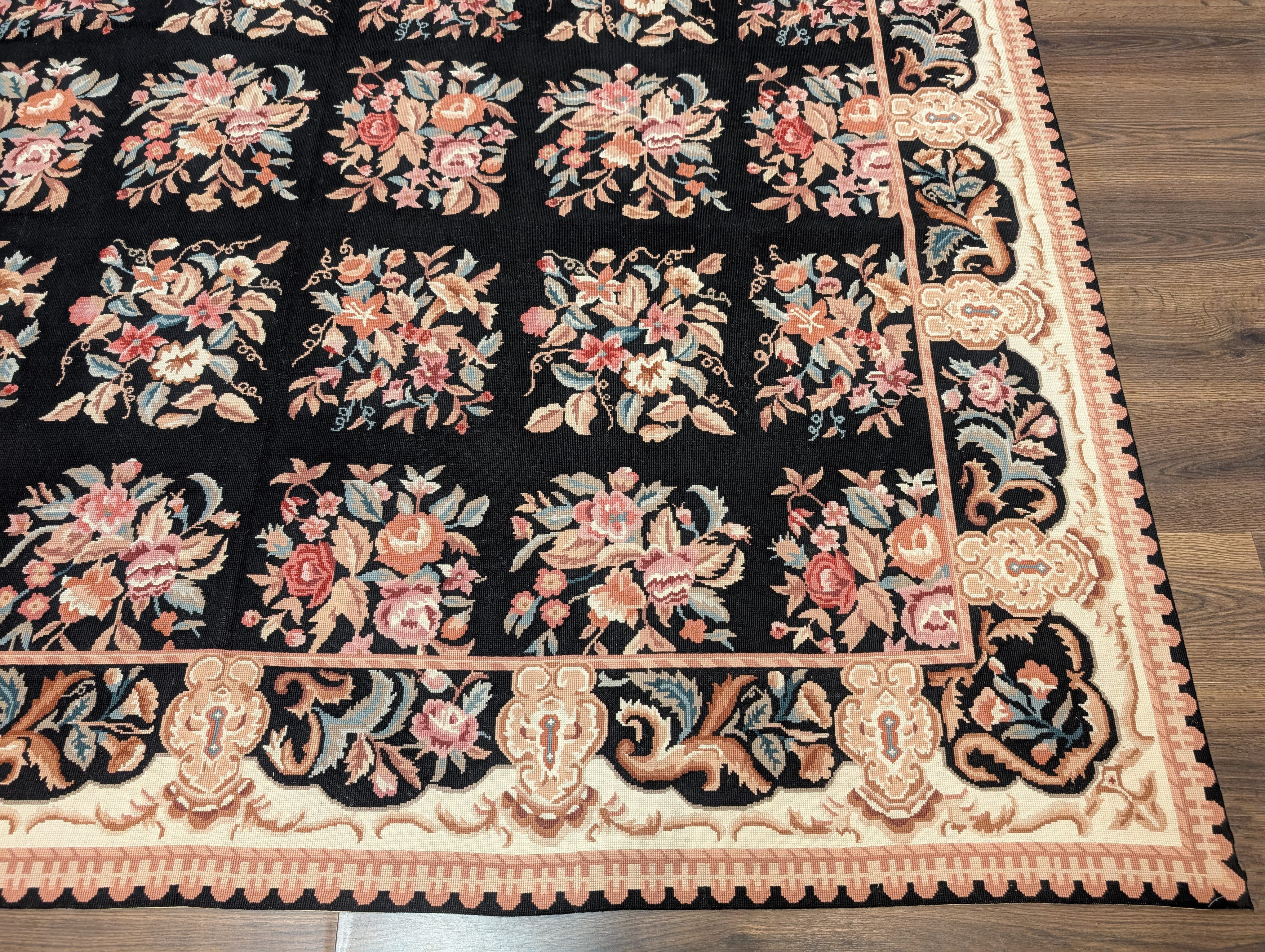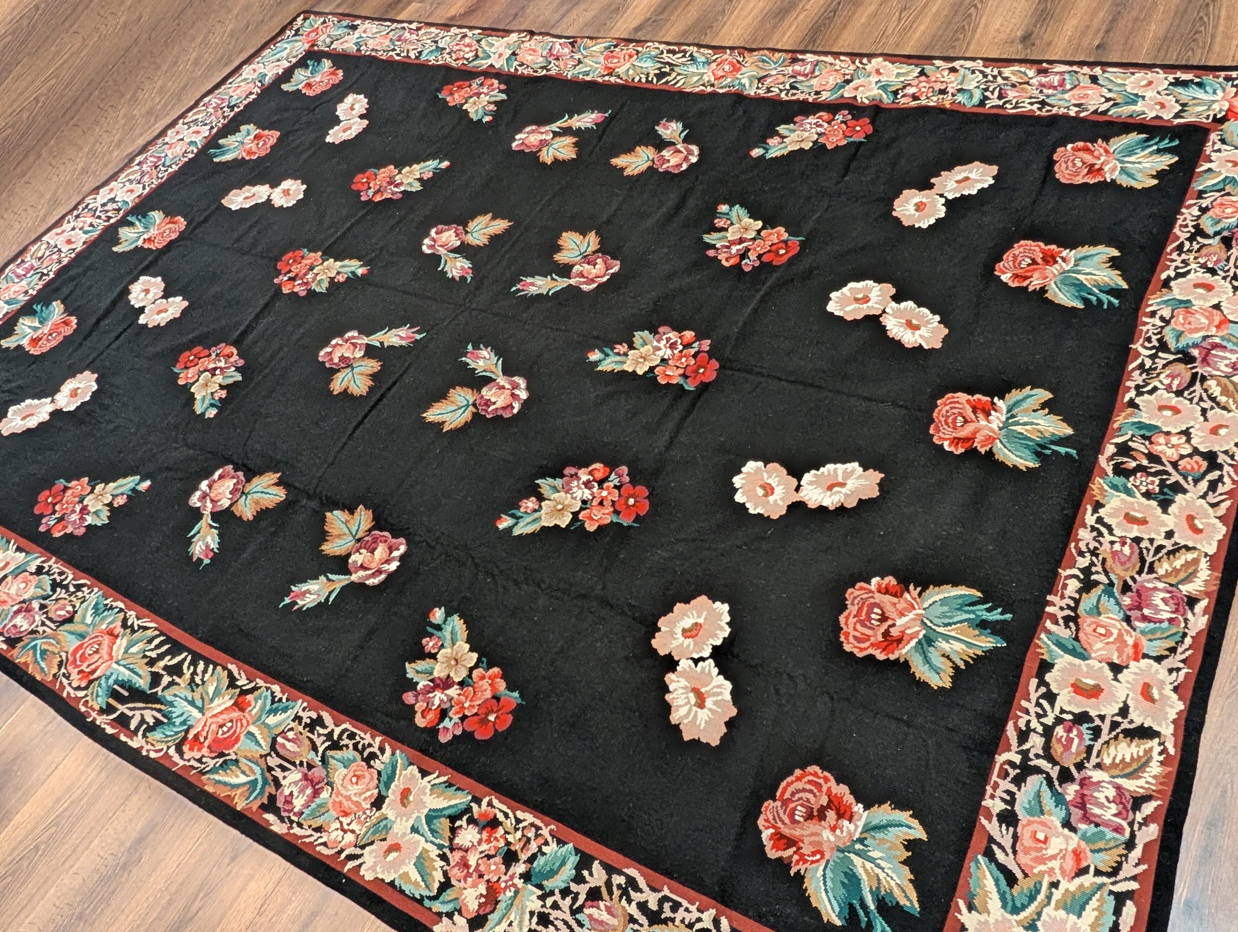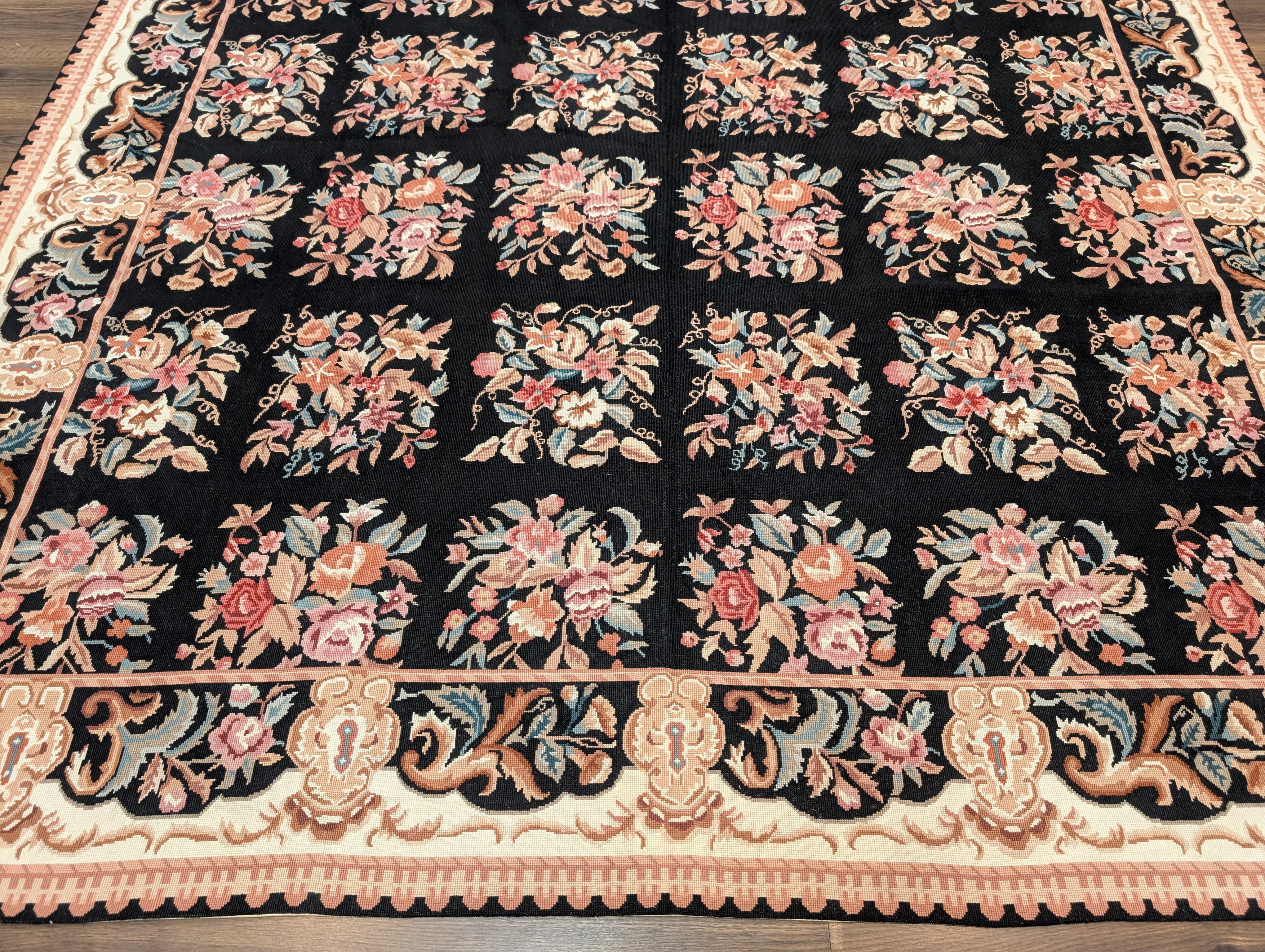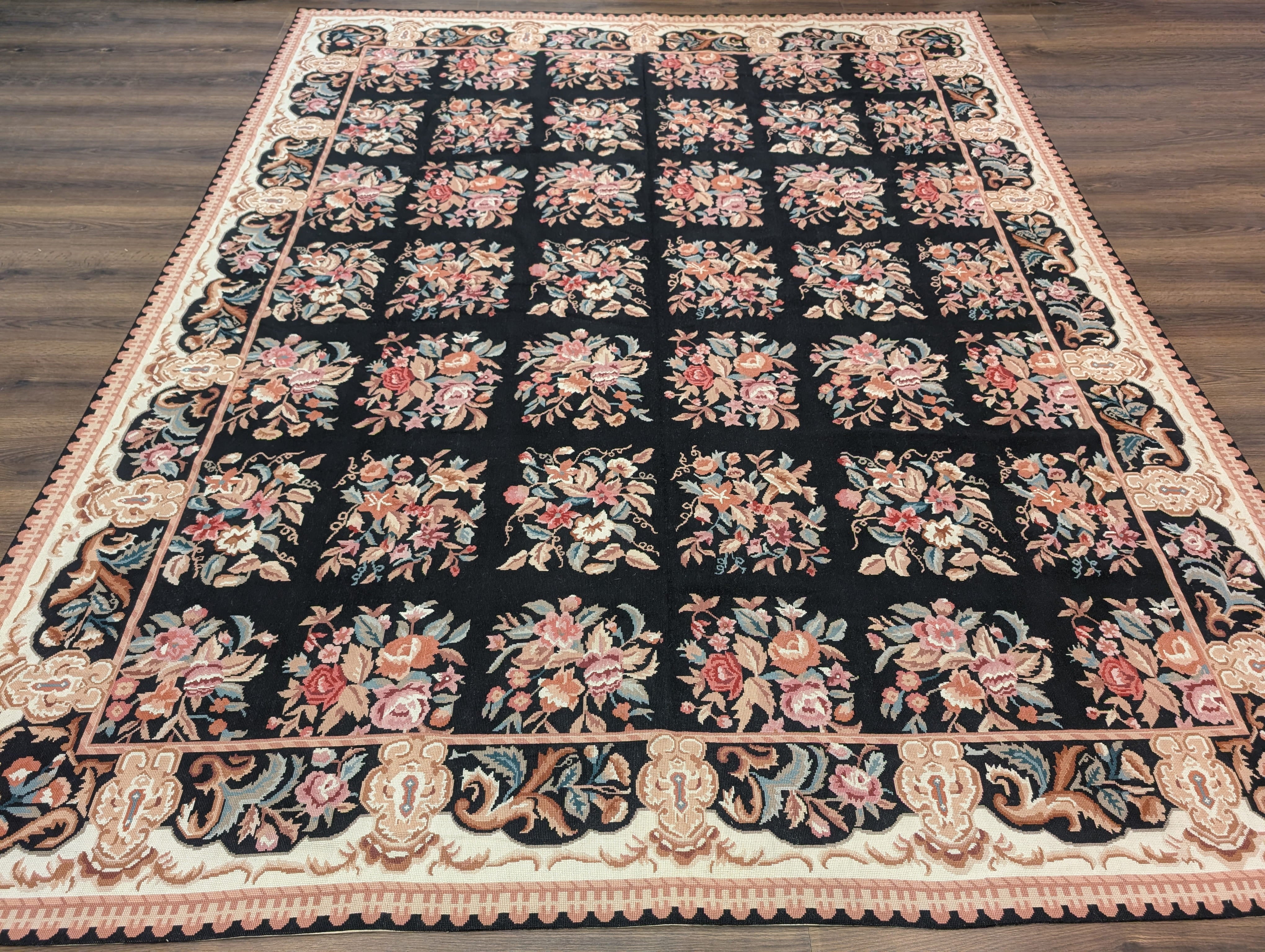 Black Needlepoint Rug 8x10, Handwoven Floral European Flatweave Carpet