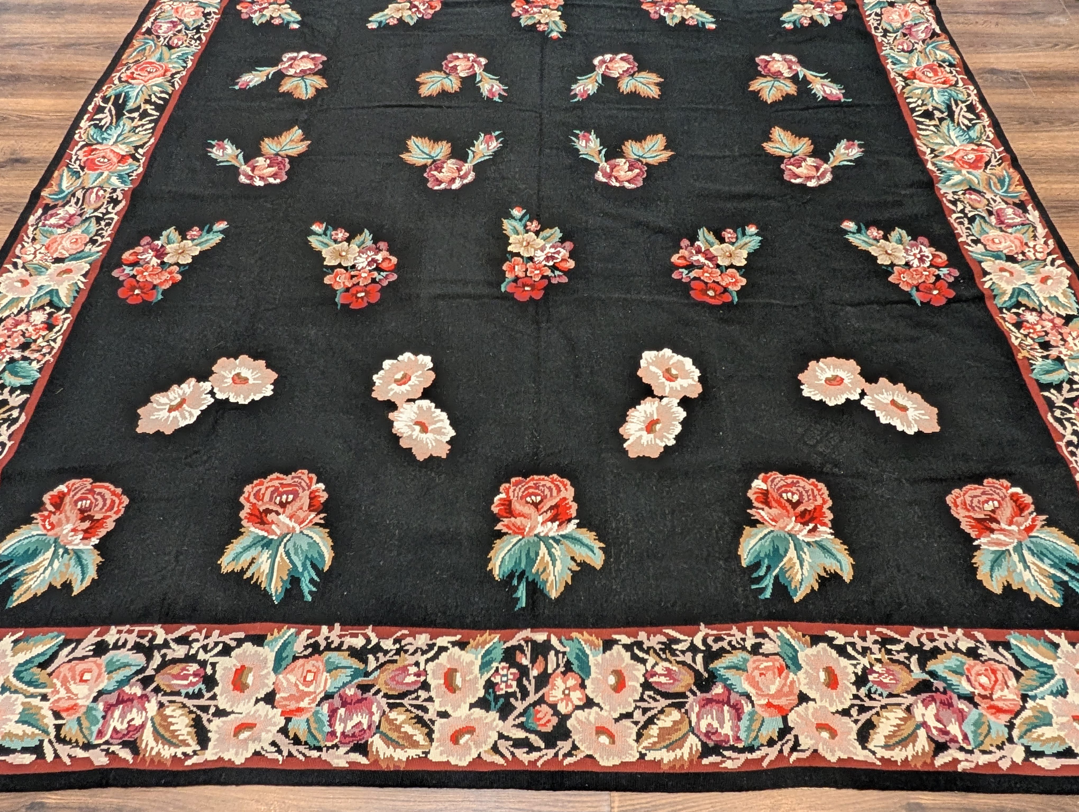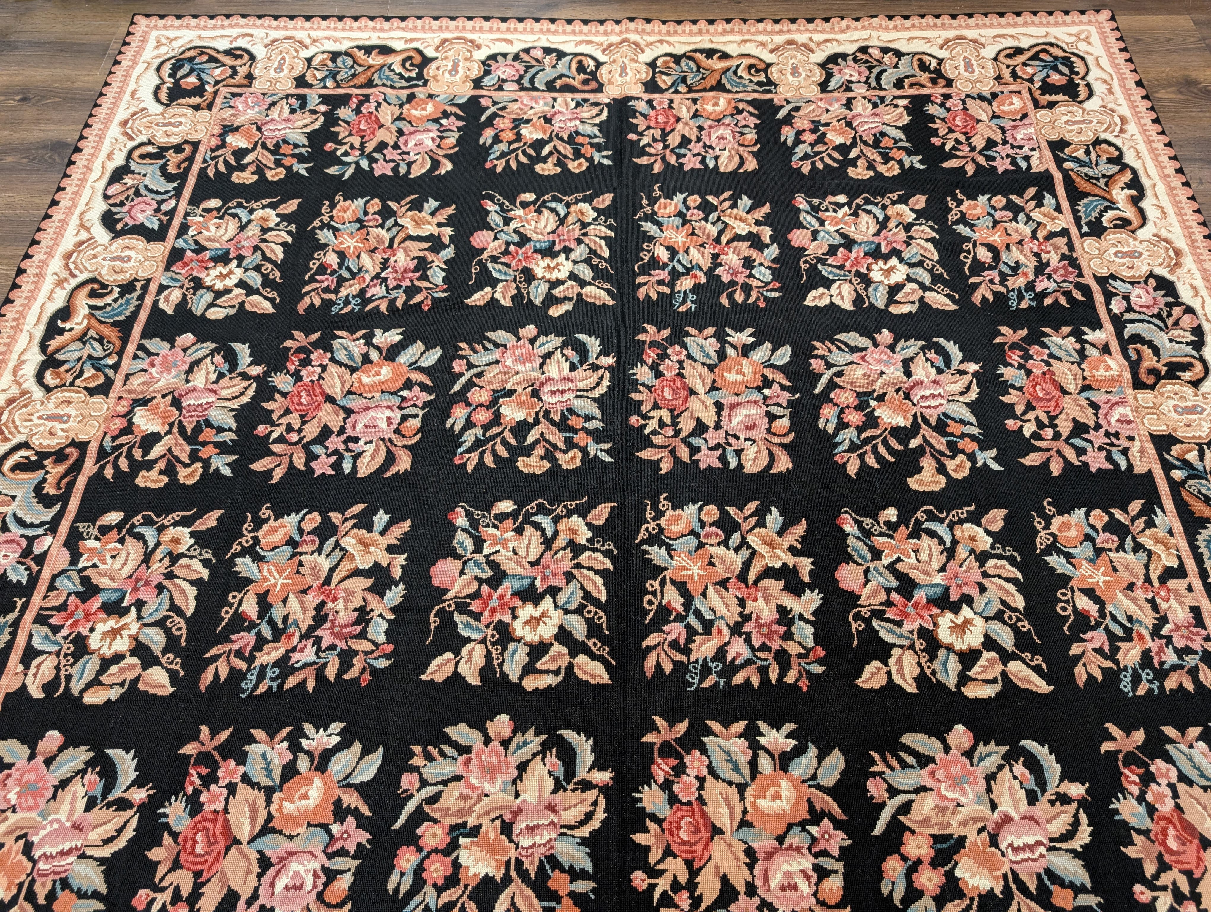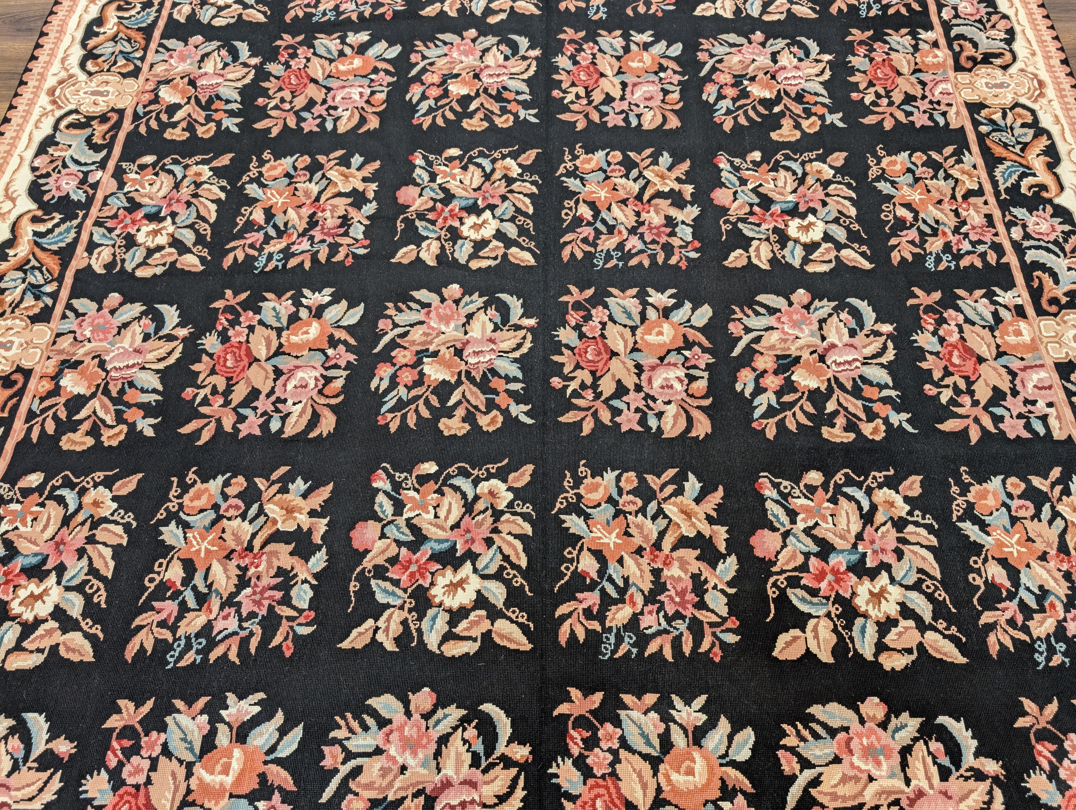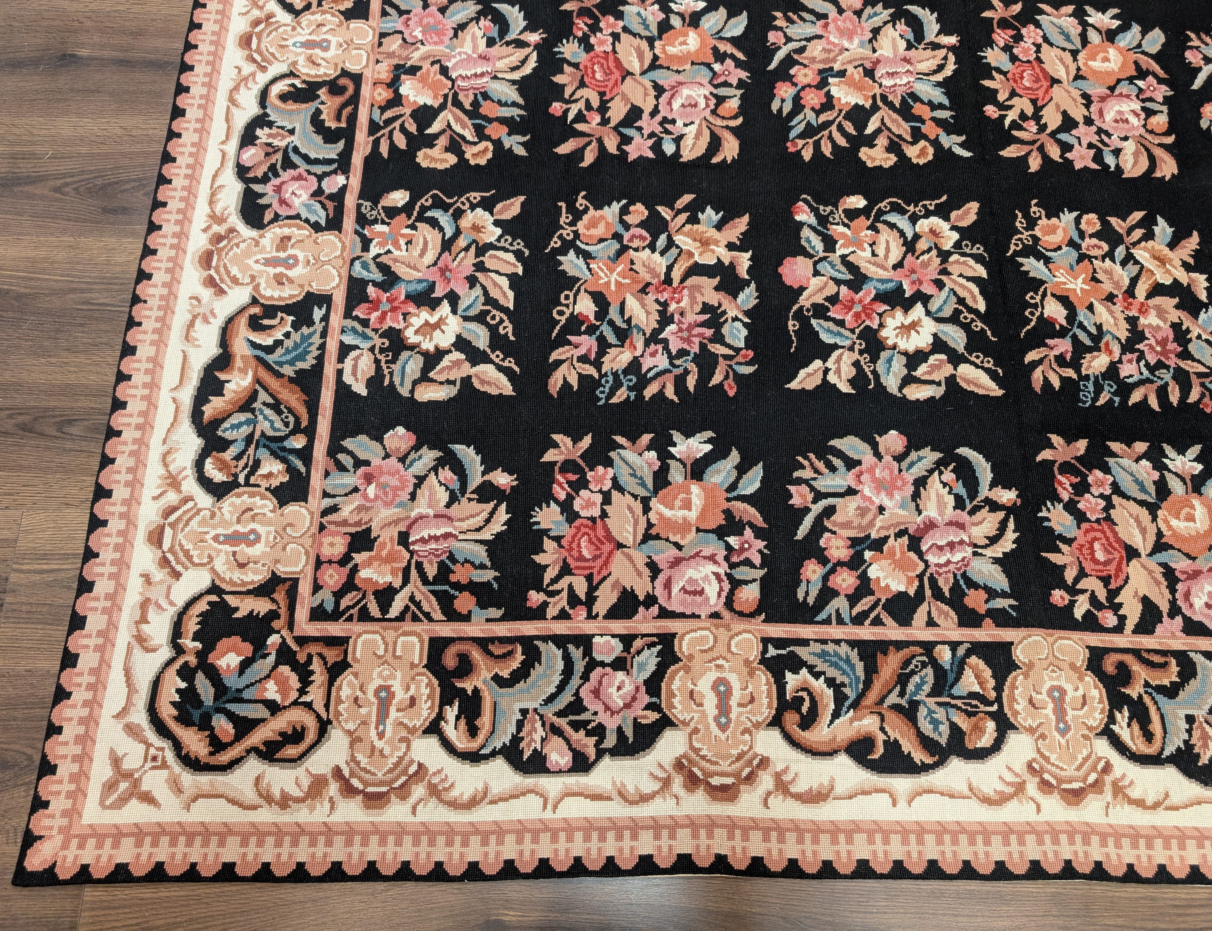 Black Needlepoint Rug 8x10, Handwoven Floral European Flatweave Carpet