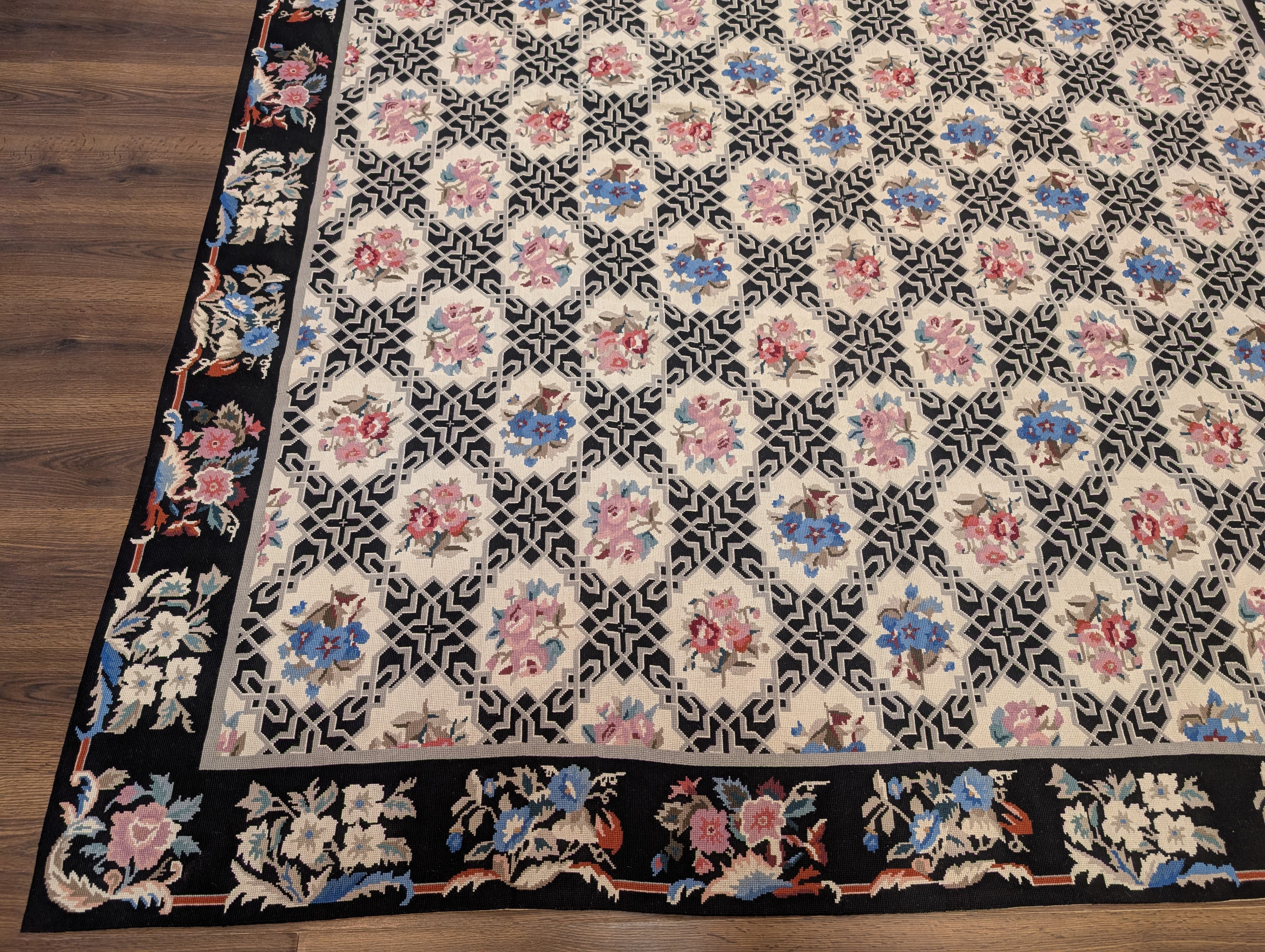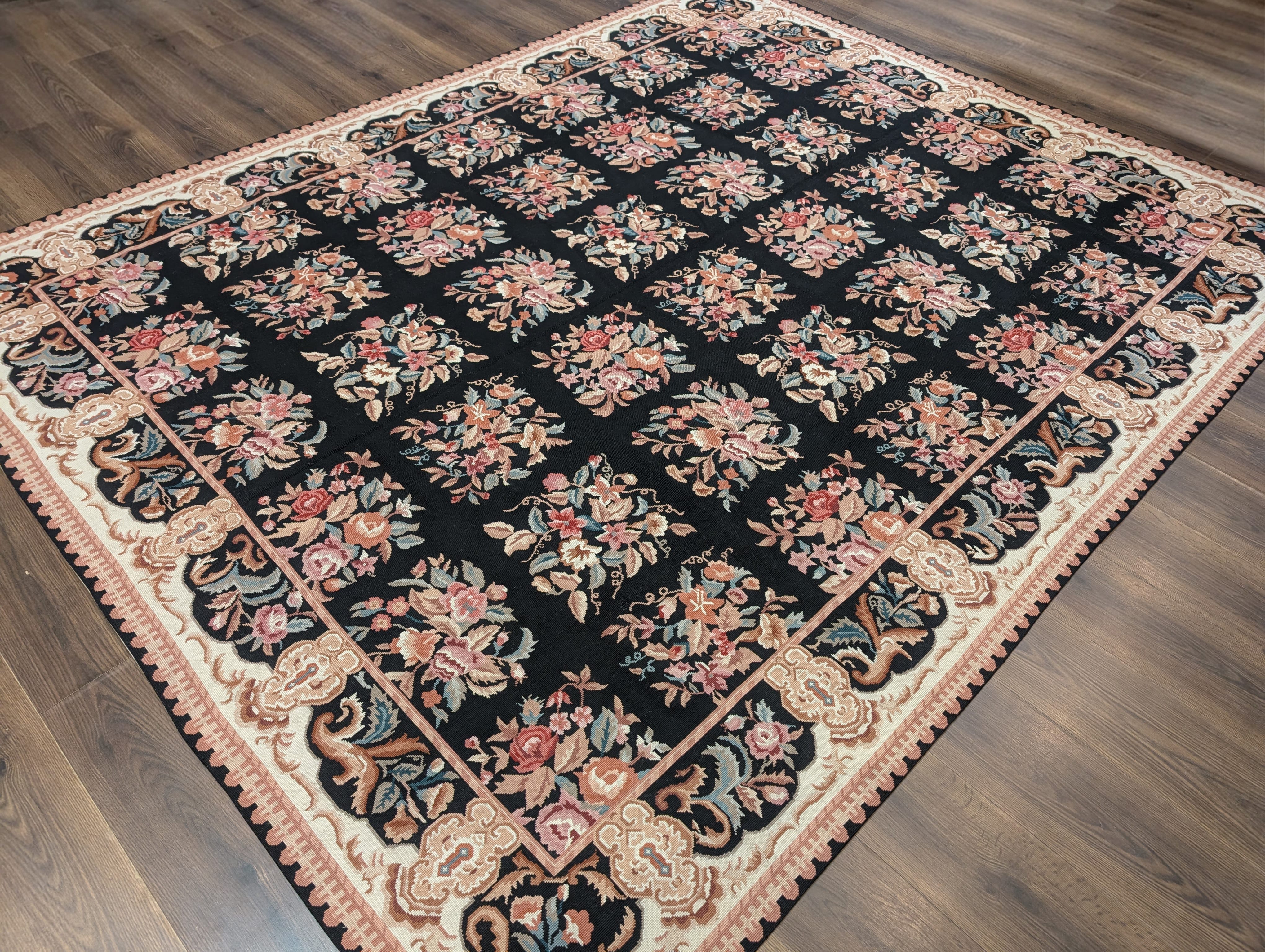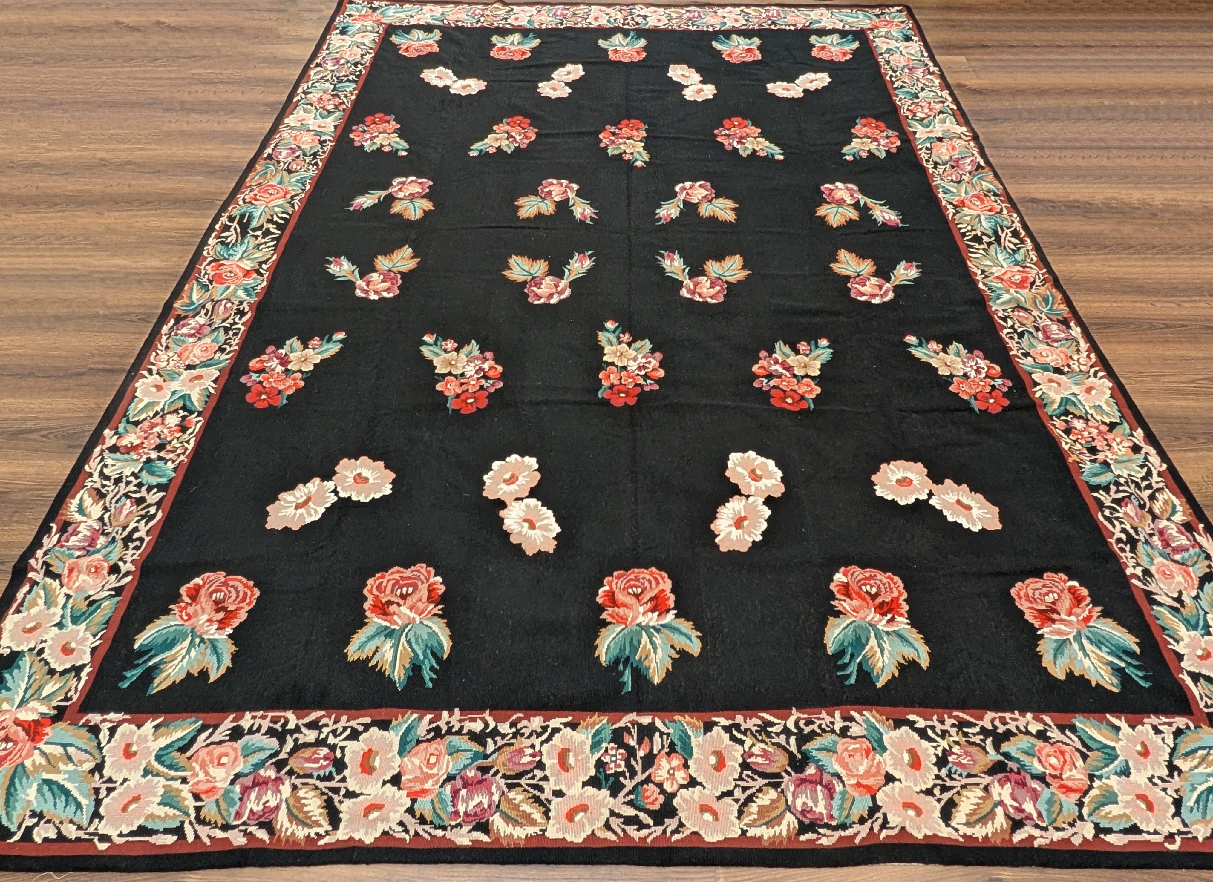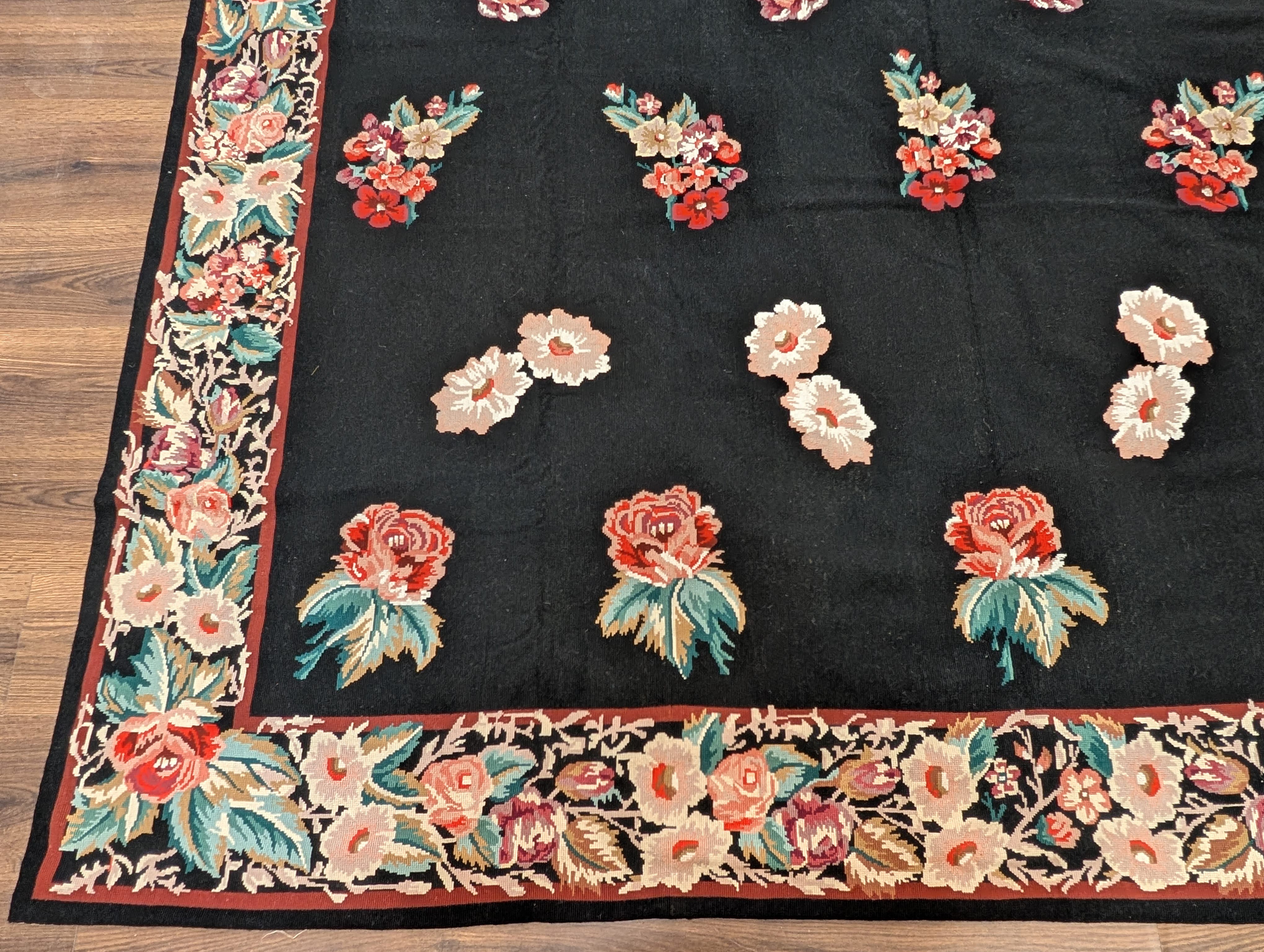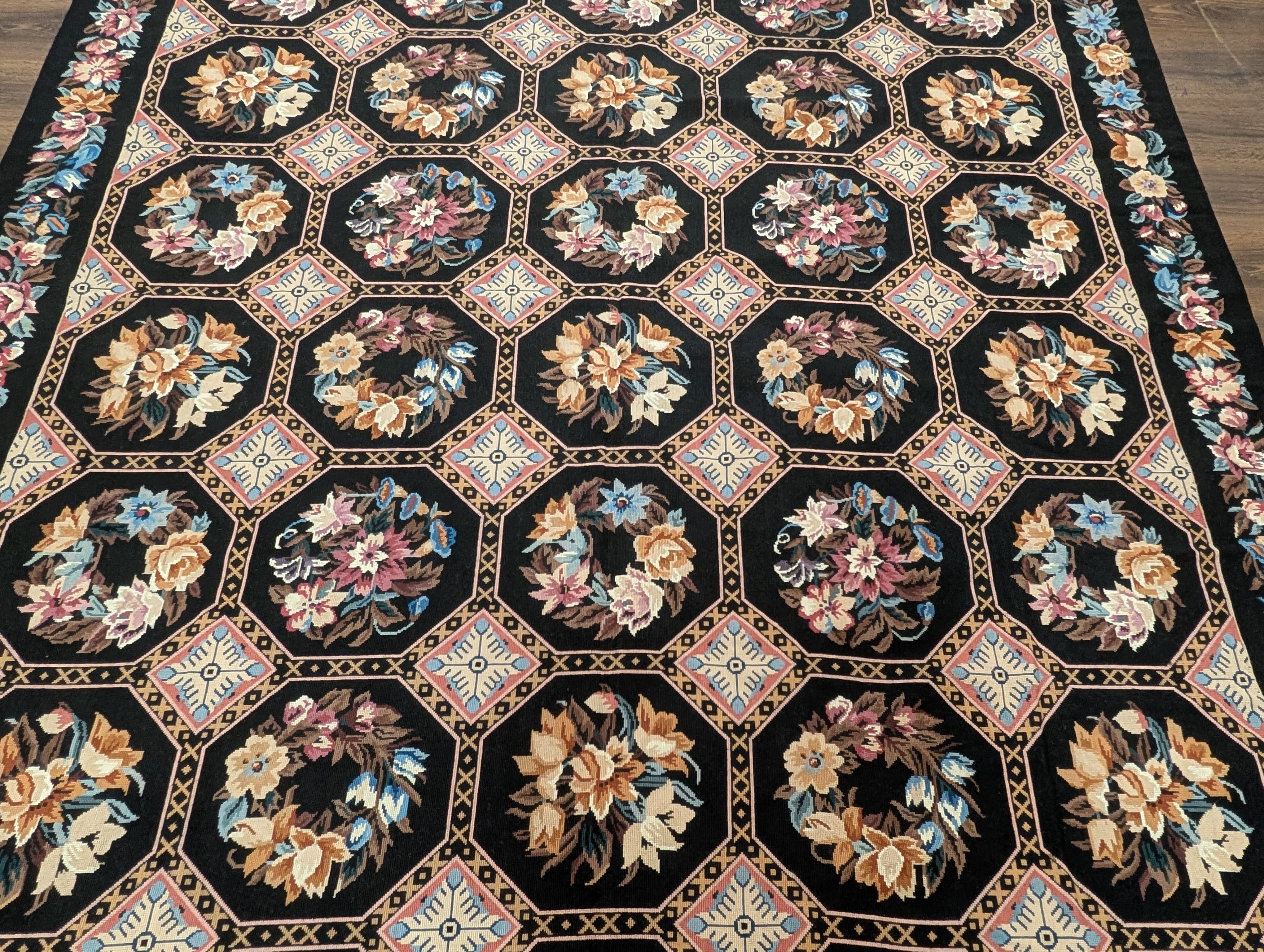 Black Needlepoint Rug 8x10, Handwoven Floral European Flatweave Carpet
