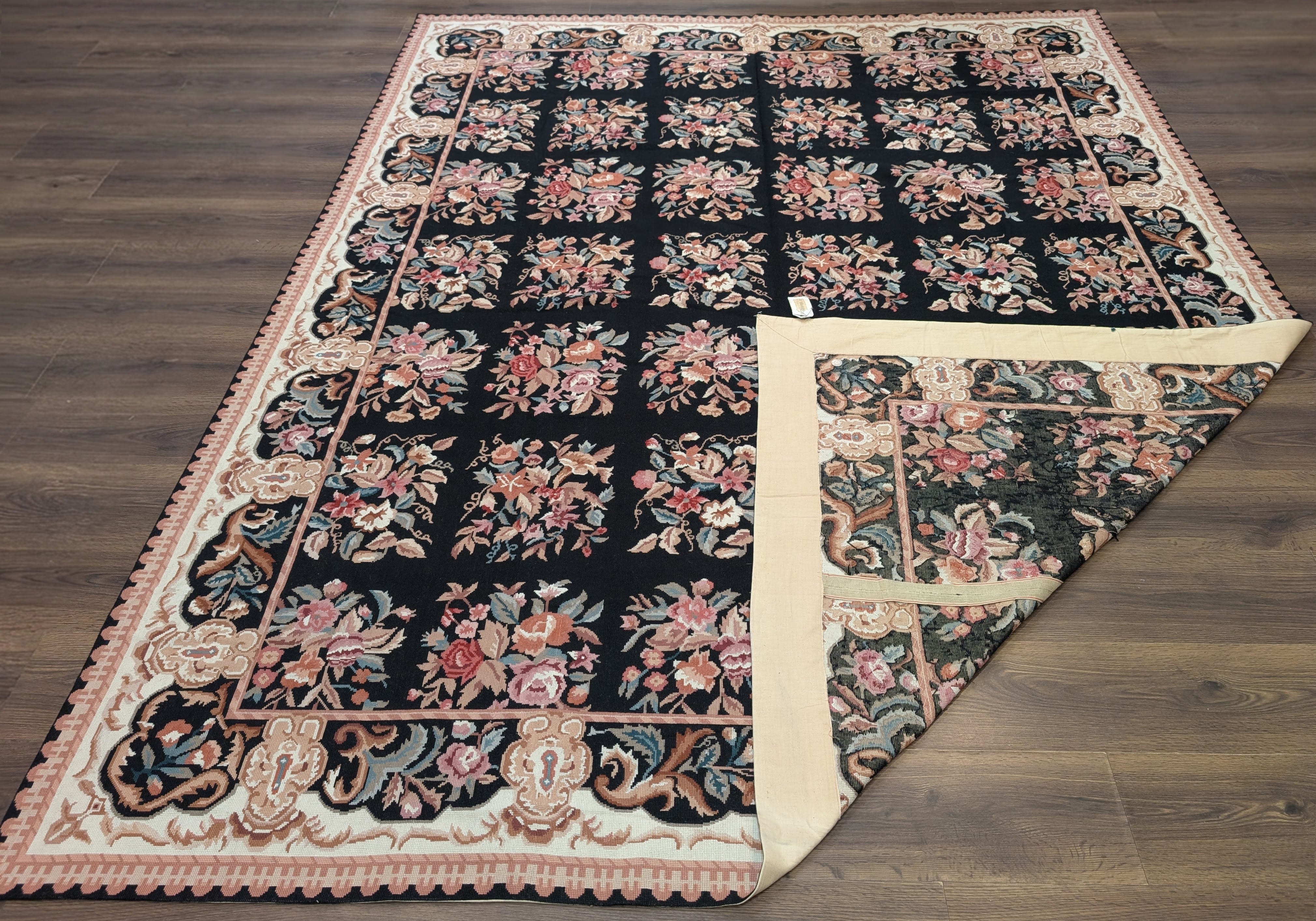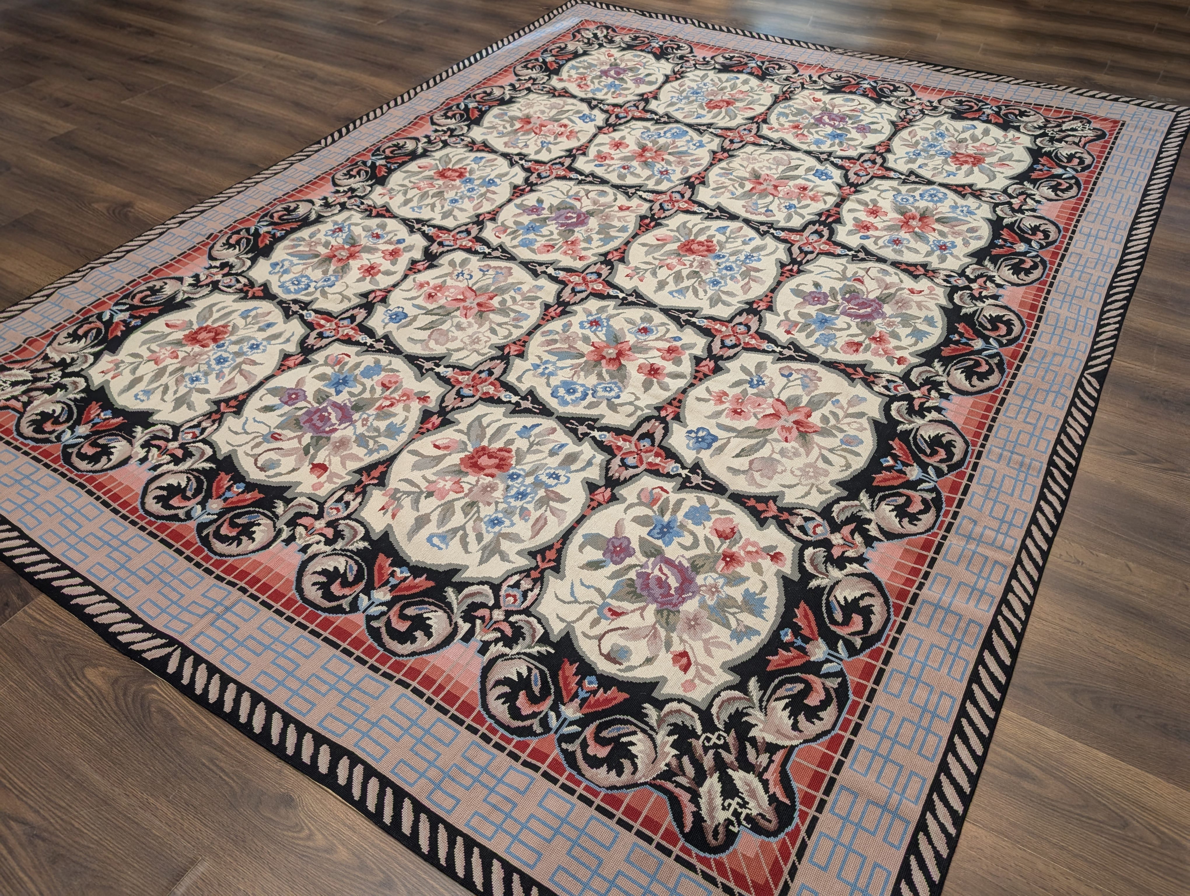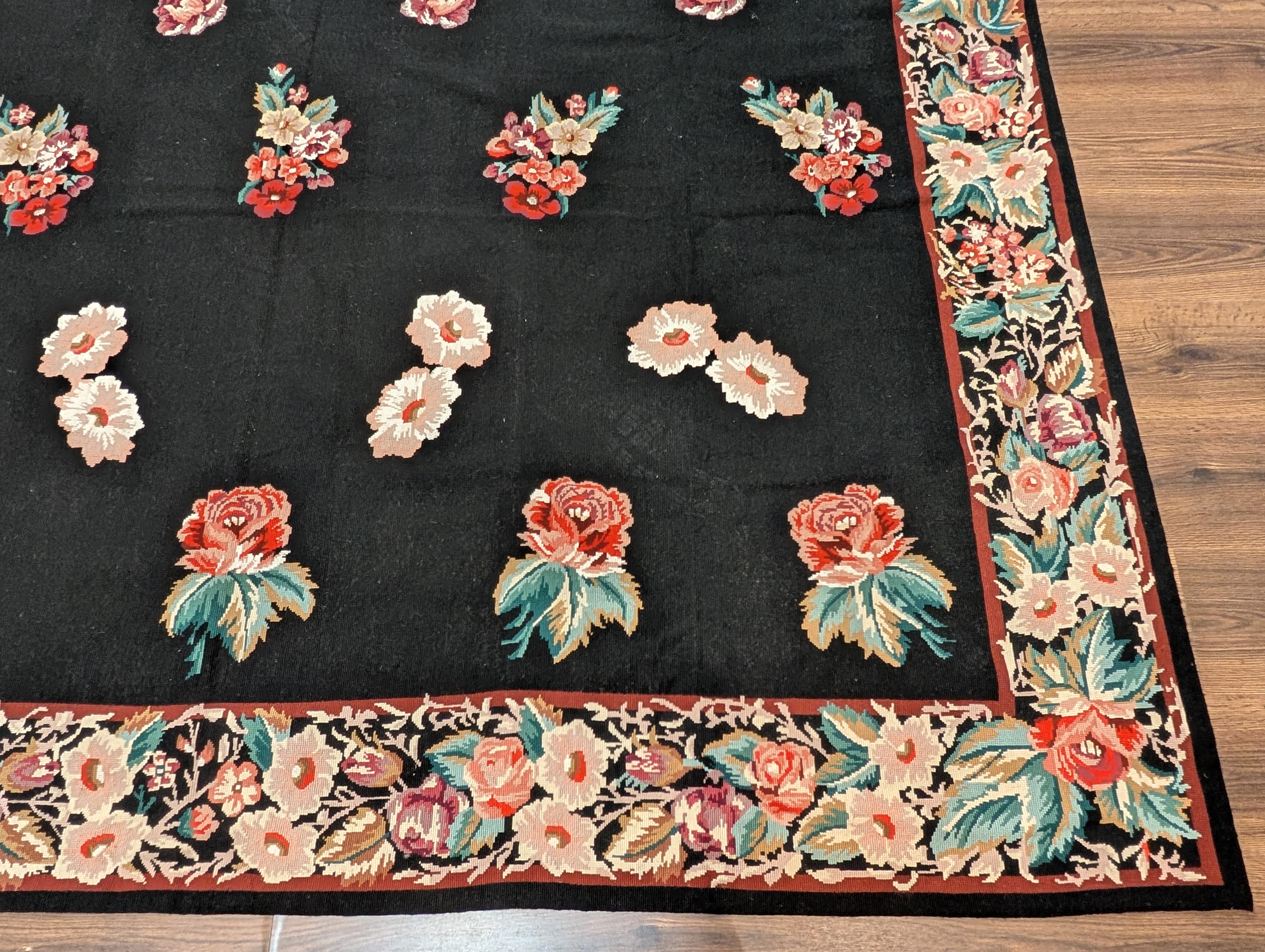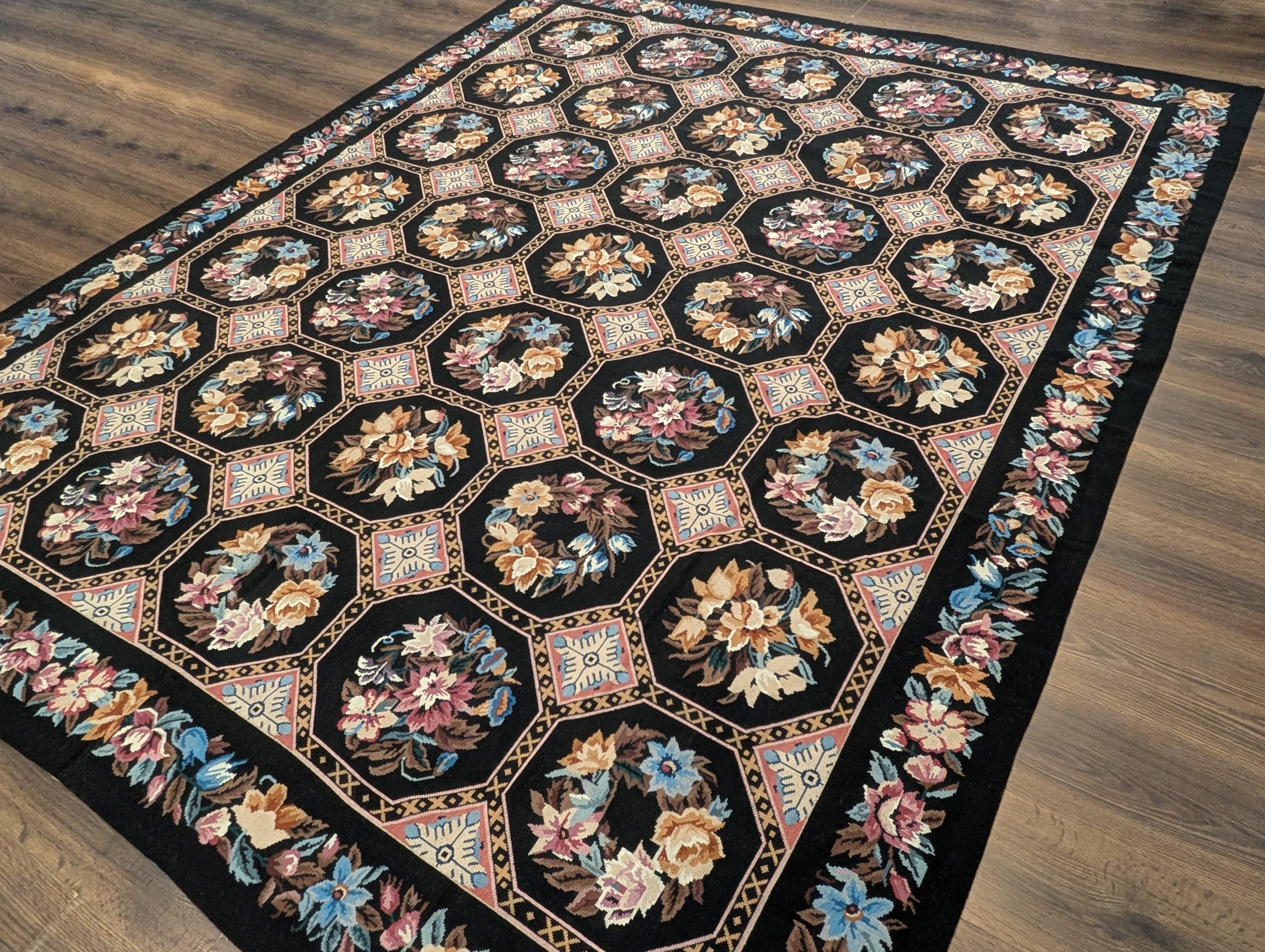 Black Needlepoint Rug 8x10, Handwoven Floral European Flatweave Carpet