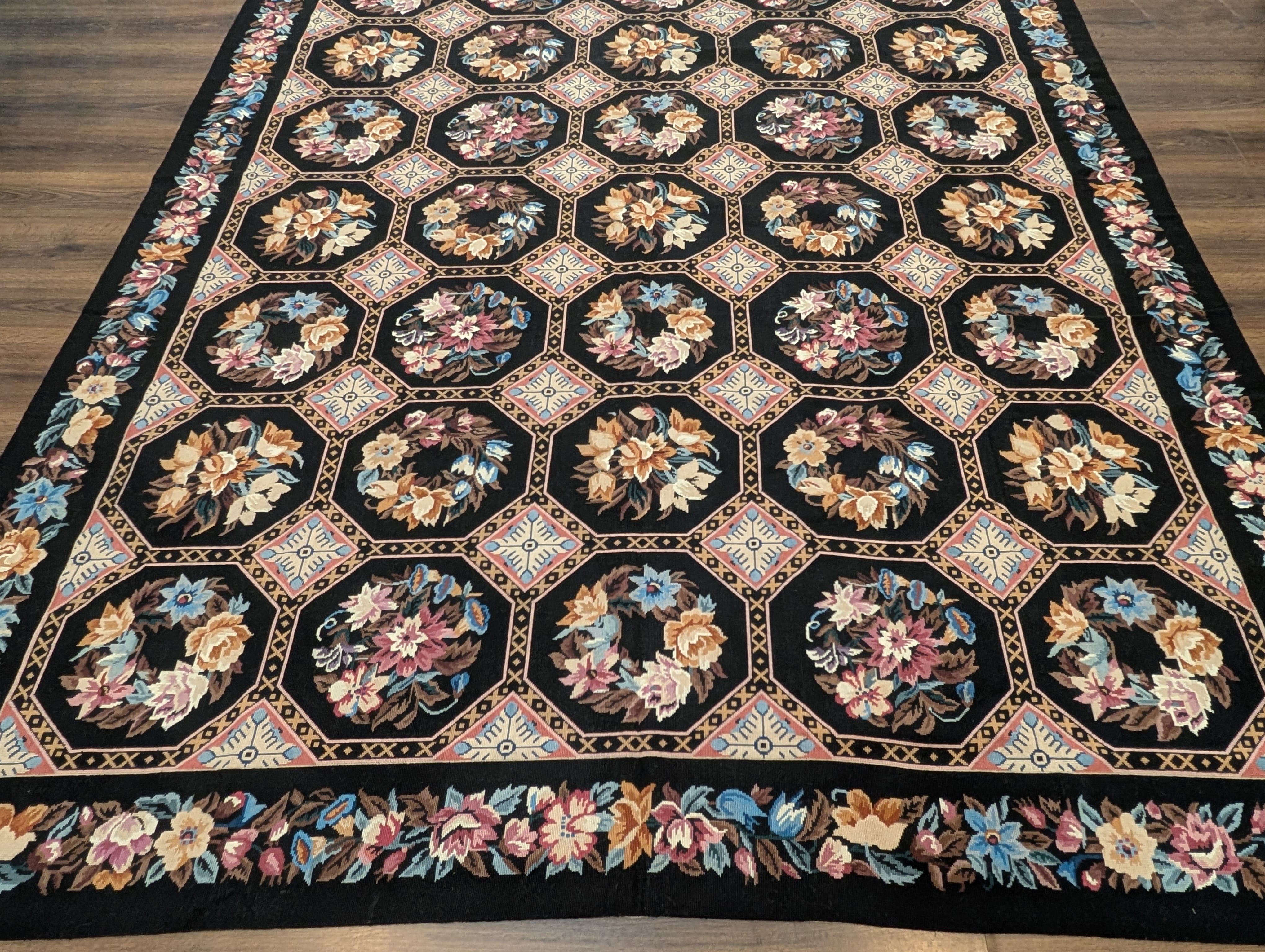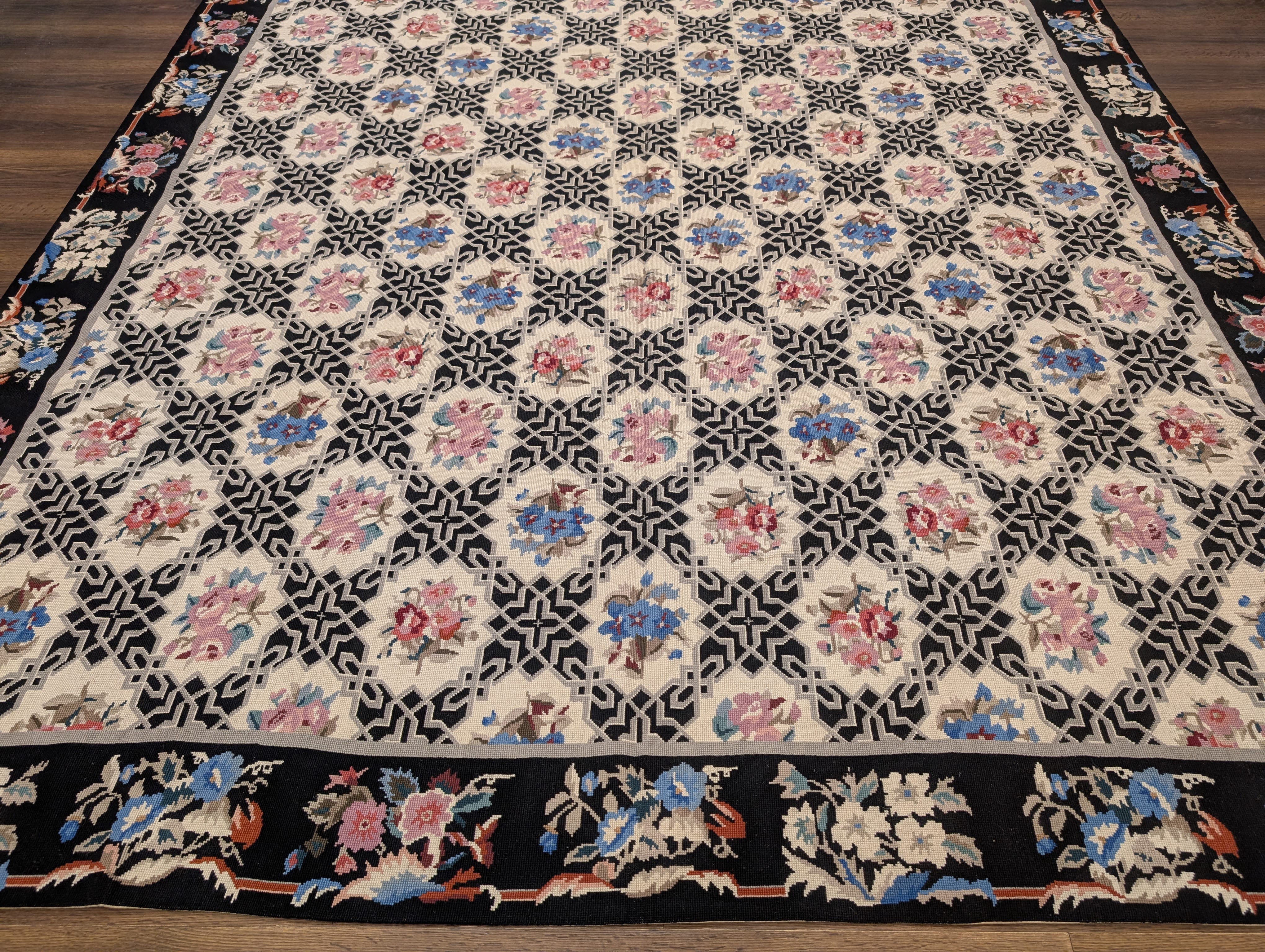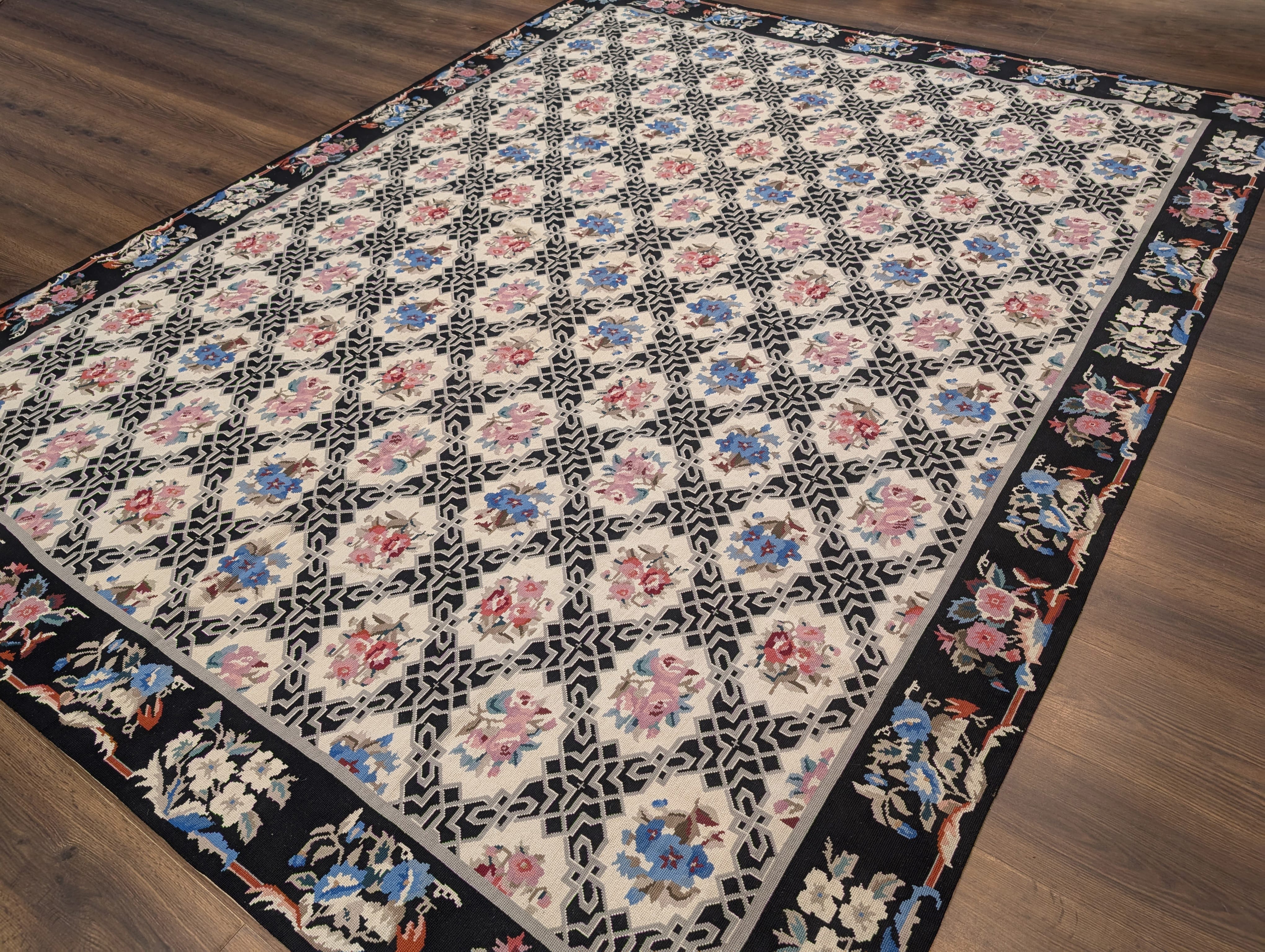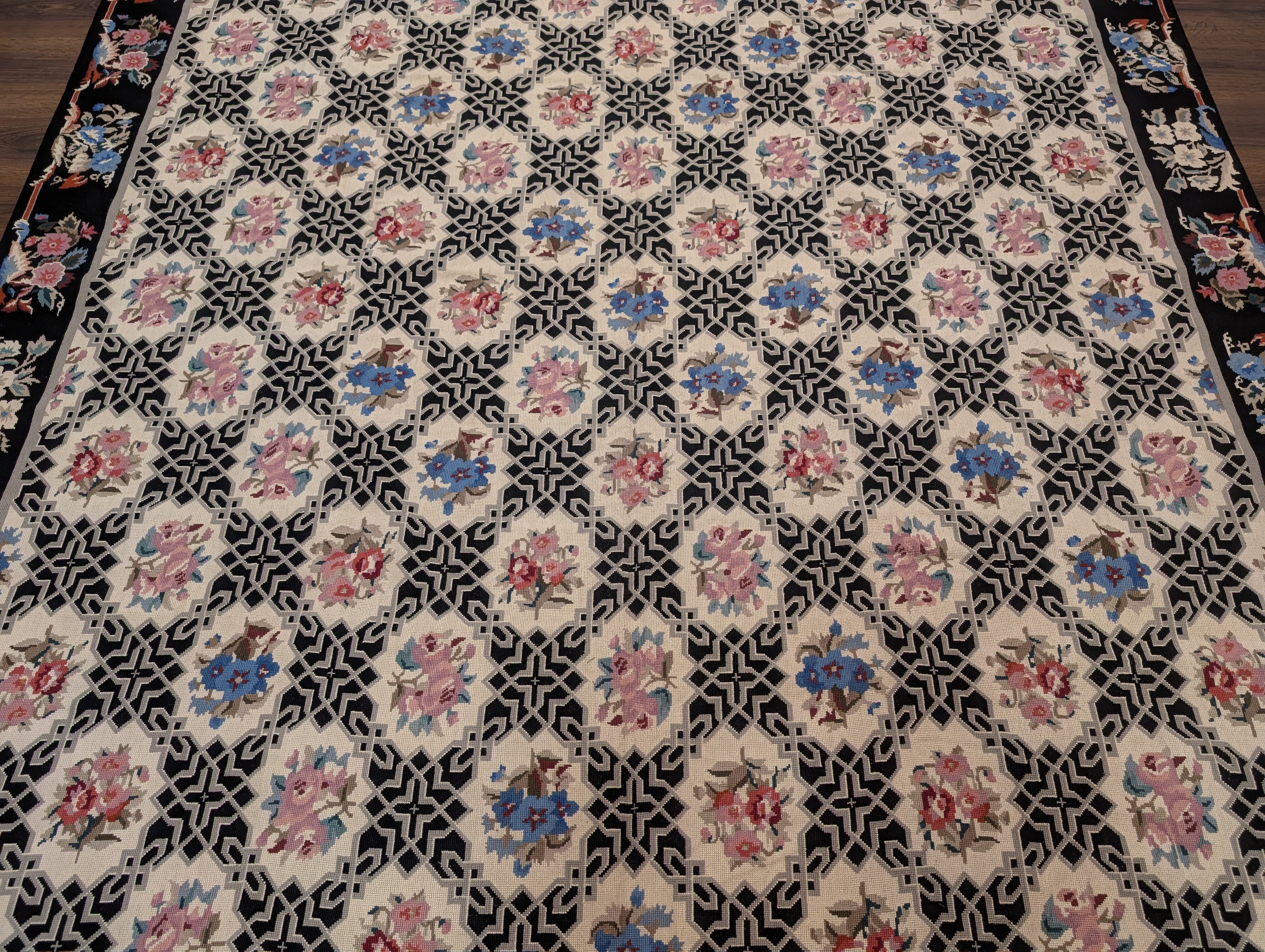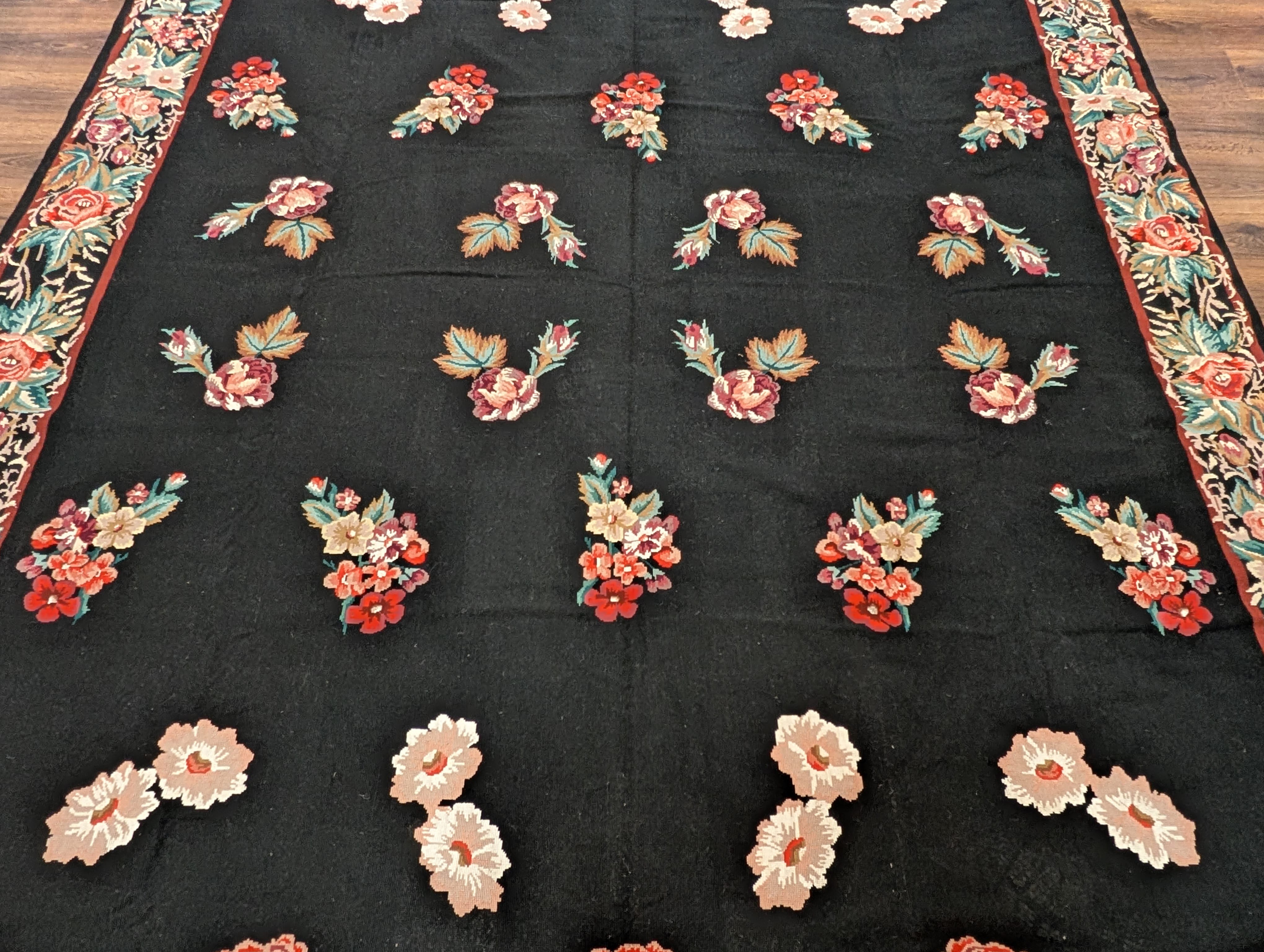 Black Needlepoint Rug 8x10, Handwoven Floral European Flatweave Carpet