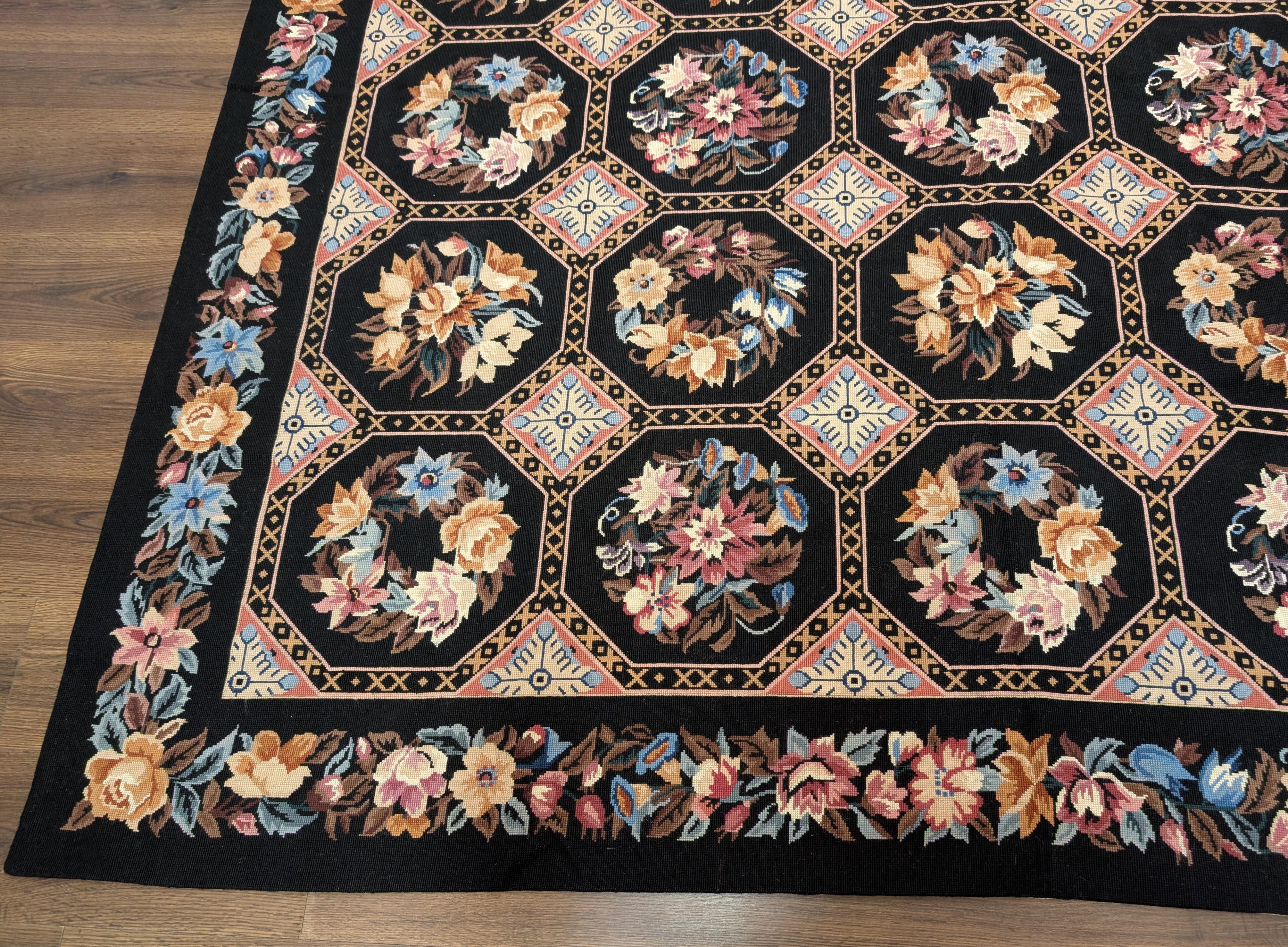 Black Needlepoint Rug 8x10, Floral Panel Design, New