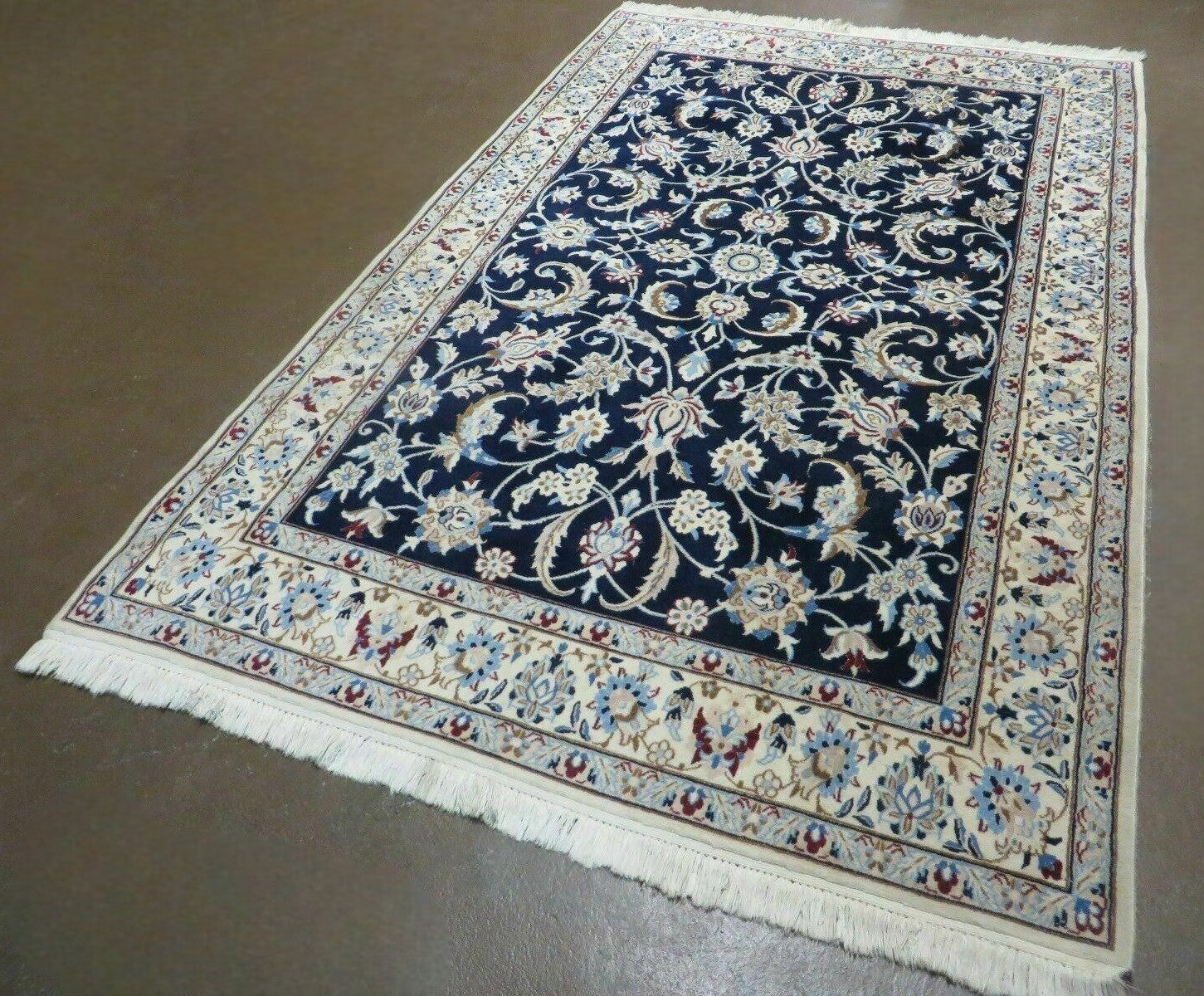 Nain rugs are distinguished by their central medallion, often set against an ivory or cream background. Surrounding this focal point, intricate floral and vine motifs create an elegant and symmetrical pattern. The most common colors include: