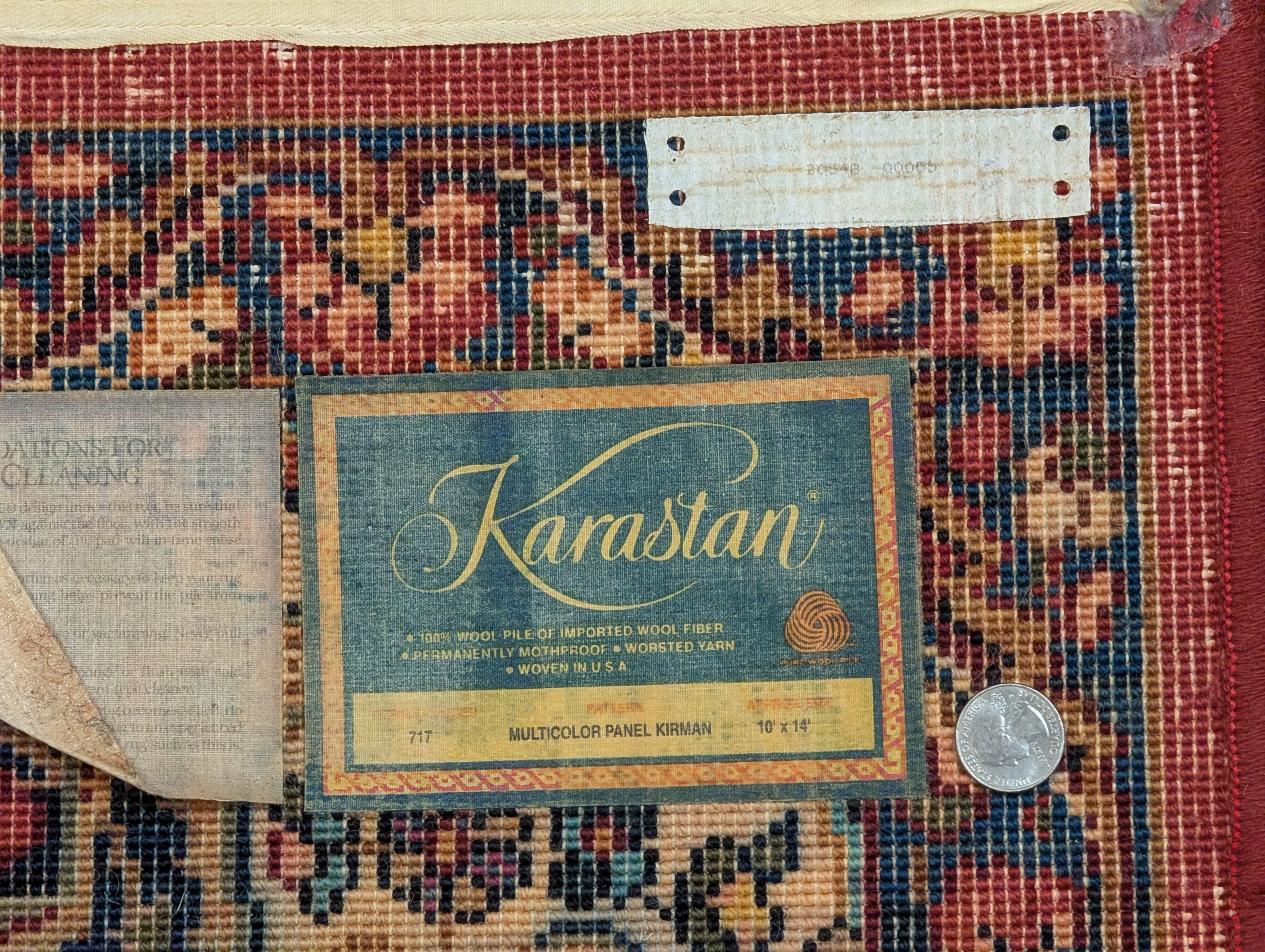 | Condition/Notes | A beautiful vintage Karastan rug in very good condition. Free of stains, odors, discolorations, tears, etc. Good pile & fringes. Original Karastan label is attached. Recently cleaned and ready to be enjoyed in your space. |