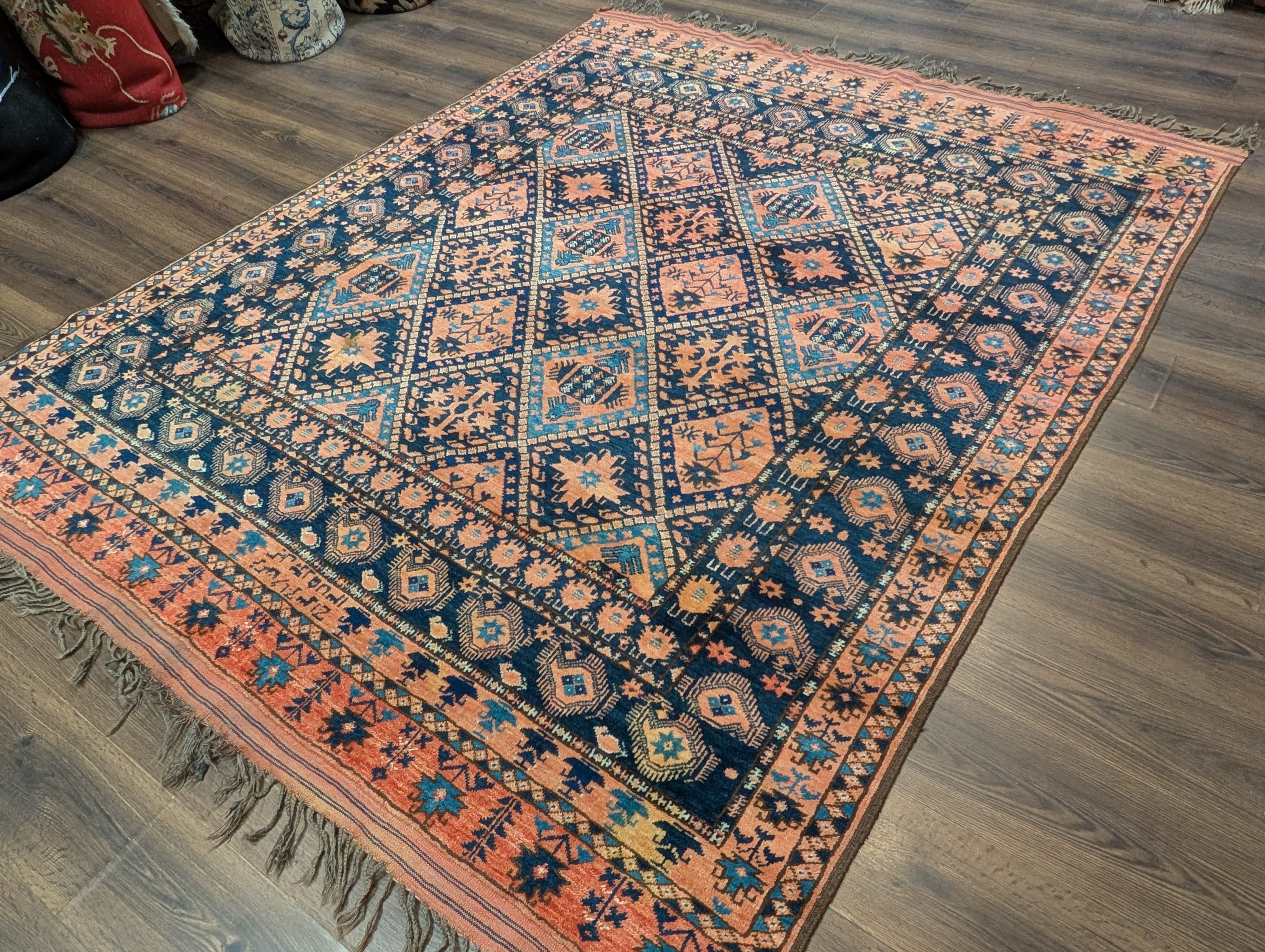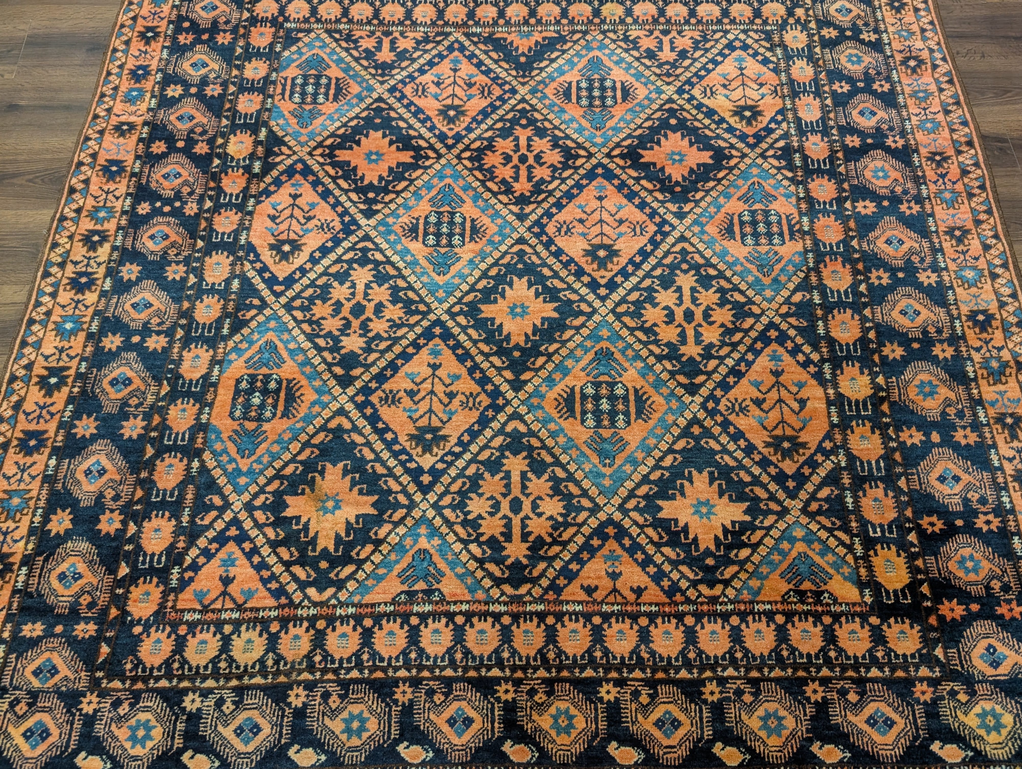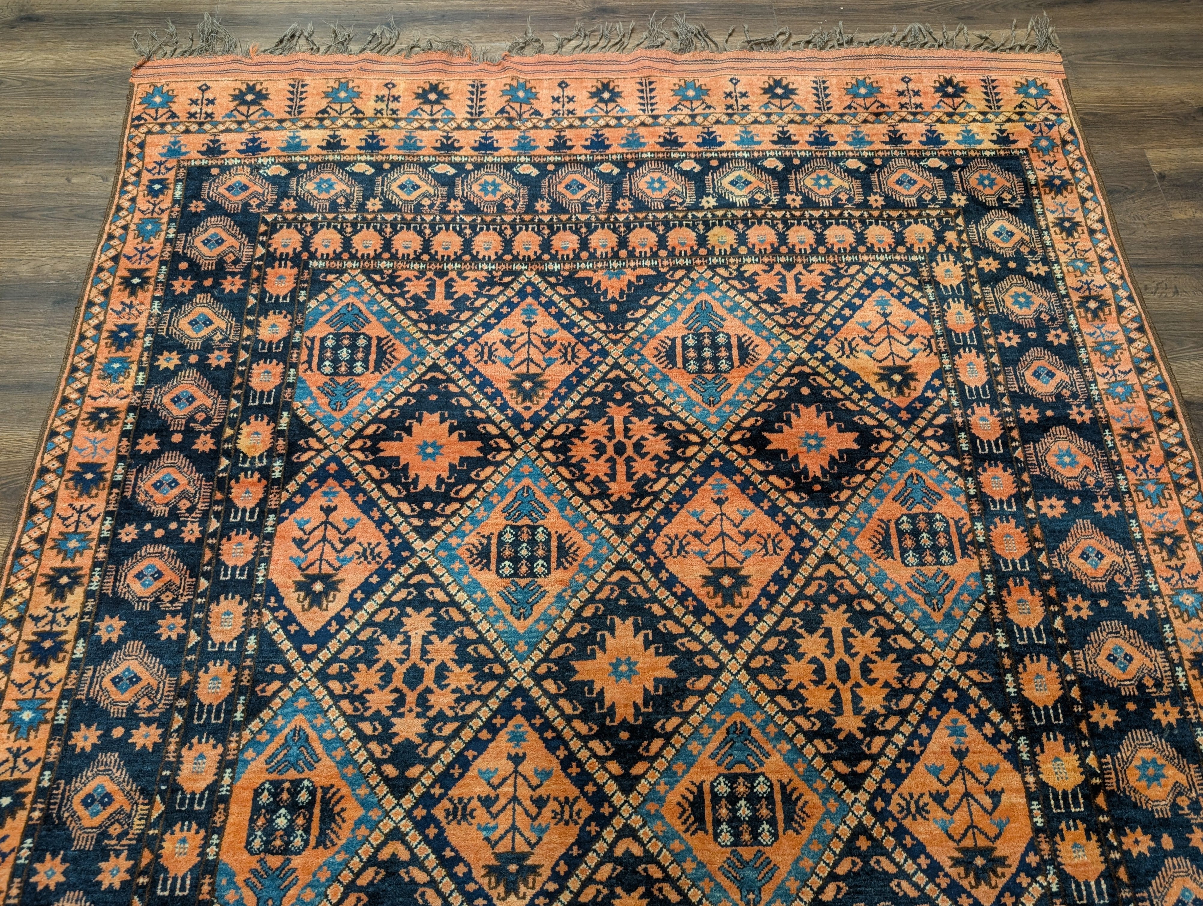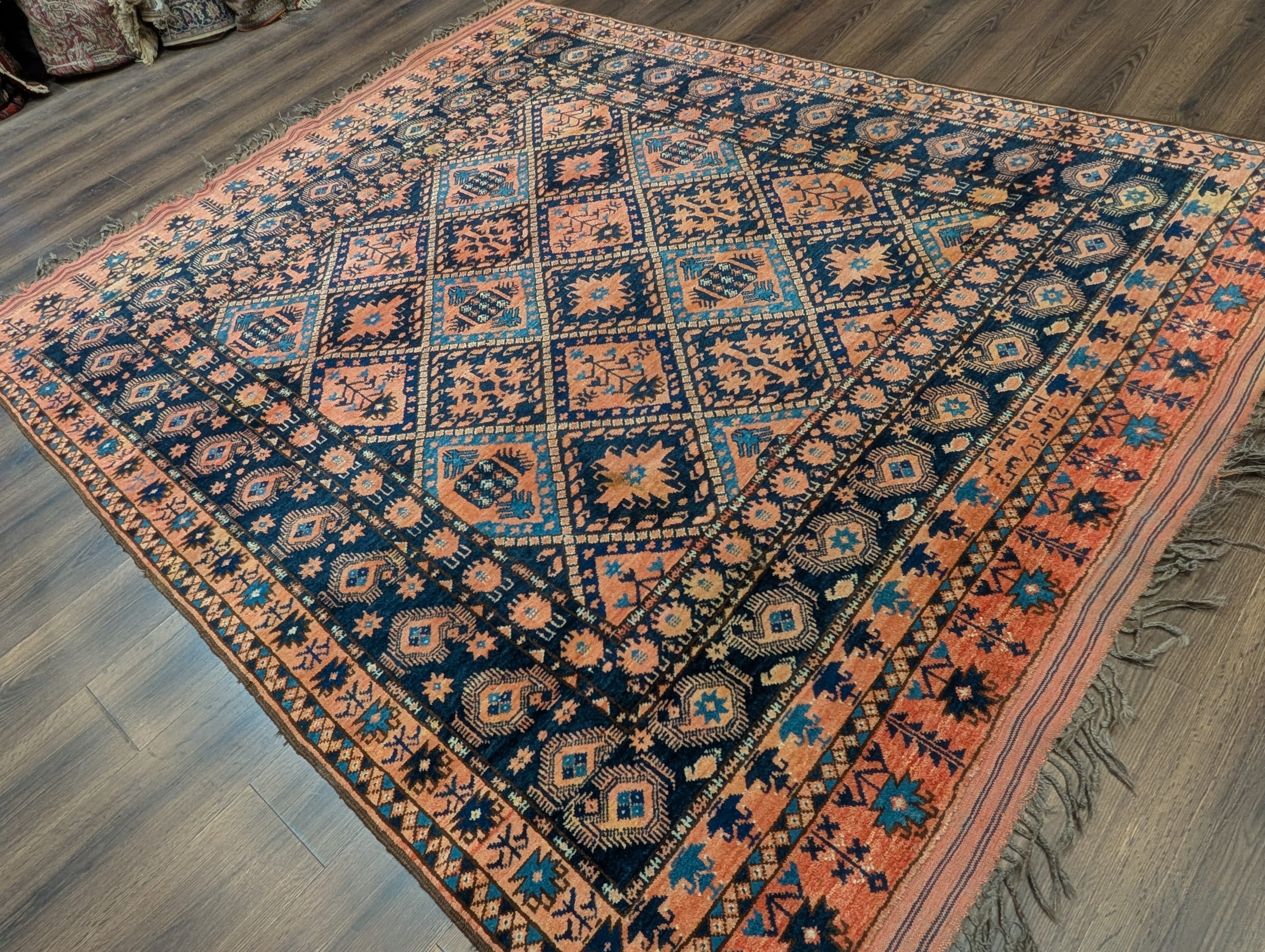 Afghan Beshir Rug 7x8, Diamond Panel, Navy Blue and Coral, Wool, Tribal