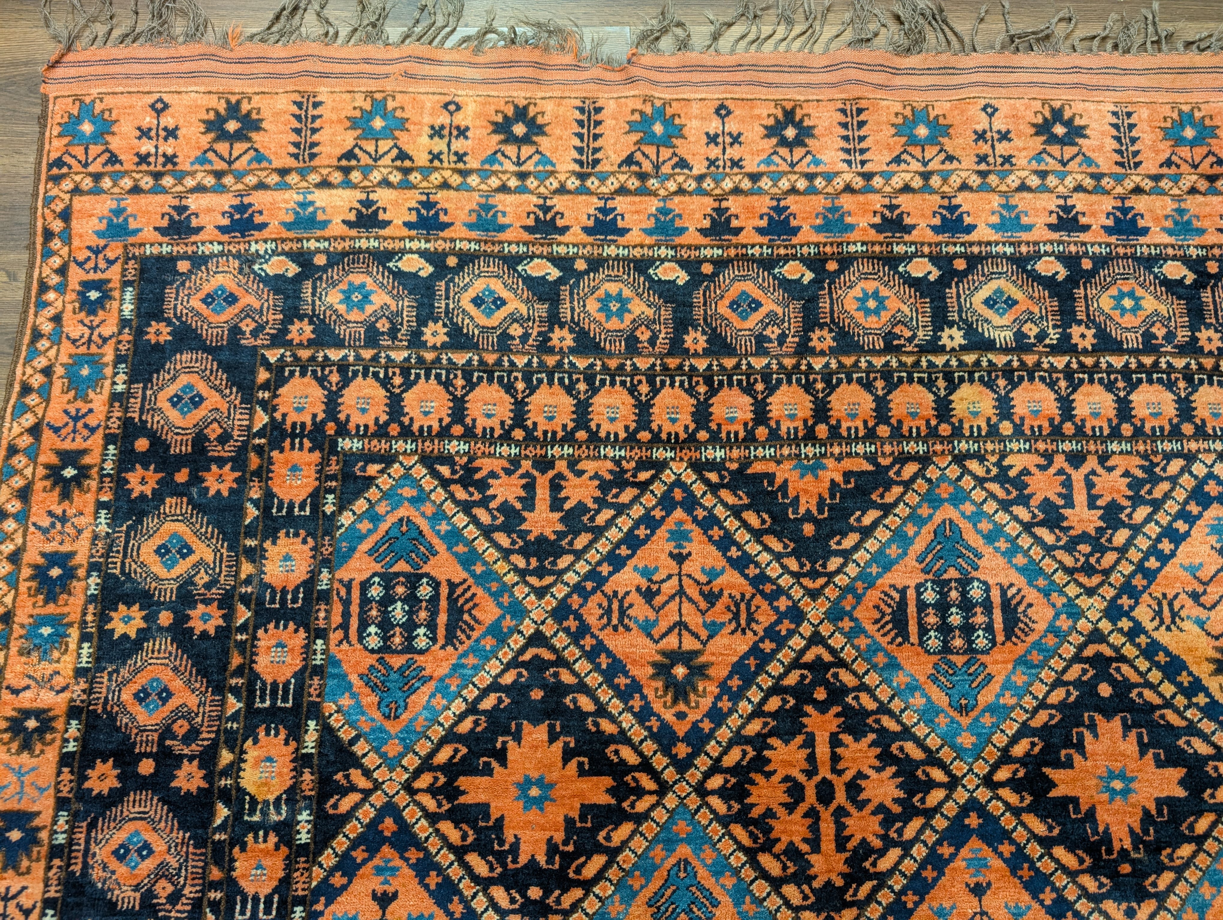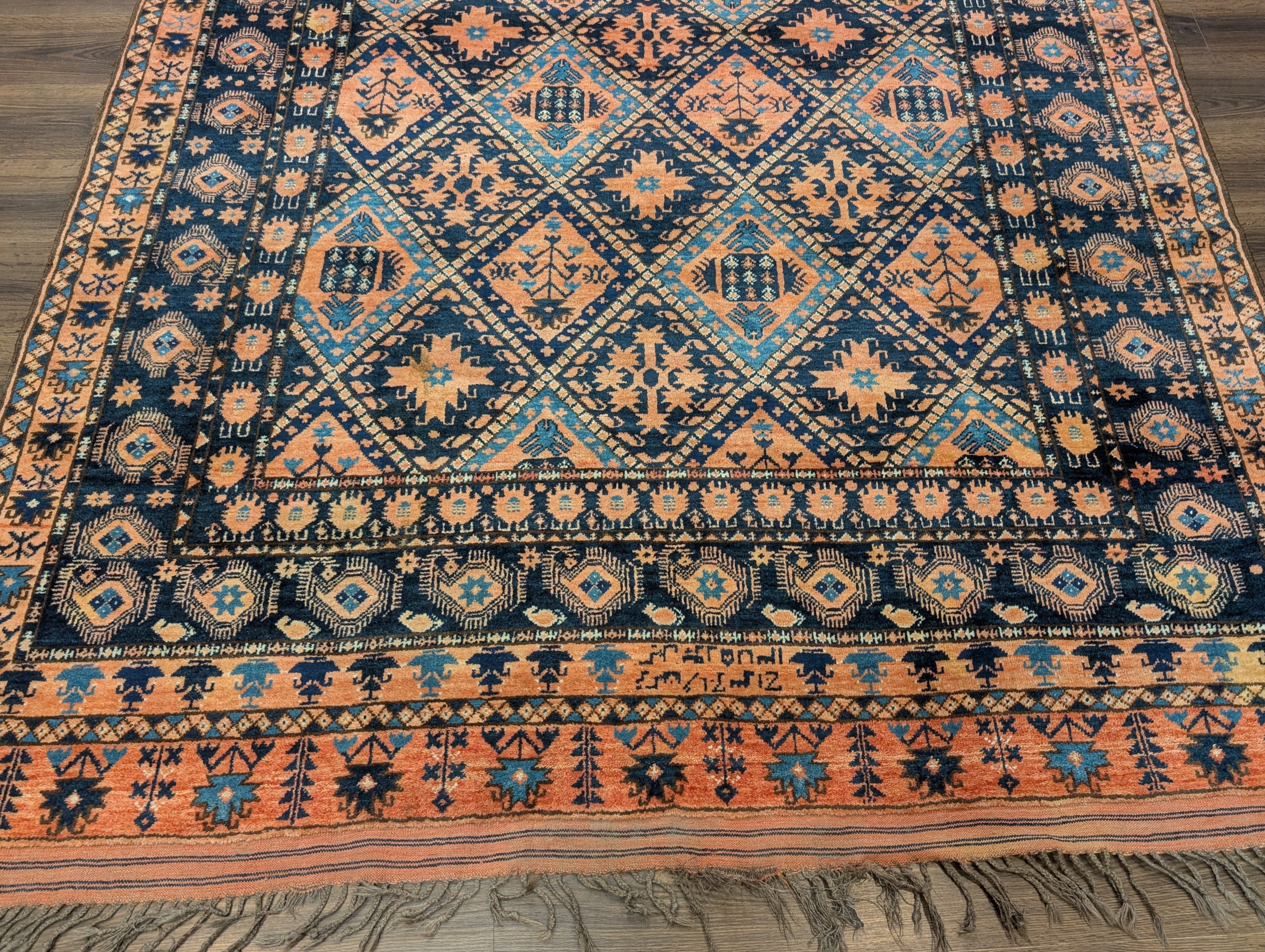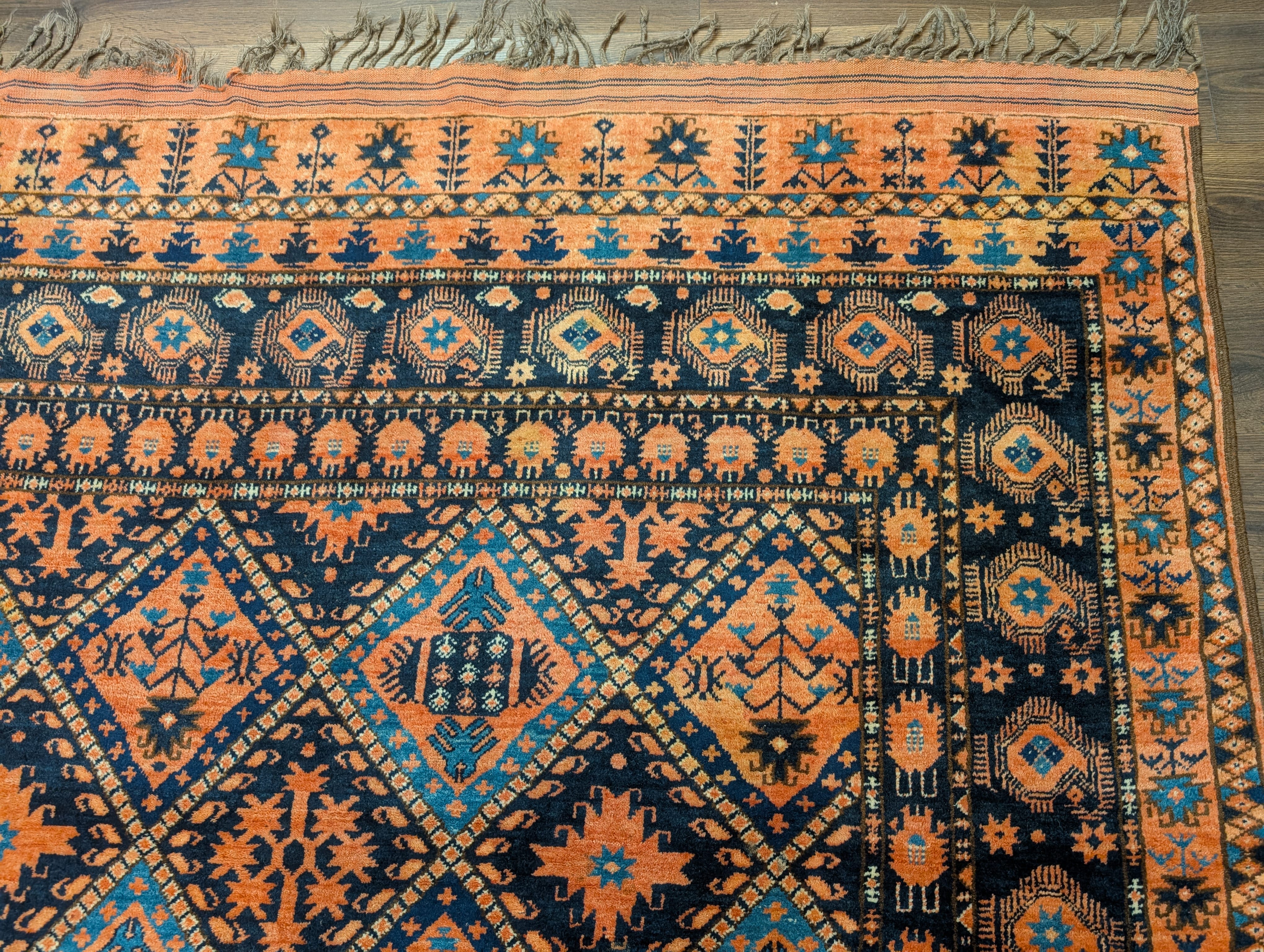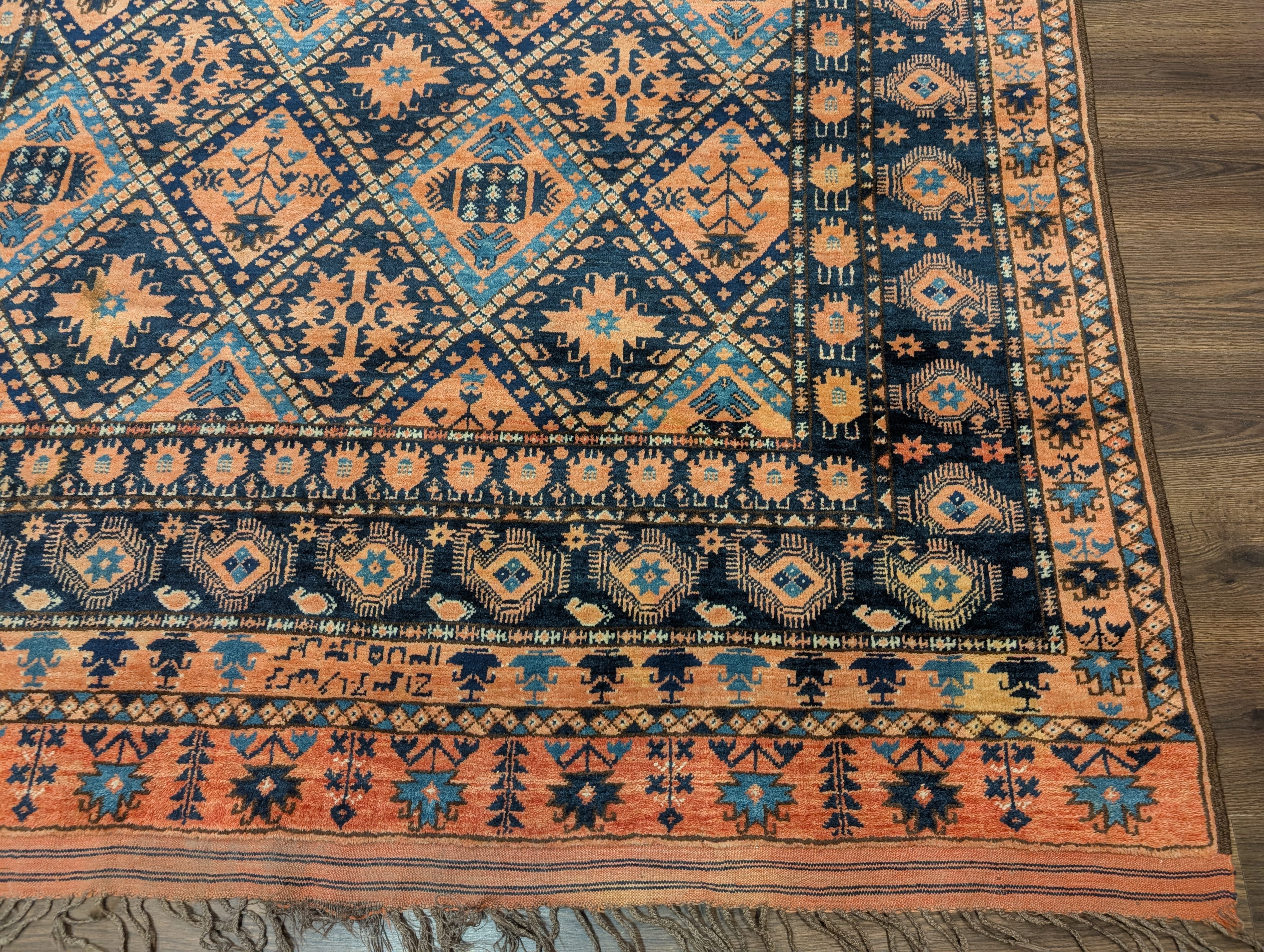 Afghan Beshir Rug 7x8, Diamond Panel, Navy Blue and Coral, Wool, Tribal