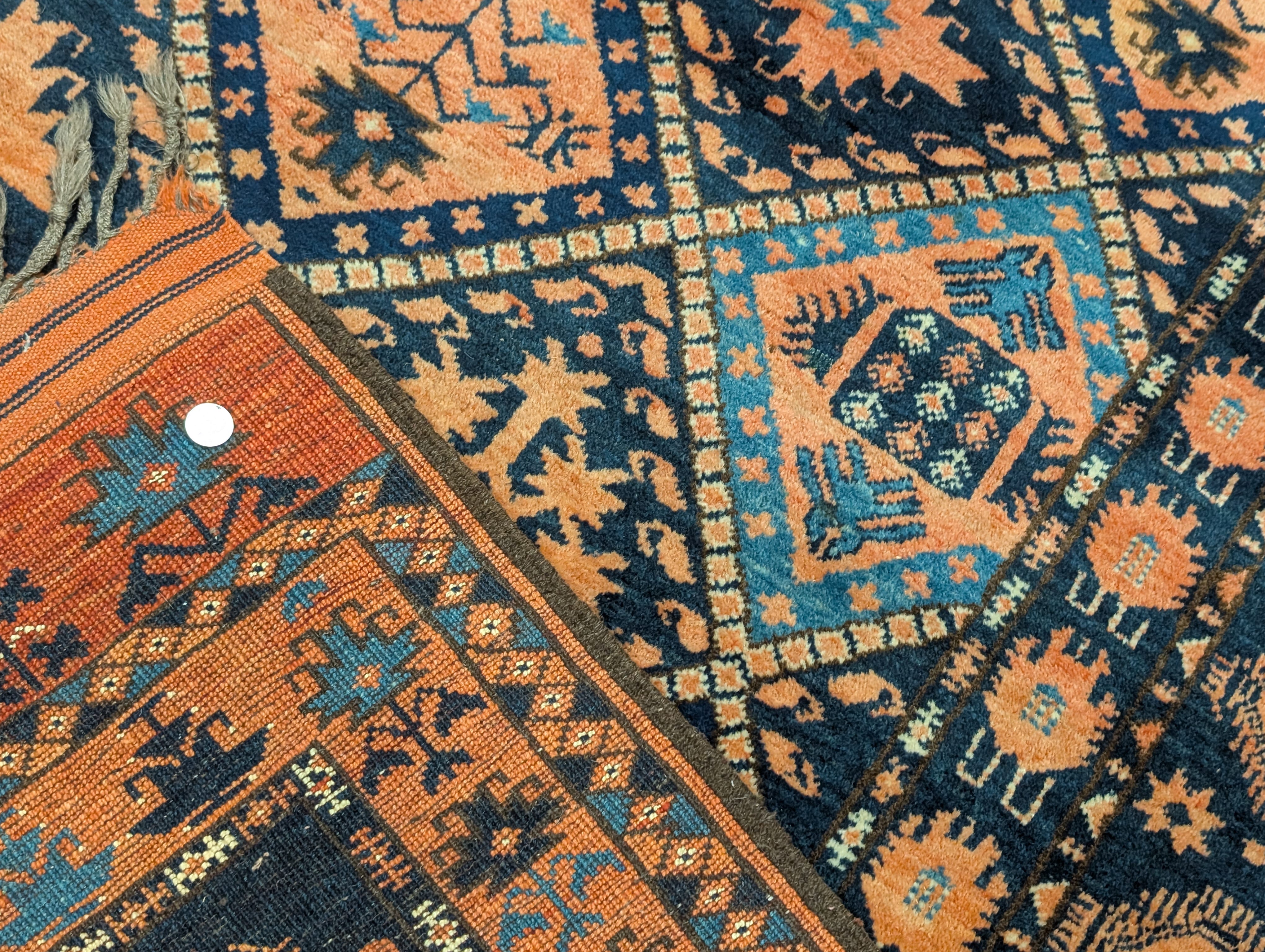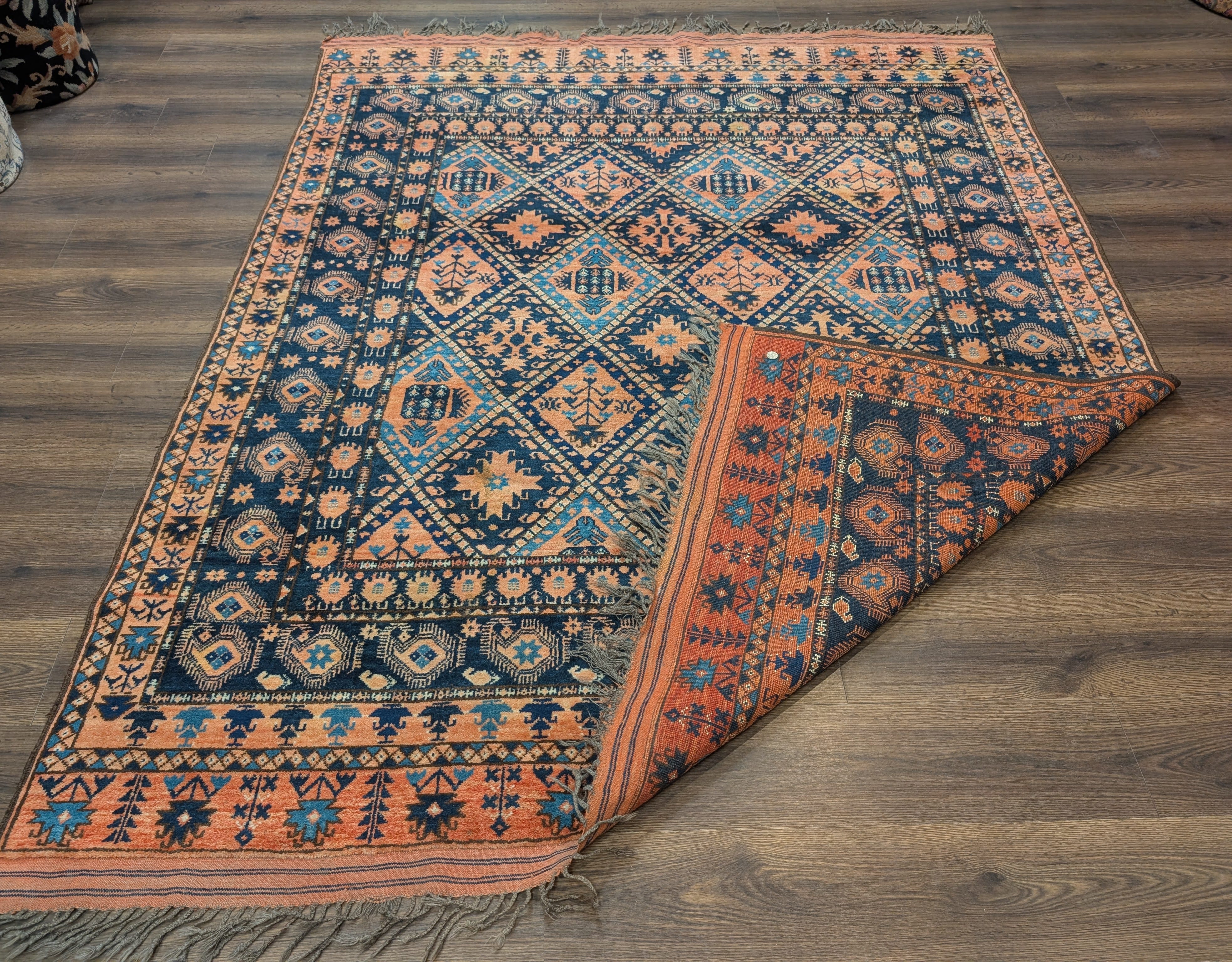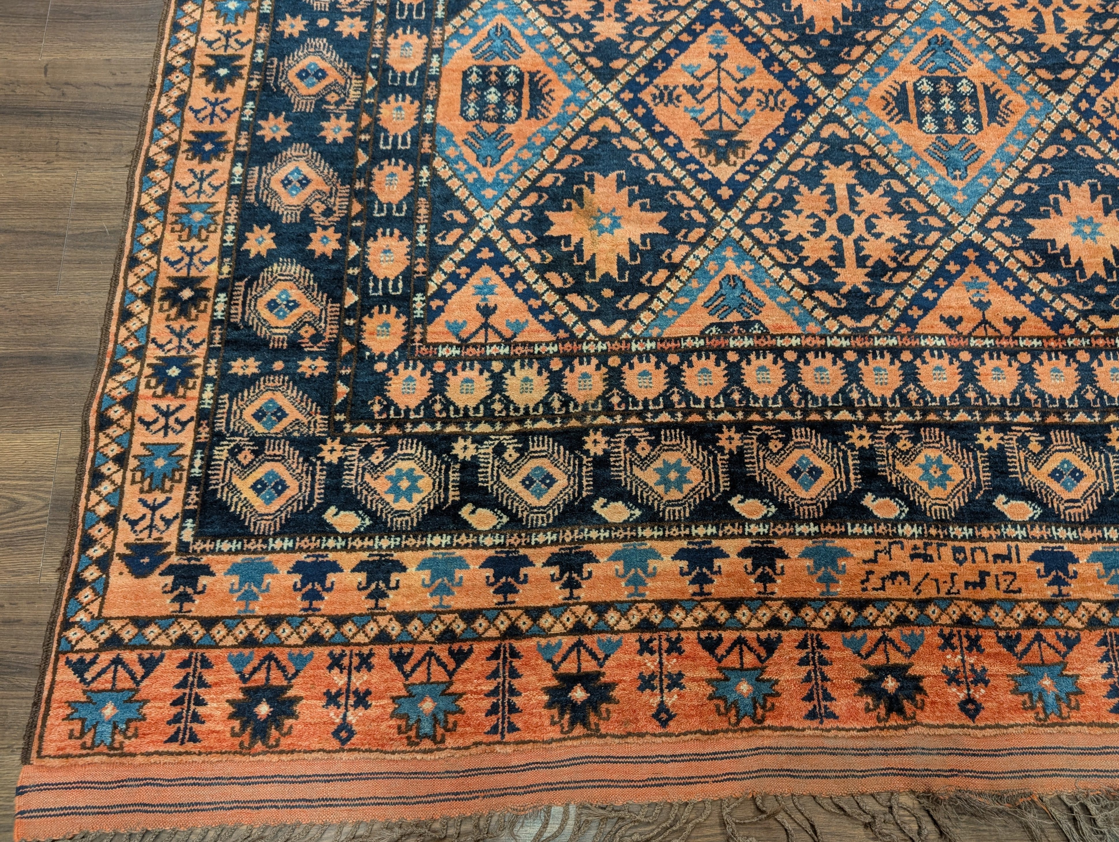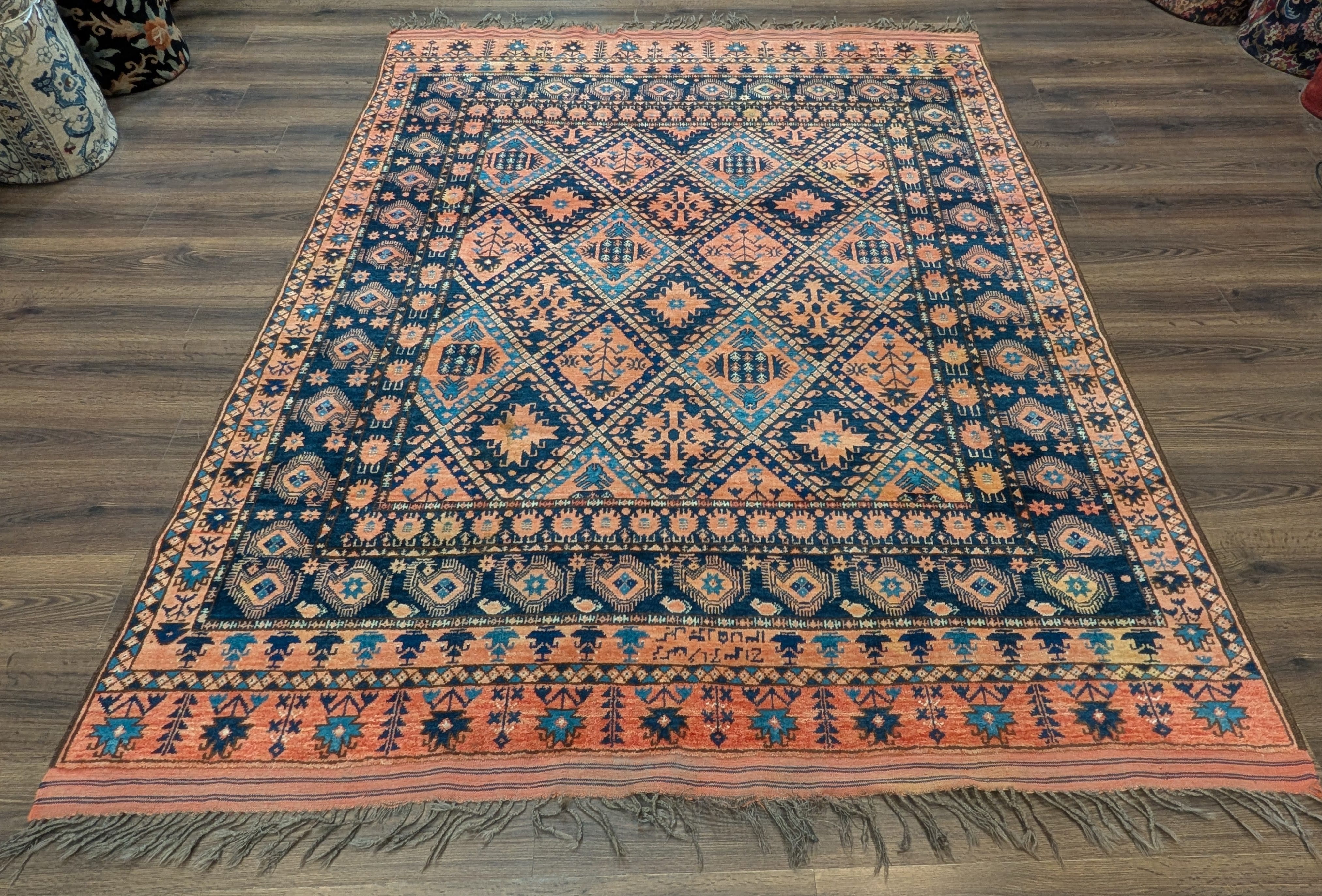 Afghan Beshir Rug 7x8, Diamond Panel, Navy Blue and Coral, Wool, Tribal