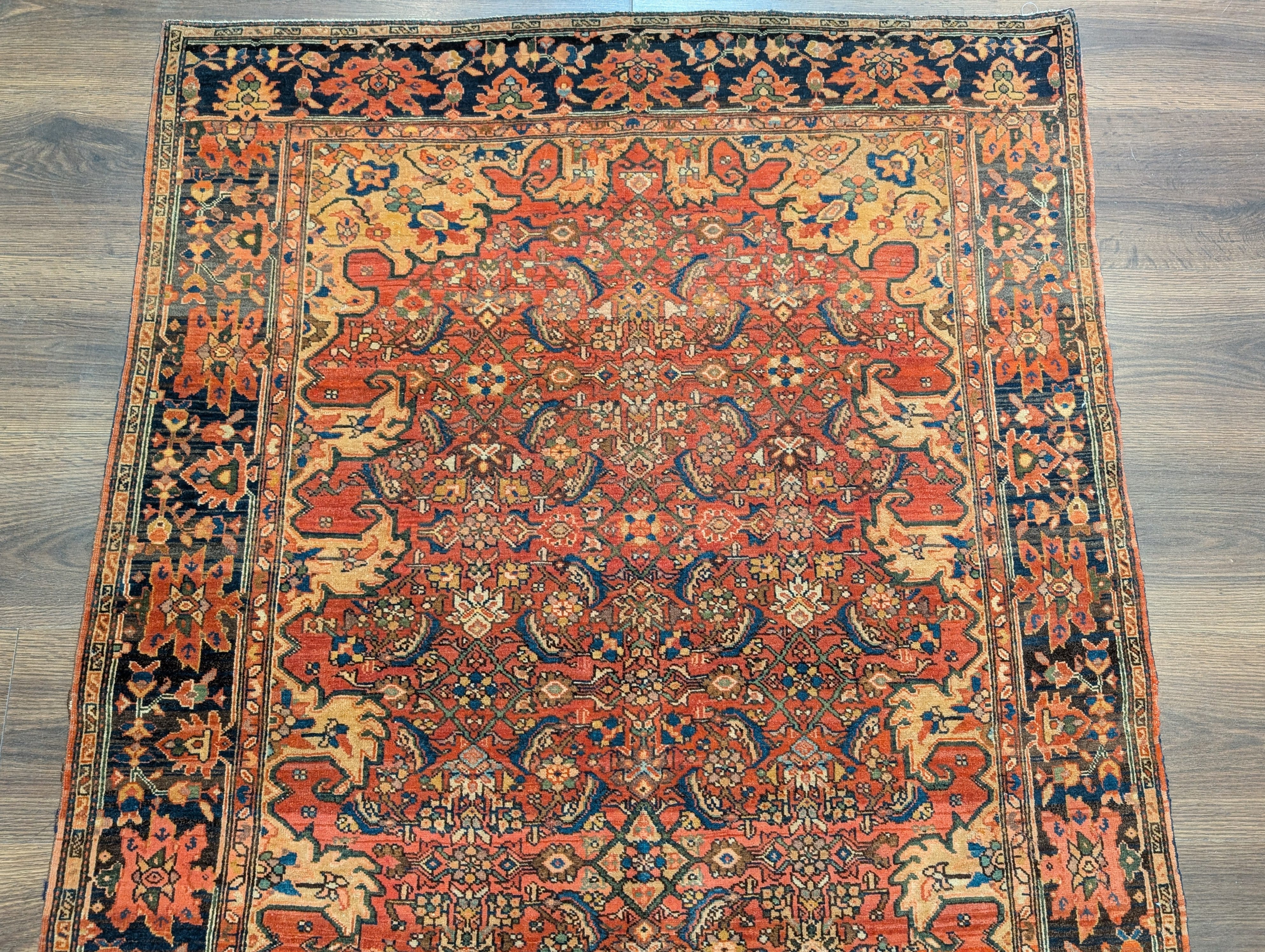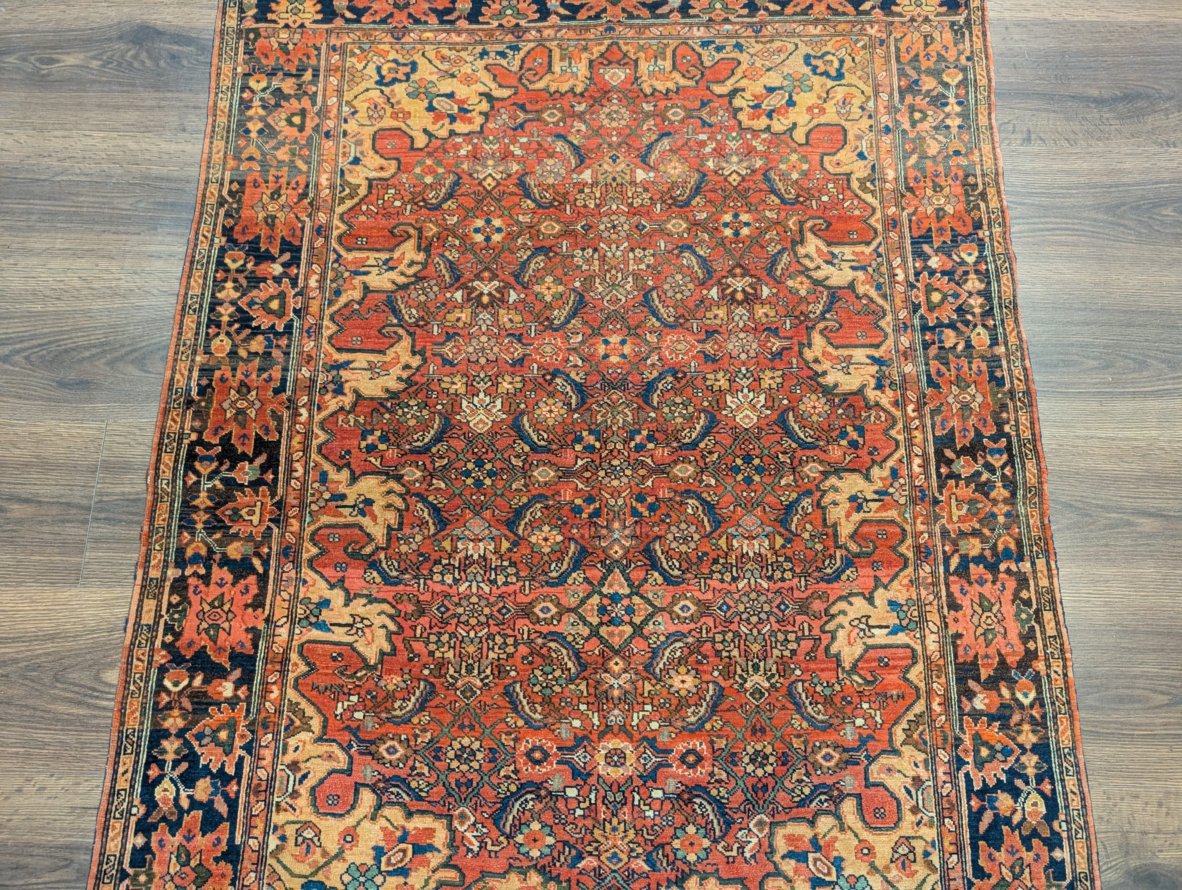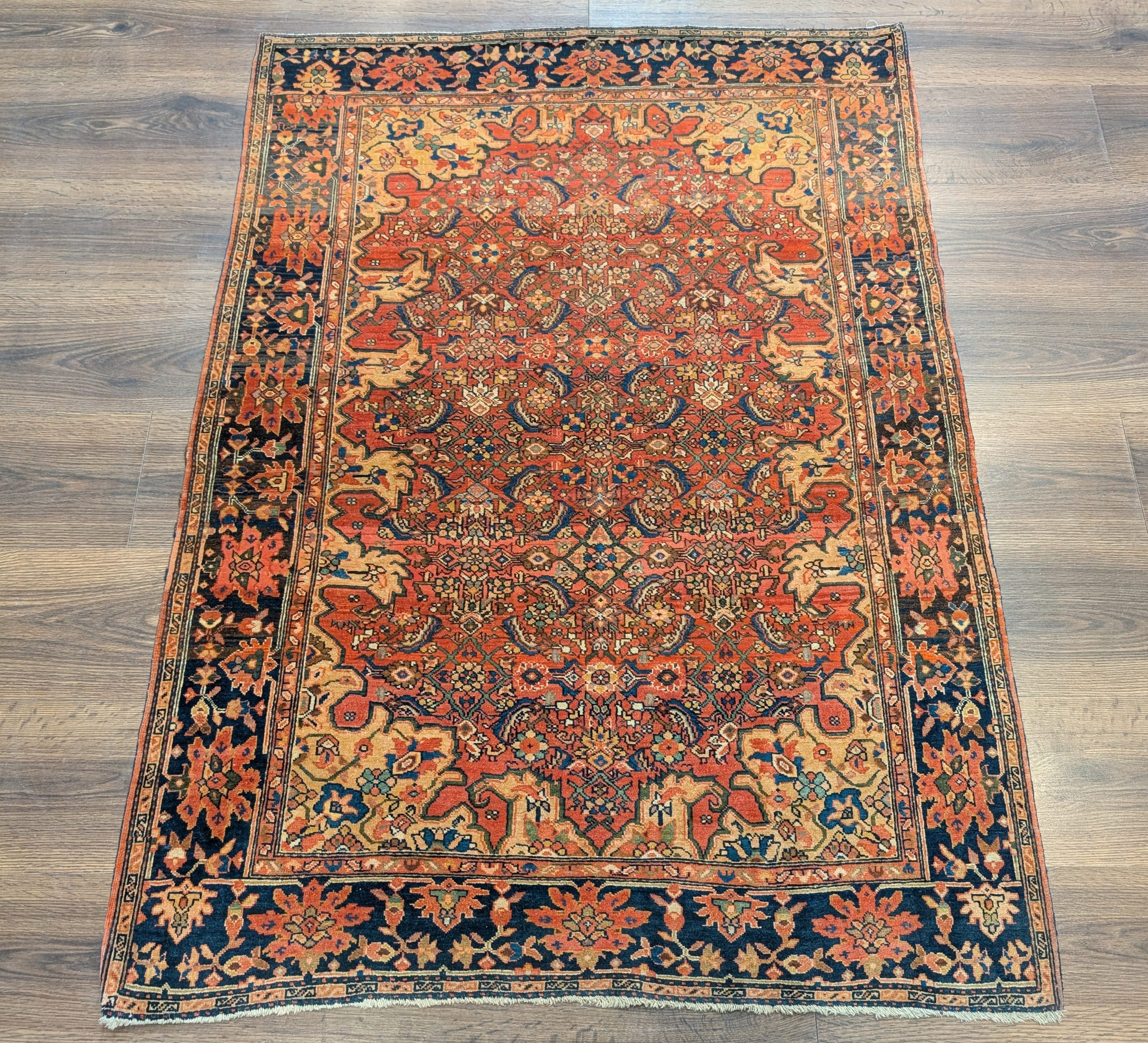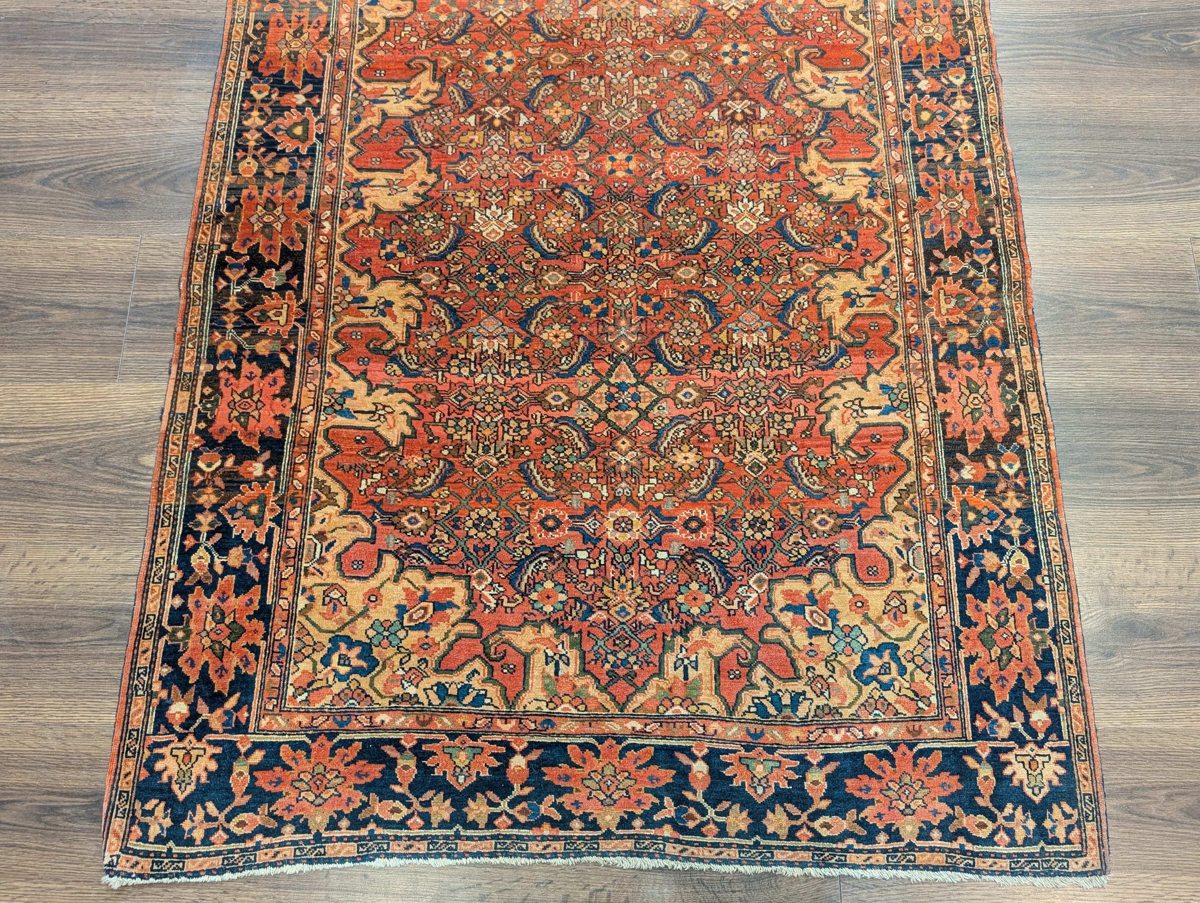 Antique Persian Farahan Sarouk Rug 3x5, Terracotta and Navy Blue, Collectible Rare