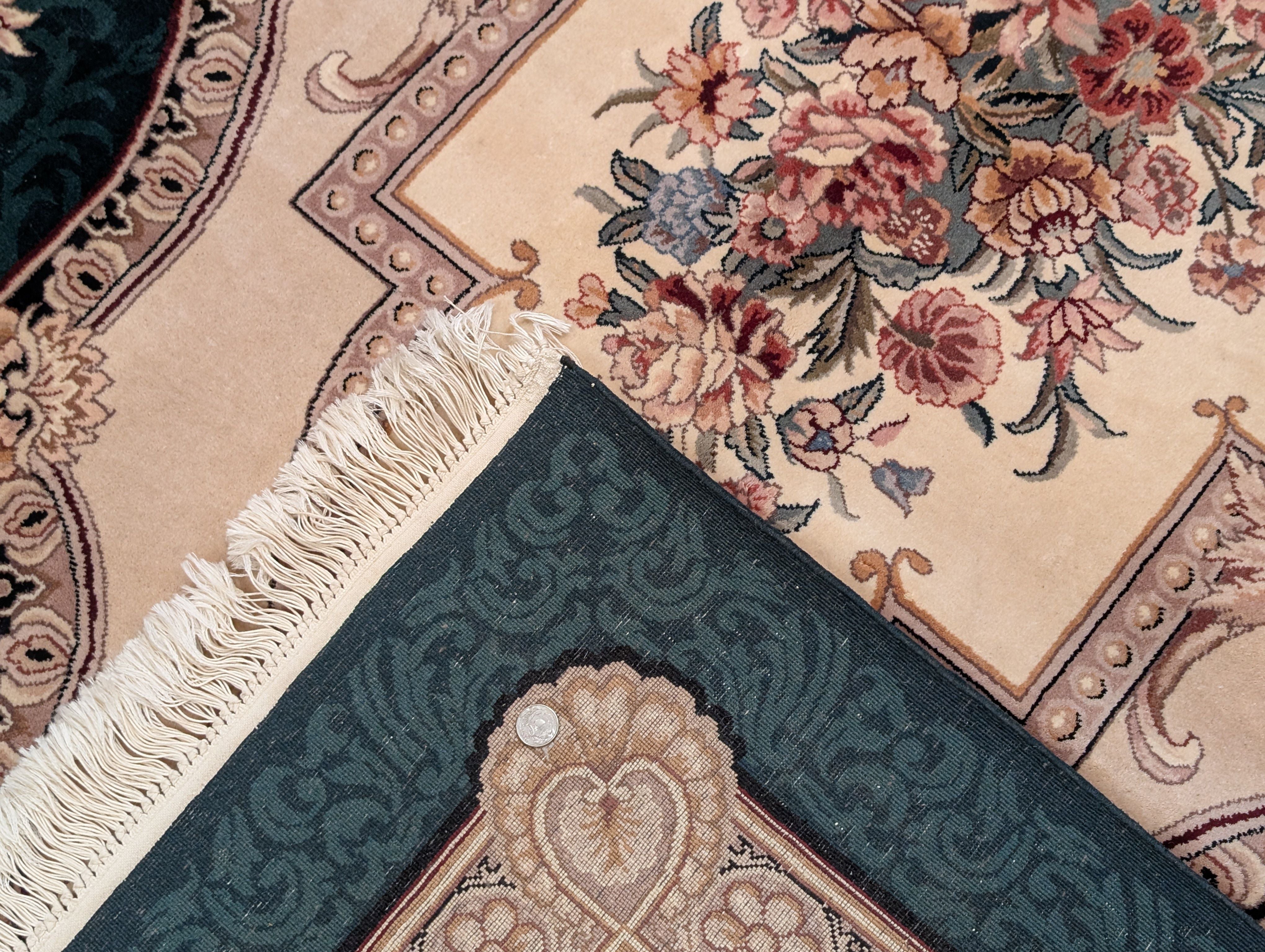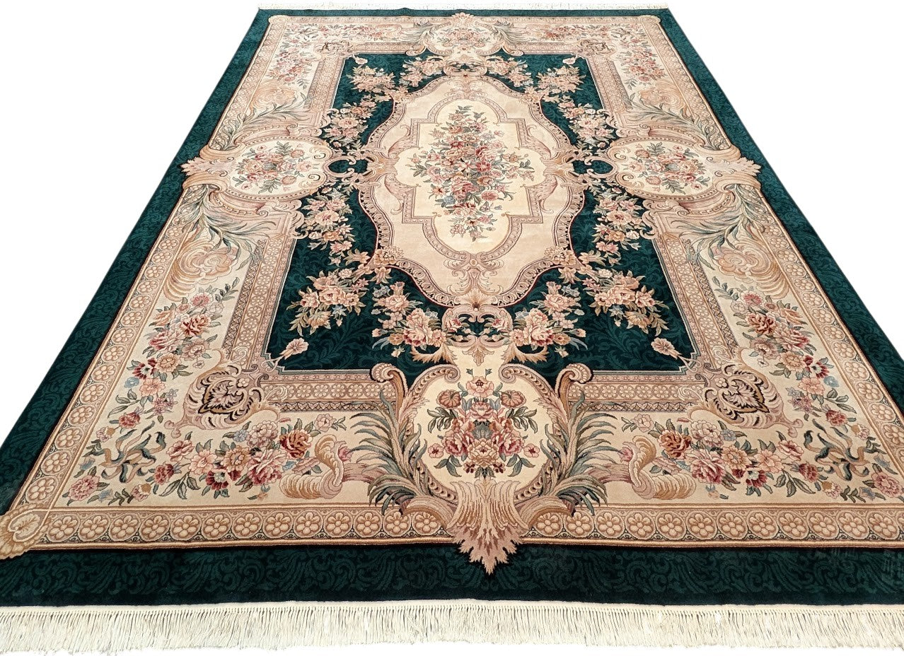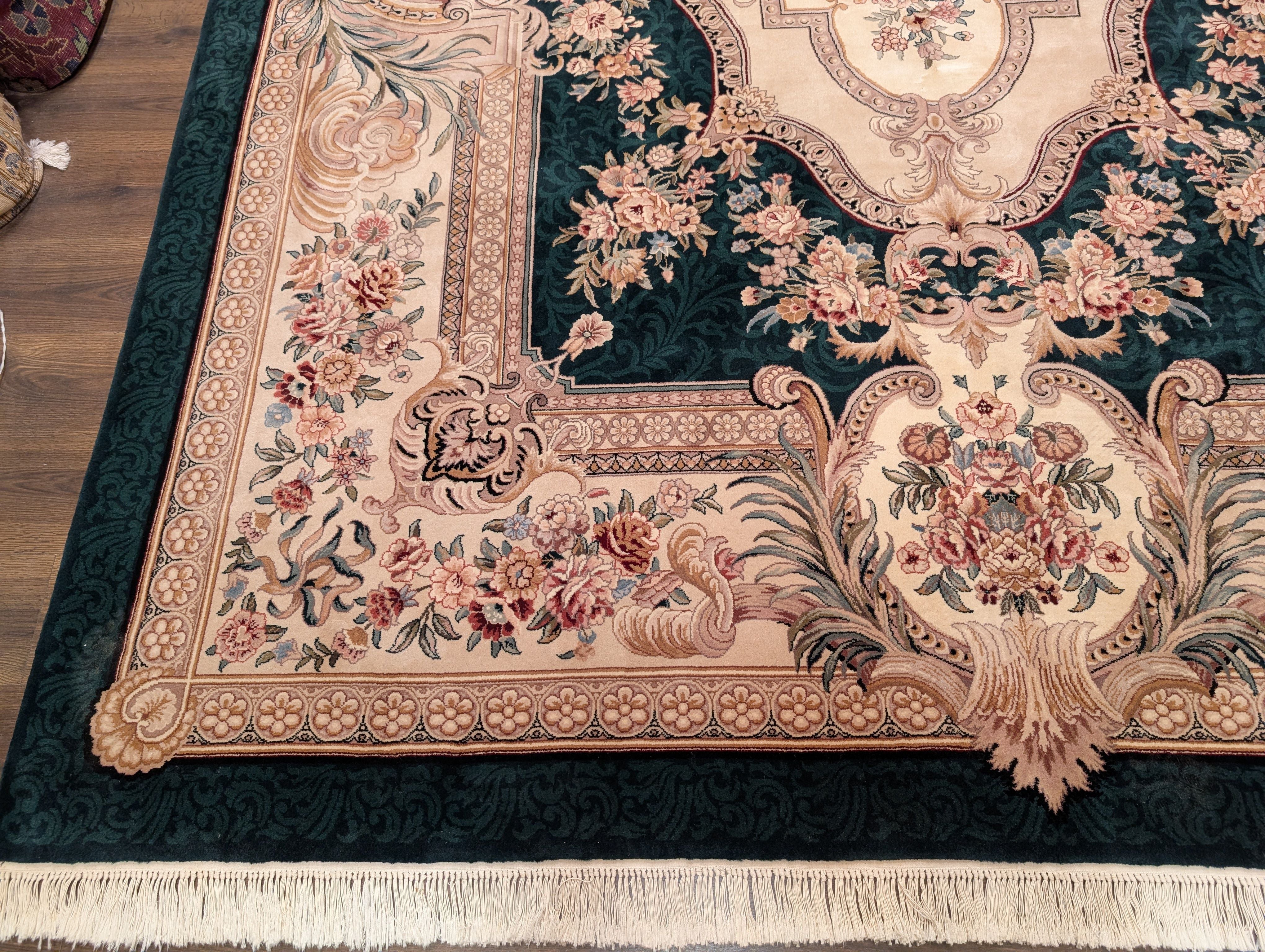 Aubusson Rug 9x12, Very Fine 200 KPSI, European French Savonnerie Design, Wool, Dark Green
