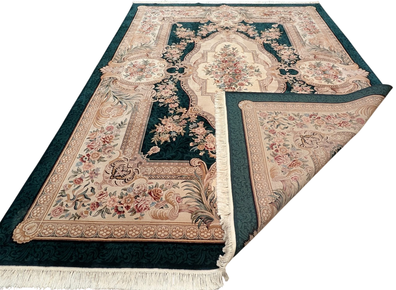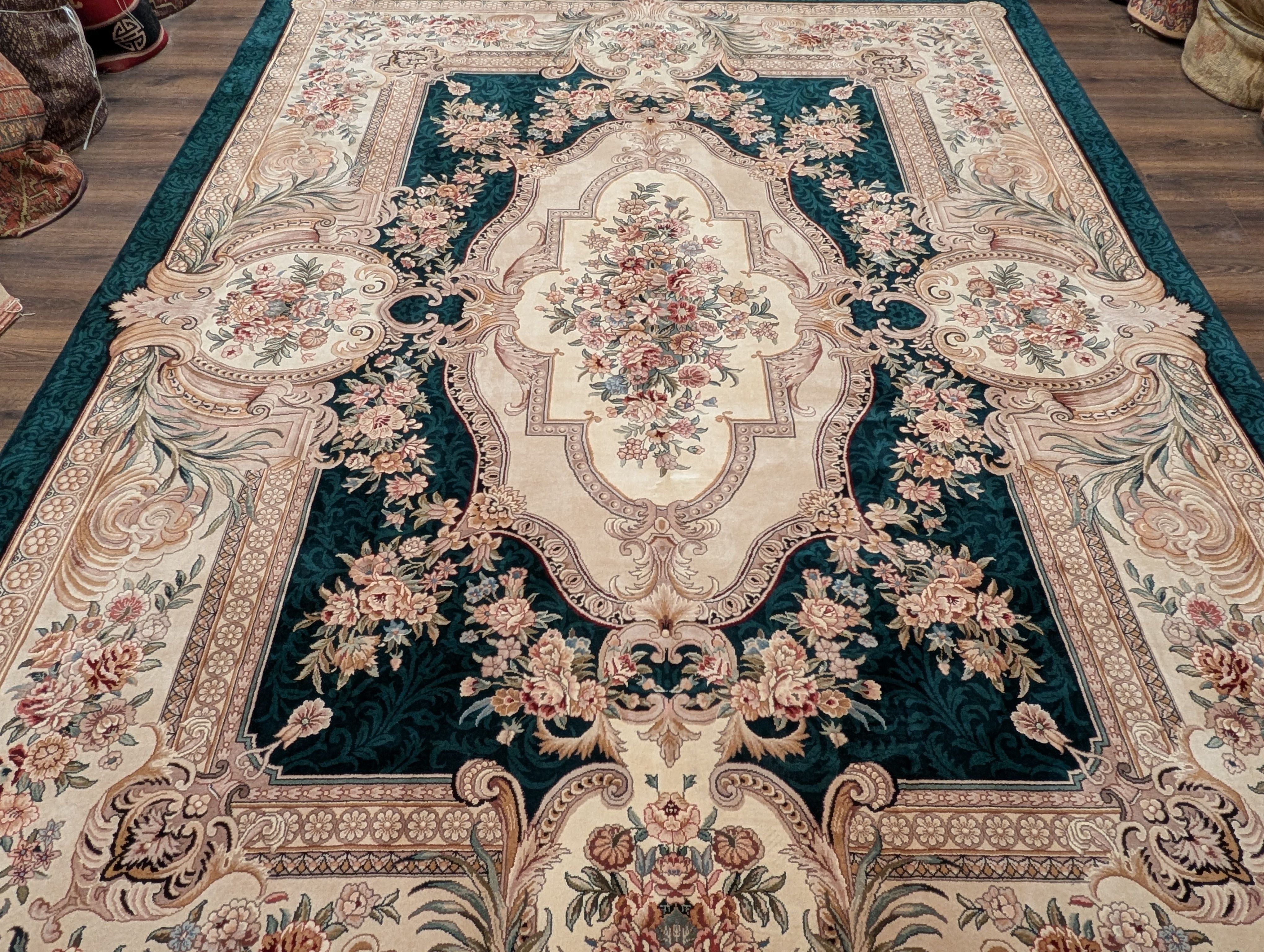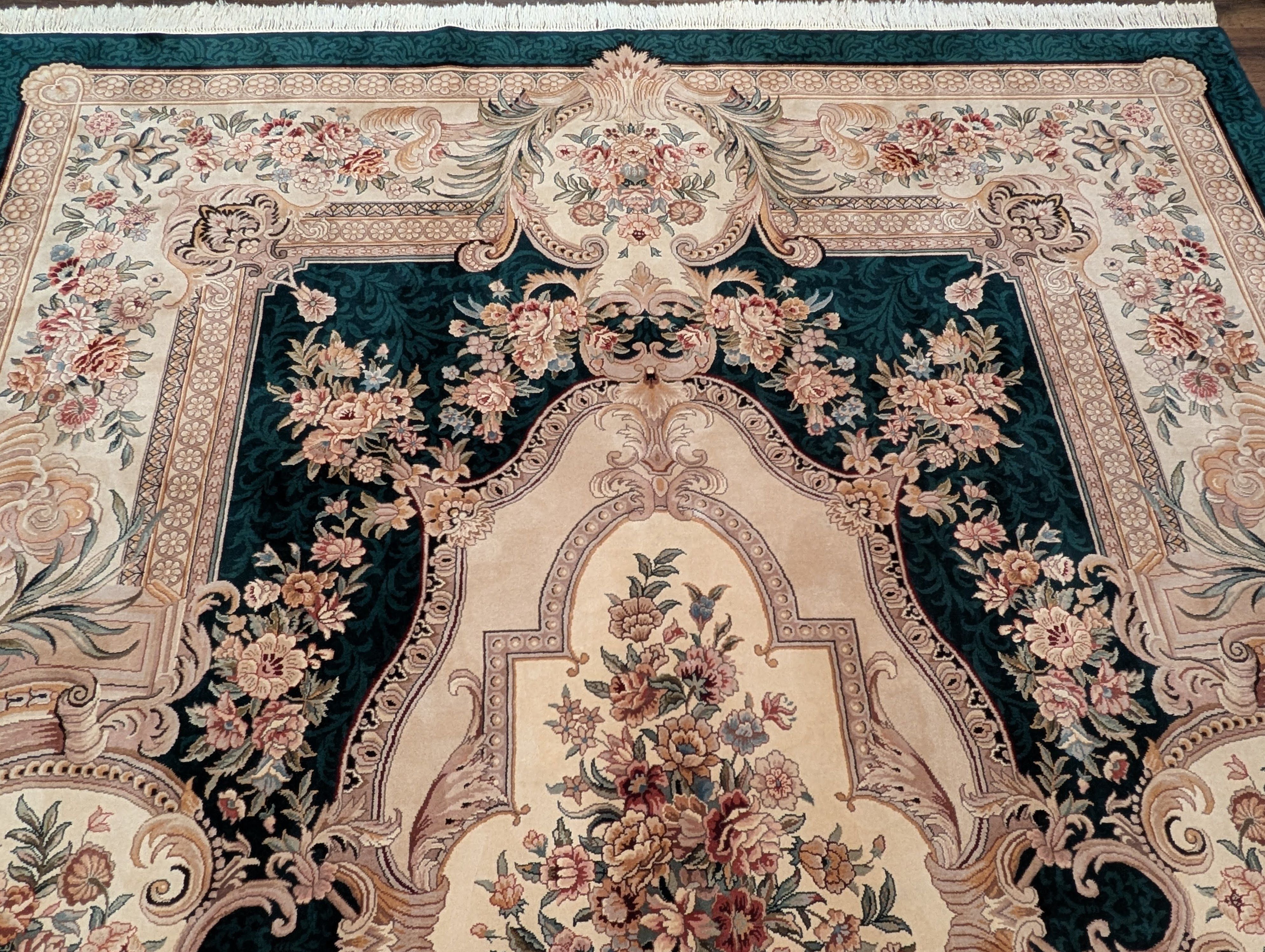Aubusson Rug 9x12, Very Fine 200 KPSI, European French Savonnerie Design, Wool, Dark Green
