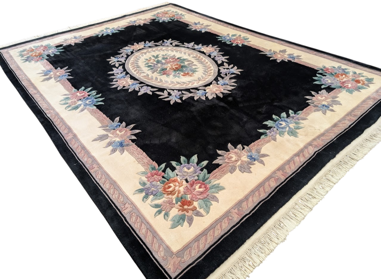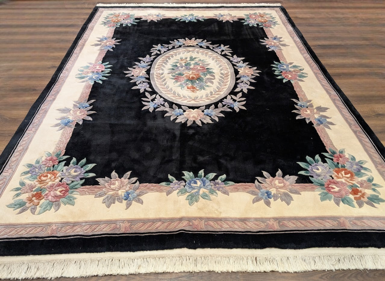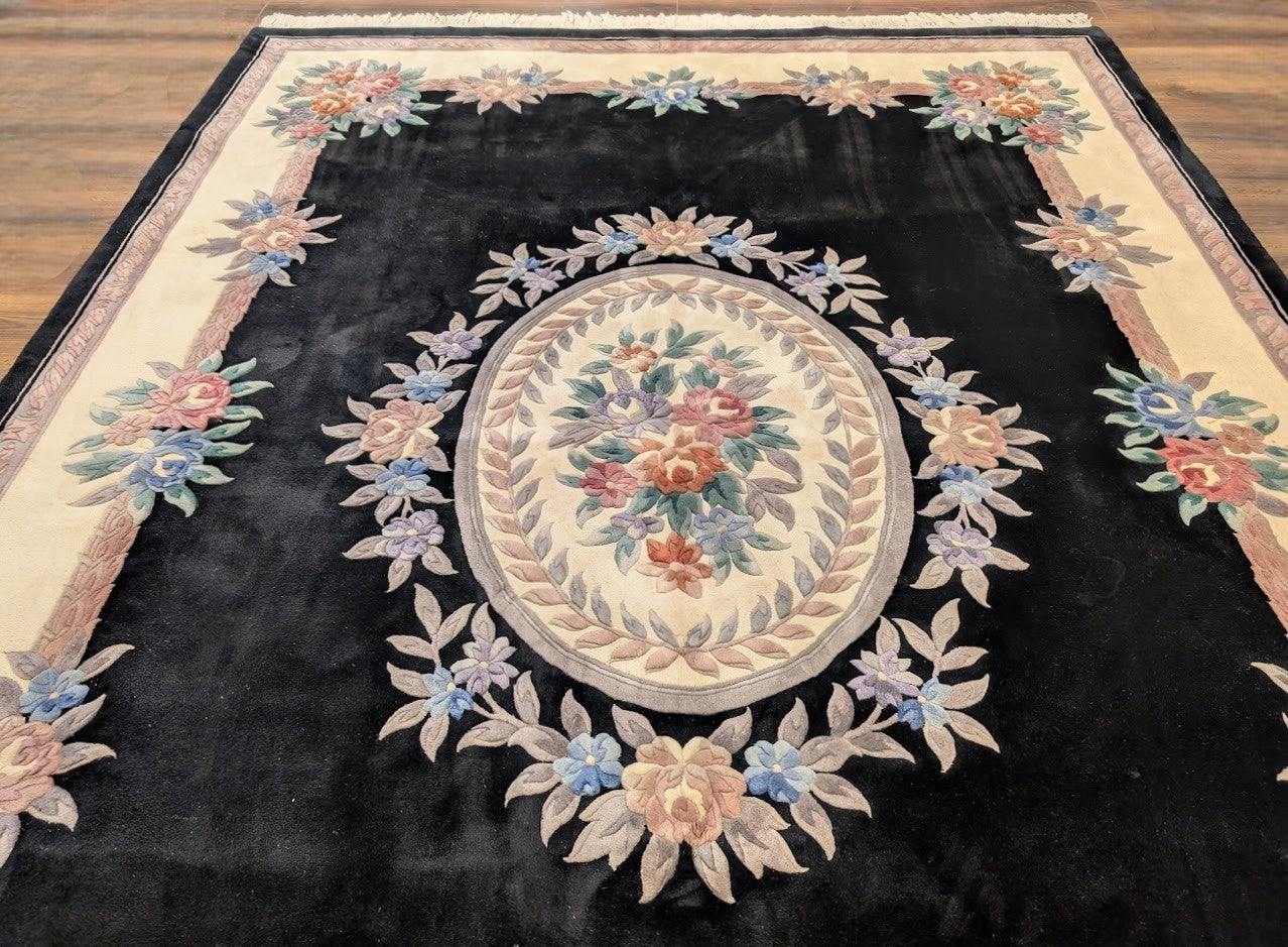 Black Chinese Wool Rug 8x11, Chinese Aubusson Carving Sculpted Rug