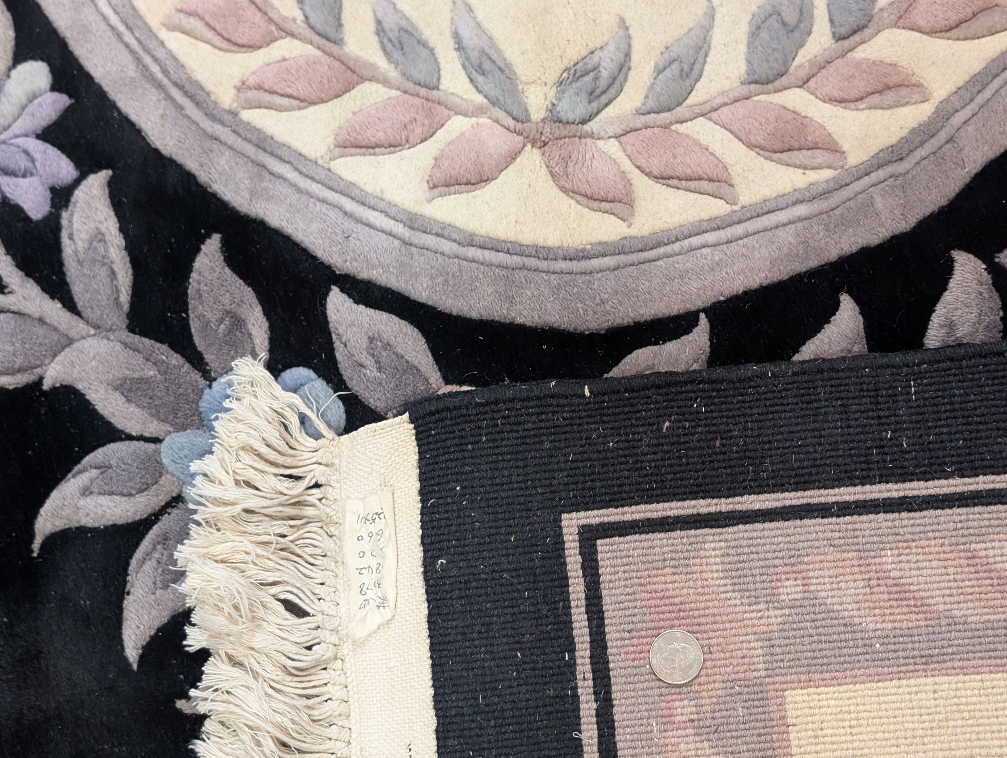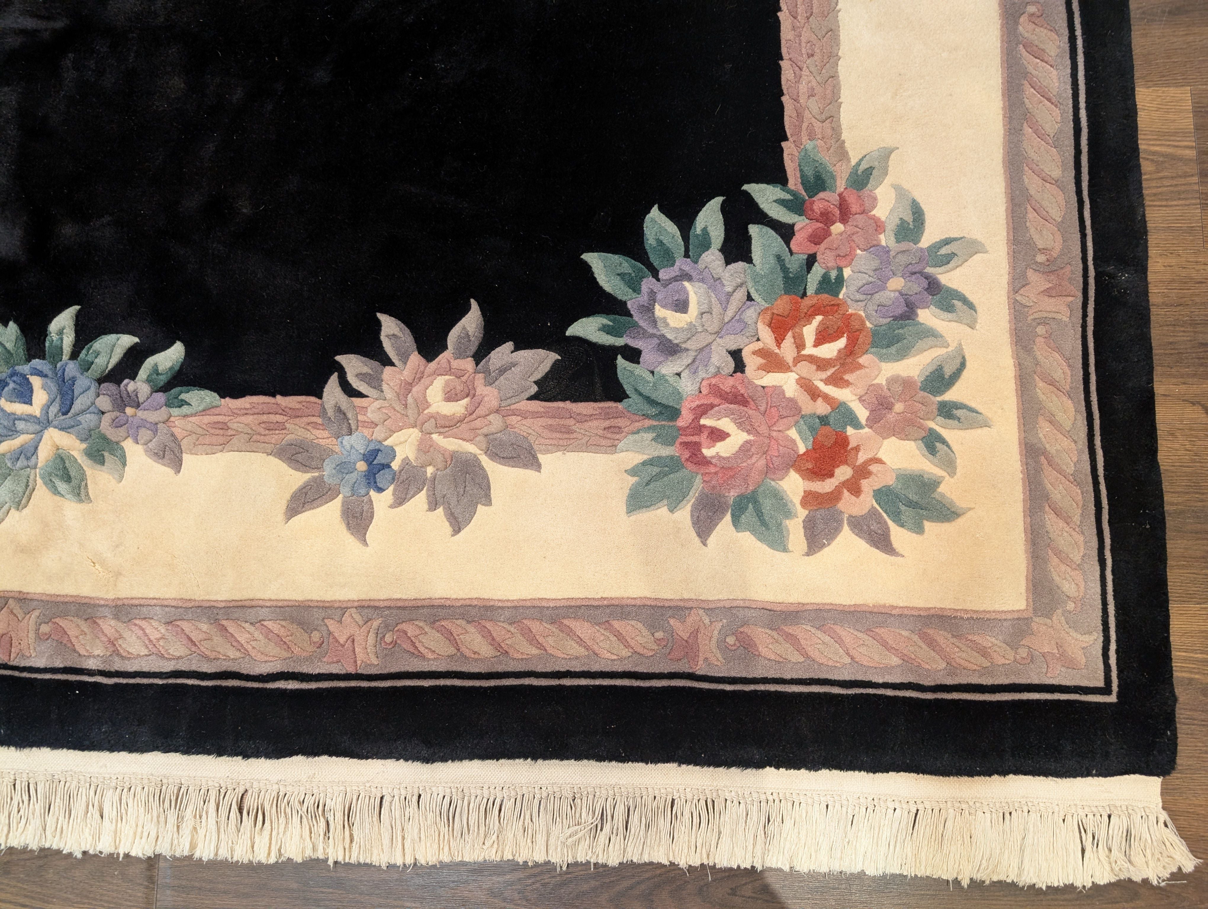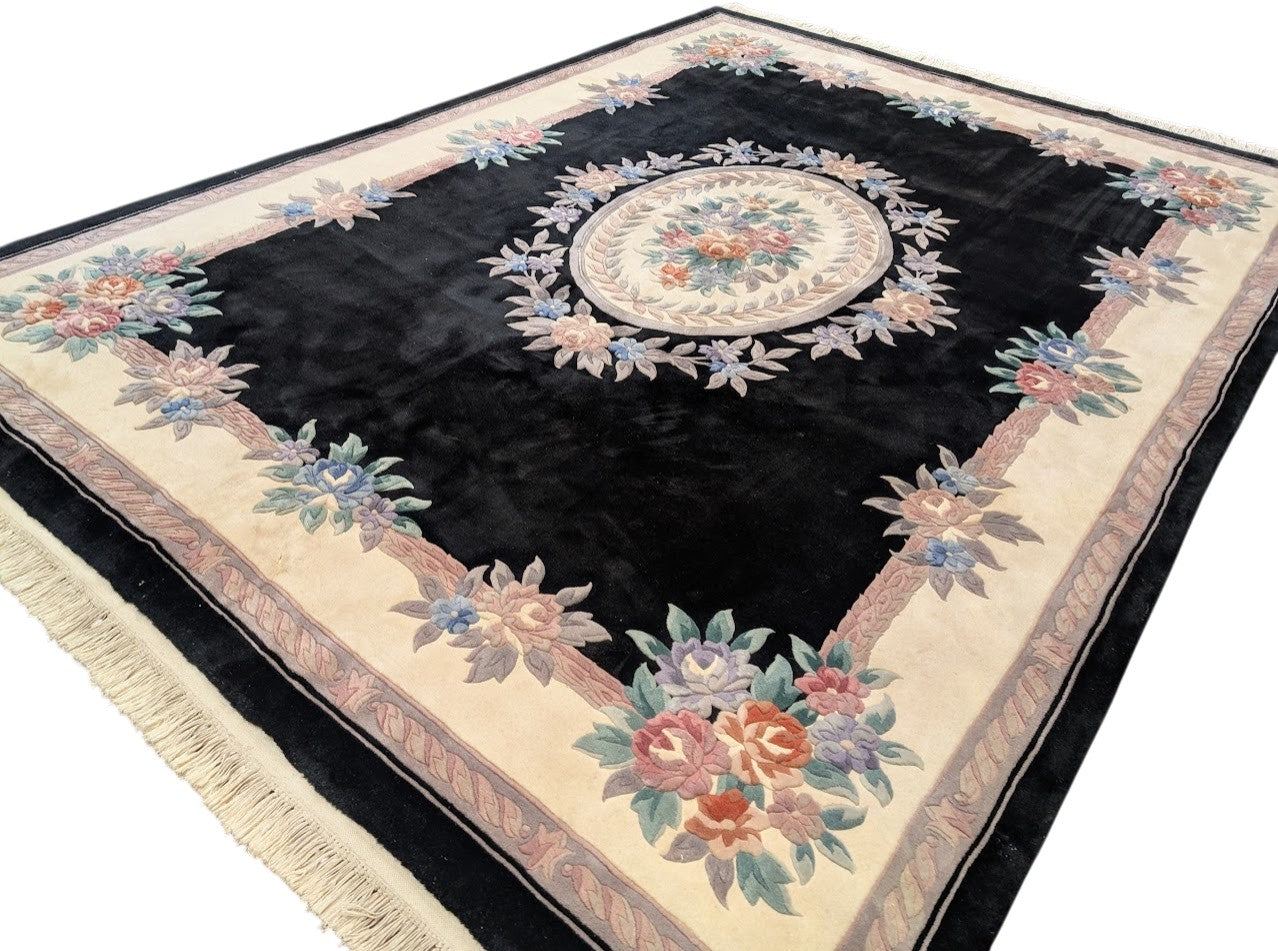Black Chinese Wool Rug 8x11, Chinese Aubusson Carving Sculpted Rug