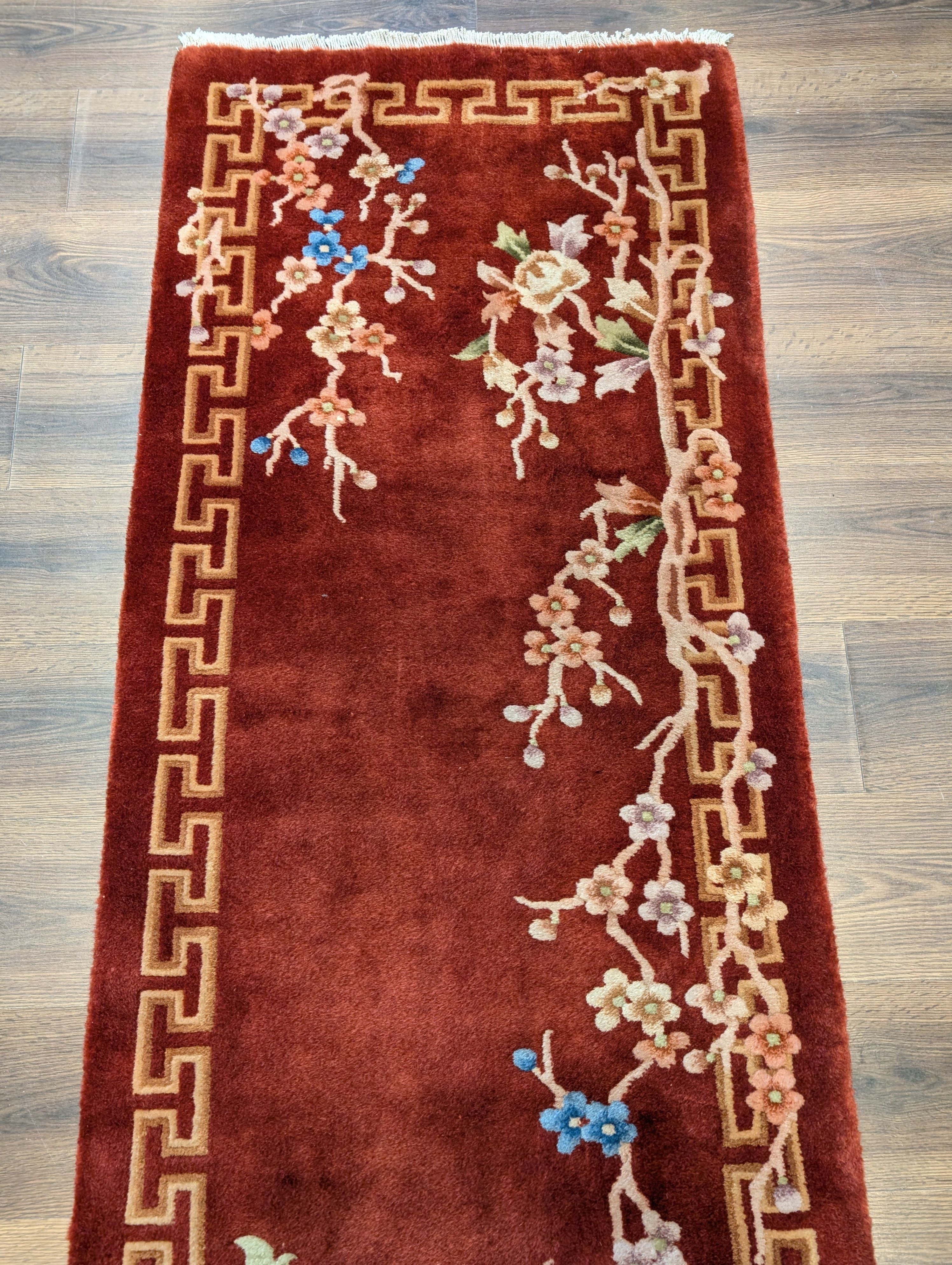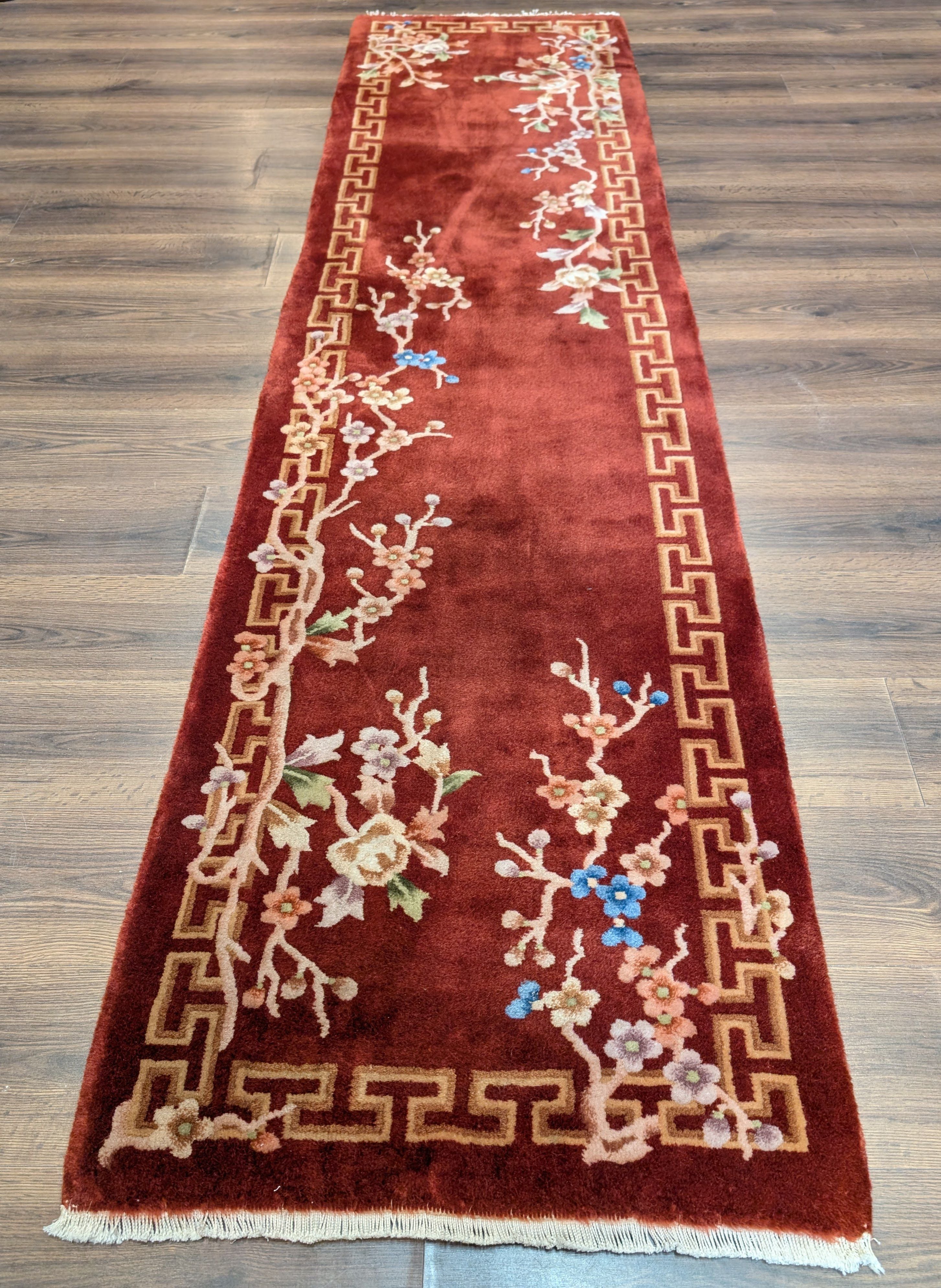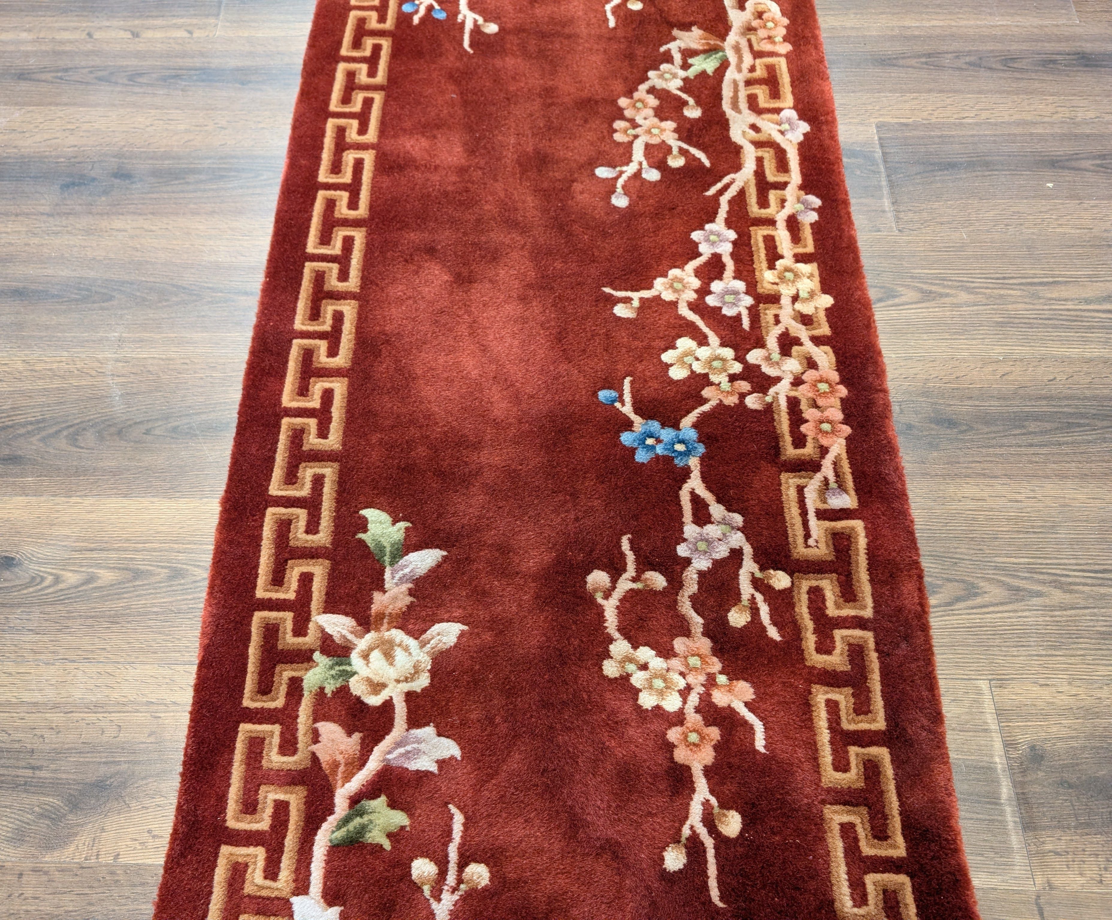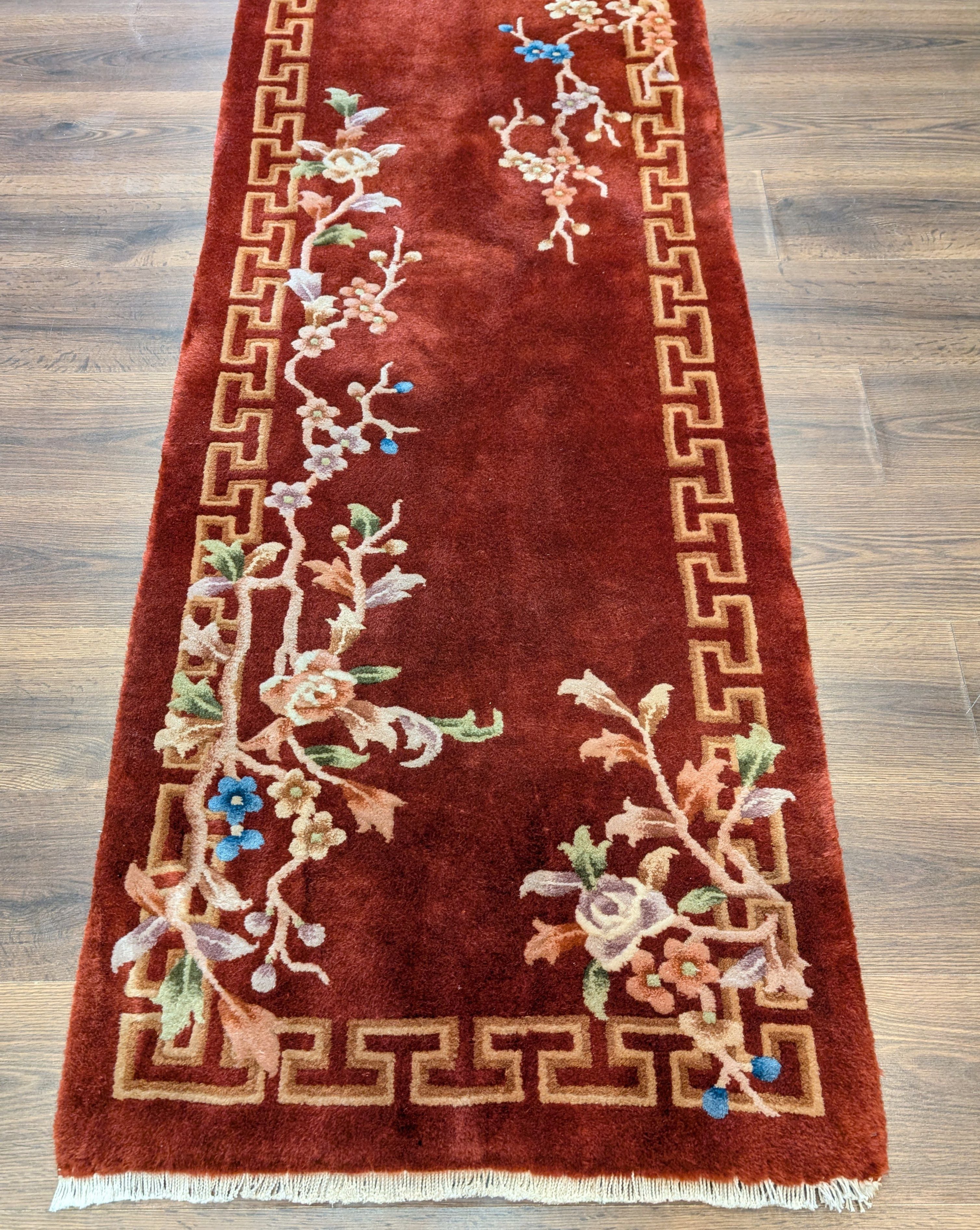 Chinese Nichols Runner Rug 2.6 x 9.5, Rust Red, Floral, Art Deco Wool Runner, Rare