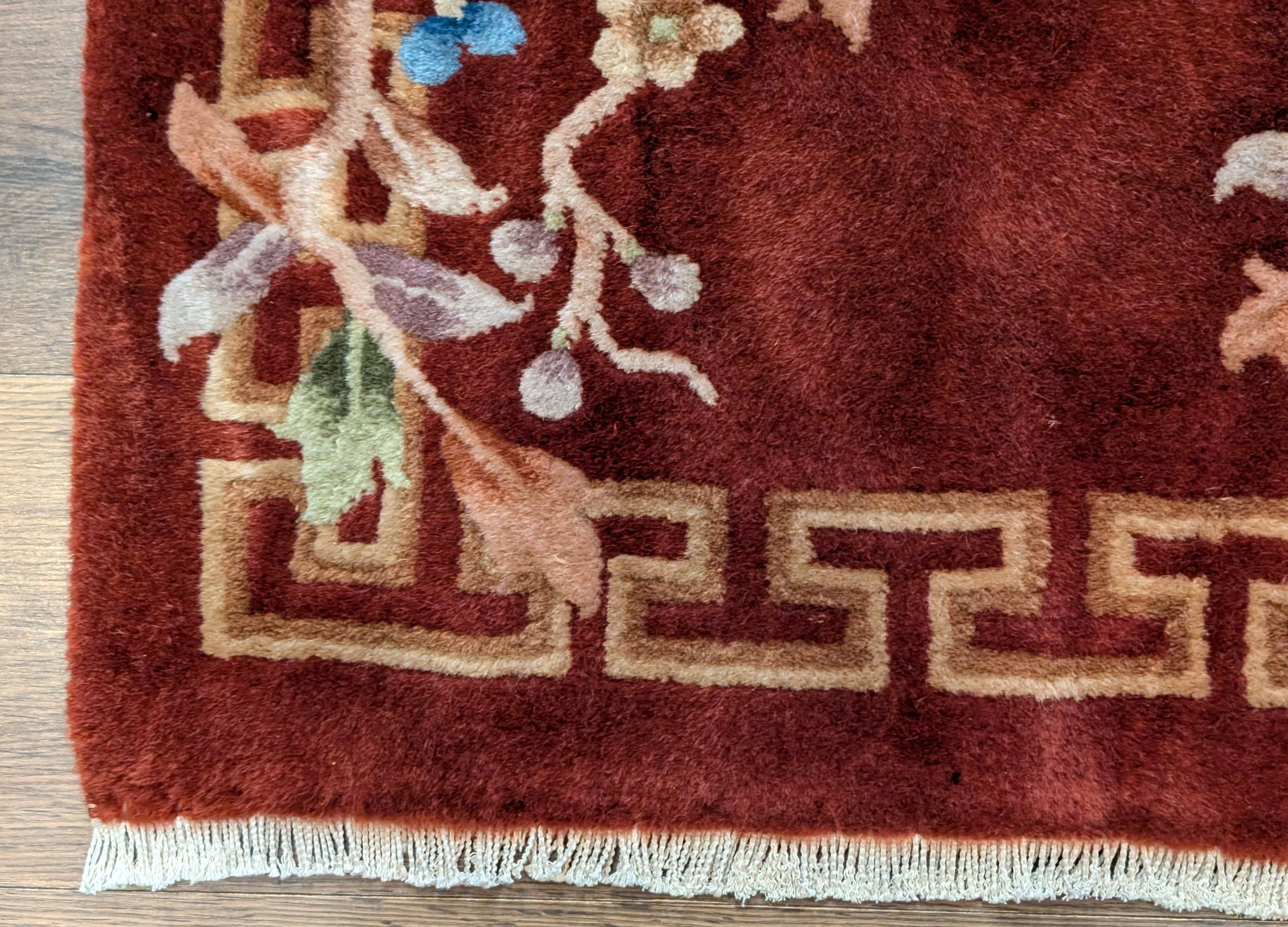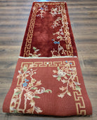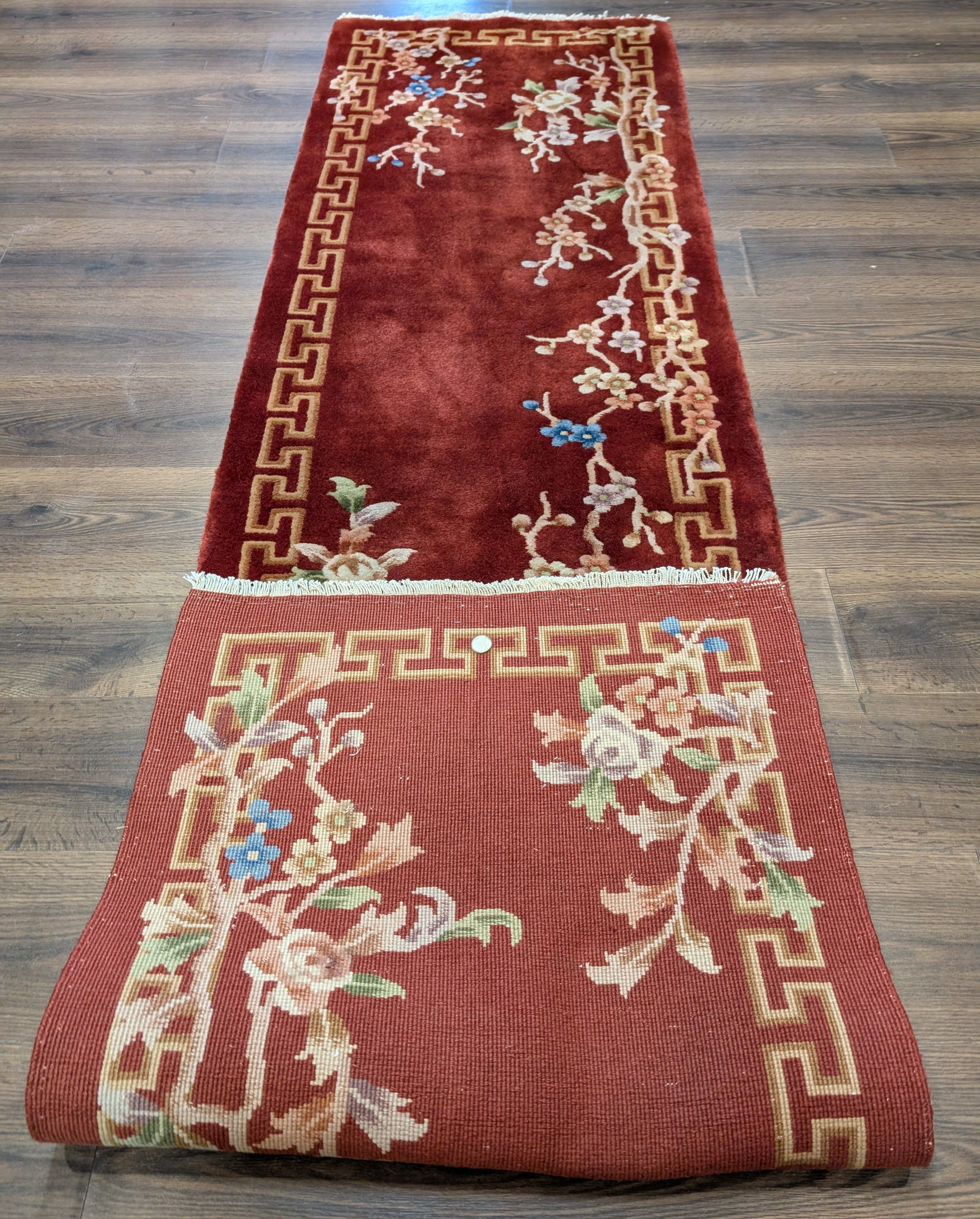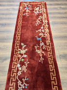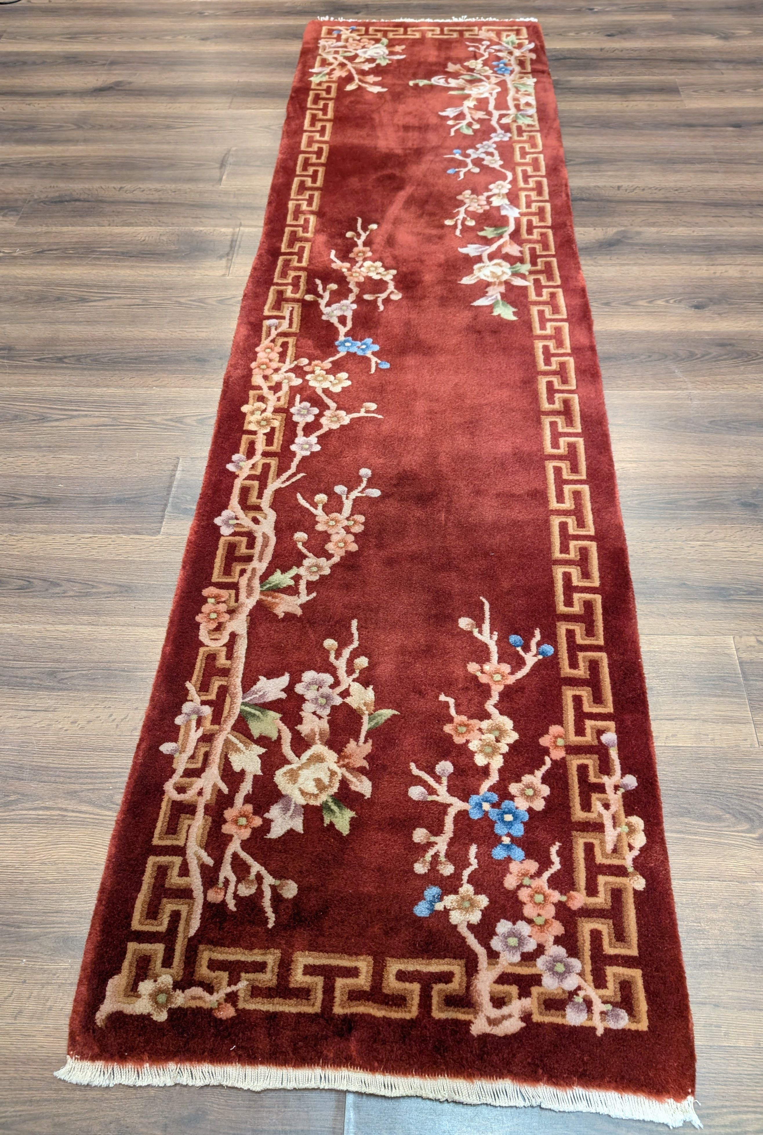 Chinese Nichols Runner Rug 2.6 x 9.5, Rust Red, Floral, Art Deco Wool Runner, Rare