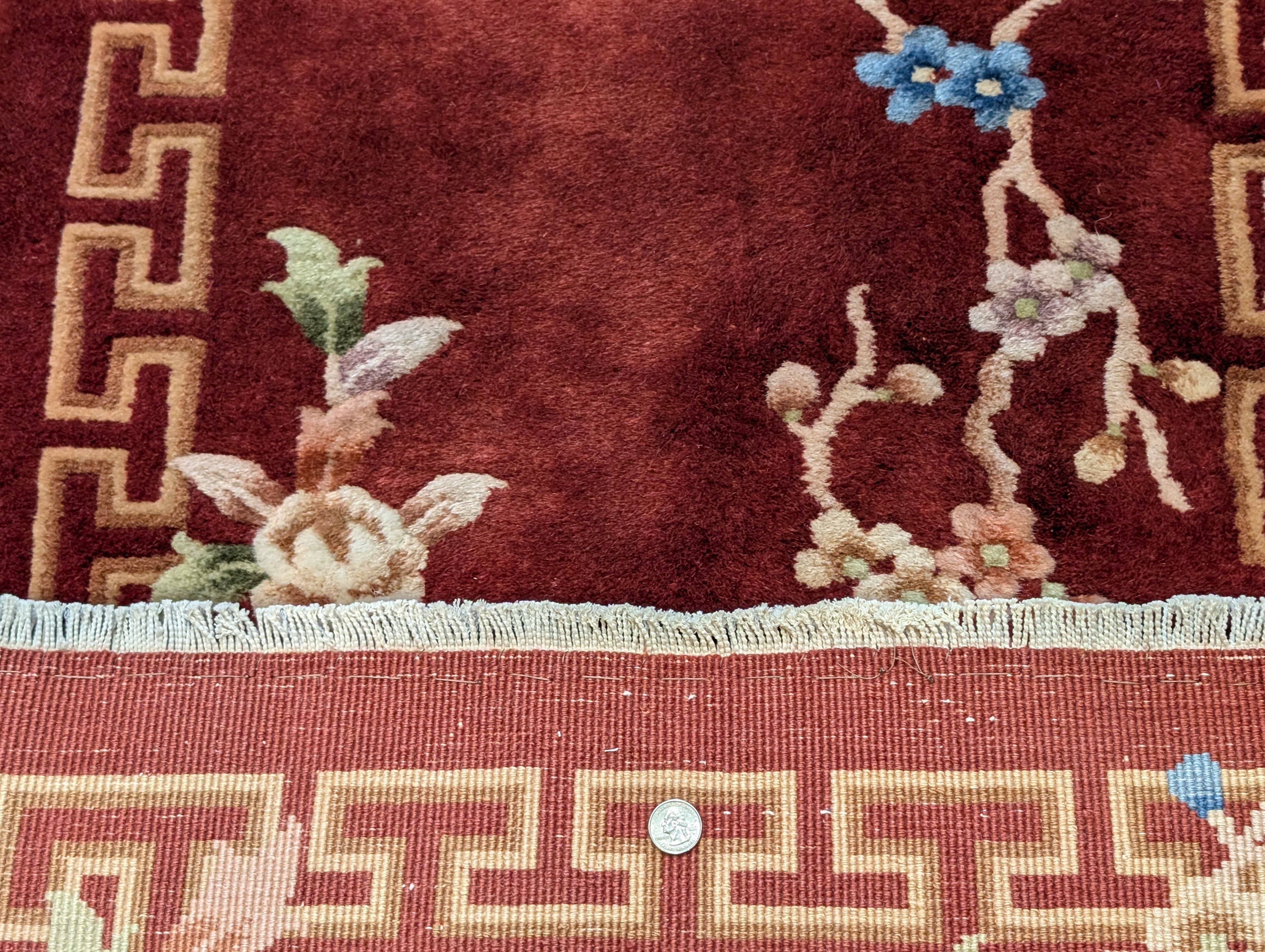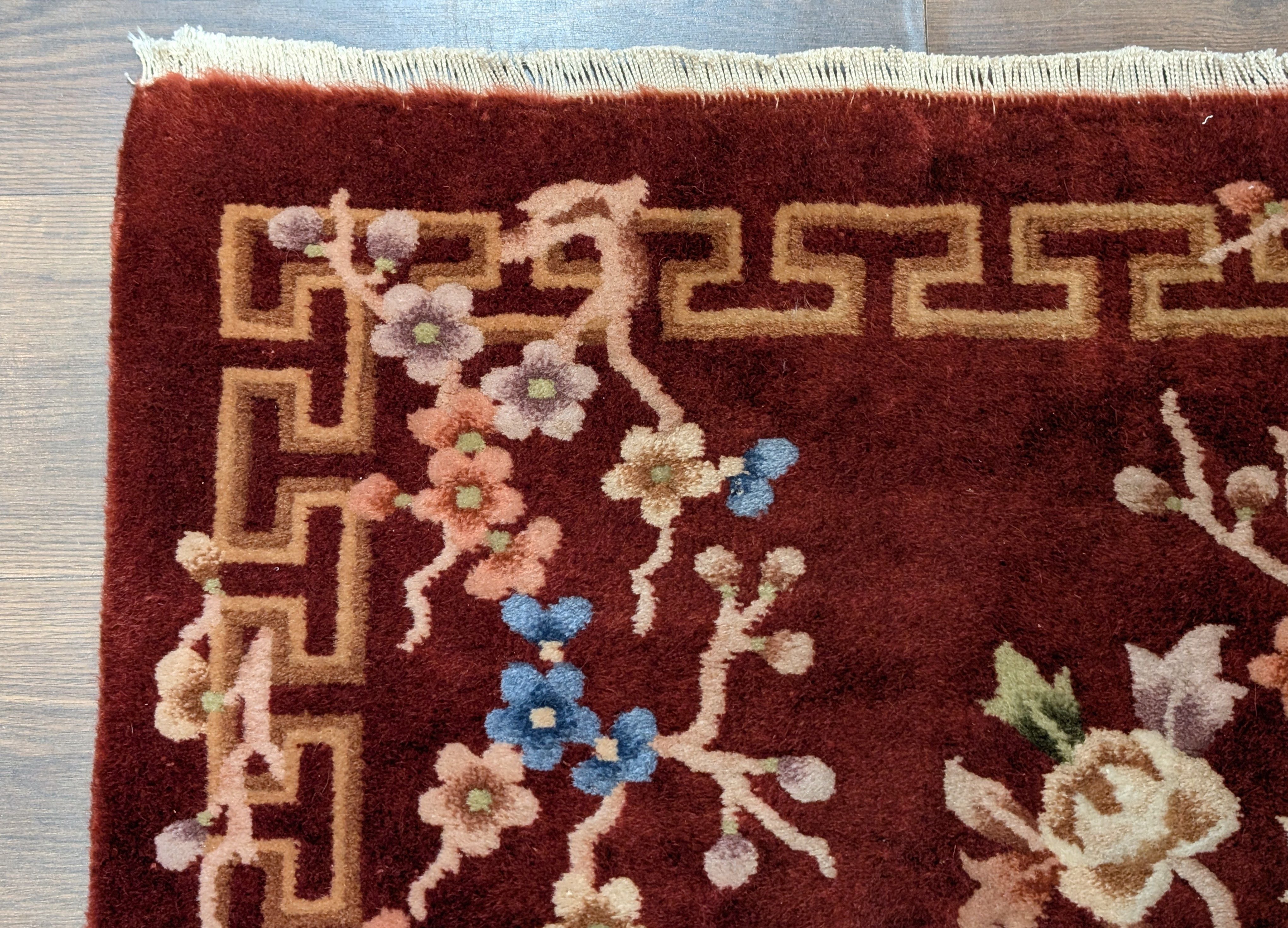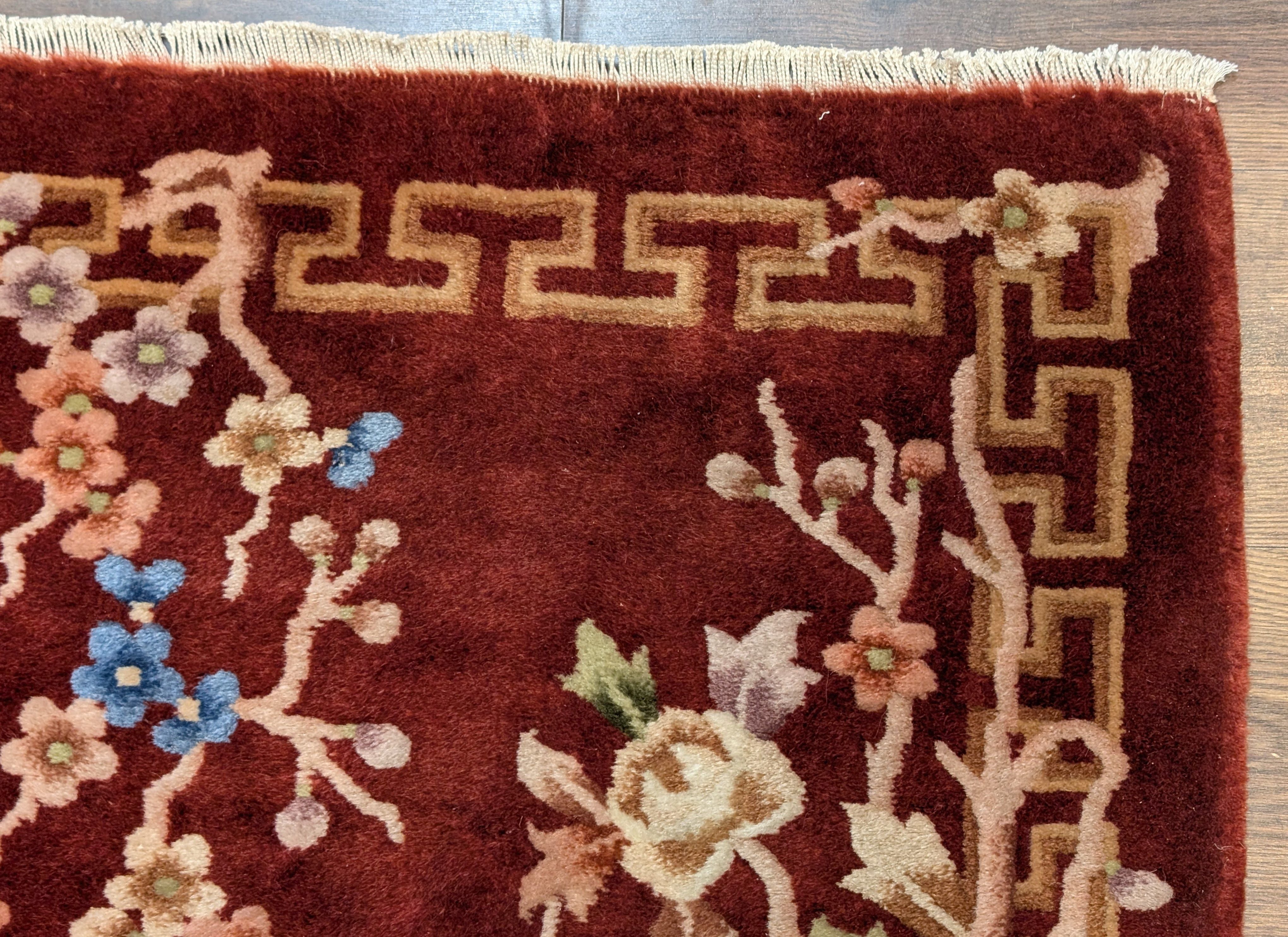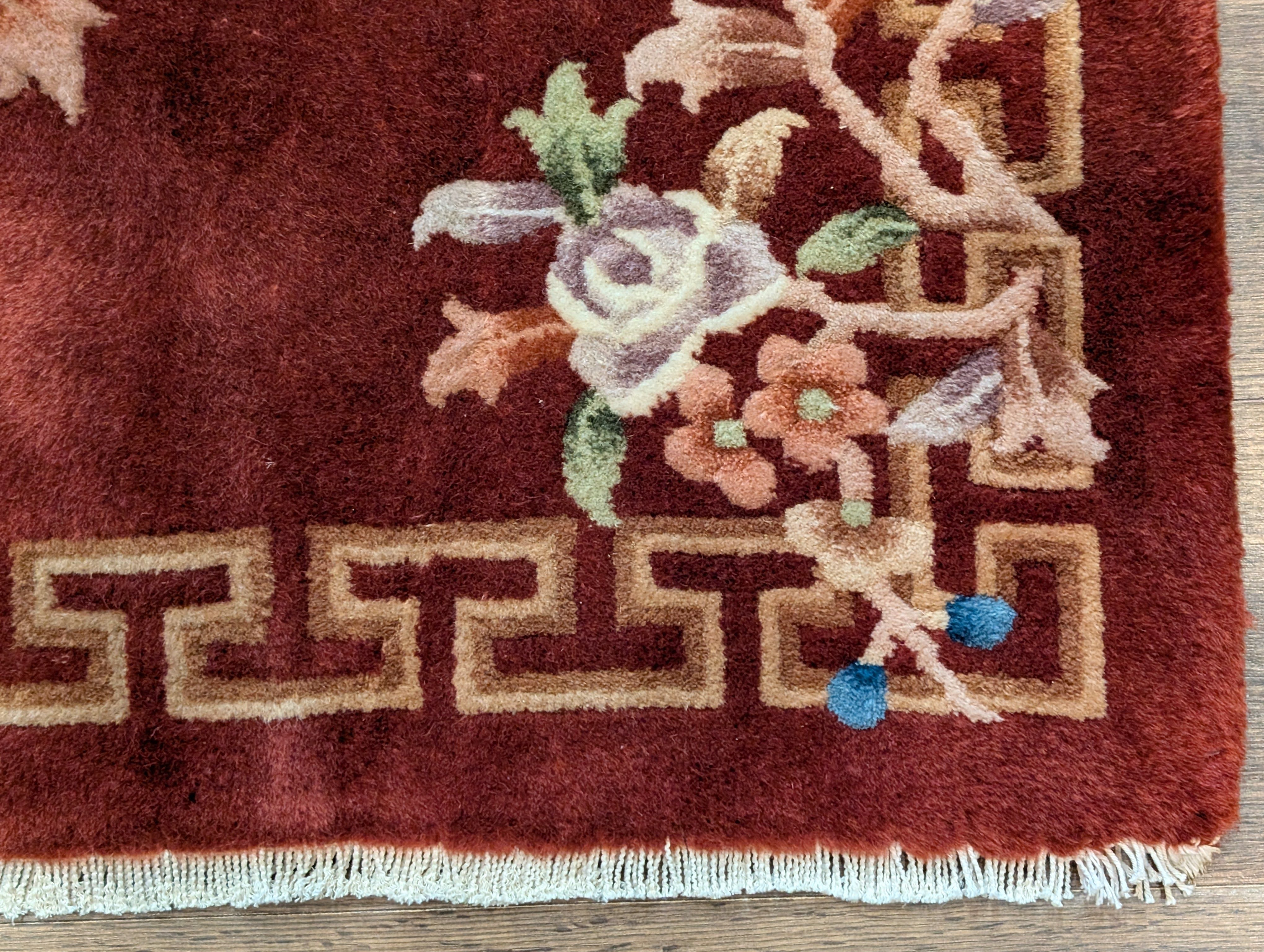 Chinese Nichols Runner Rug 2.6 x 9.5, Rust Red, Floral, Art Deco Wool Runner, Rare