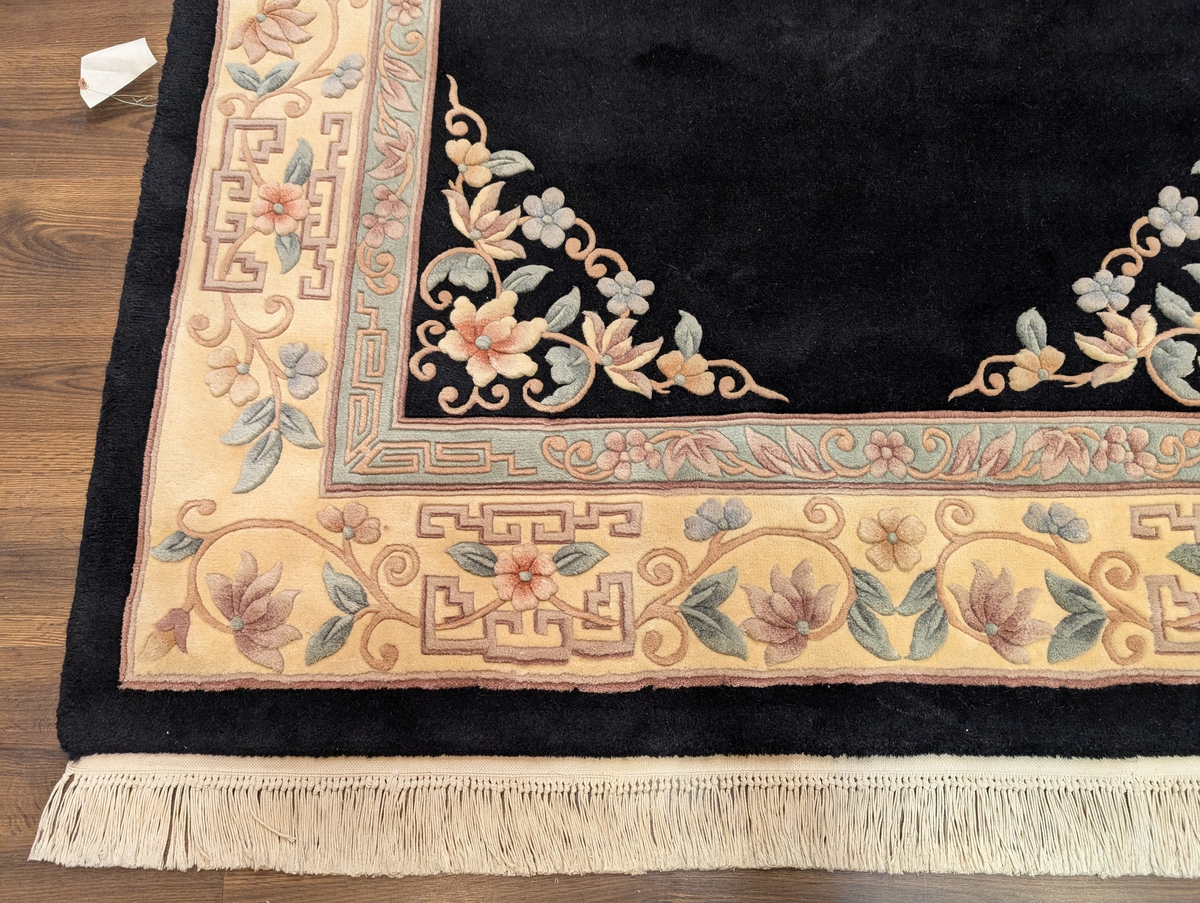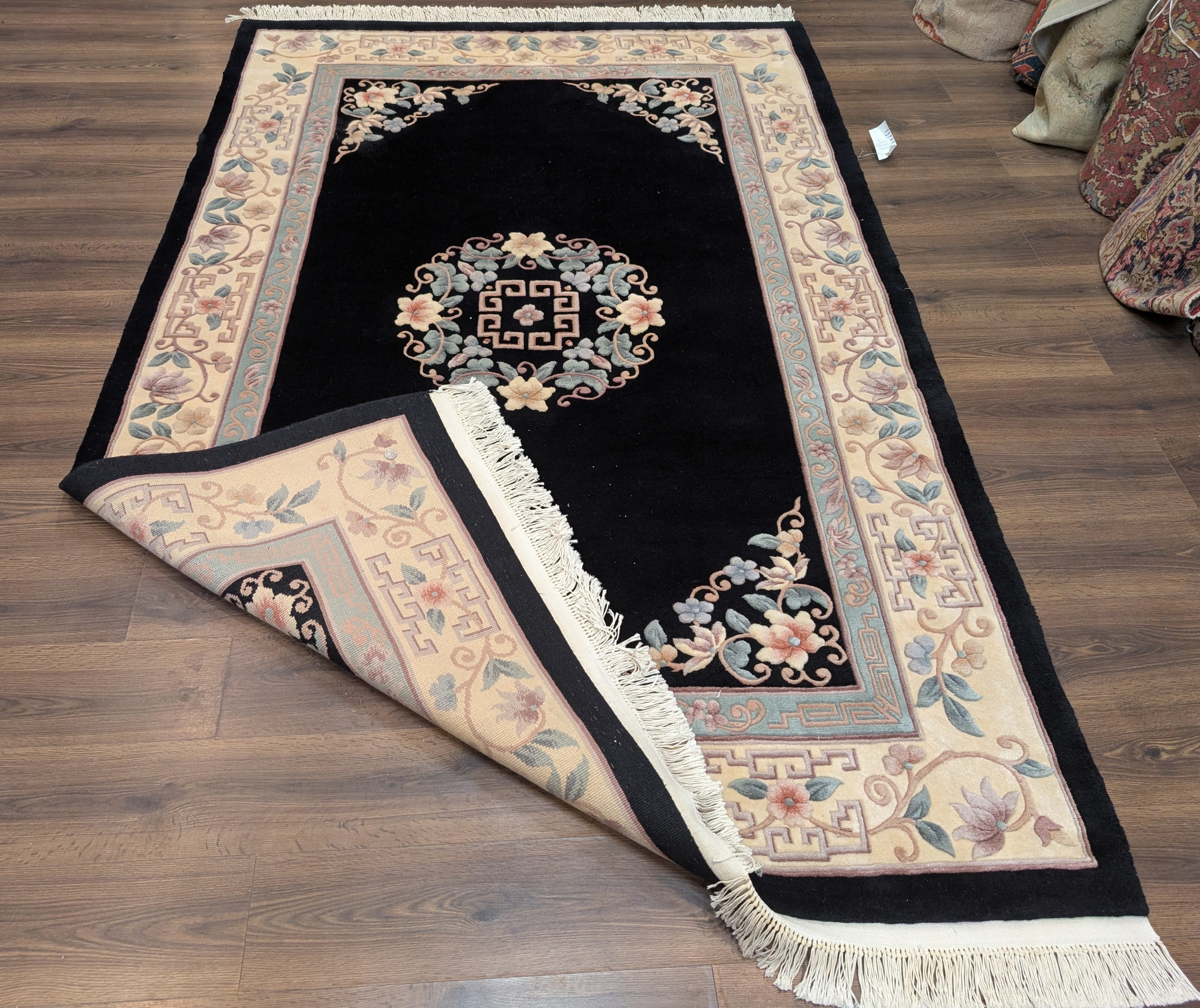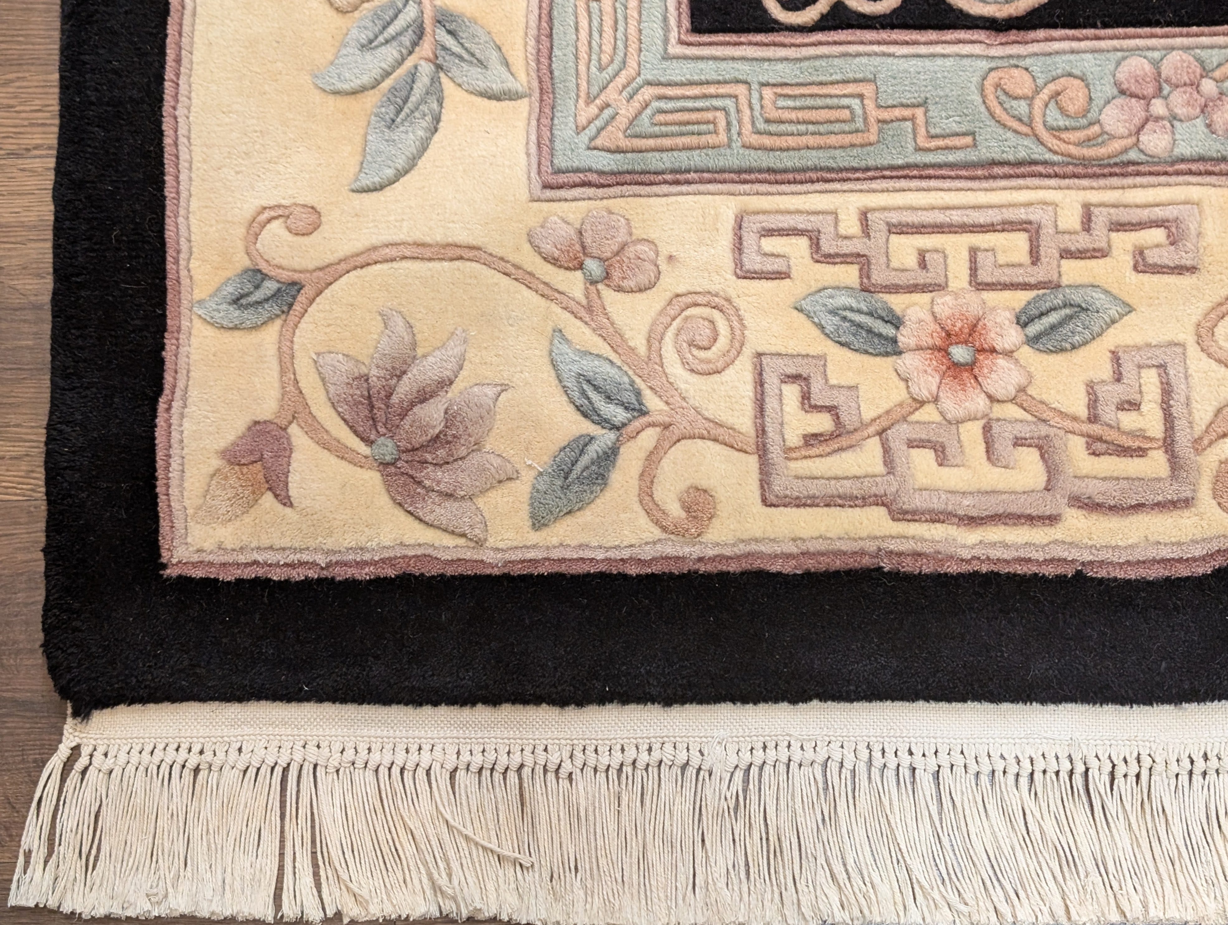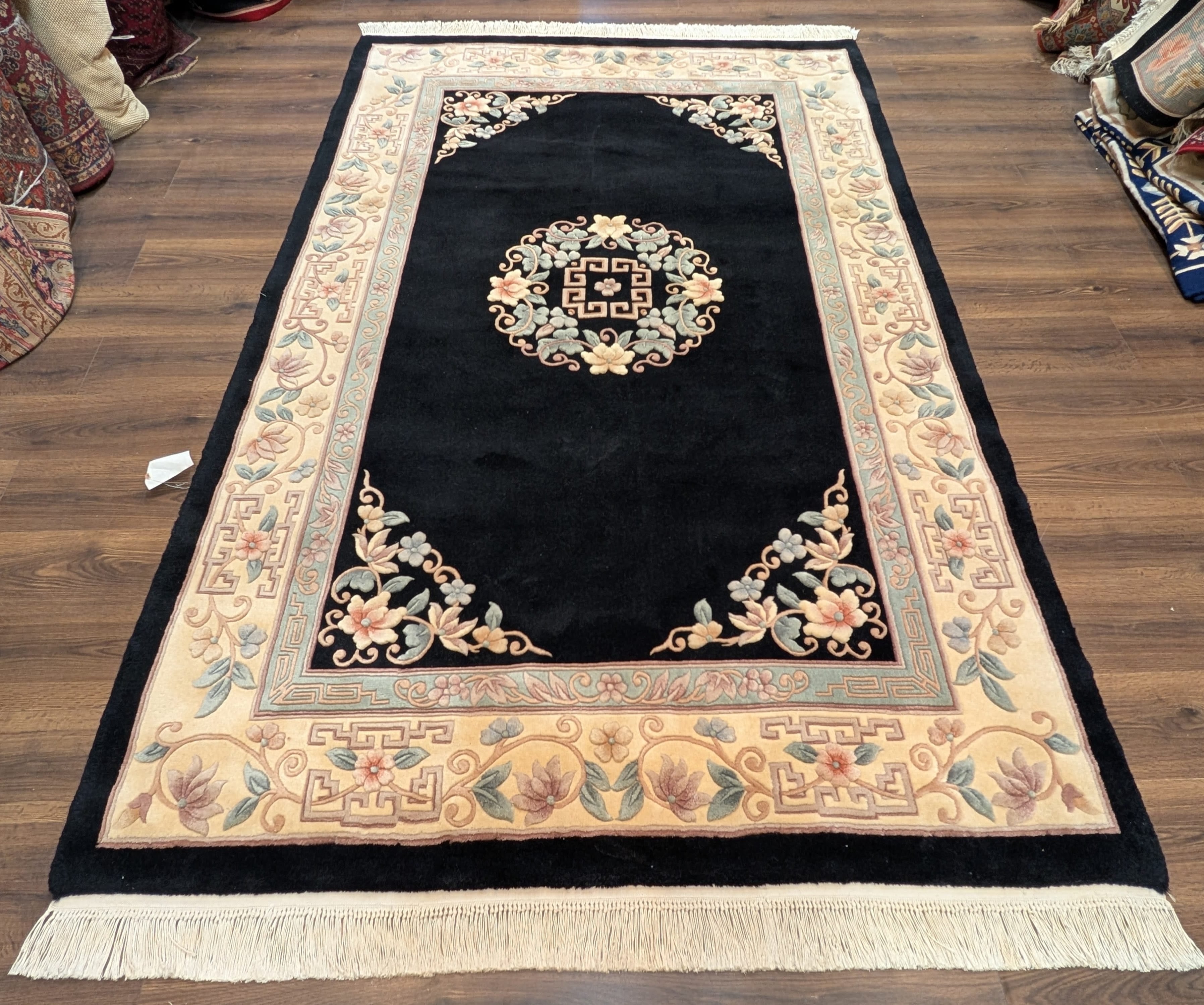 Chinese Wool Rug 6x9, Black and Cream, Chinese Carving Rug, Vintage