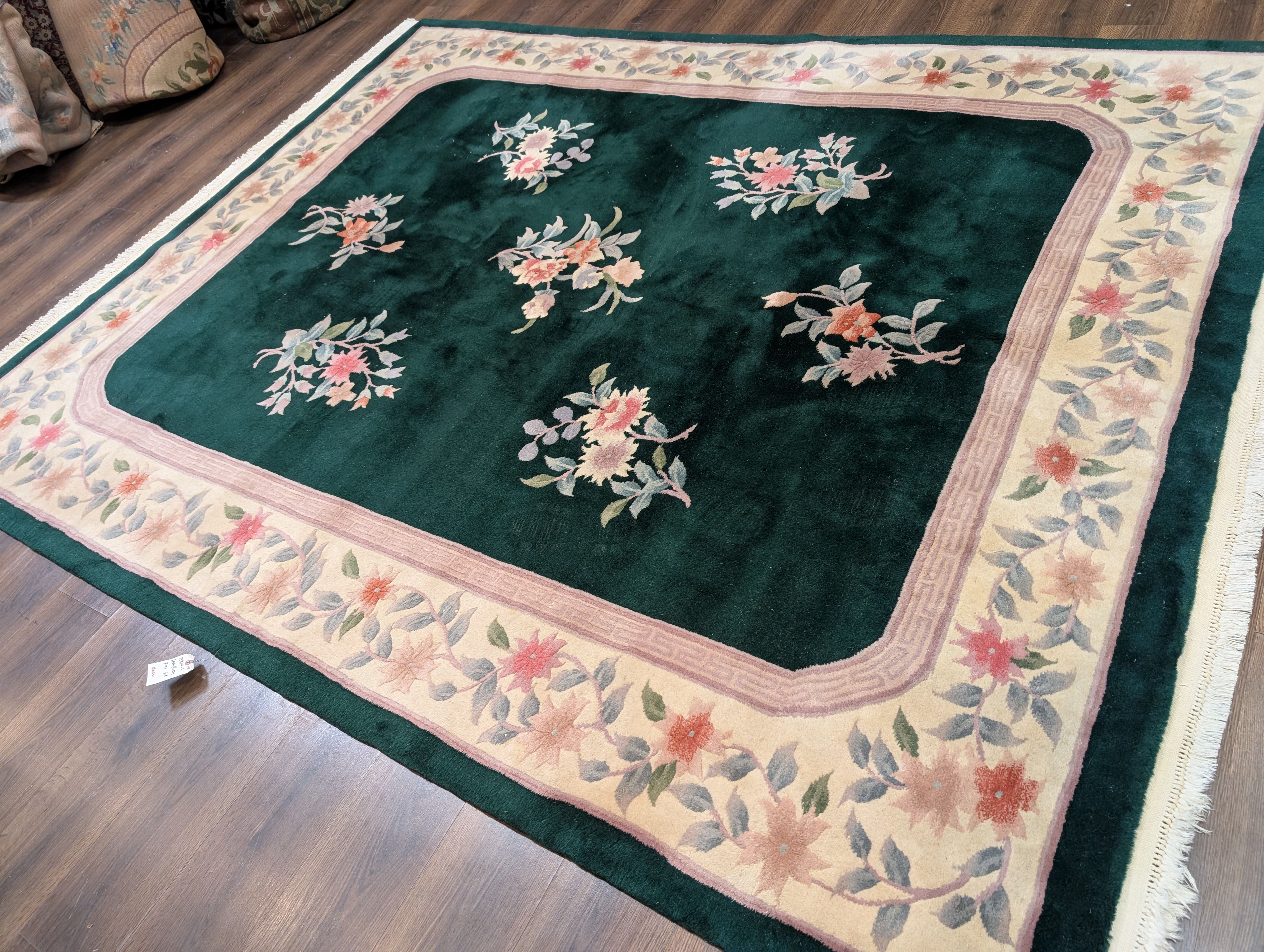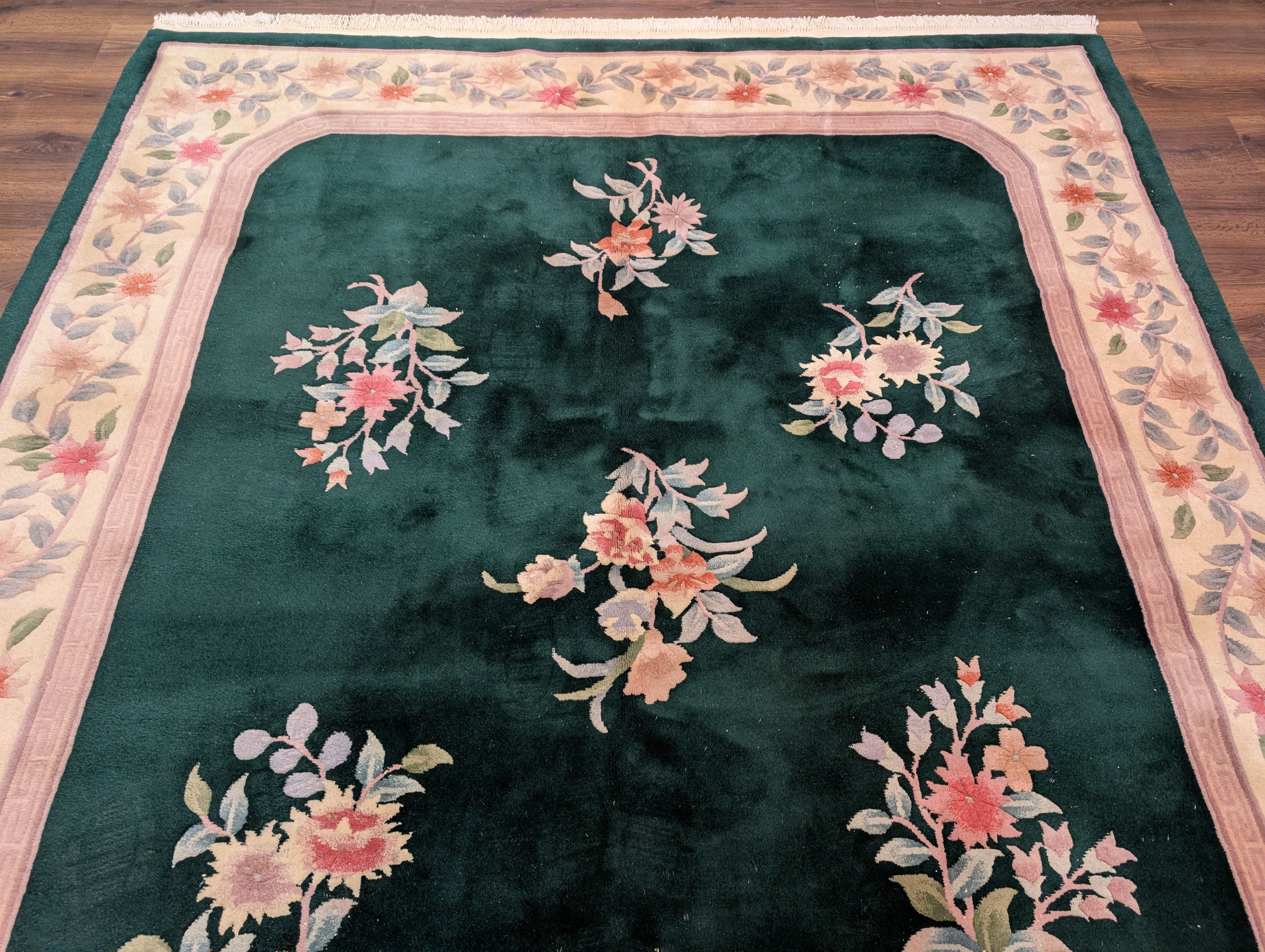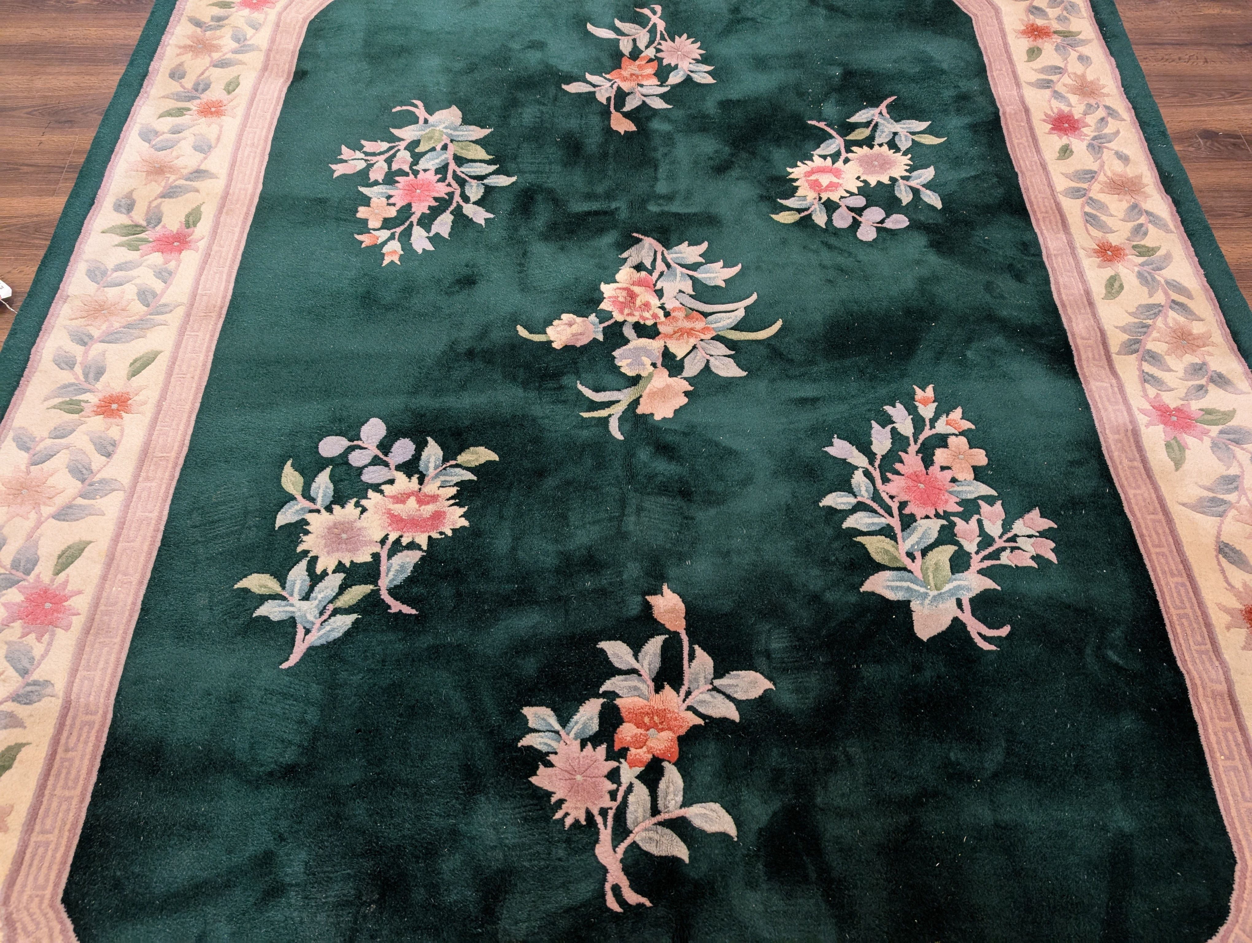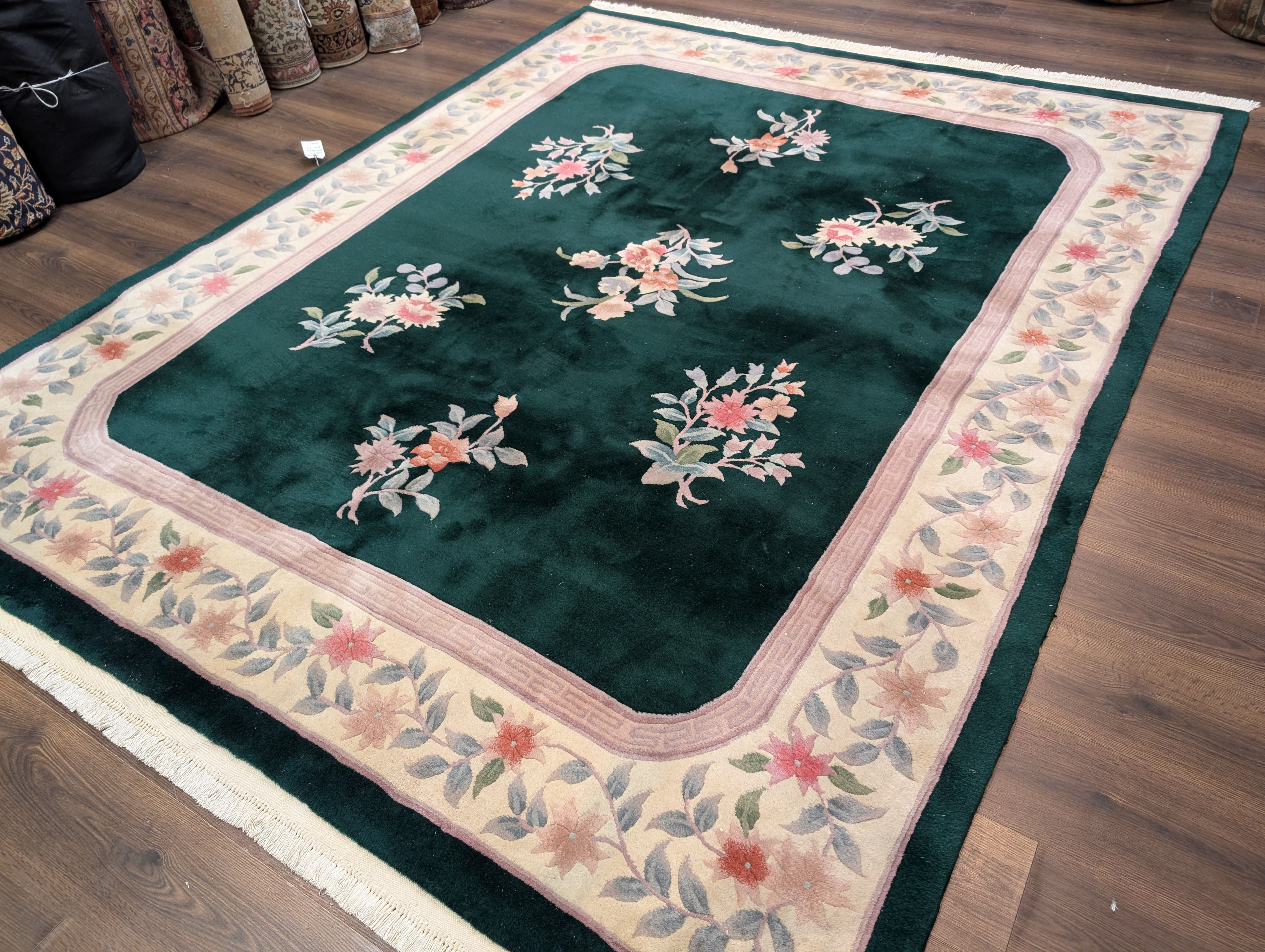 Chinese Wool Rug 8x10, Dark Green, Soft Plush Pile, 90 Line Carpet, Handmade