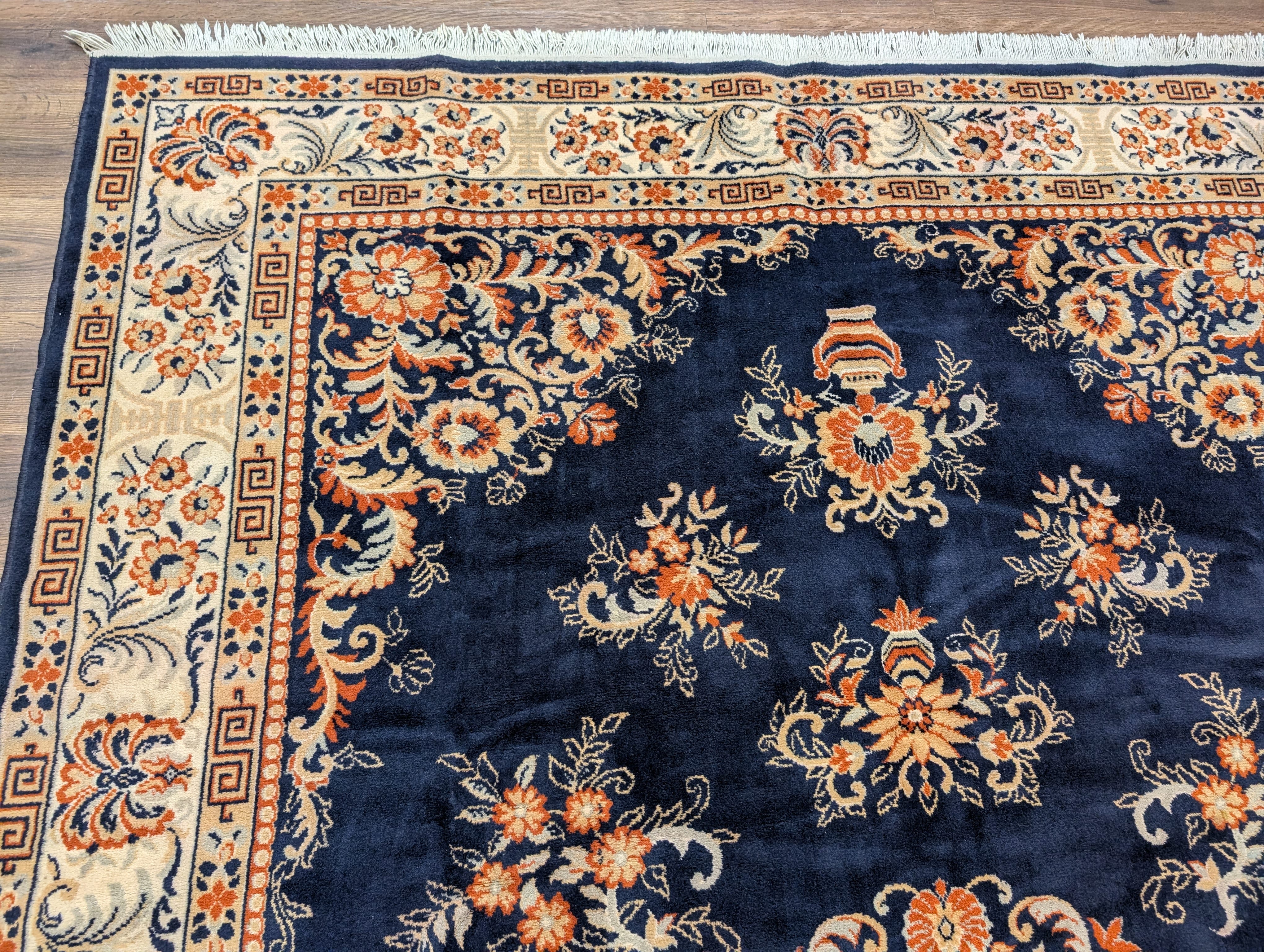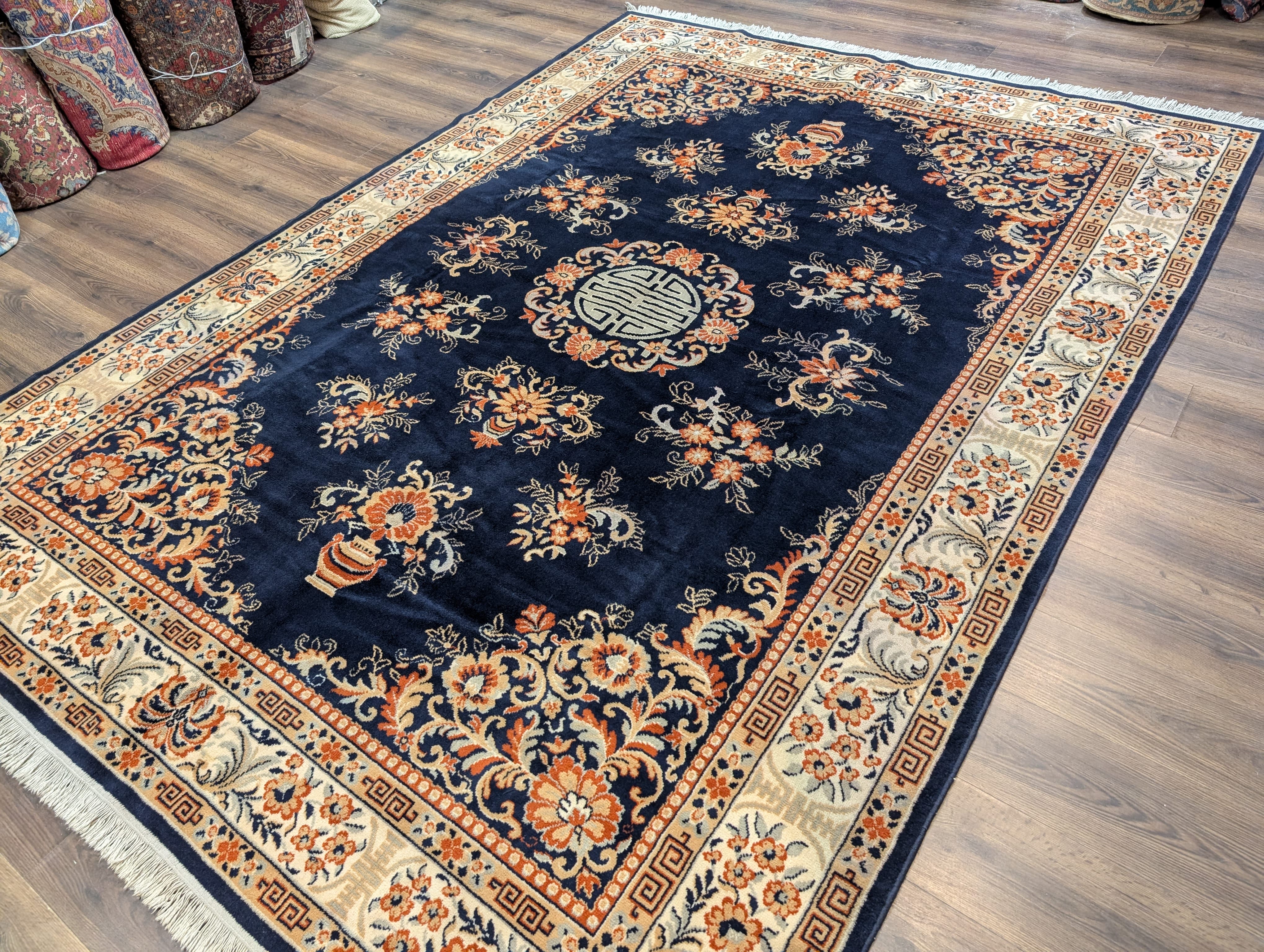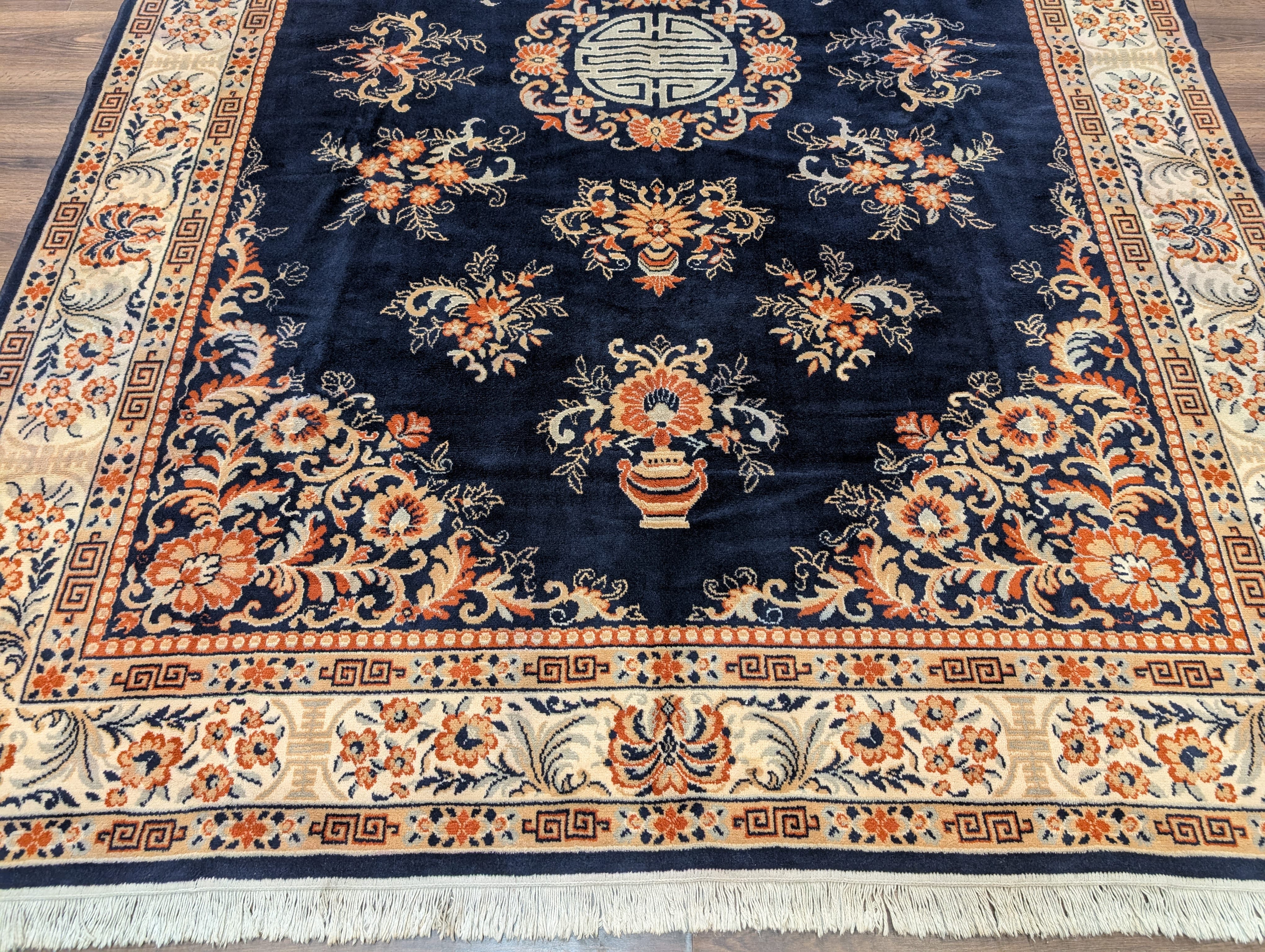 Chinese Wool Rug 8x11, Navy Blue and Cream, Belgium Power Loomed Carpet, Vintage