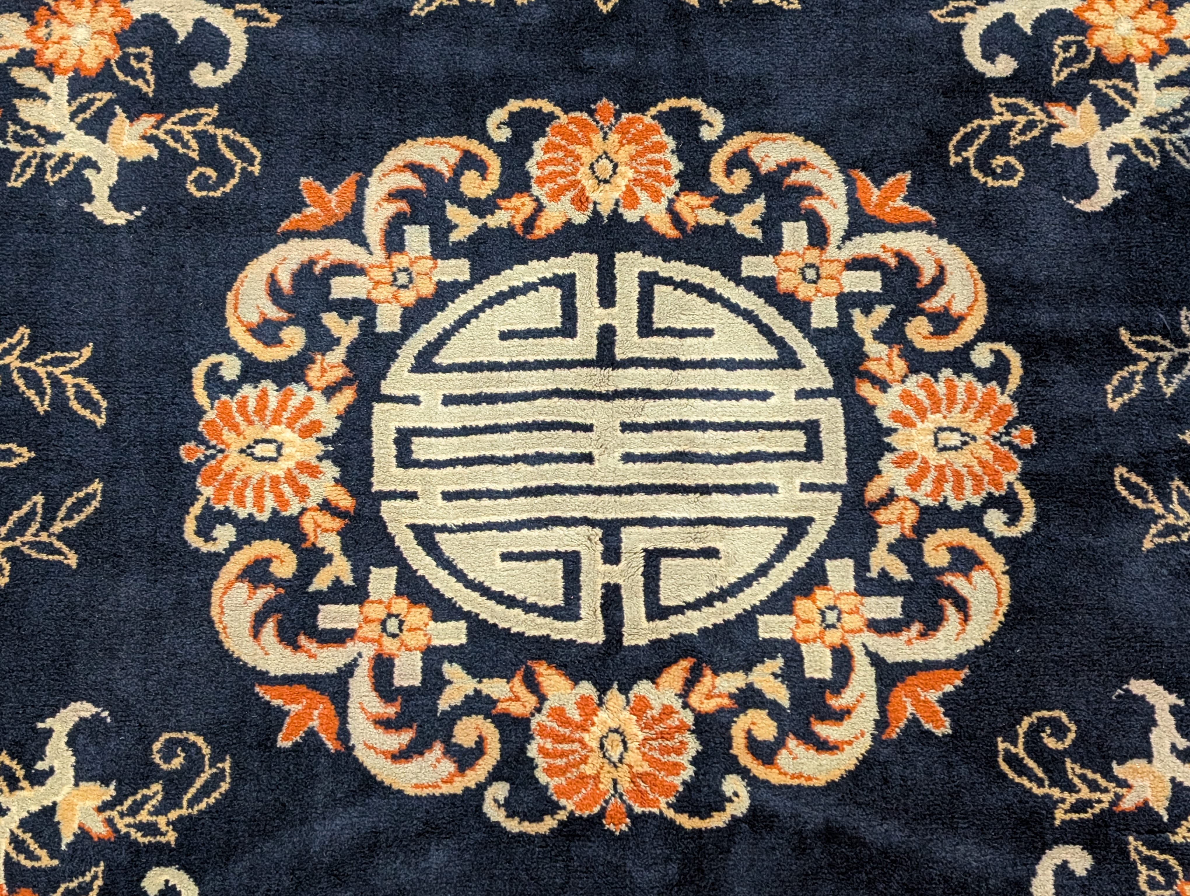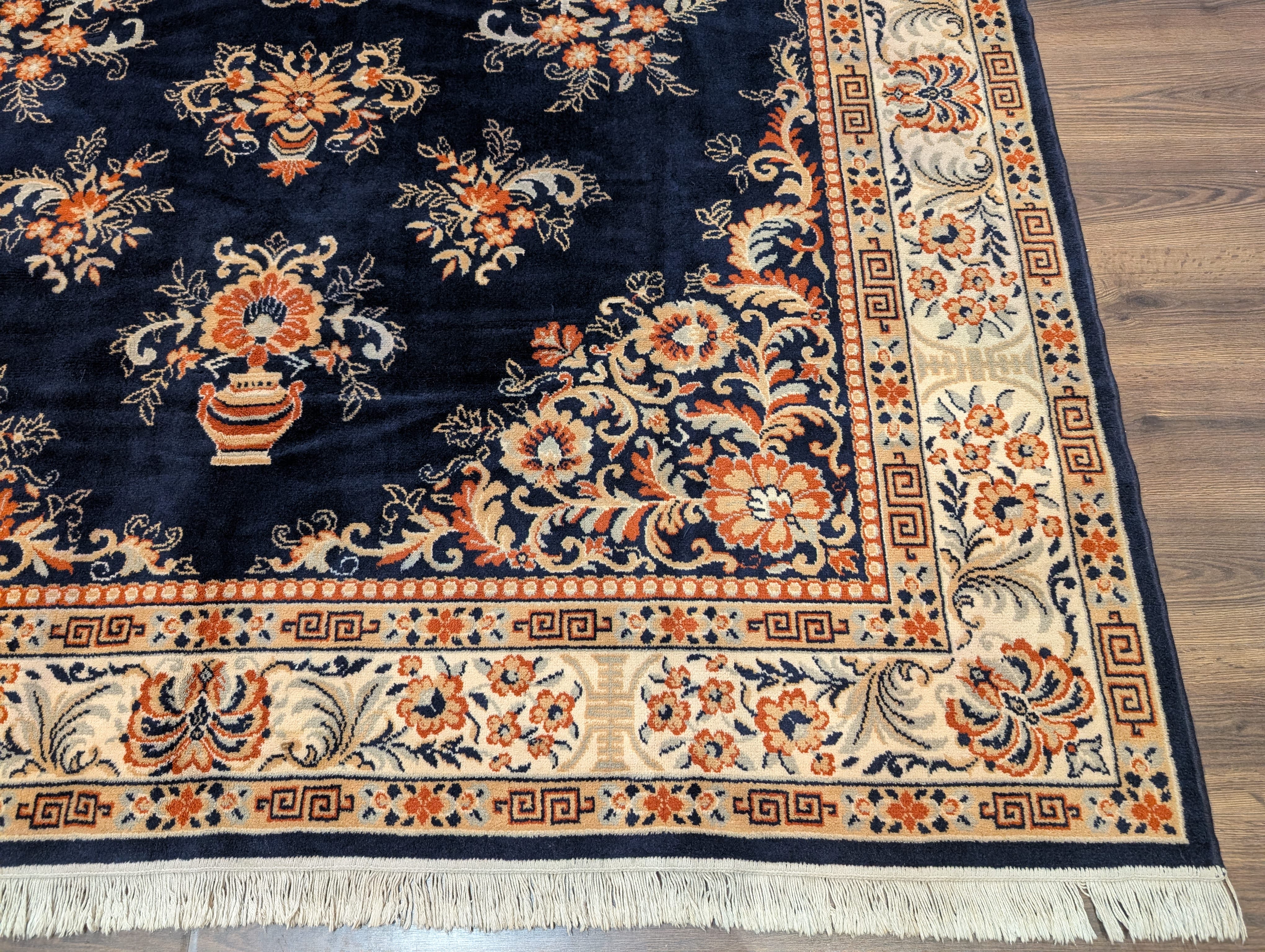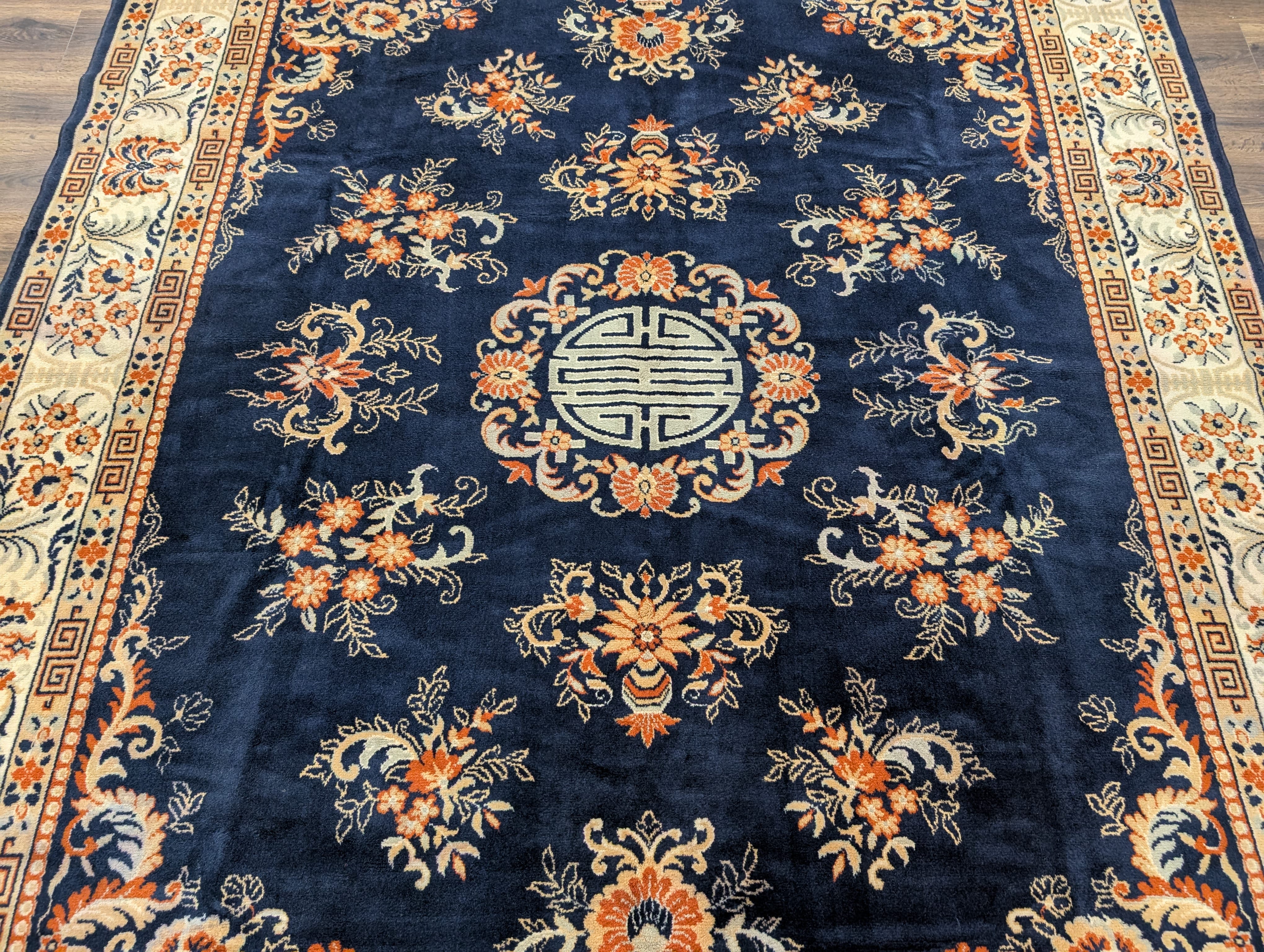 Chinese Wool Rug 8x11, Navy Blue and Cream, Belgium Power Loomed Carpet, Vintage