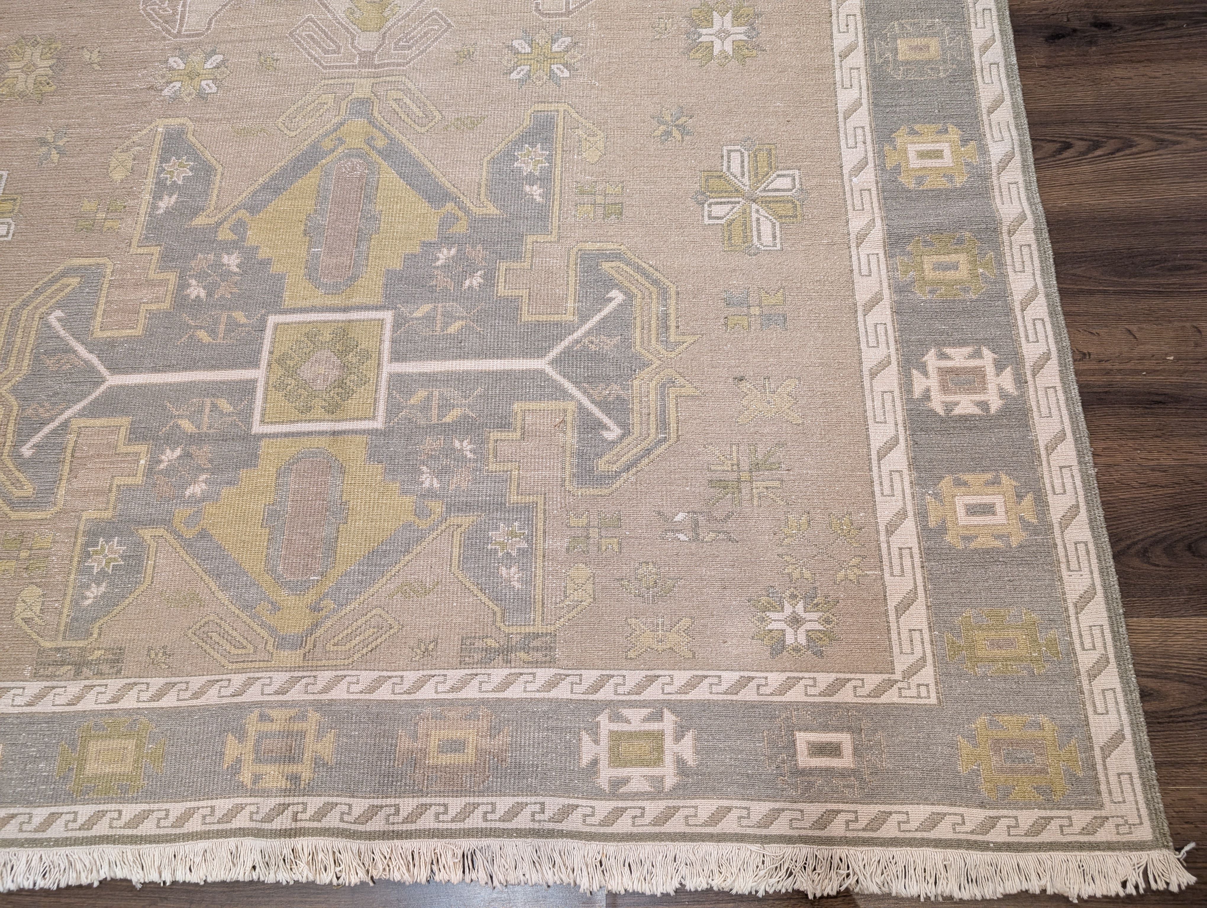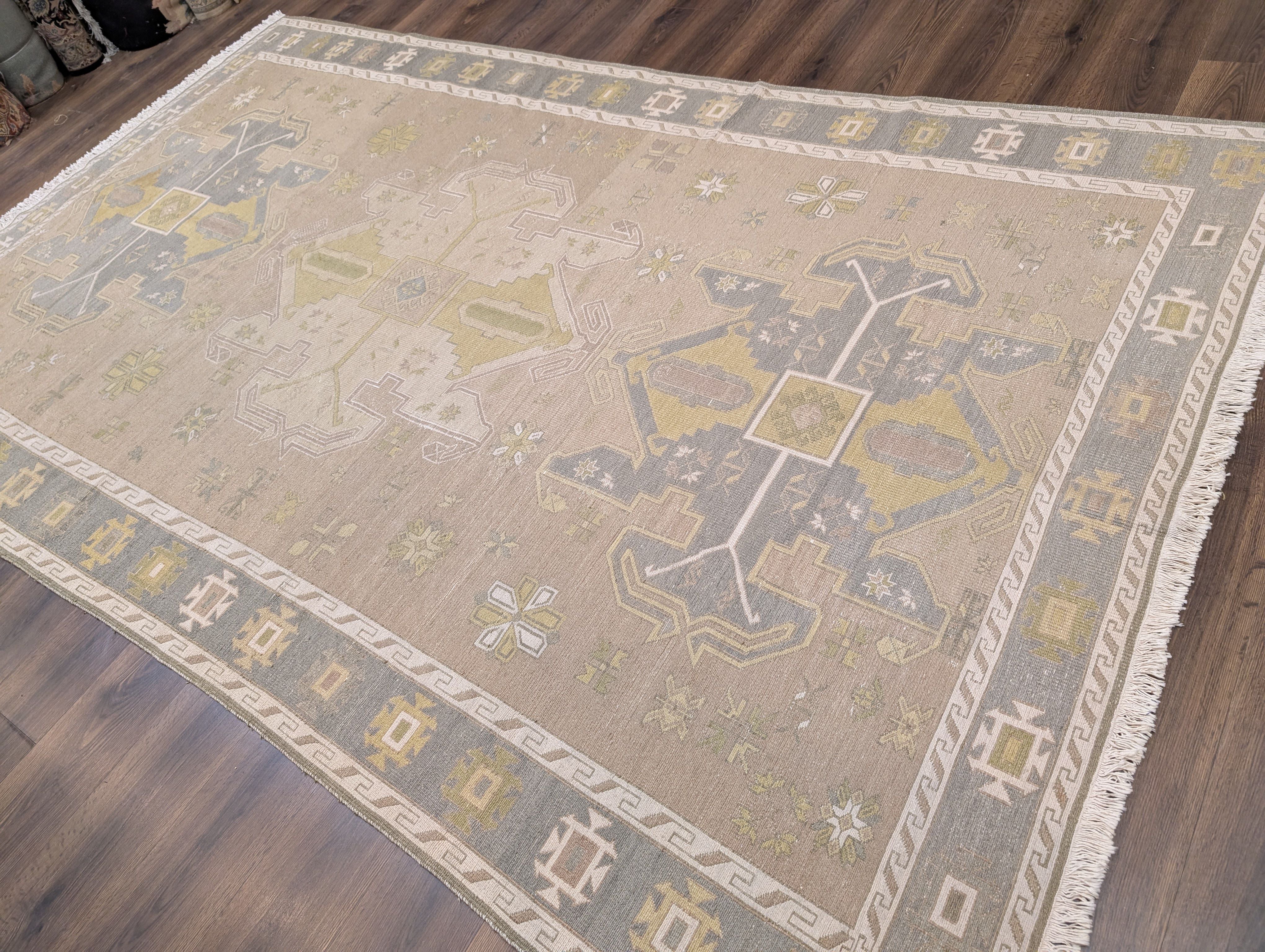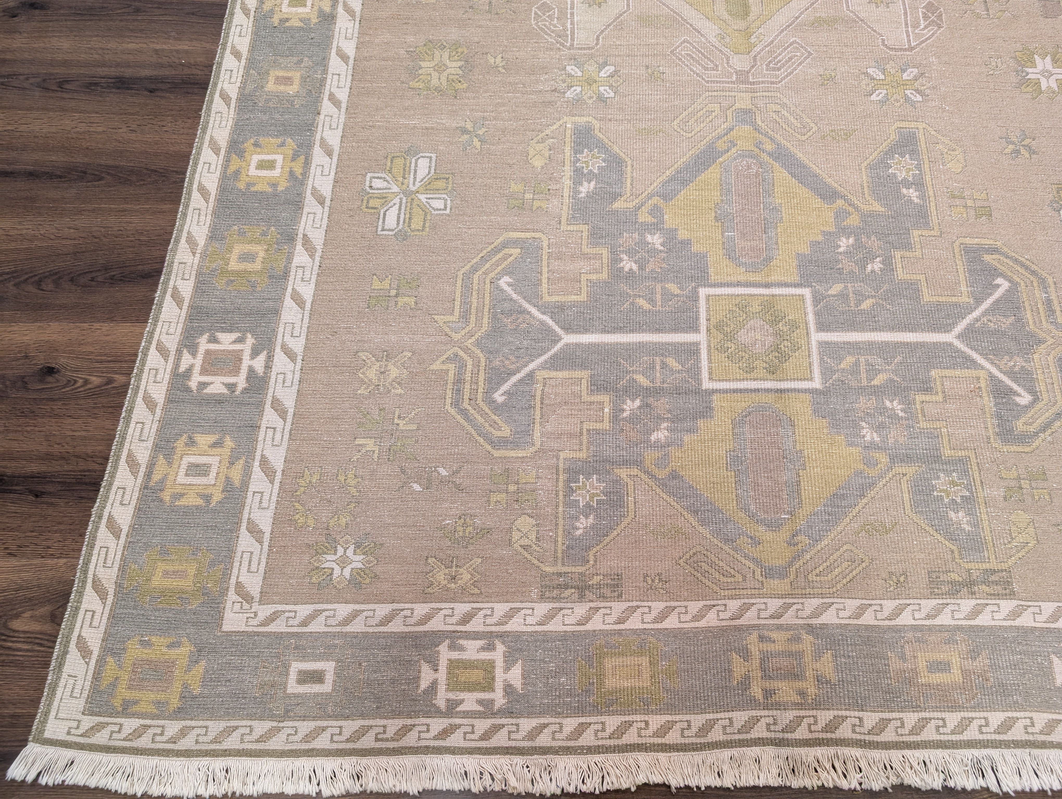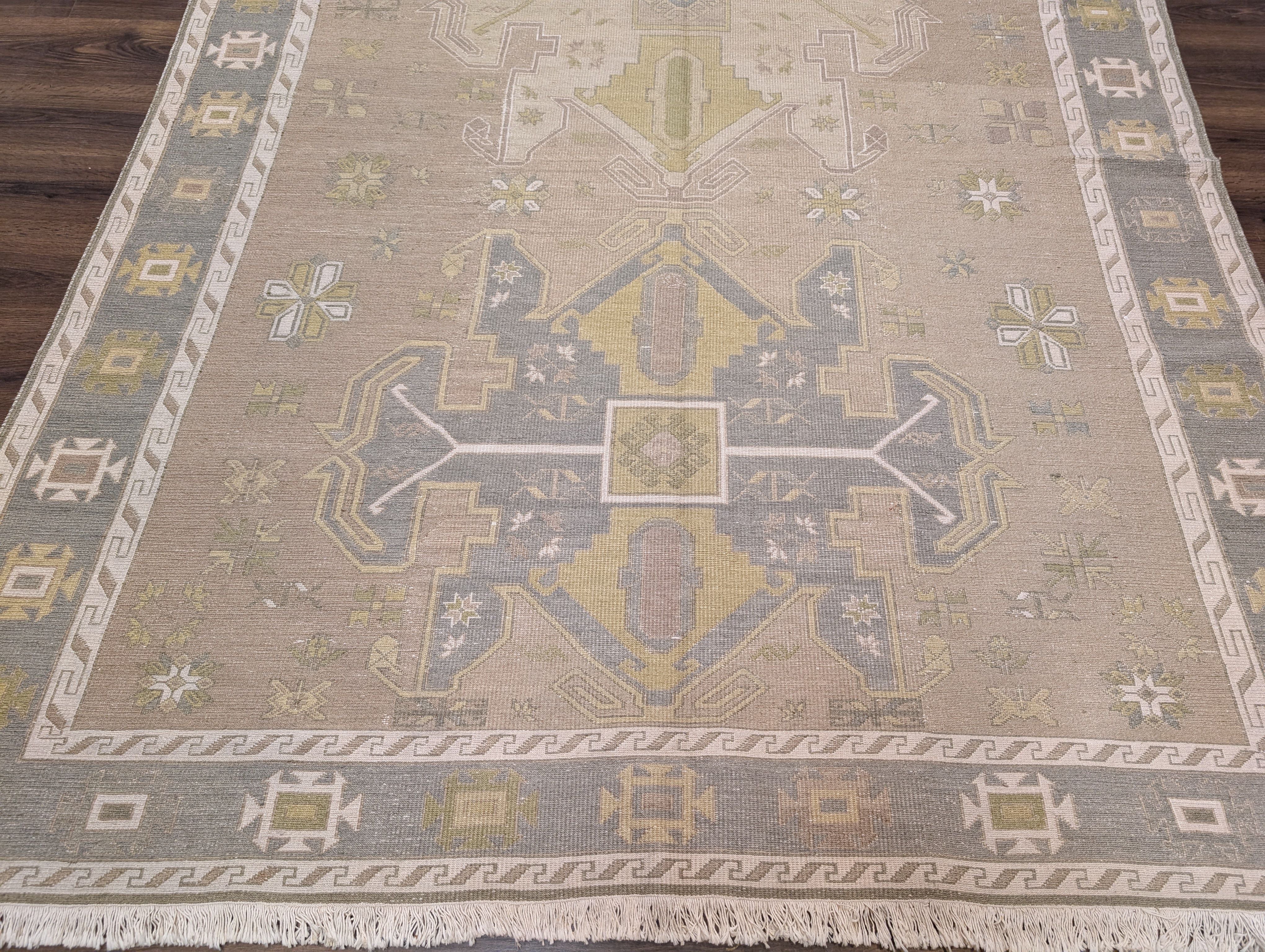 Flatweave Turkish Soumak Rug 7x11, Wool, Large Geometric Medallions, Light Colors
