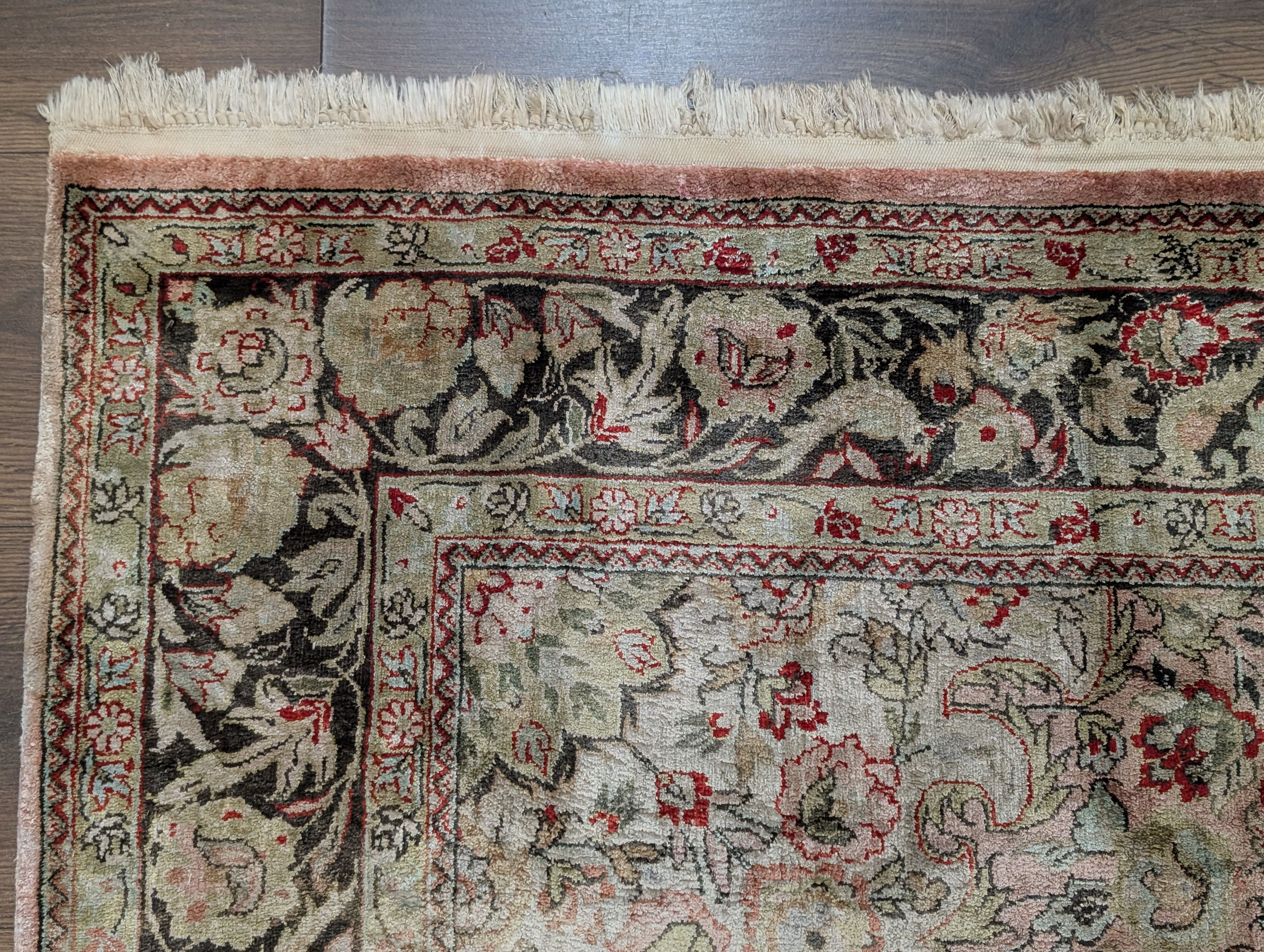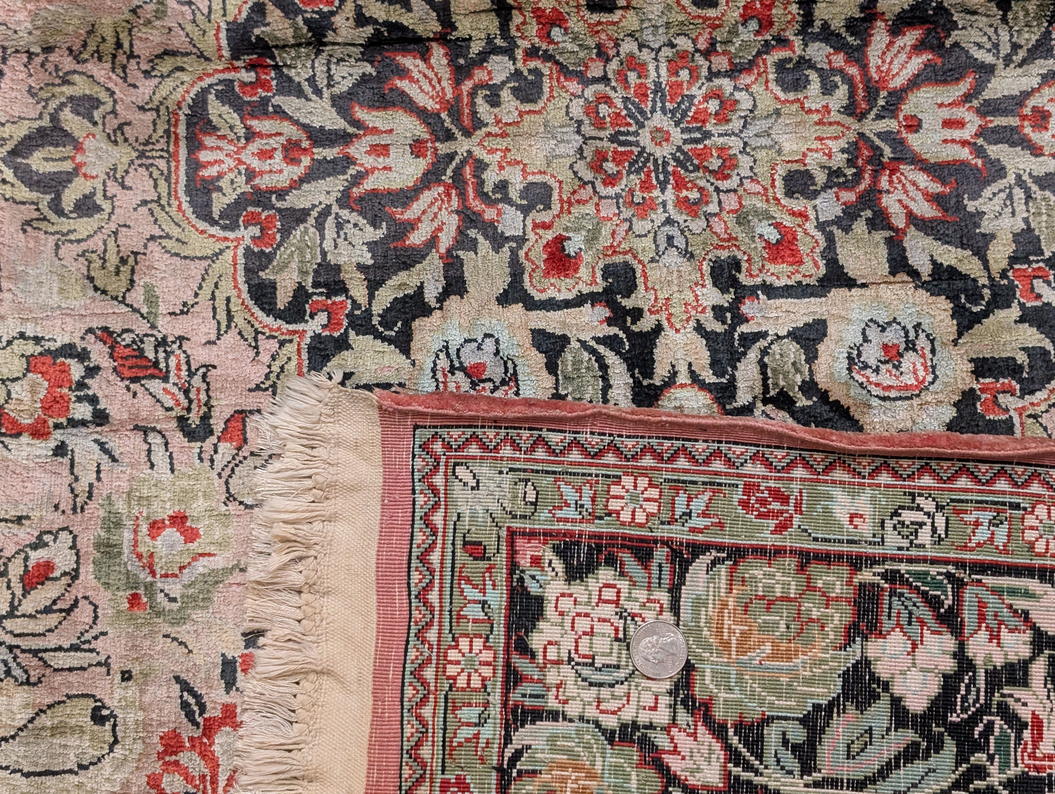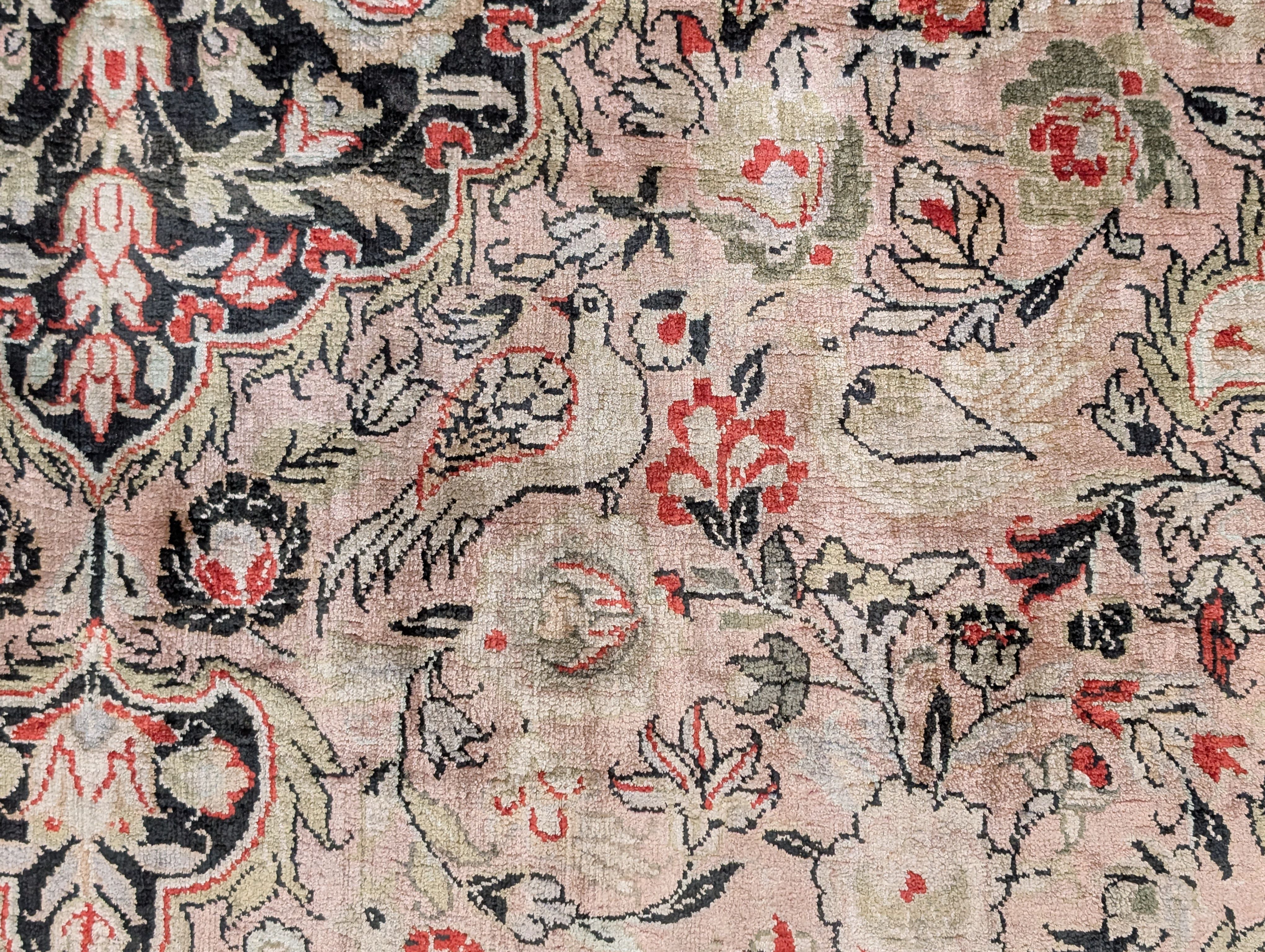 | Condition/Notes | Very good condition silk on cotton foundation Indian Kashmiri rug. Free of stains, odors, discolorations, tears, etc. Finely hand knotted with a knot density of 330 KPSI. Features a unique design which includes bird pictorials. Recently cleaned and ready to be enjoyed in your space. |