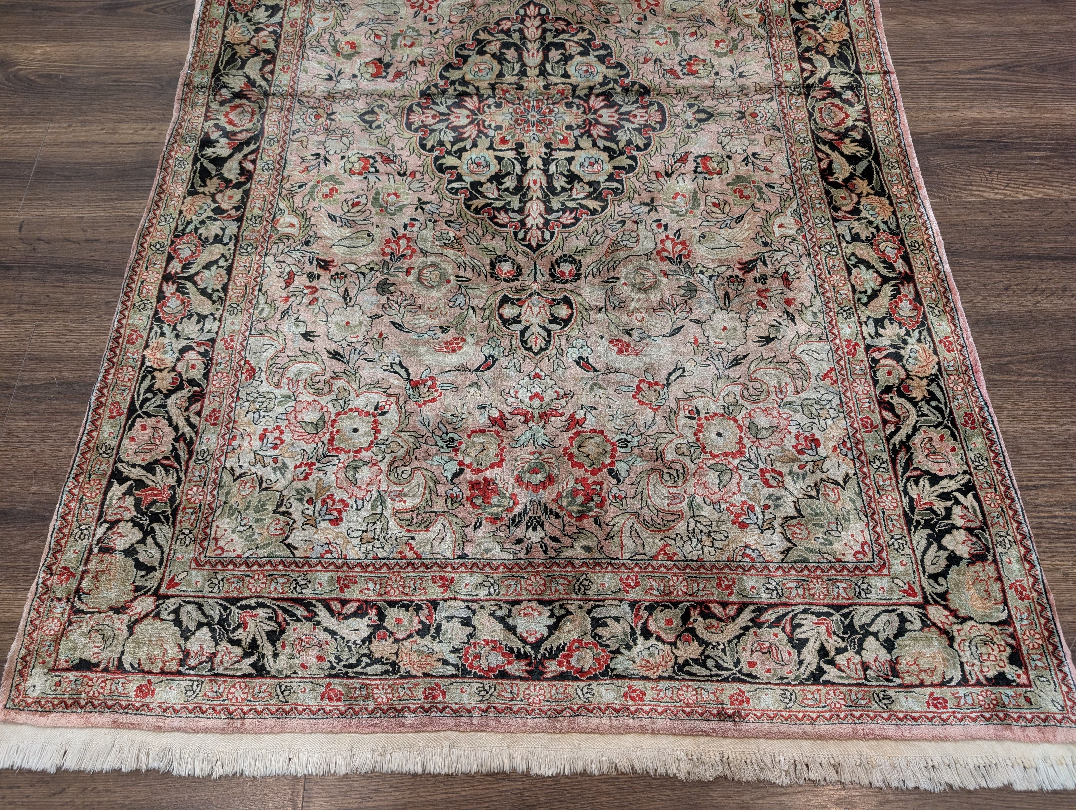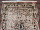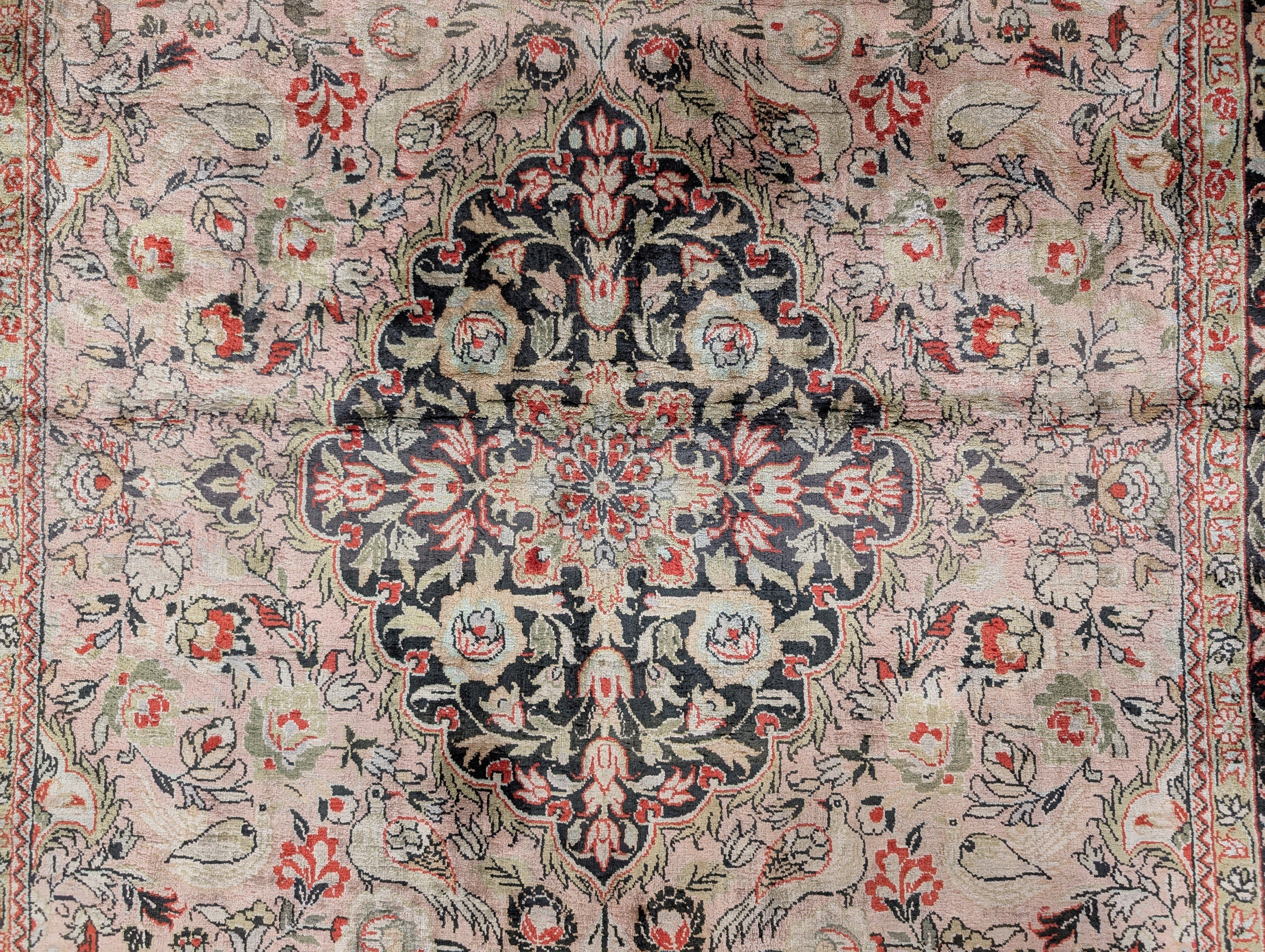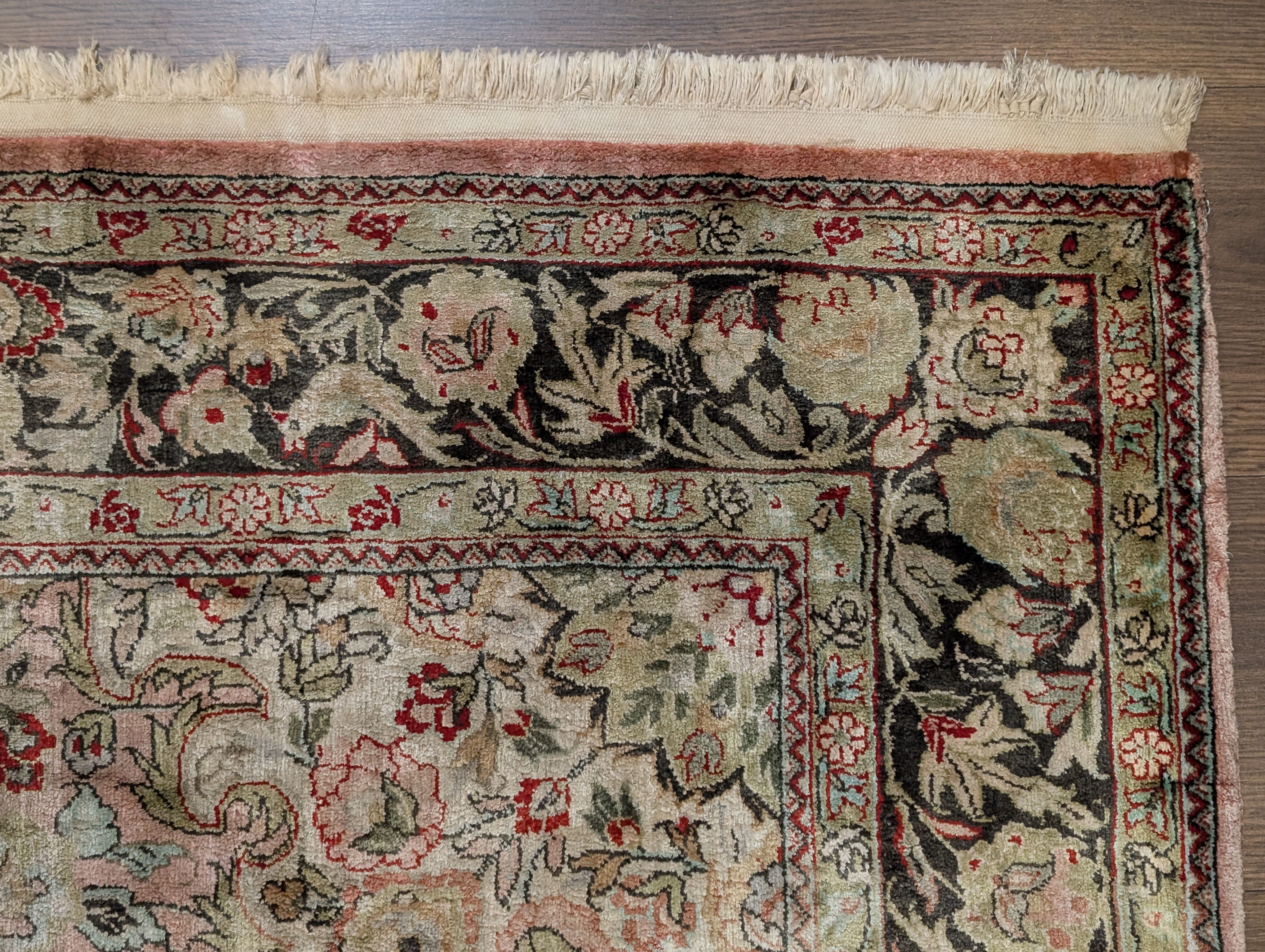 | Condition/Notes | Very good condition silk on cotton foundation Indian Kashmiri rug. Free of stains, odors, discolorations, tears, etc. Finely hand knotted with a knot density of 330 KPSI. Features a unique design which includes bird pictorials. Recently cleaned and ready to be enjoyed in your space. |