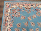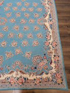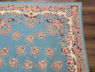 This exquisite needlepoint rug features a light blue background adorned with intricate floral patterns in soft pinks and blues. This handmade wool carpet measures 4' 10" x 7' 10" and adds a touch of elegance and warmth to any space.